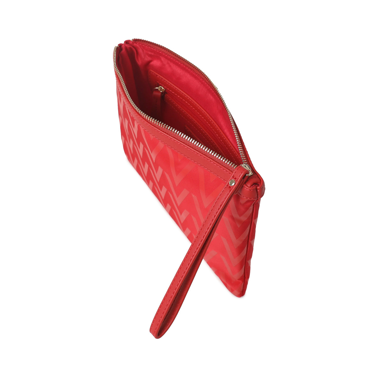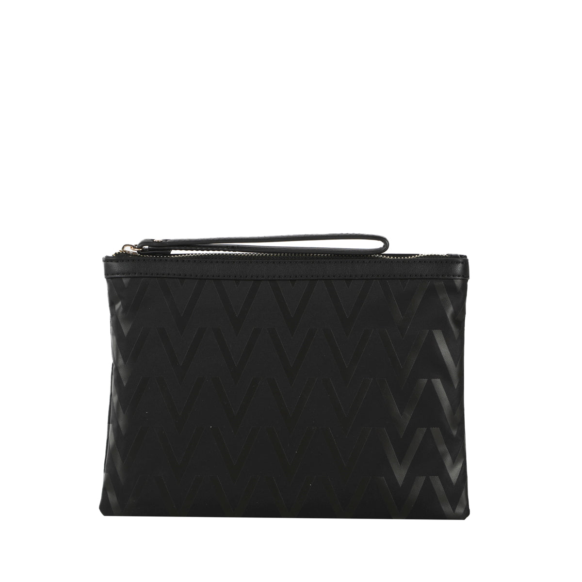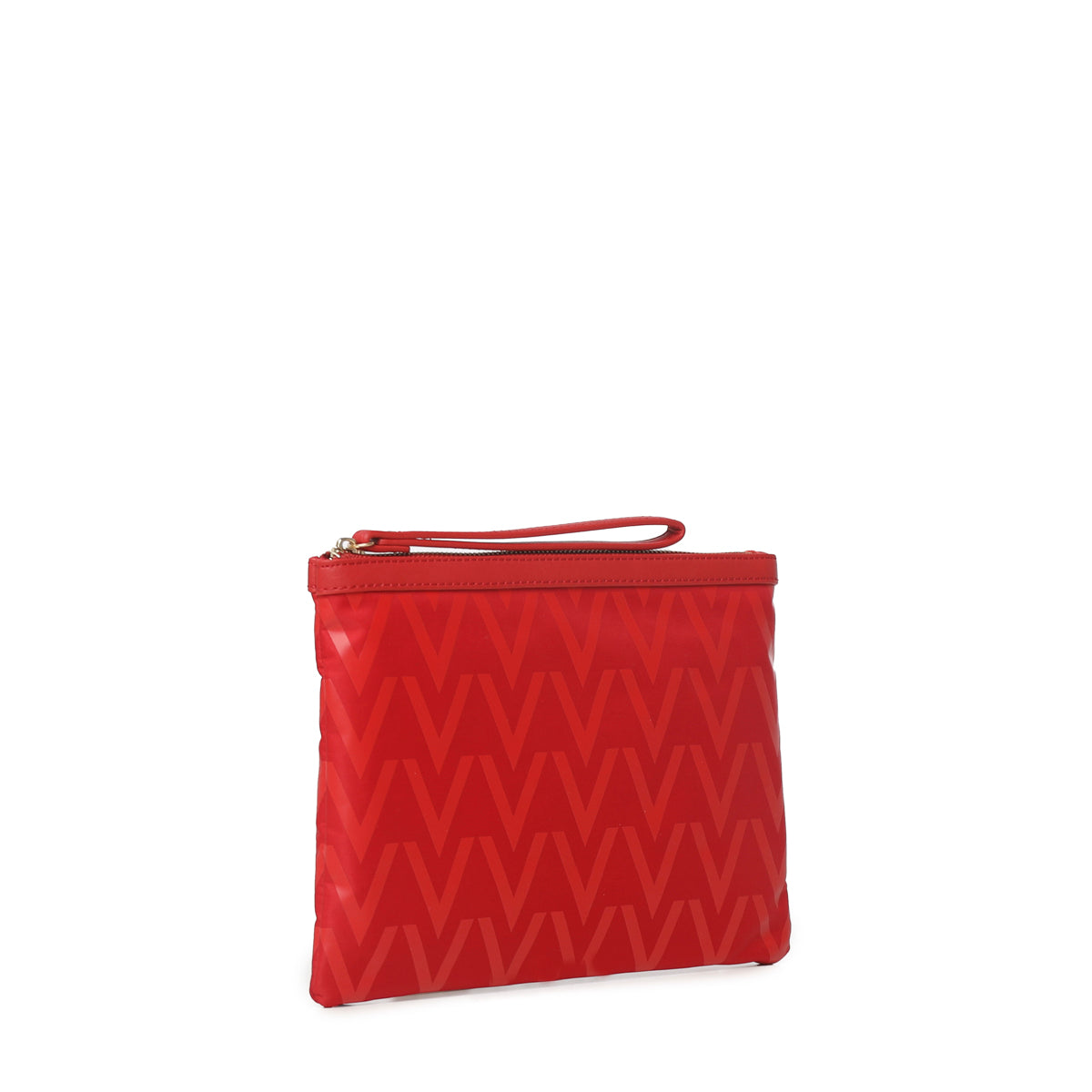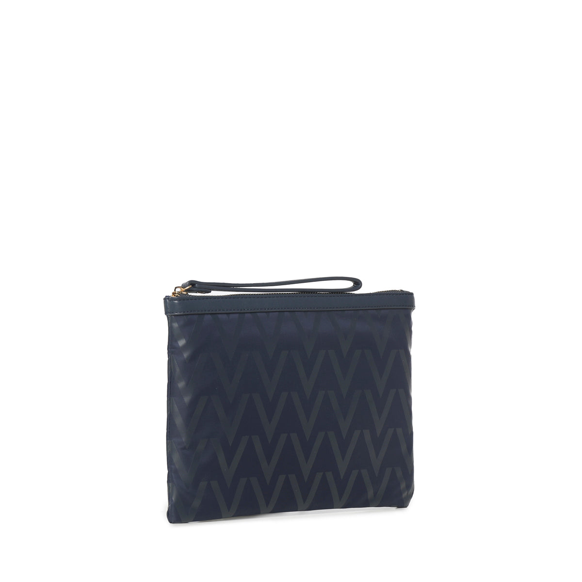 beauty piatto con polsiera in nylon riciclato con stampa all over e maxi V in tono. dettagli in nappa riciclata in tono.