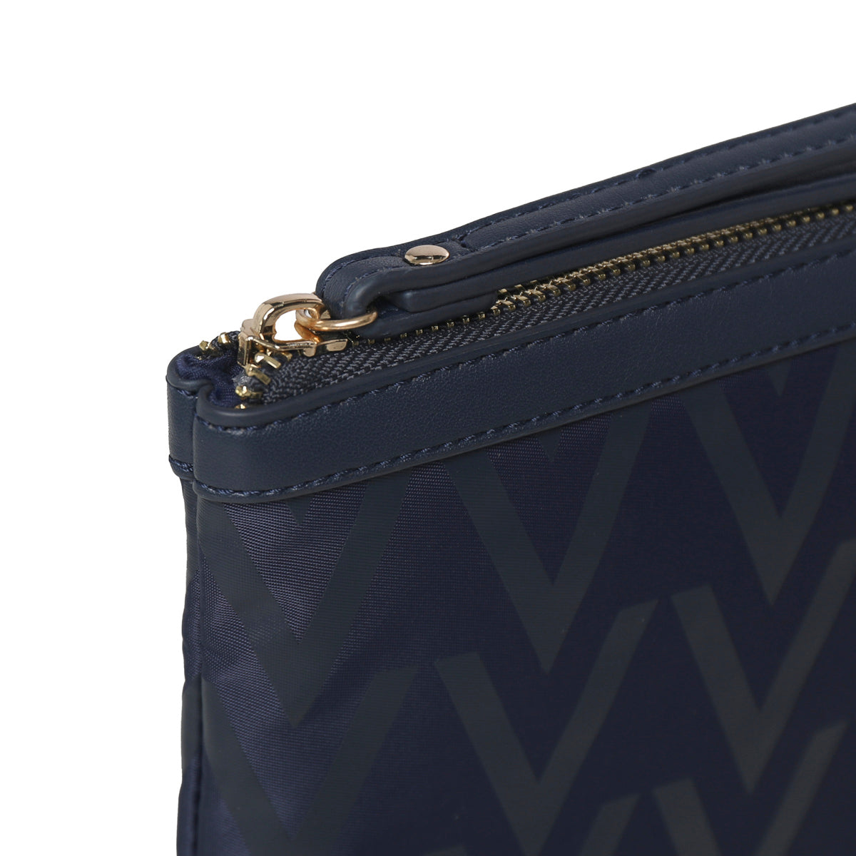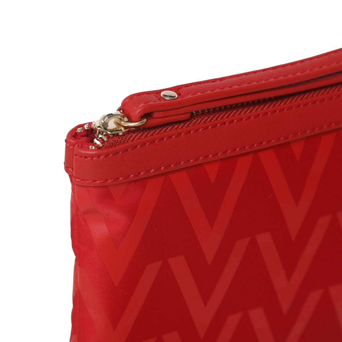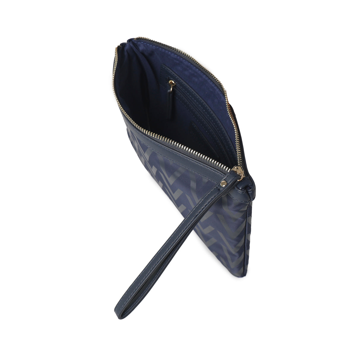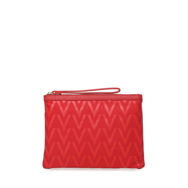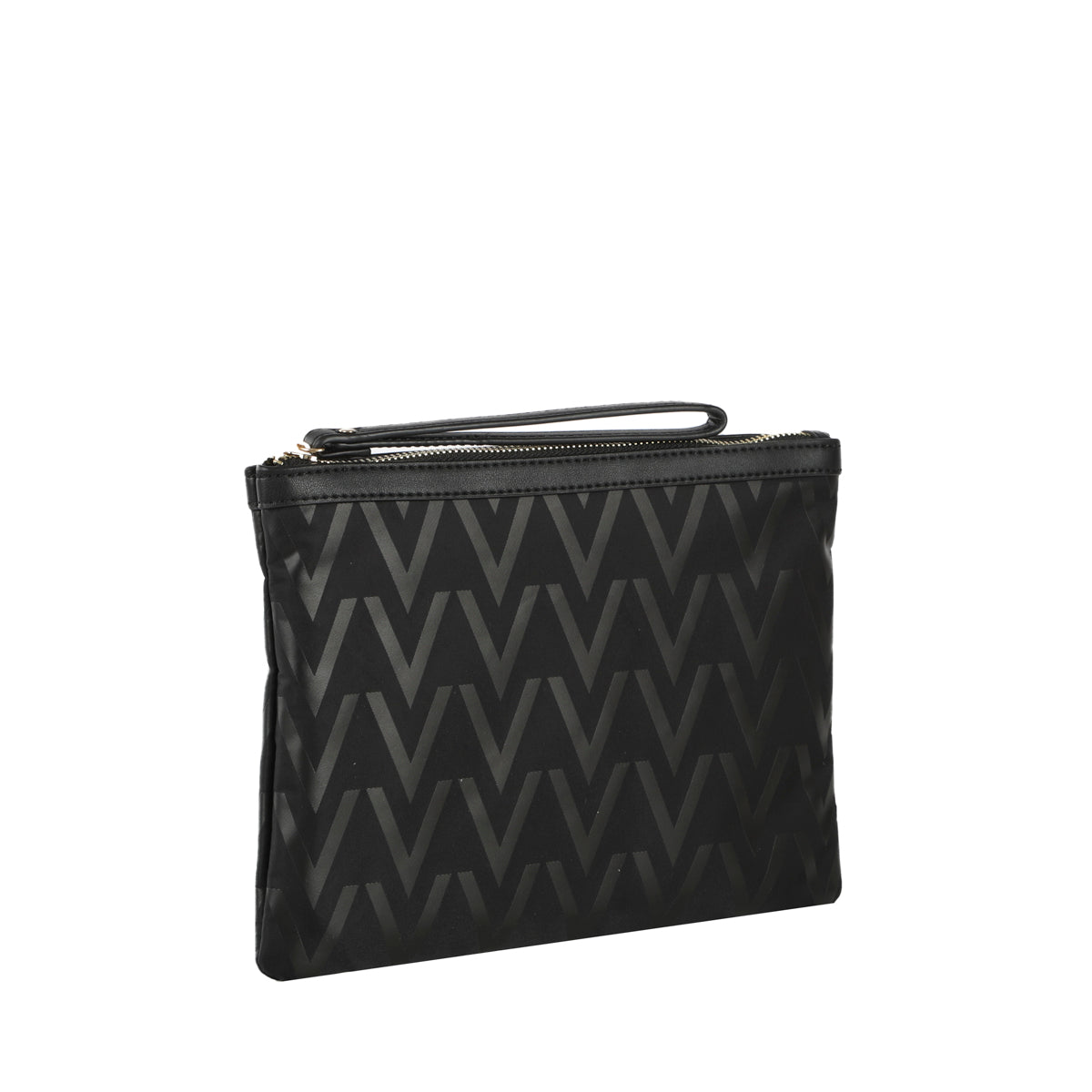 beauty piatto con polsiera in nylon riciclato con stampa all over e maxi V in tono. dettagli in nappa riciclata in tono.