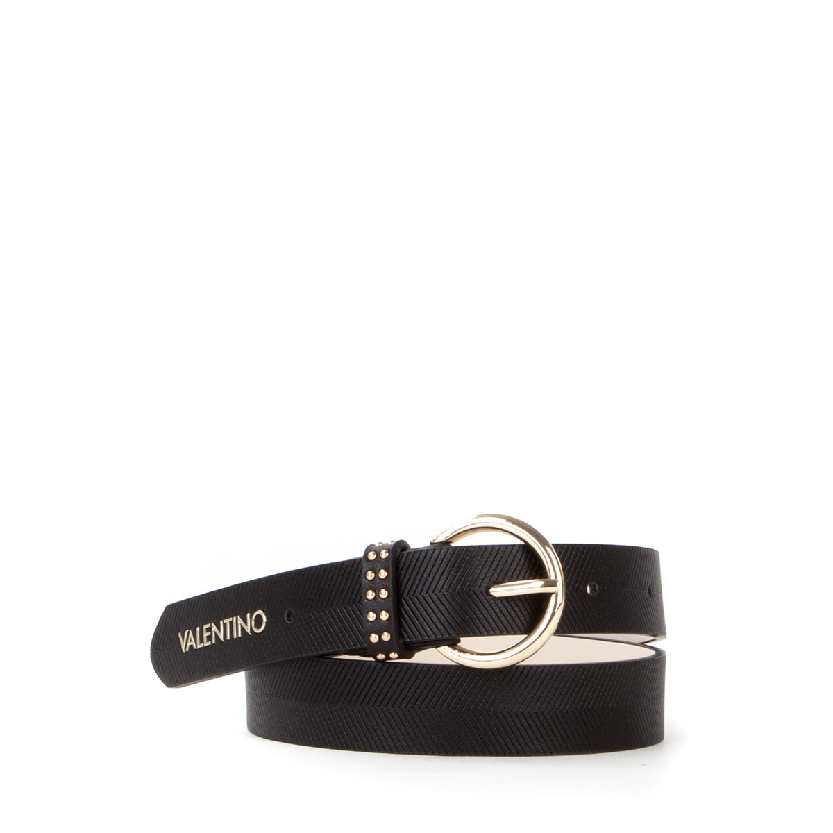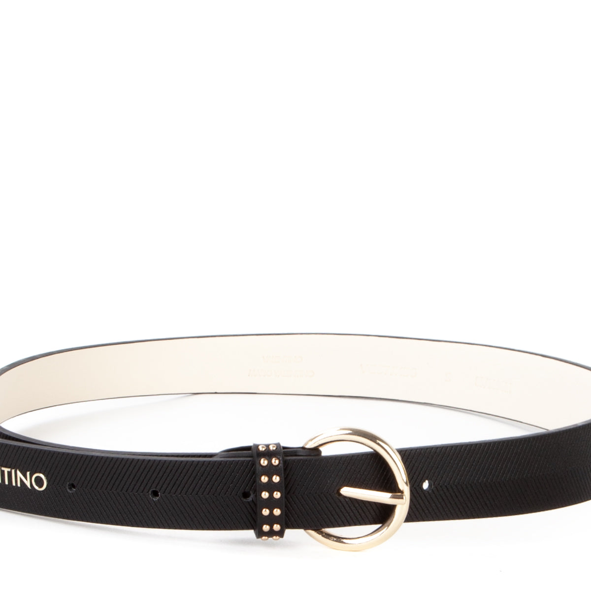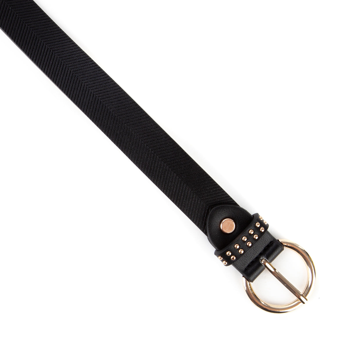 Cintura con ardiglione, dettagli con artwork marchiato a fuoco e passante con micro borchie.