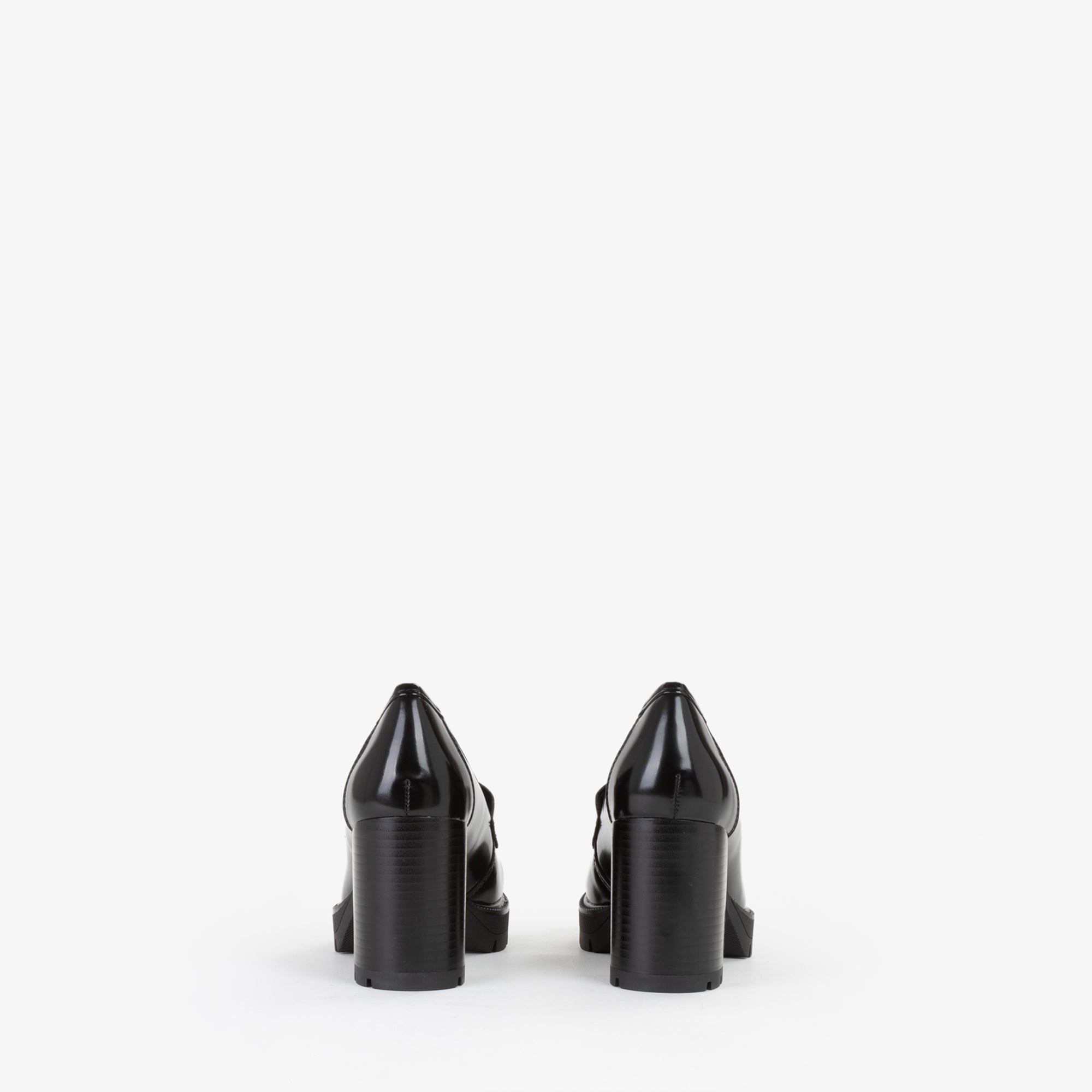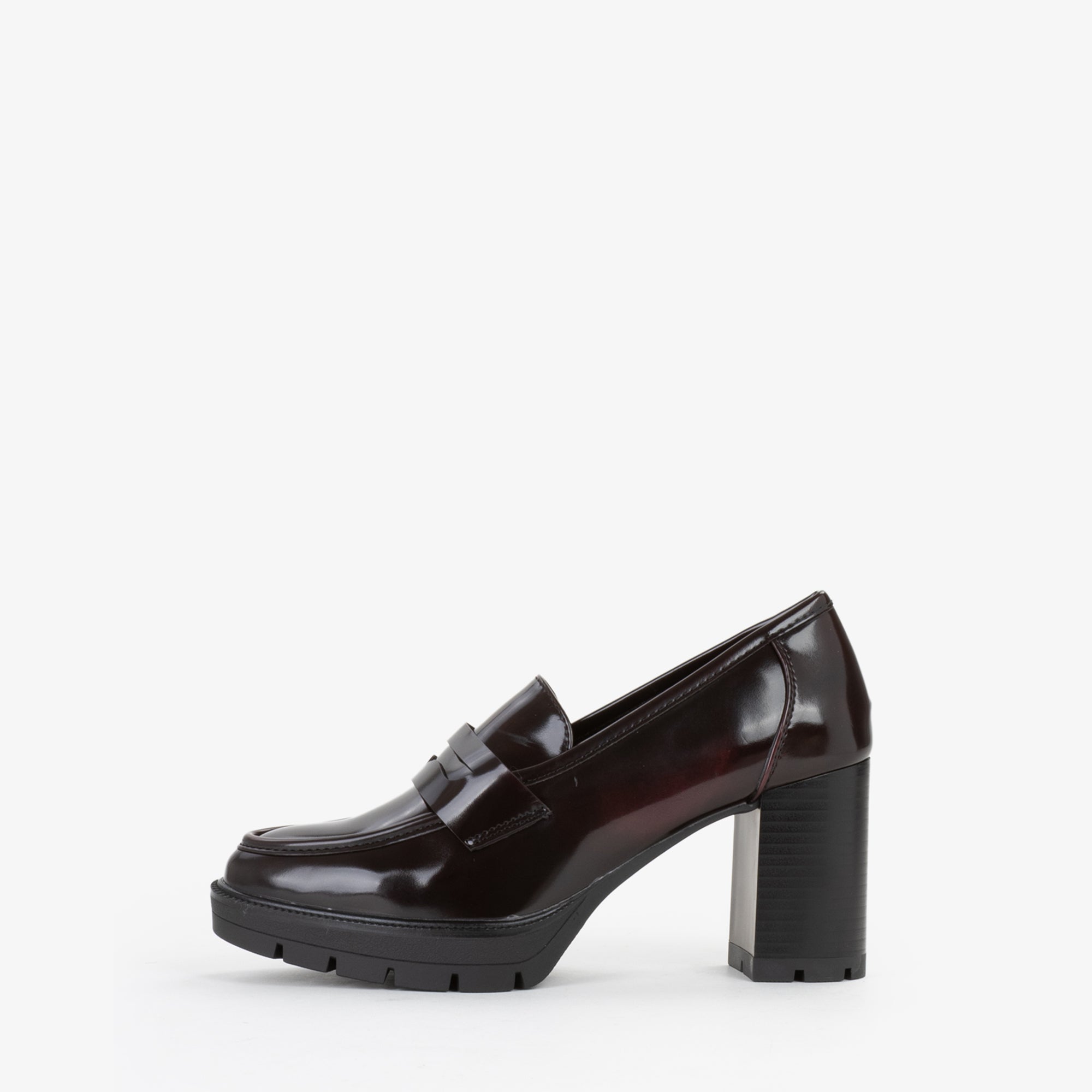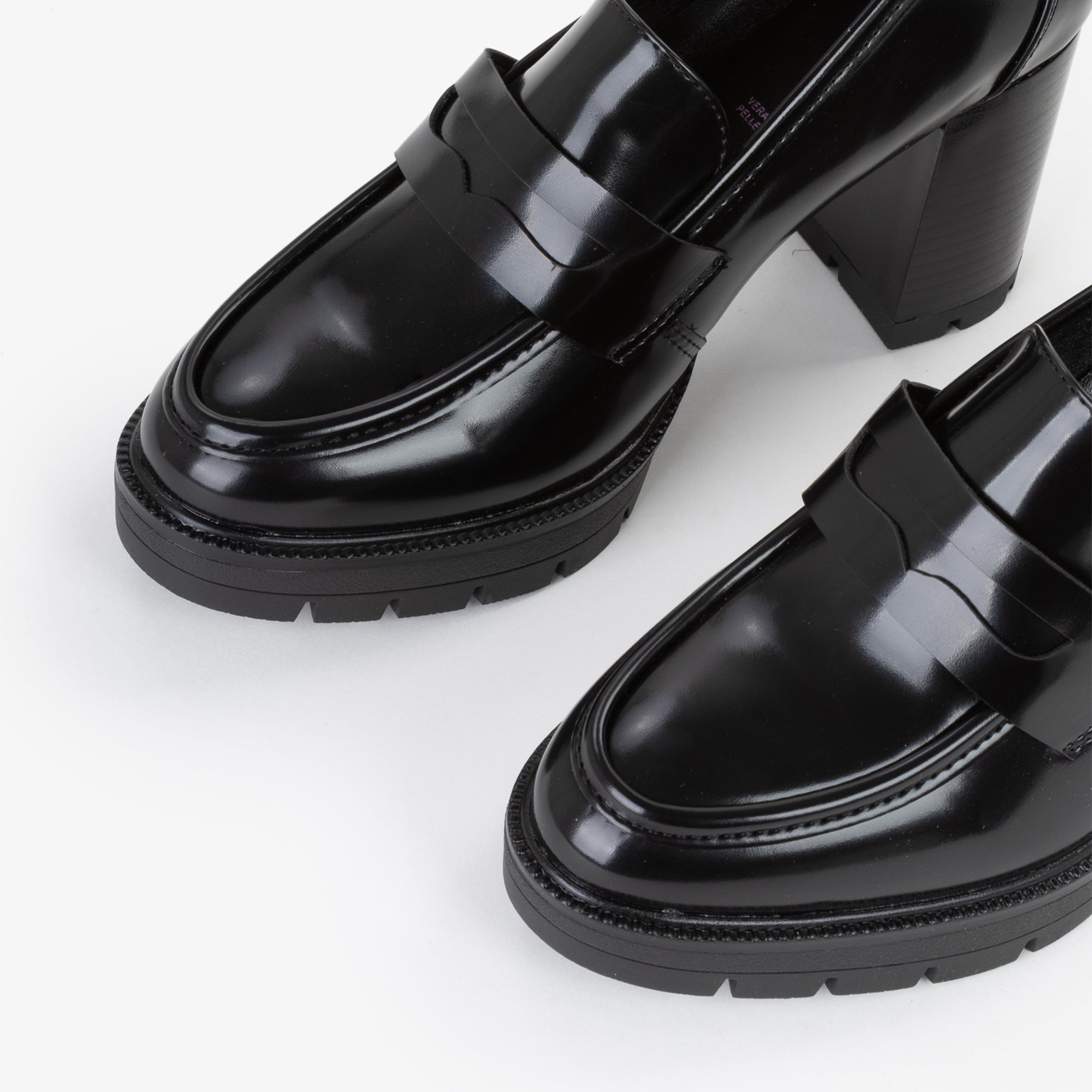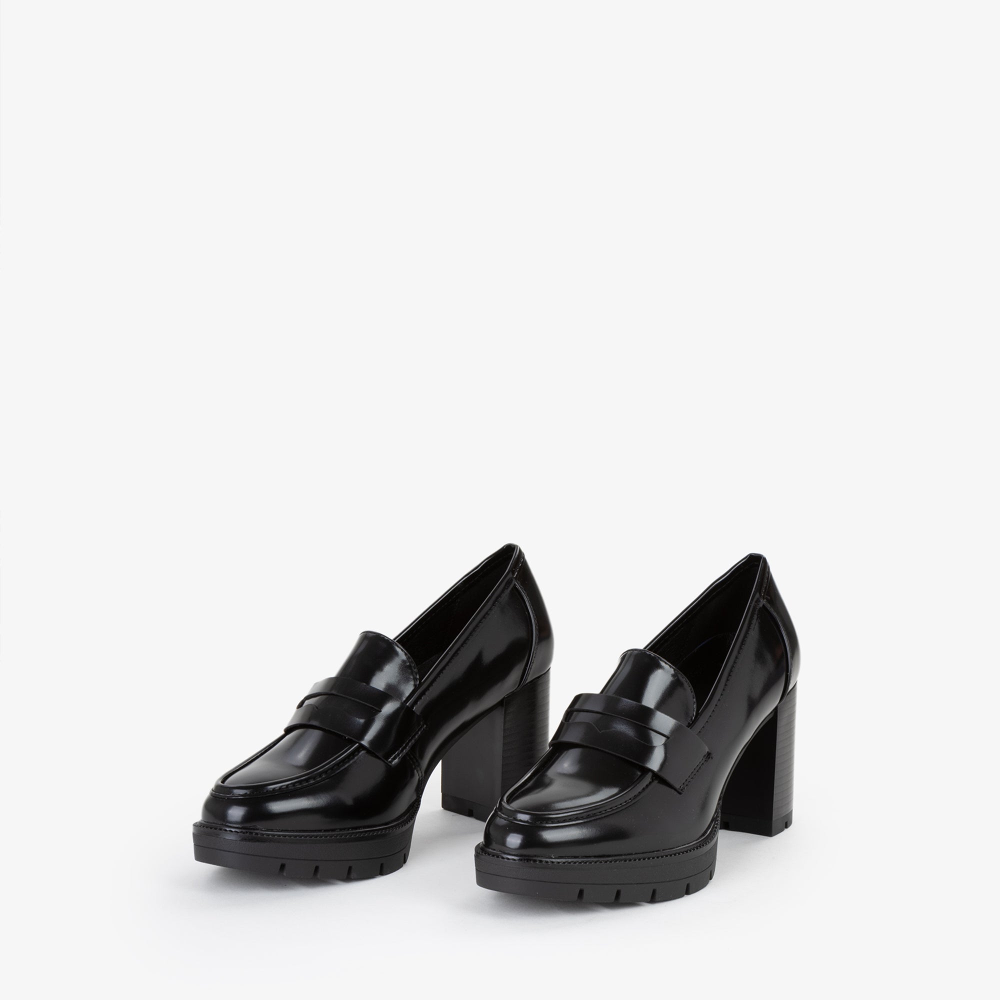 Mocassino con tacco alto e struttura solida, dotato di tomaia in materiale sintetico lucido e mascherina frontale in stile penny loafer. Il fondo è realizzato in gomma con suola carrarmato, che garantisce stabilità e durata anche su superfici scivolose. Il tacco largo conferisce slancio e comfort, rendendo questa calzatura ideale per la quotidianità in contesti urbani o per aggiornare con carattere un look da ufficio. Perfetto con pantaloni cropped o gonne midi per uneleganza grintosa.undefined