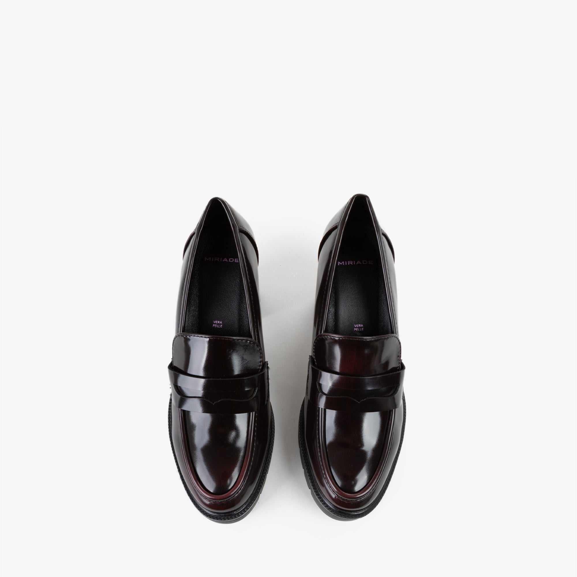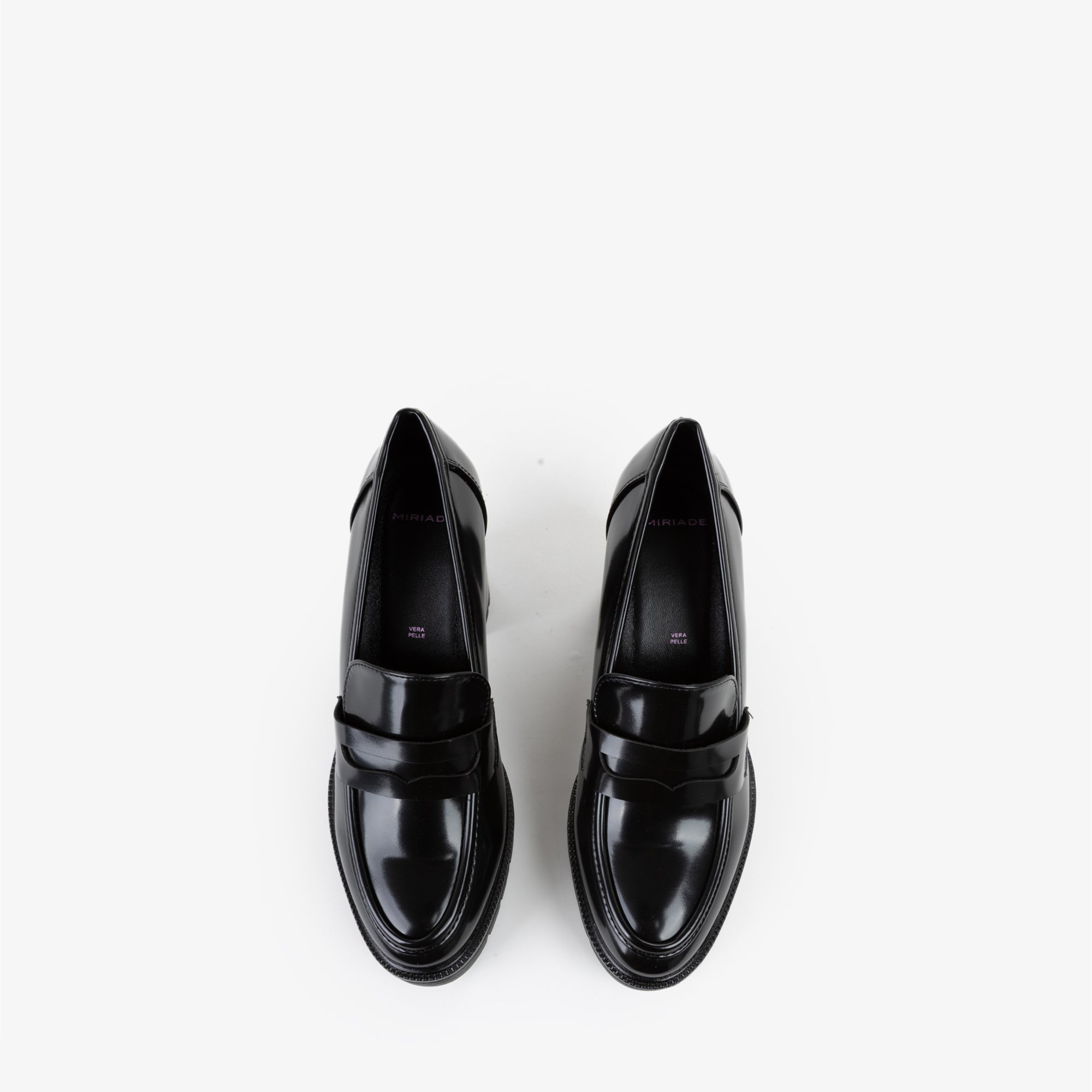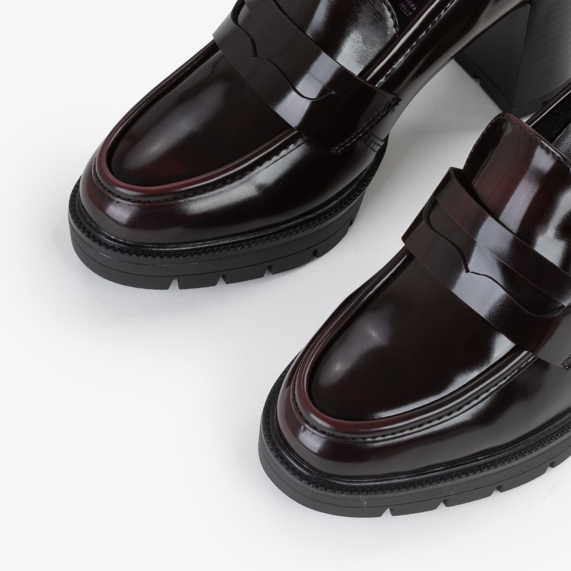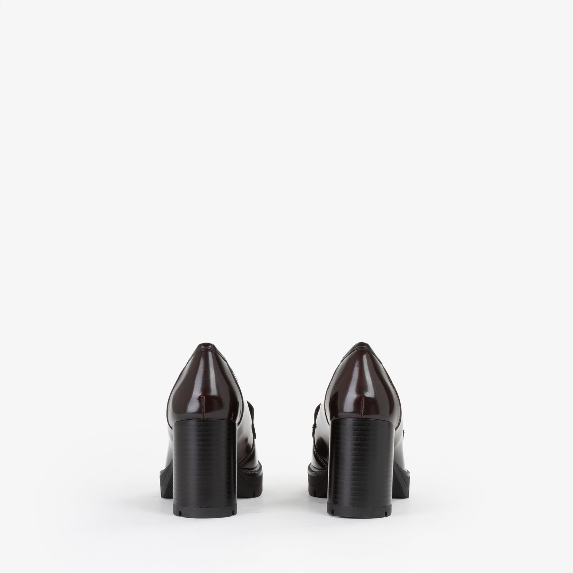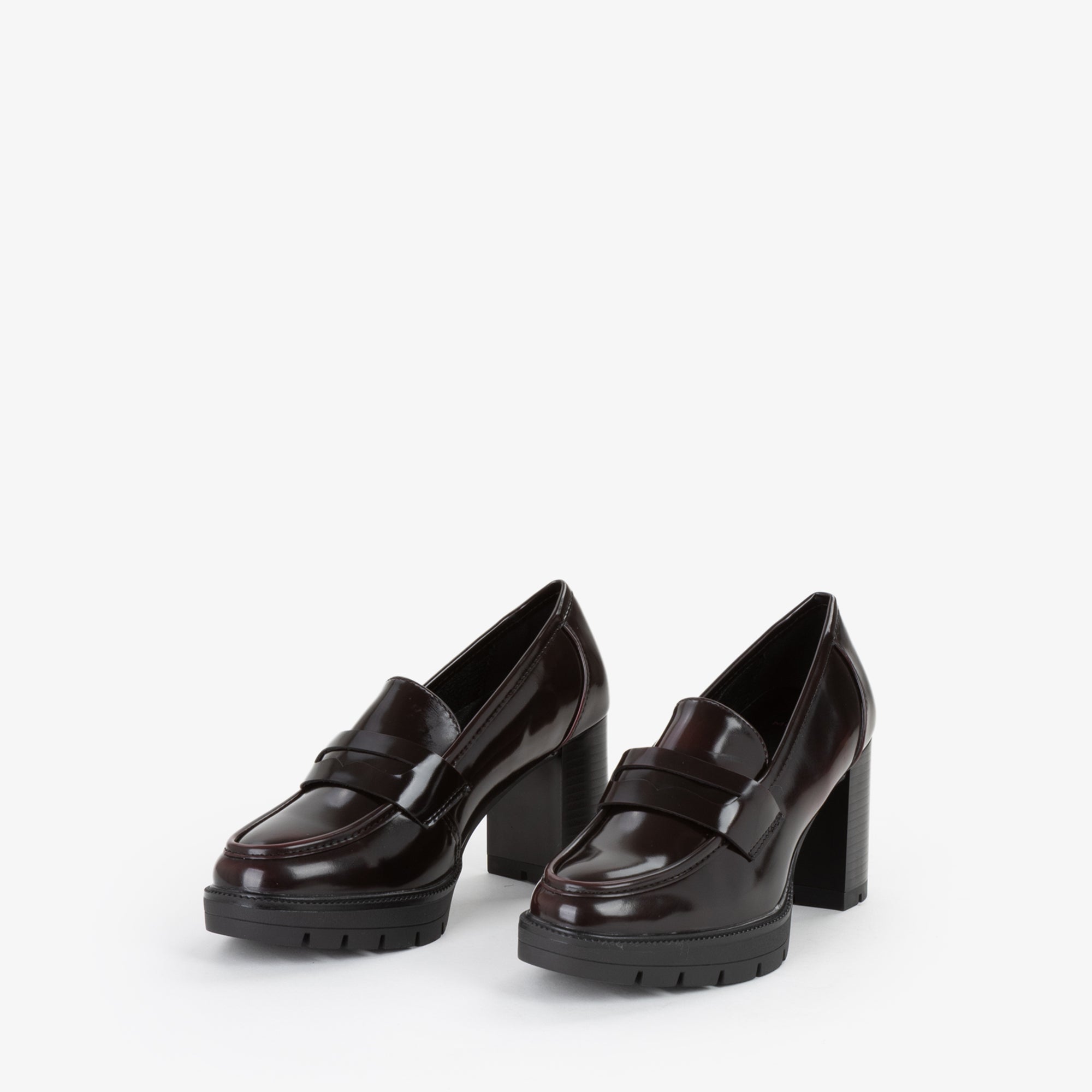 Mocassino con tacco alto e struttura solida, dotato di tomaia in materiale sintetico lucido e mascherina frontale in stile penny loafer. Il fondo è realizzato in gomma con suola carrarmato, che garantisce stabilità e durata anche su superfici scivolose. Il tacco largo conferisce slancio e comfort, rendendo questa calzatura ideale per la quotidianità in contesti urbani o per aggiornare con carattere un look da ufficio. Perfetto con pantaloni cropped o gonne midi per uneleganza grintosa.undefined