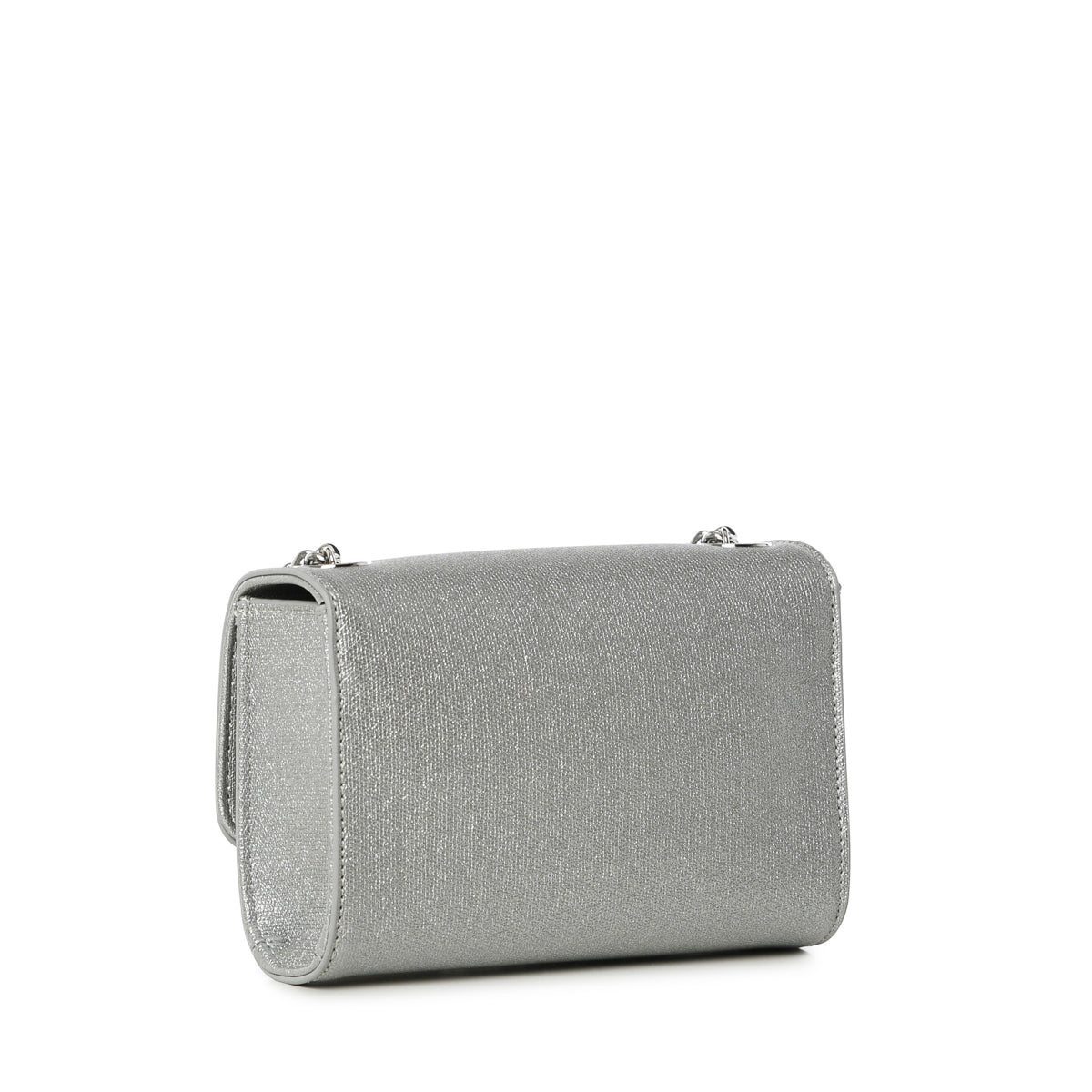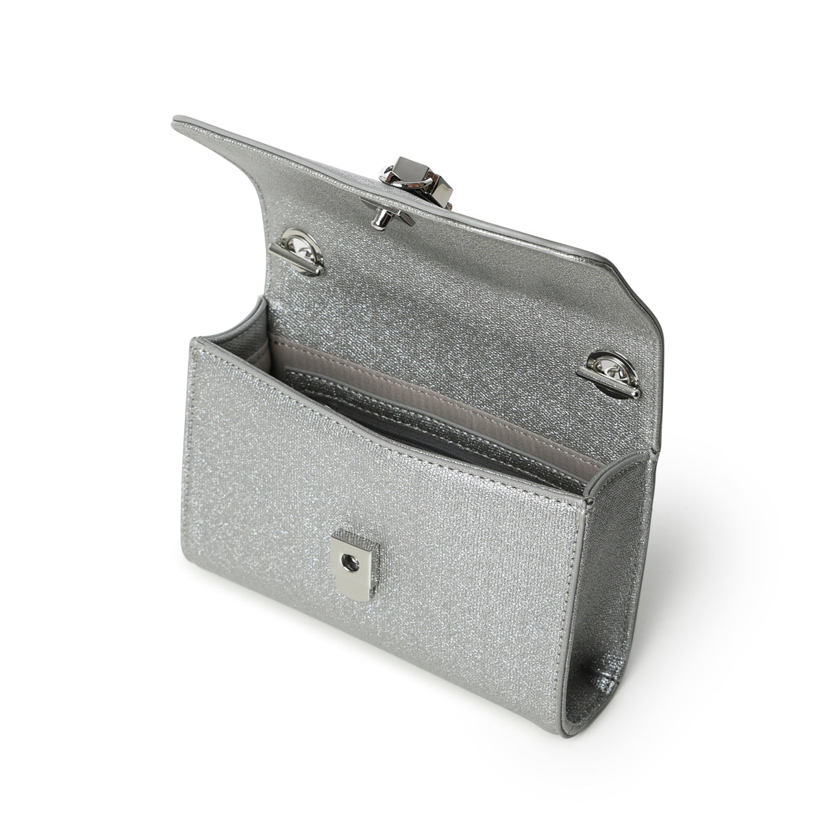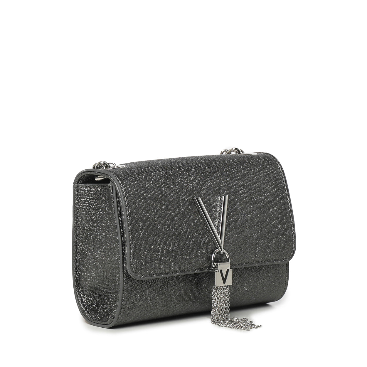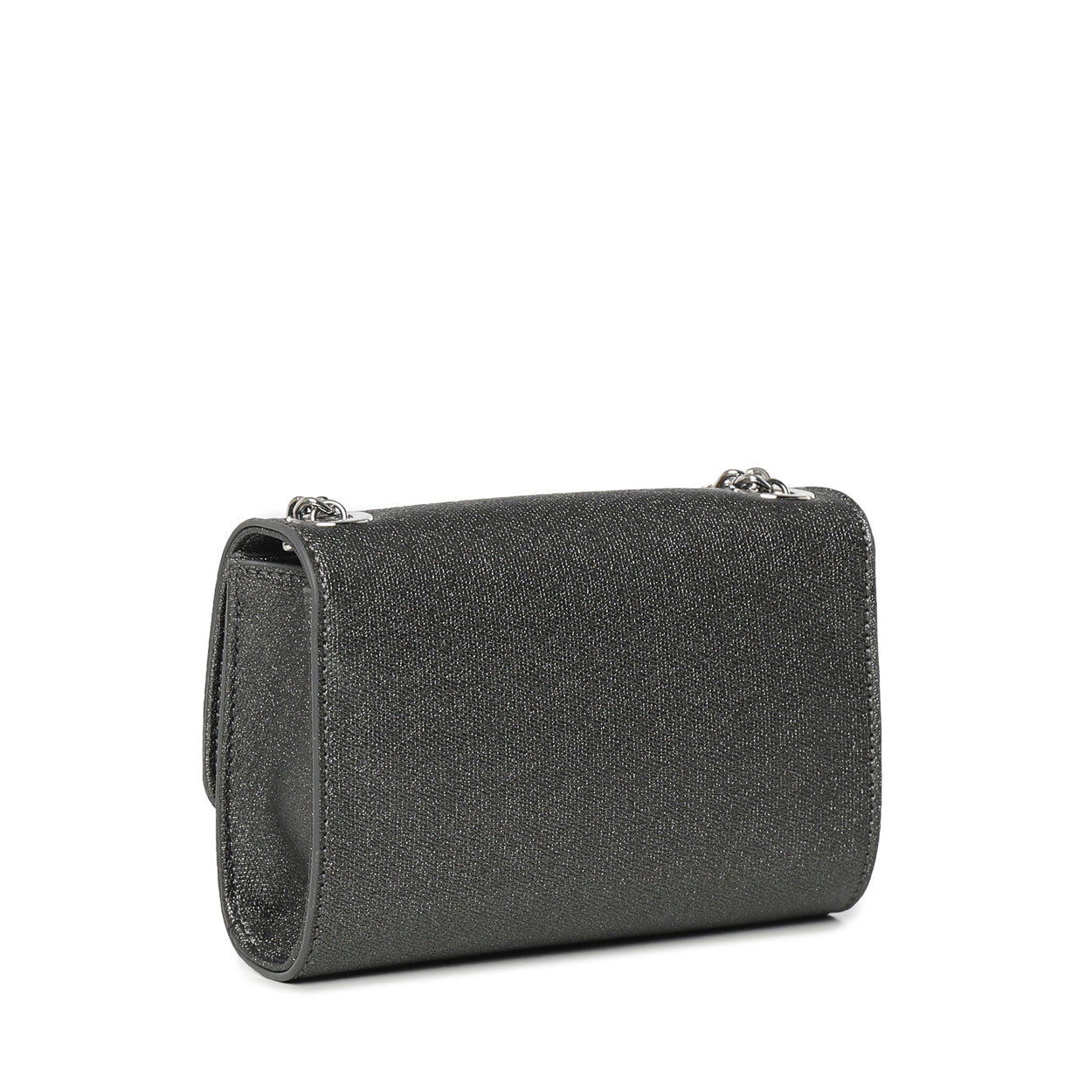 Pattina con tracolla in catena. La personalizzazione V presenta il dettaglio con lucchetto e micro catene pendenti.