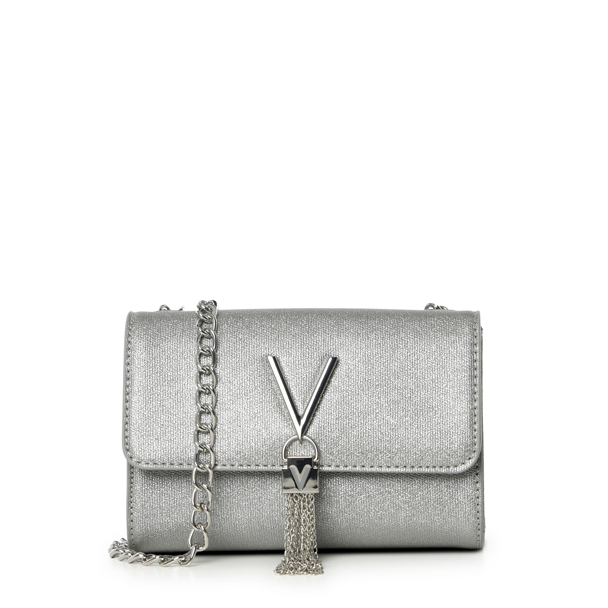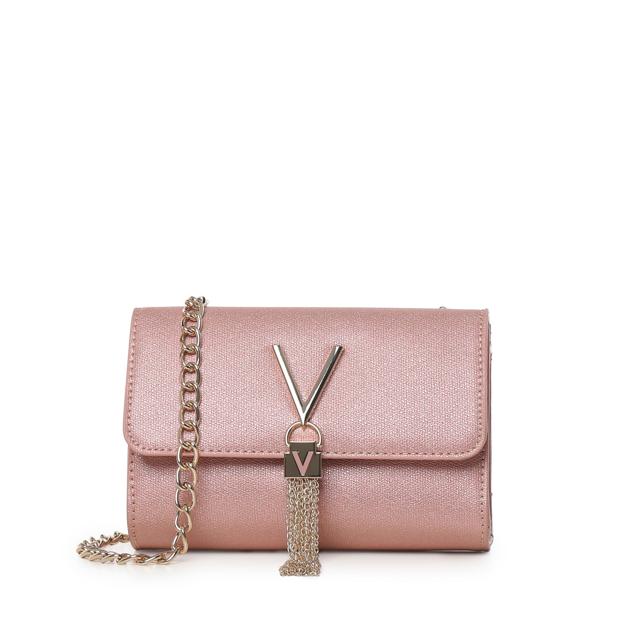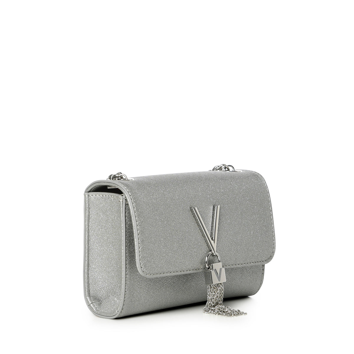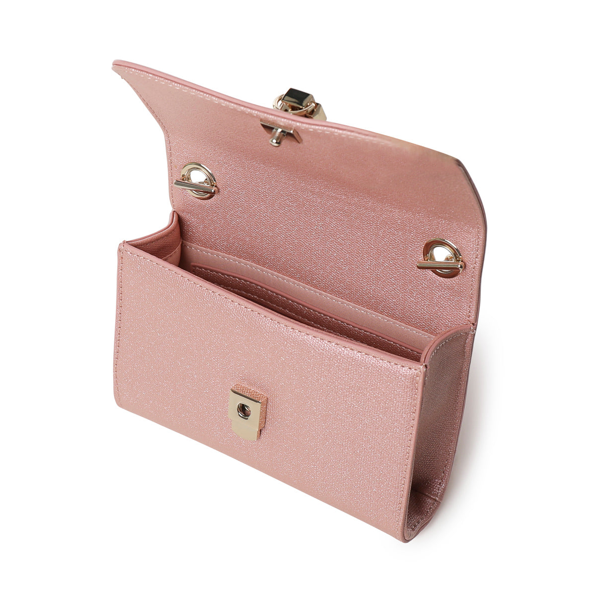 Pattina con tracolla in catena. La personalizzazione V presenta il dettaglio con lucchetto e micro catene pendenti.