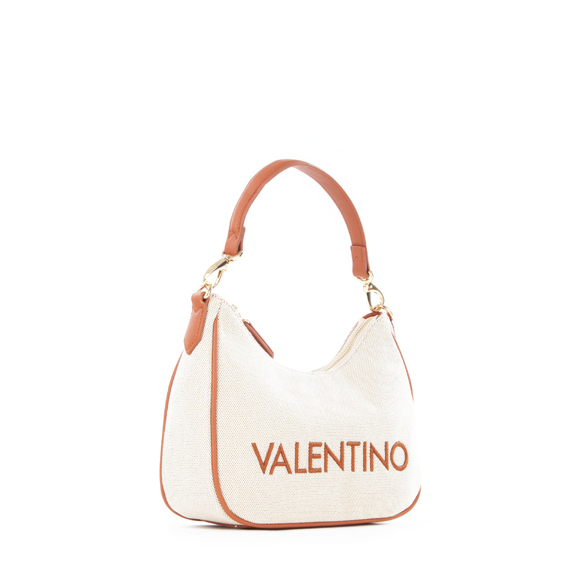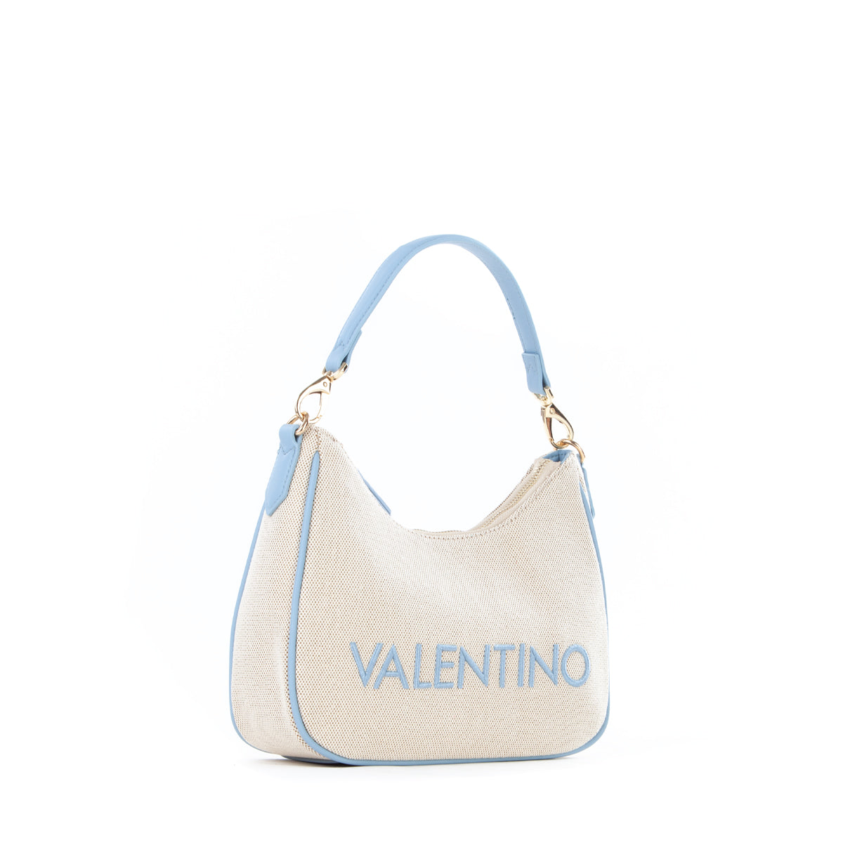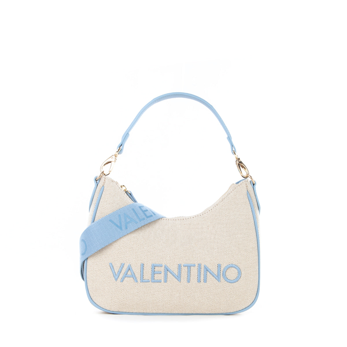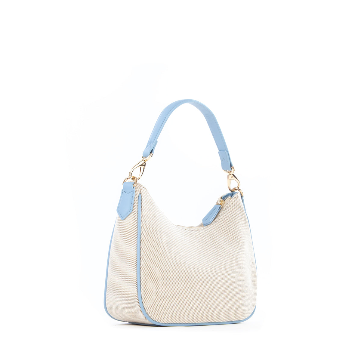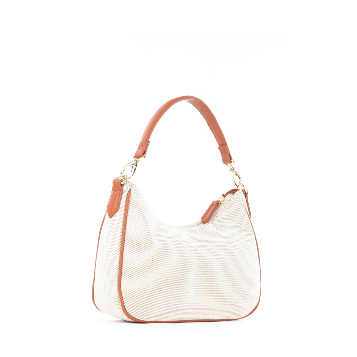 Sacca a spalla in canvas con riporto in nappa a contrasto. La personalizzazione è ricamata in tinta al riporto. E' dotata di una tracolla di servizio in nastro in tinta al riporto.