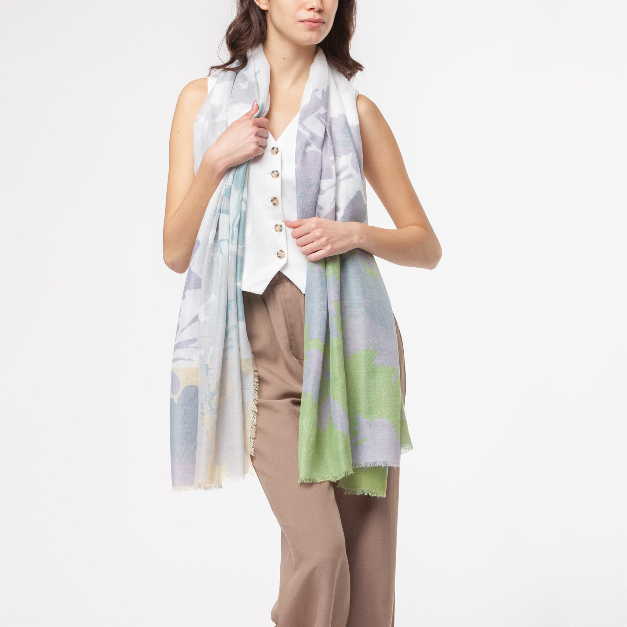 Scialle dal design sofisticato, con eleganti disegni floreali stampati su un tessuto leggero e morbido al tatto. Adatto per chi vuole dare un tocco in più ai suoi outfit.