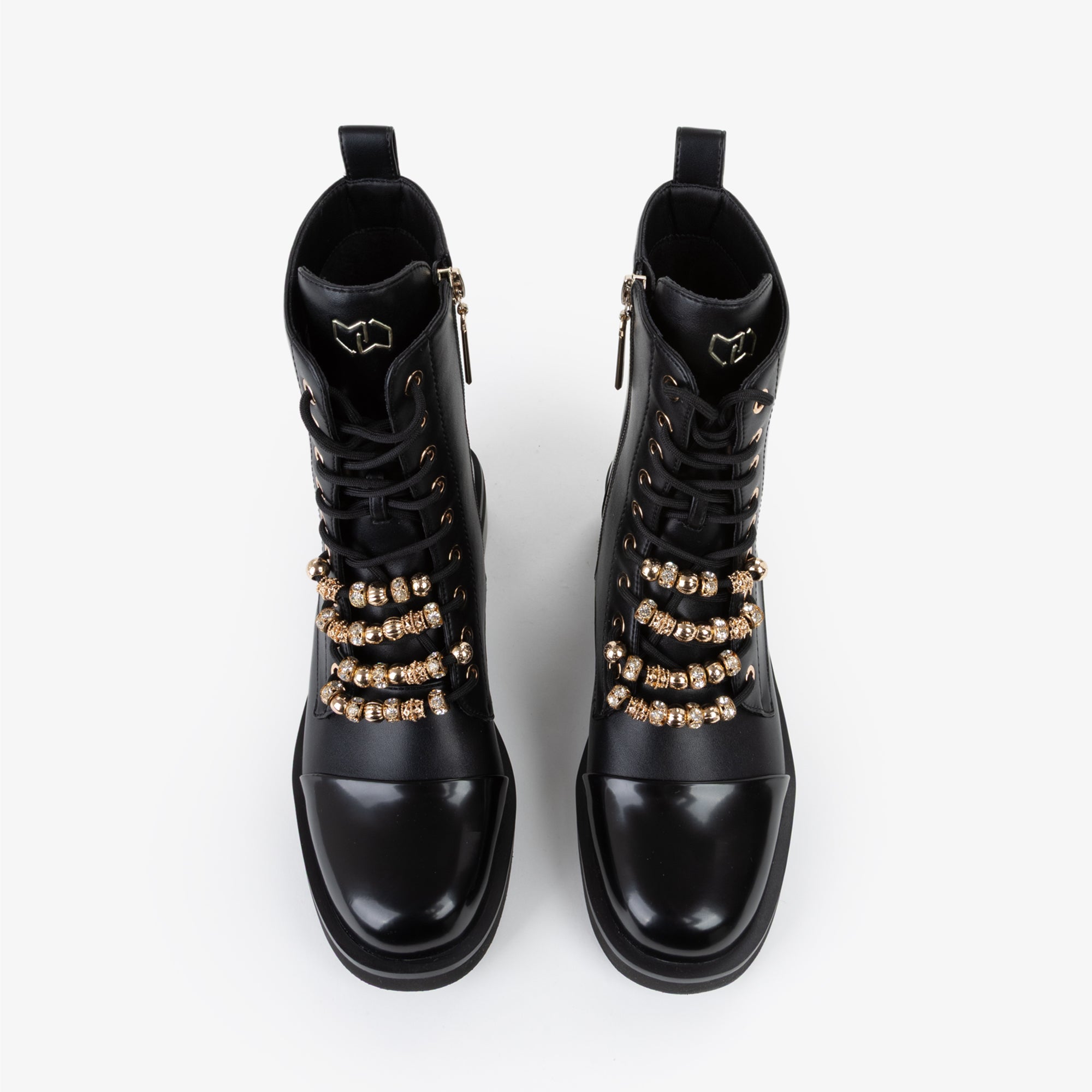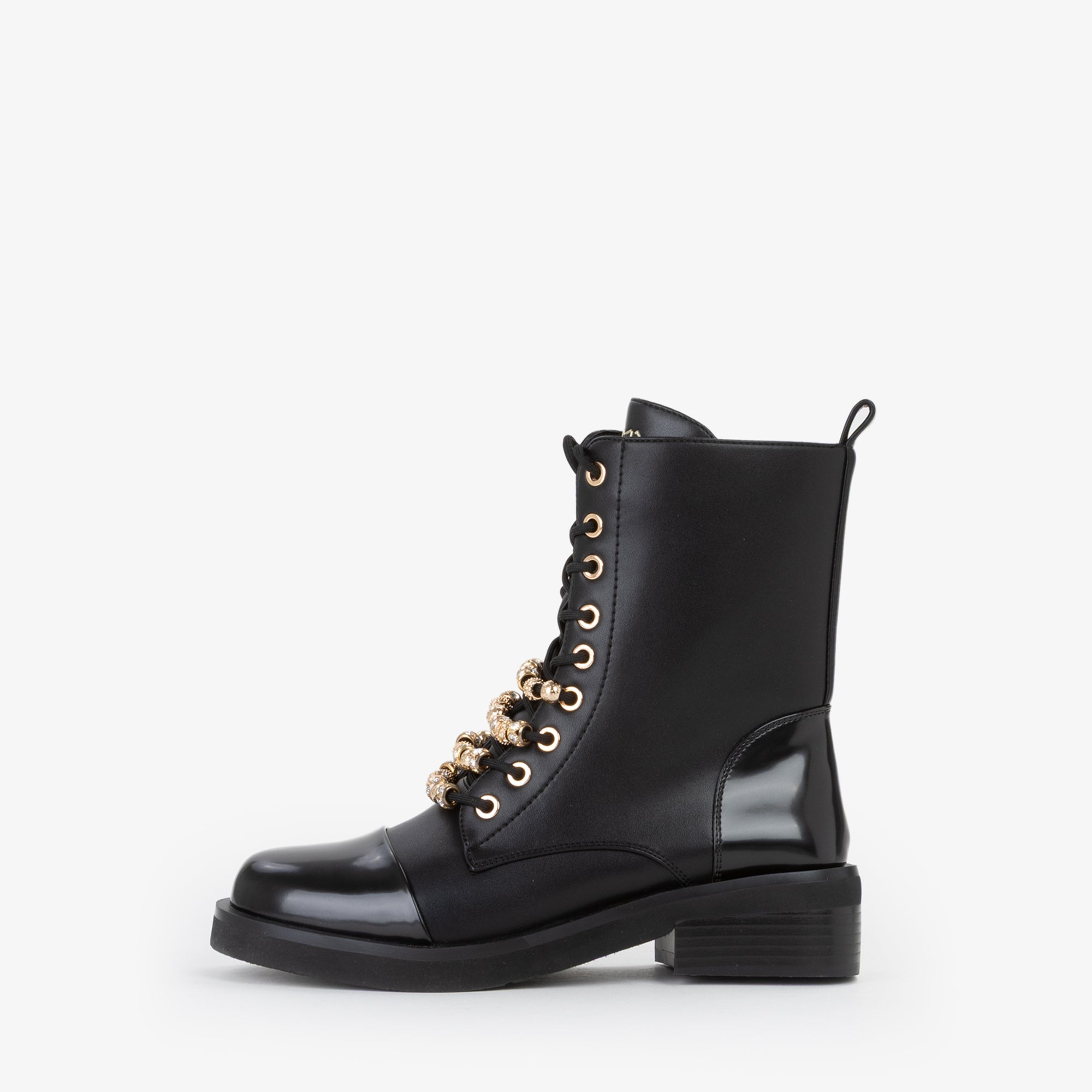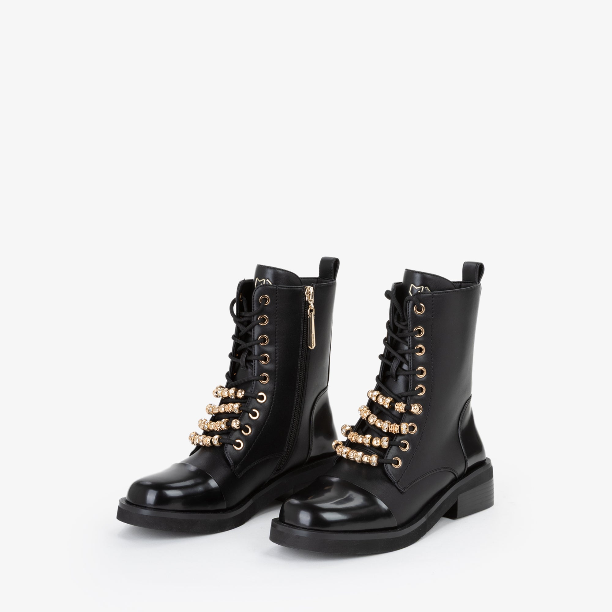 Anfibio stringato dal look deciso e contemporaneo, arricchito da accessori dorati che decorano i lacci, donano un tocco di luminosità e carattere. Il puntale lucido contrasta con la tomaia opaca, creando un effetto sofisticato. La suola robusta garantisce stabilità e comfort, rendendolo ideale per completare outfit grintosi da giorno o look urban chic per la sera.undefined