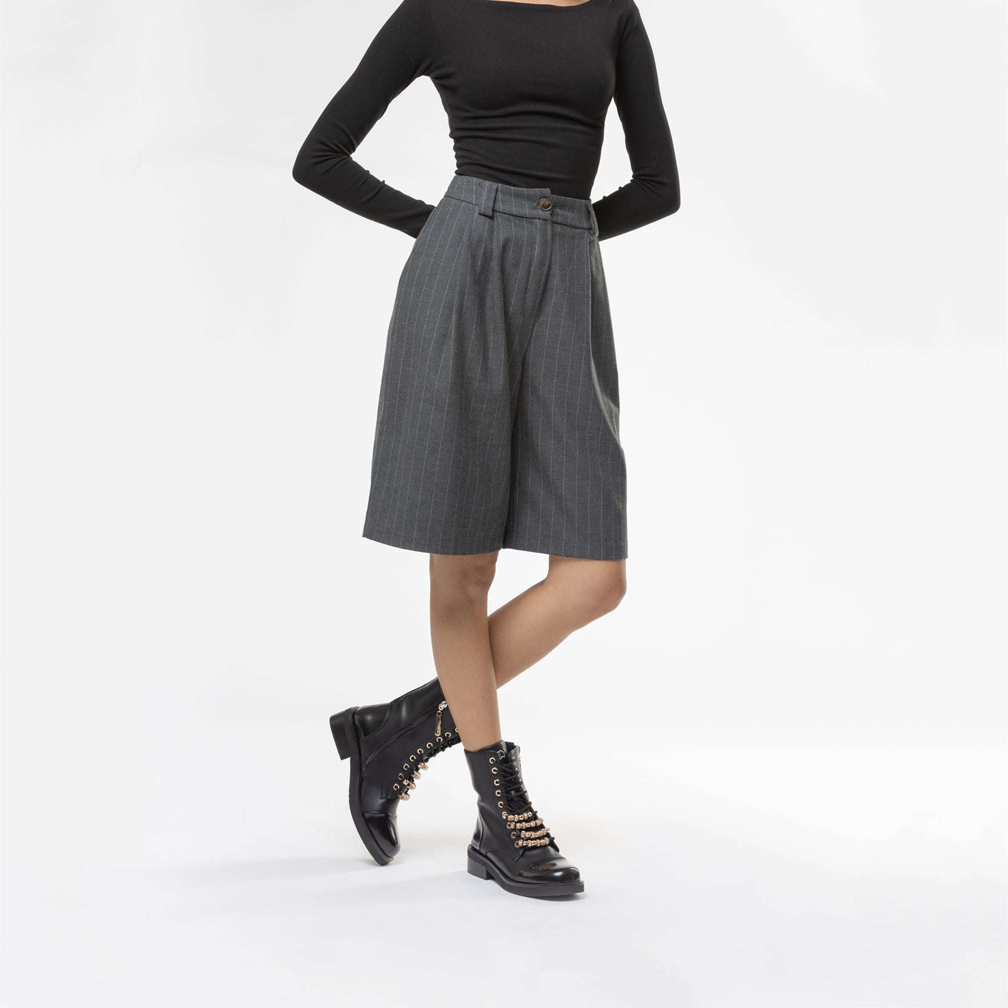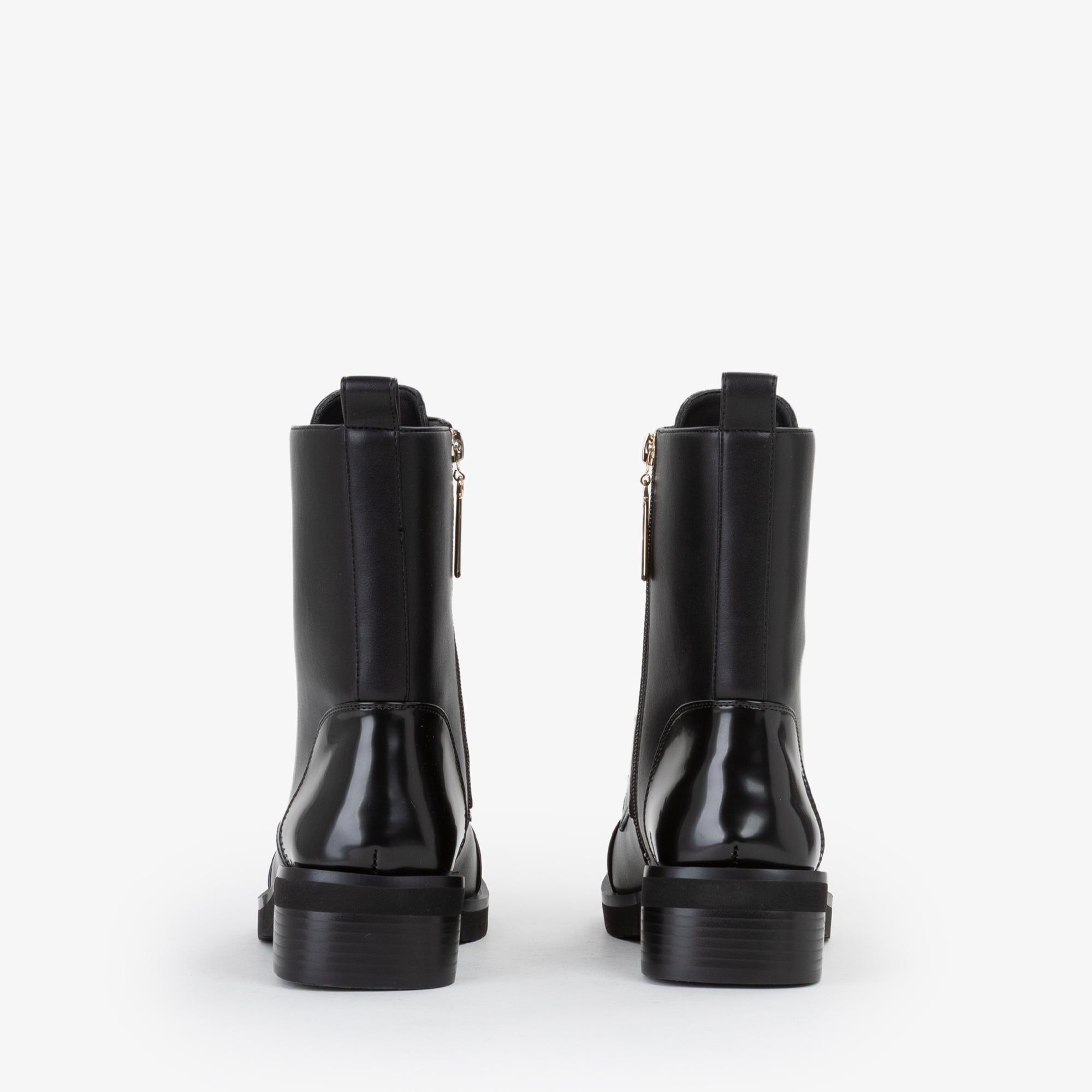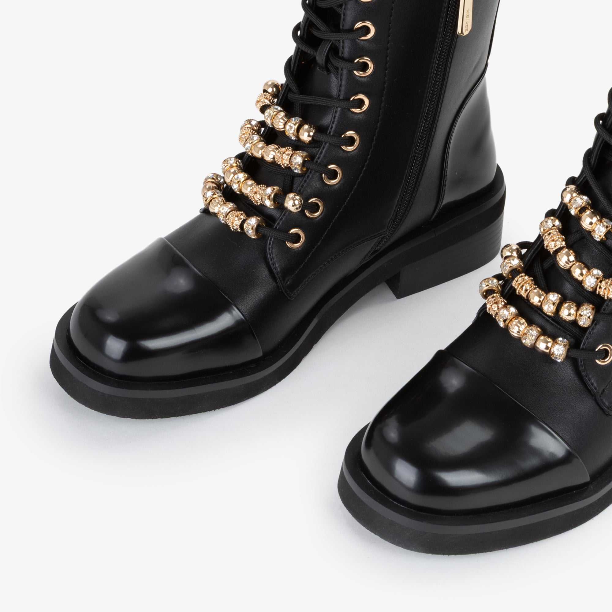 Anfibio stringato dal look deciso e contemporaneo, arricchito da accessori dorati che decorano i lacci, donano un tocco di luminosità e carattere. Il puntale lucido contrasta con la tomaia opaca, creando un effetto sofisticato. La suola robusta garantisce stabilità e comfort, rendendolo ideale per completare outfit grintosi da giorno o look urban chic per la sera.undefined
