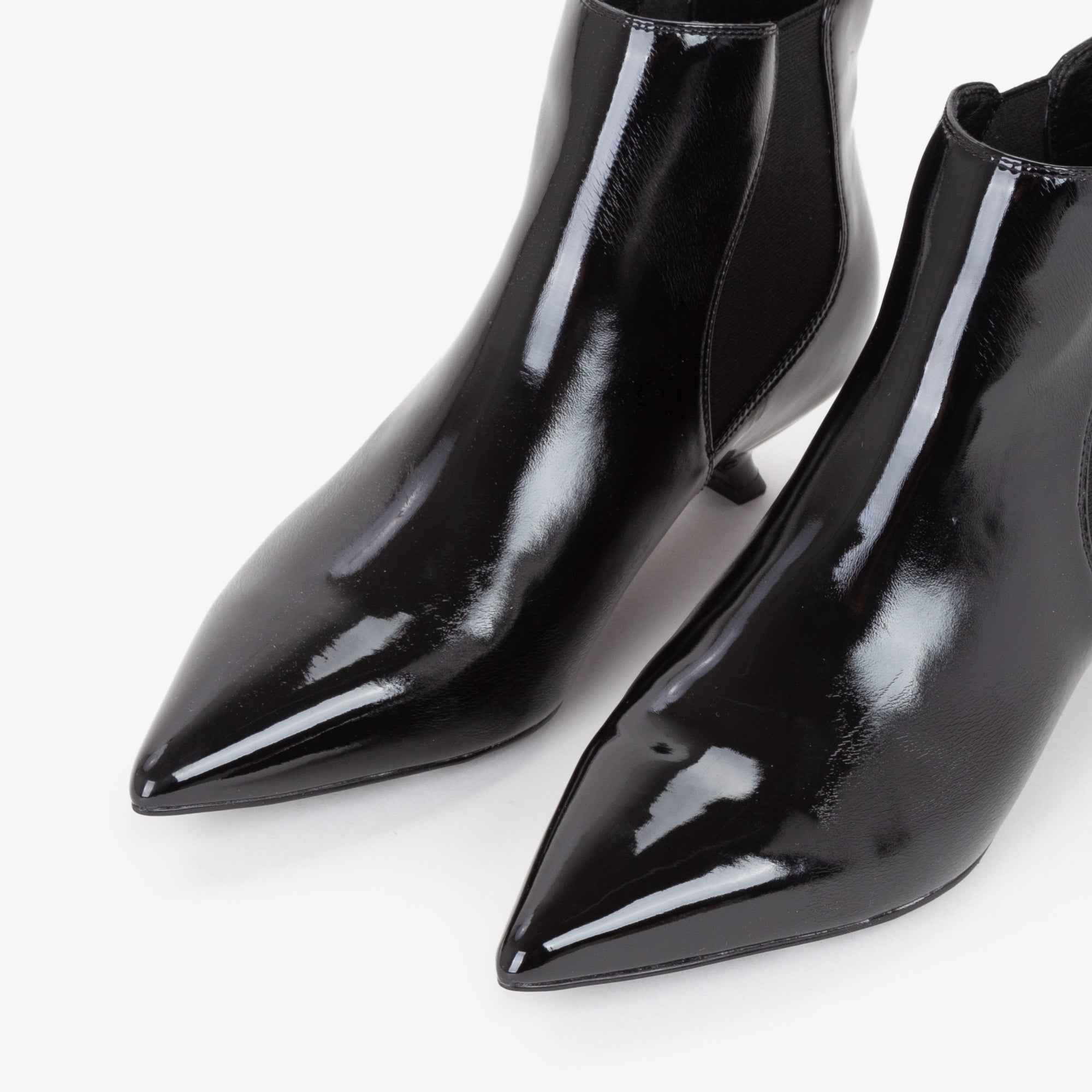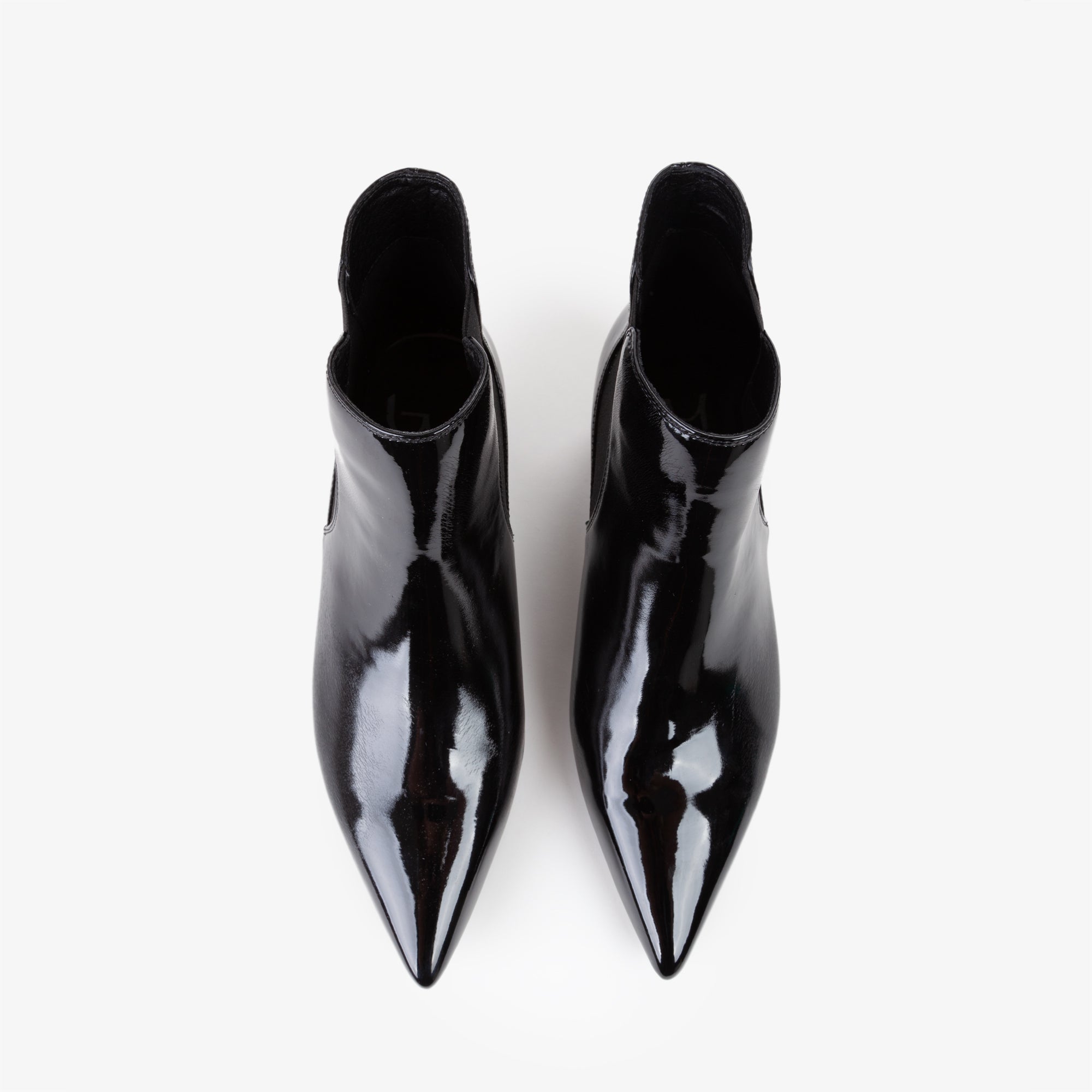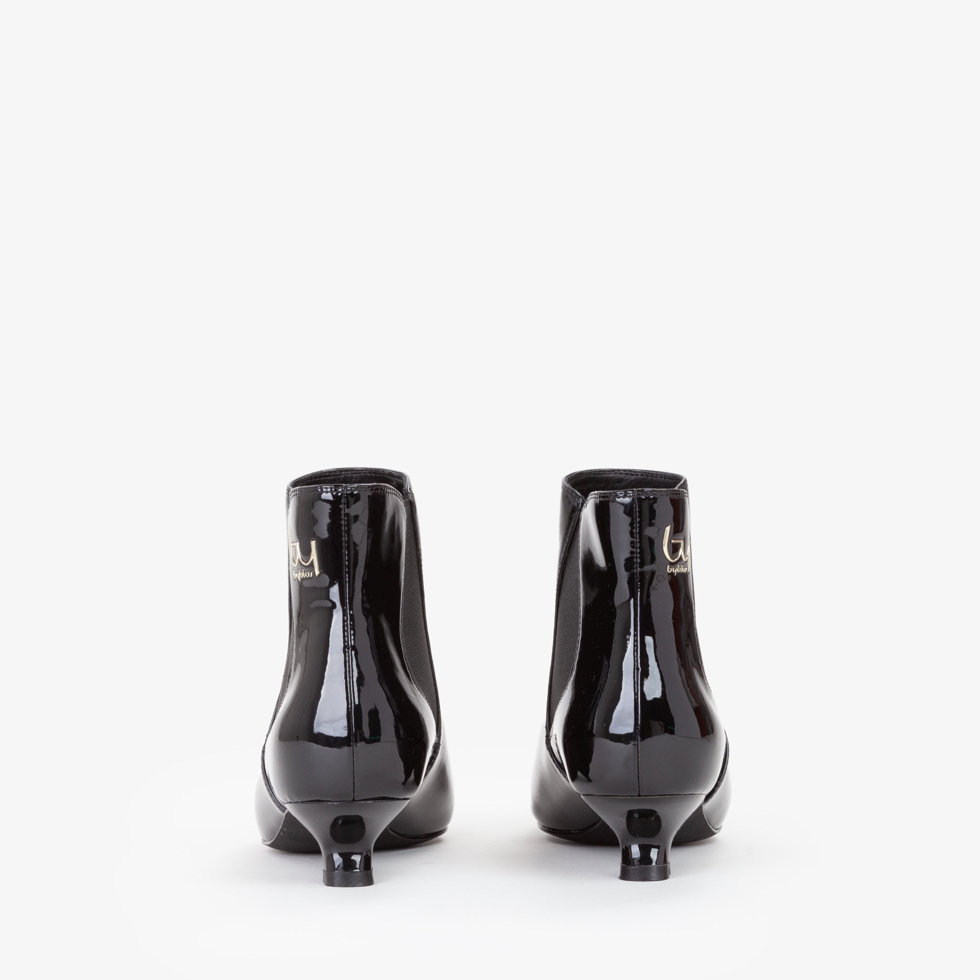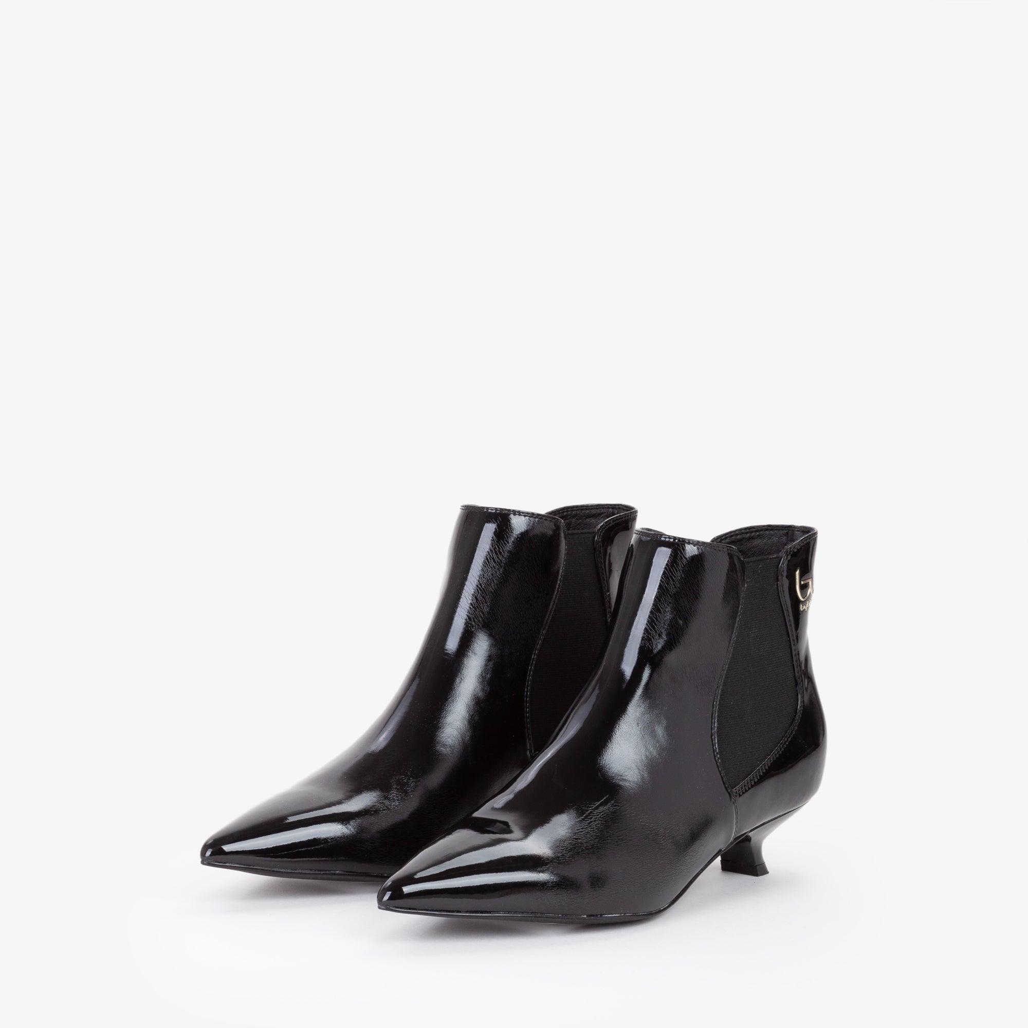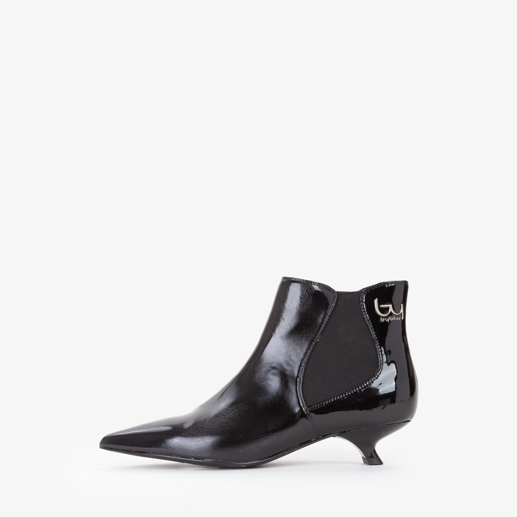 Stivaletto in vernice, dalleleganza sofisticata e dal carattere deciso. La punta sfilata regala una silhouette slanciata, mentre iltacco kitten dona comfort e femminilità. Il modello chelsea assicura una calzata pratica e avvolgente. Il logo dorato ByByblos, discreto ma dimpatto, impreziosisce il design. Perfetto per completare look formali o dare un tocco chic e contemporaneo a outfit quotidiani.