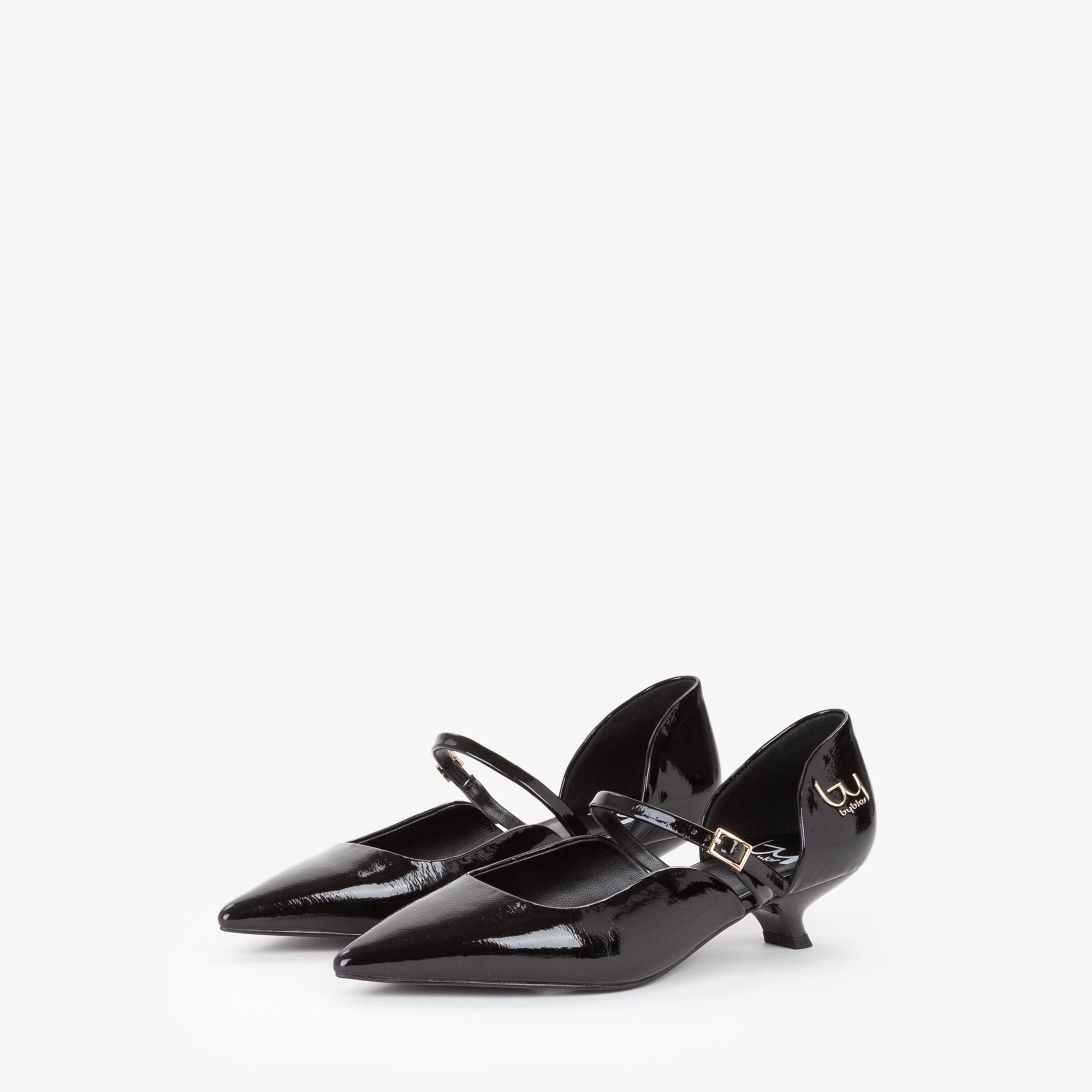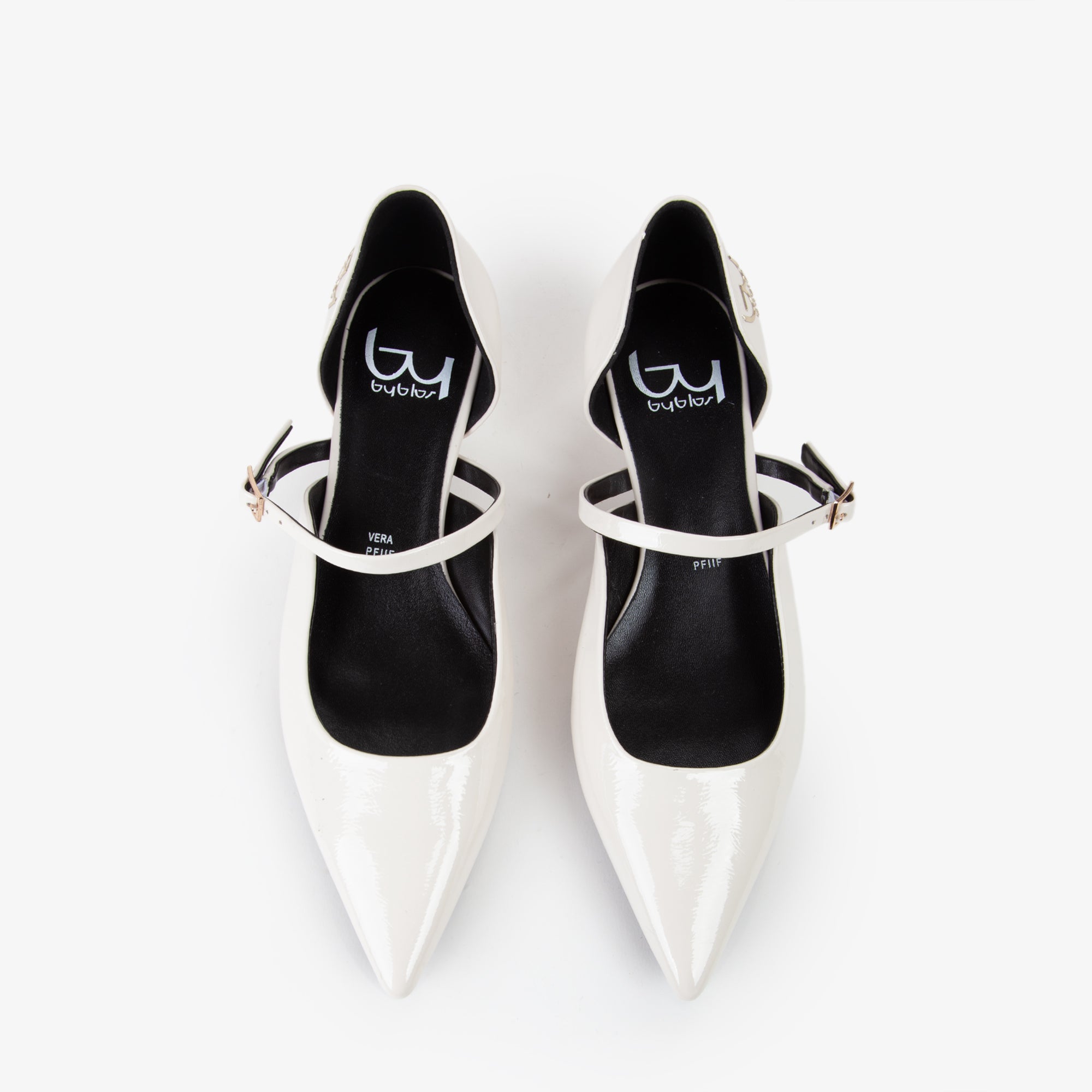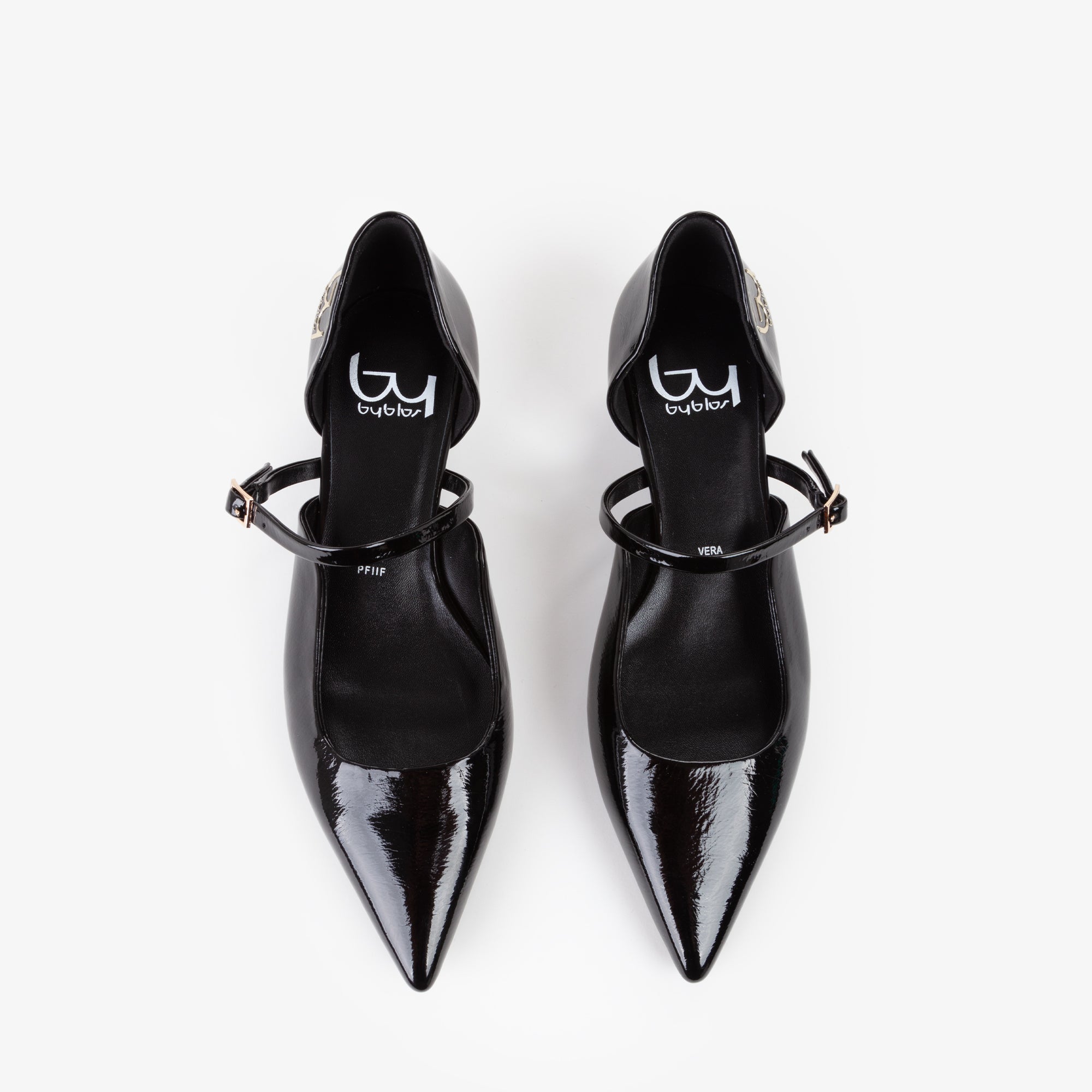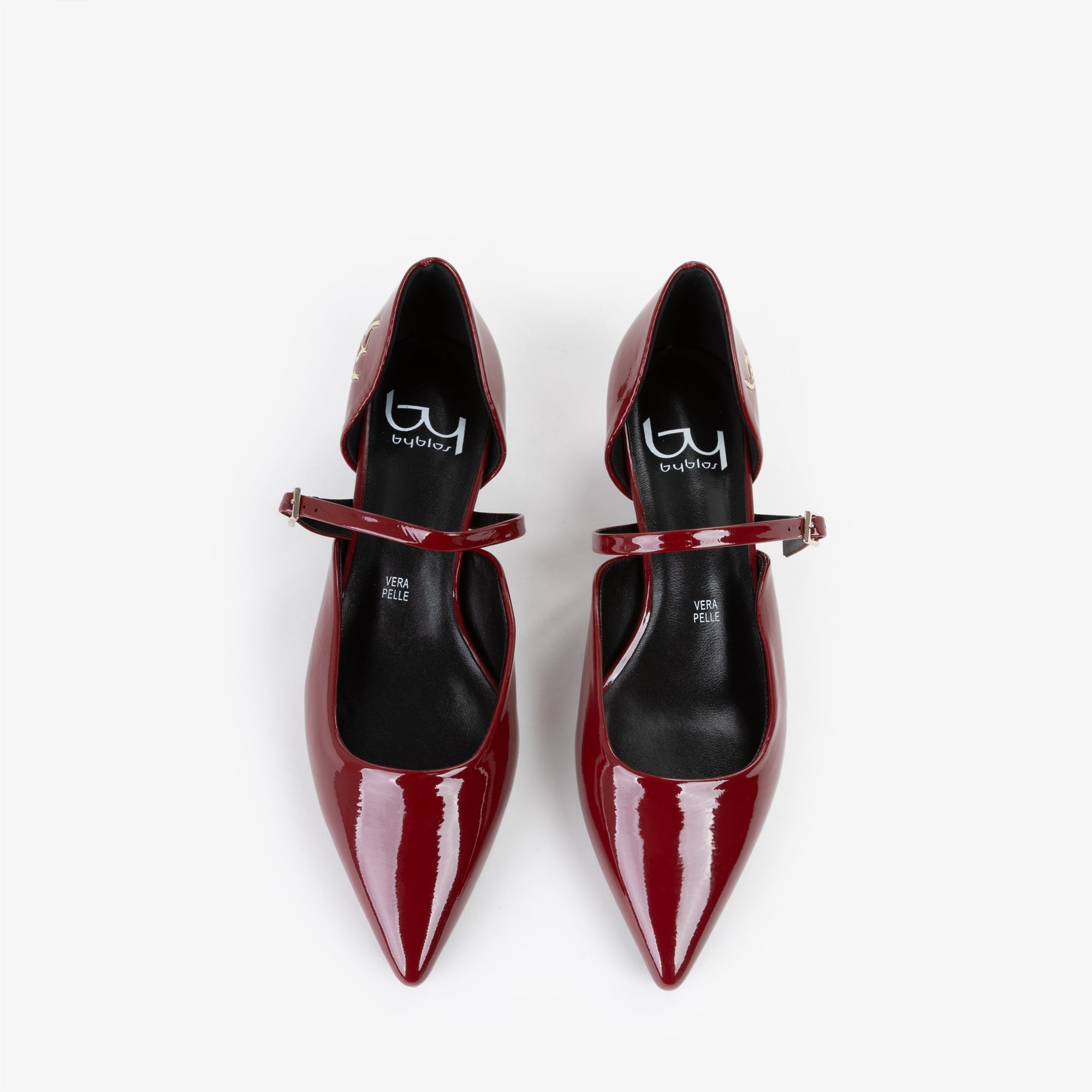 Calzatura dal fascino rétro e ultra-femminile, pensata per chi ama coniugare eleganza e comfort. Realizzata in vernice, presenta unaforma a punta sfilata e un delicato cinturino regolabile con fibbia dorata che avvolge il collo del piede. Il tacco kitten dona untocco sofisticato, mentre il logo dorato ByByblos sul tallone aggiunge un dettaglio iconico e luminoso. Perfetta per look da sera, eventi speciali o per dare un twist chic a un outfit quotidiano.
