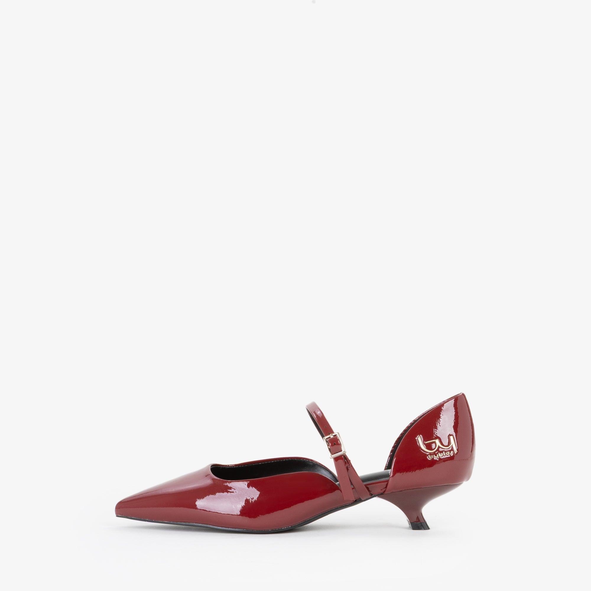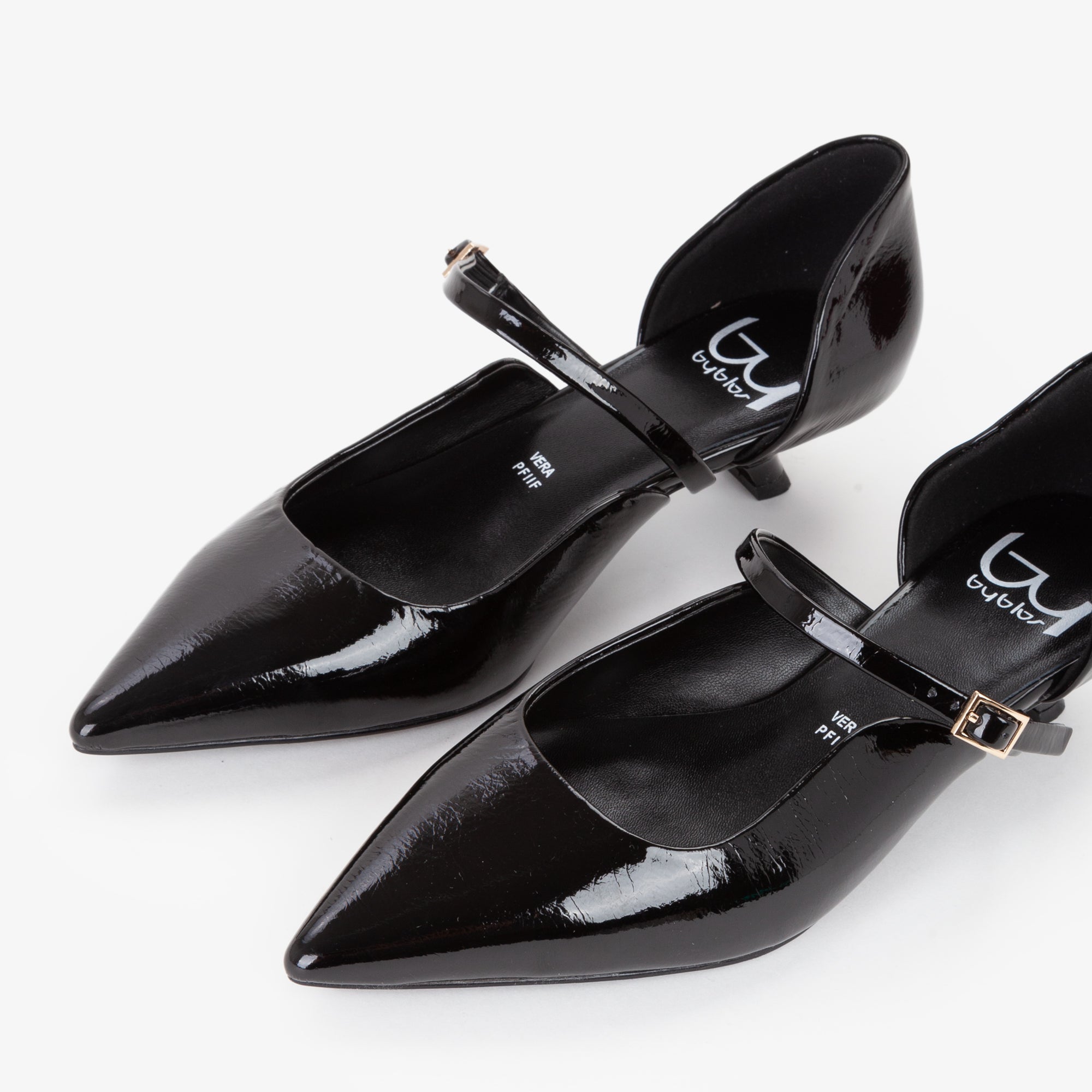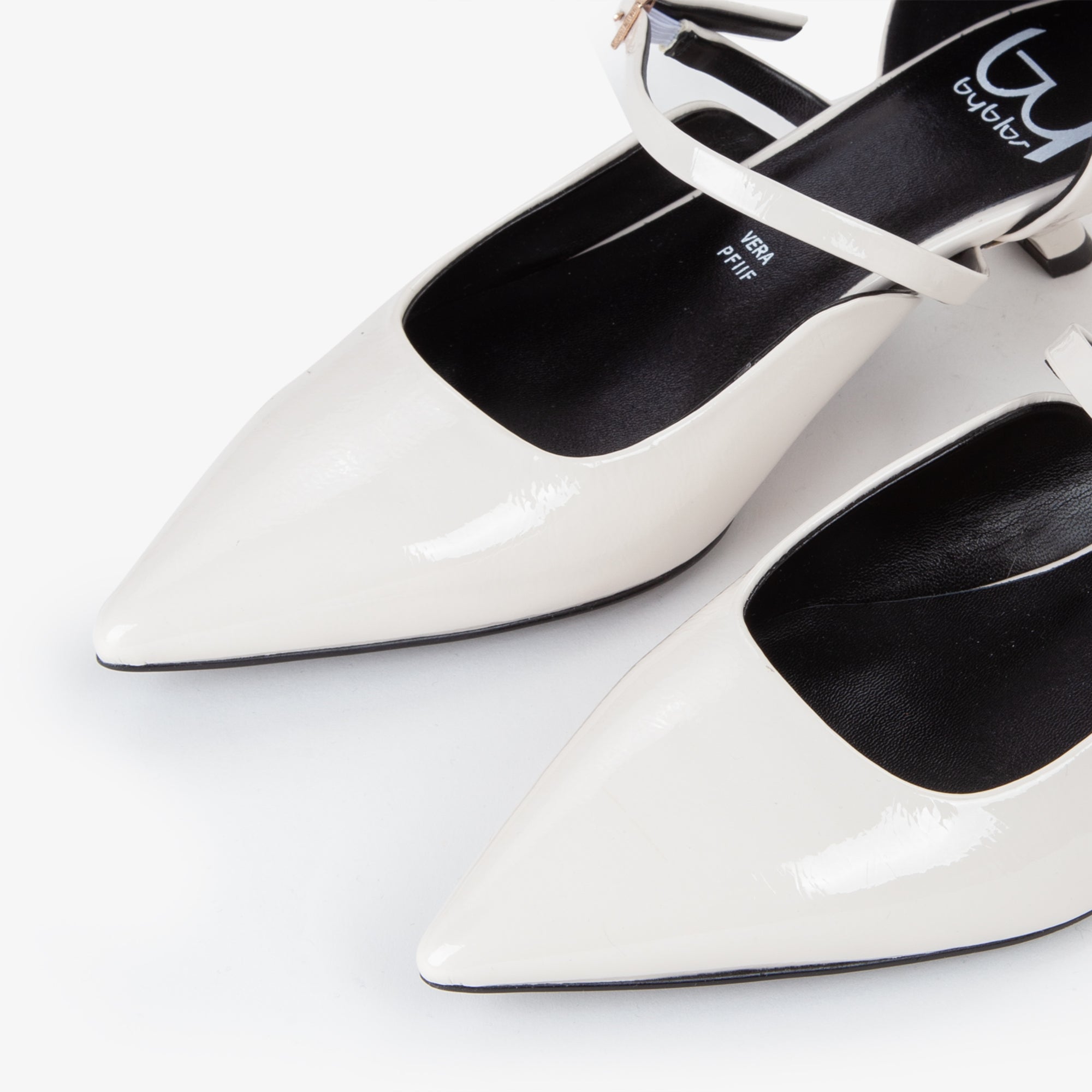 Calzatura dal fascino rétro e ultra-femminile, pensata per chi ama coniugare eleganza e comfort. Realizzata in vernice, presenta unaforma a punta sfilata e un delicato cinturino regolabile con fibbia dorata che avvolge il collo del piede. Il tacco kitten dona untocco sofisticato, mentre il logo dorato ByByblos sul tallone aggiunge un dettaglio iconico e luminoso. Perfetta per look da sera, eventi speciali o per dare un twist chic a un outfit quotidiano.