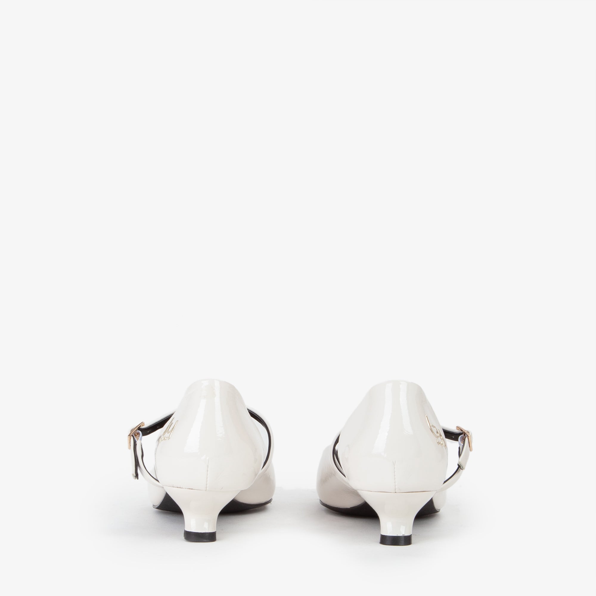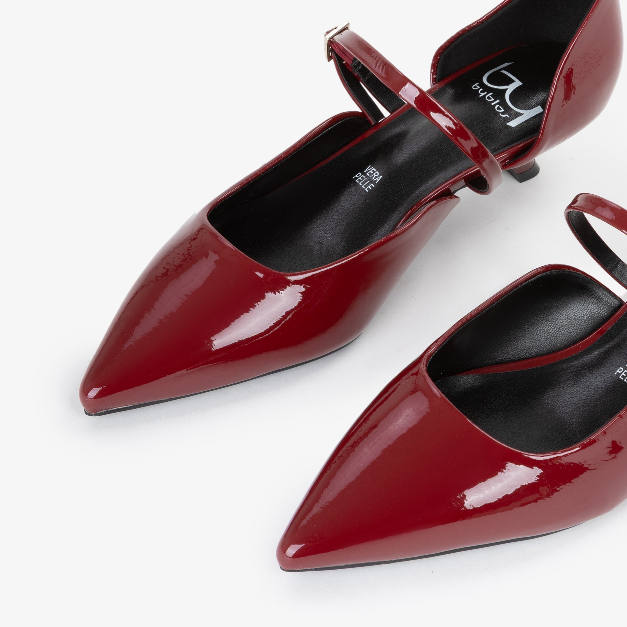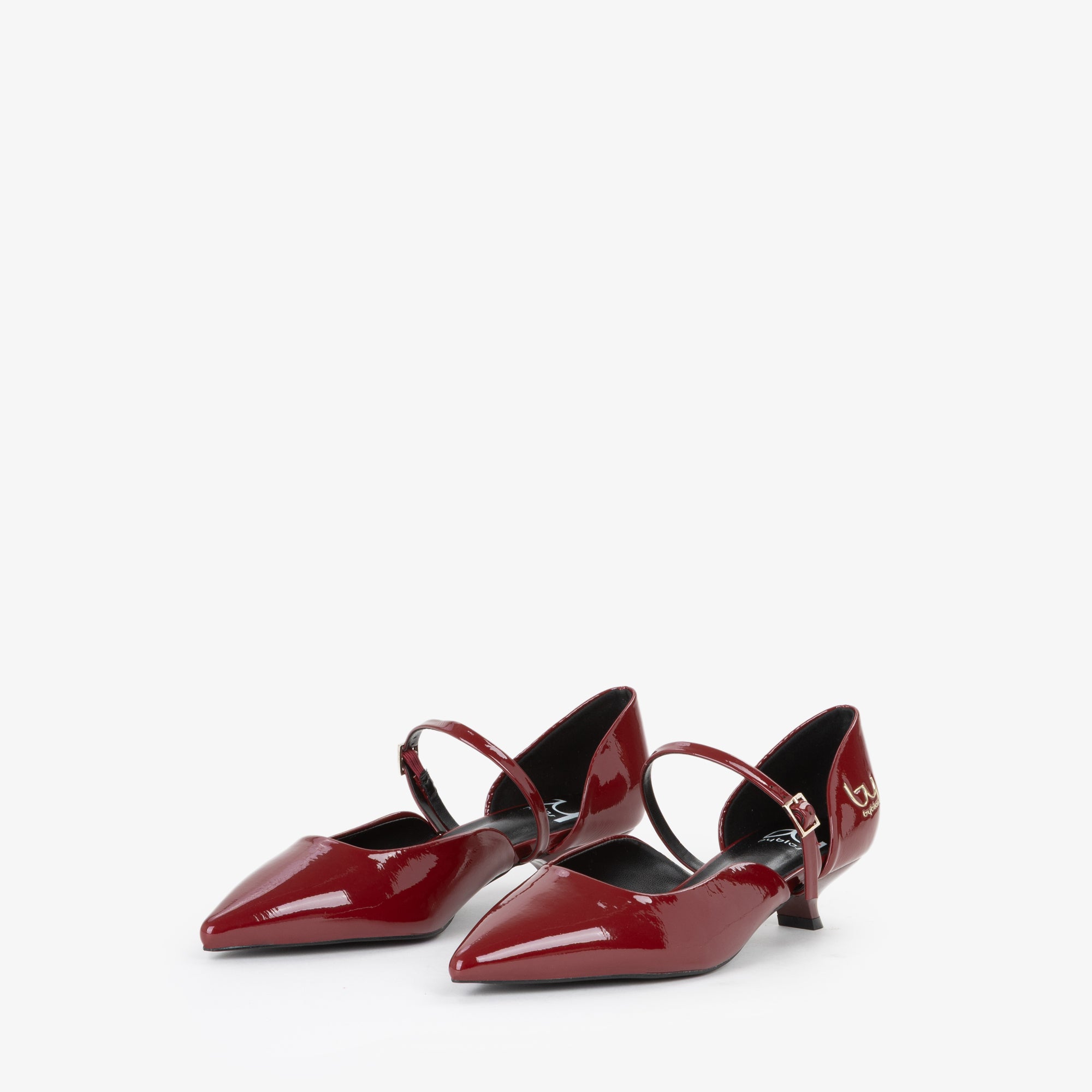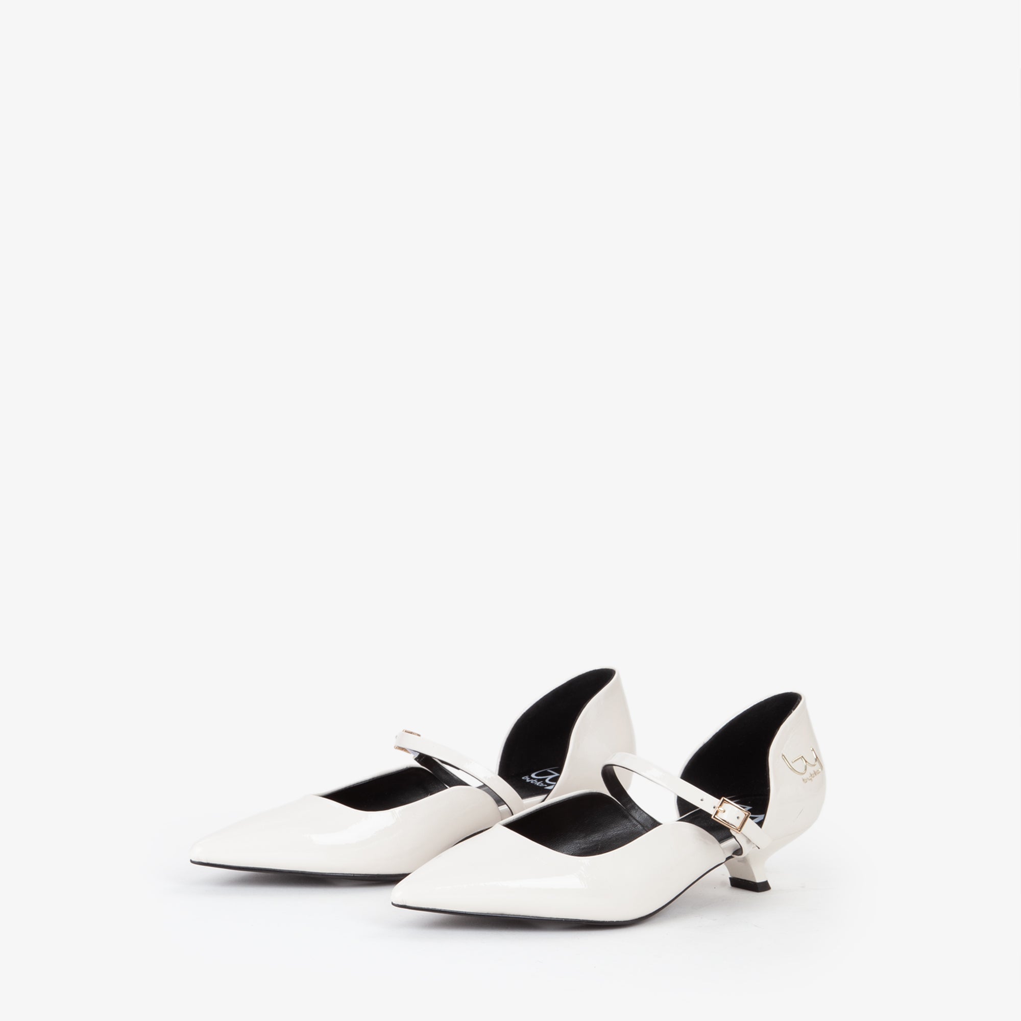 Calzatura dal fascino rétro e ultra-femminile, pensata per chi ama coniugare eleganza e comfort. Realizzata in vernice, presenta unaforma a punta sfilata e un delicato cinturino regolabile con fibbia dorata che avvolge il collo del piede. Il tacco kitten dona untocco sofisticato, mentre il logo dorato ByByblos sul tallone aggiunge un dettaglio iconico e luminoso. Perfetta per look da sera, eventi speciali o per dare un twist chic a un outfit quotidiano.