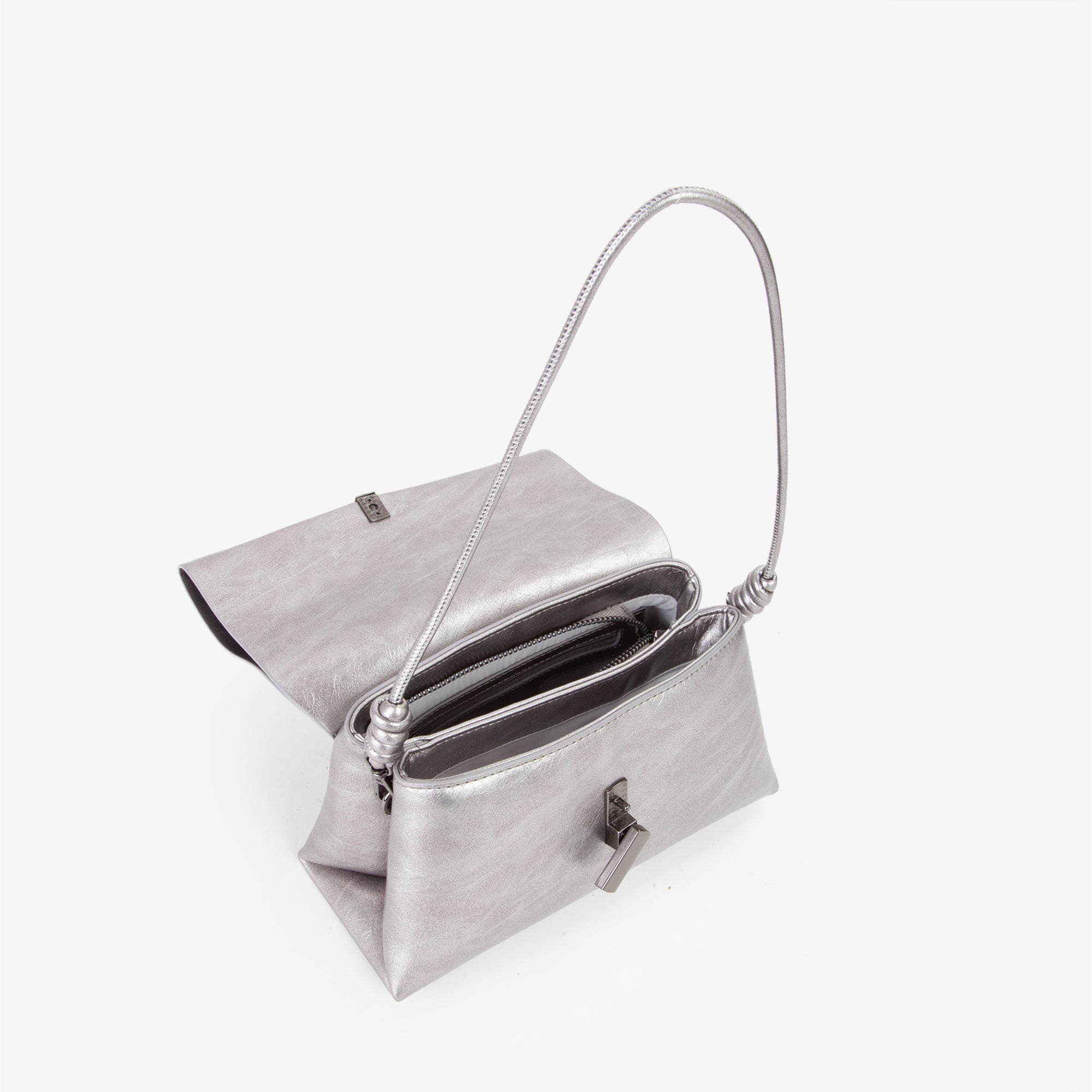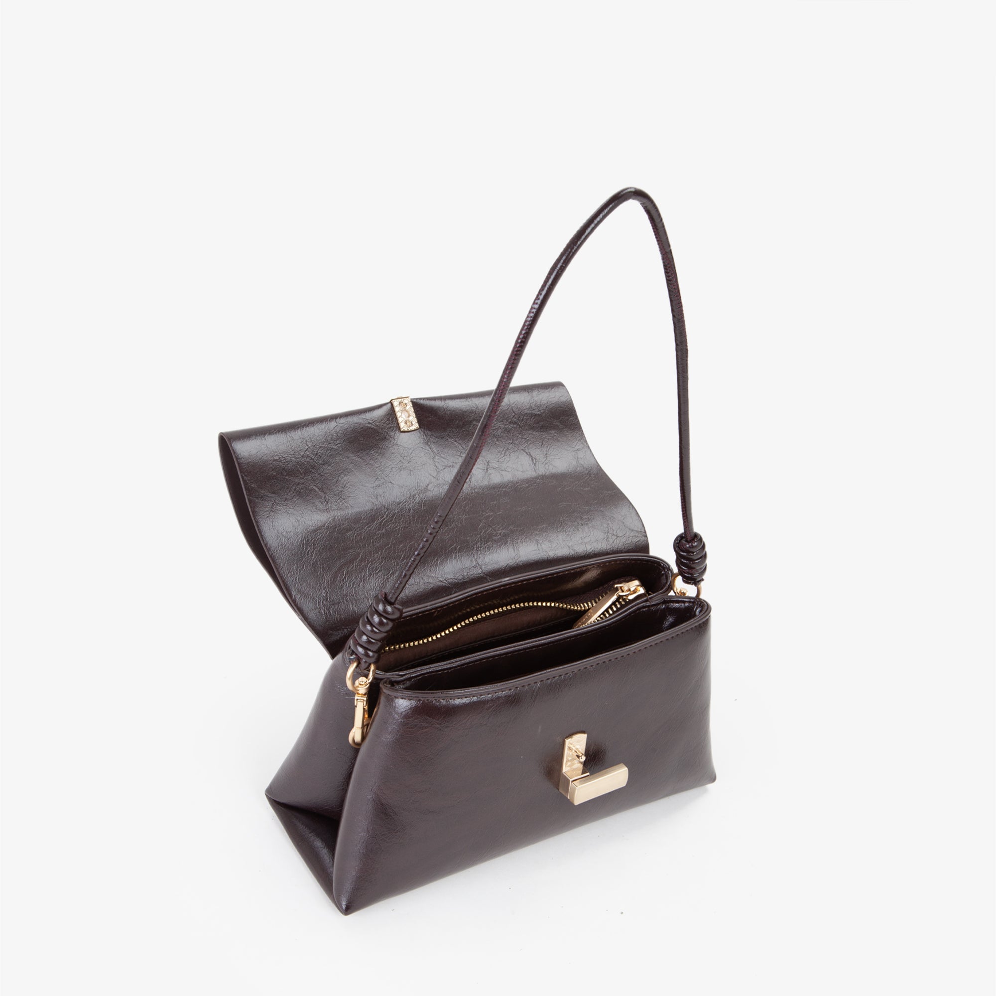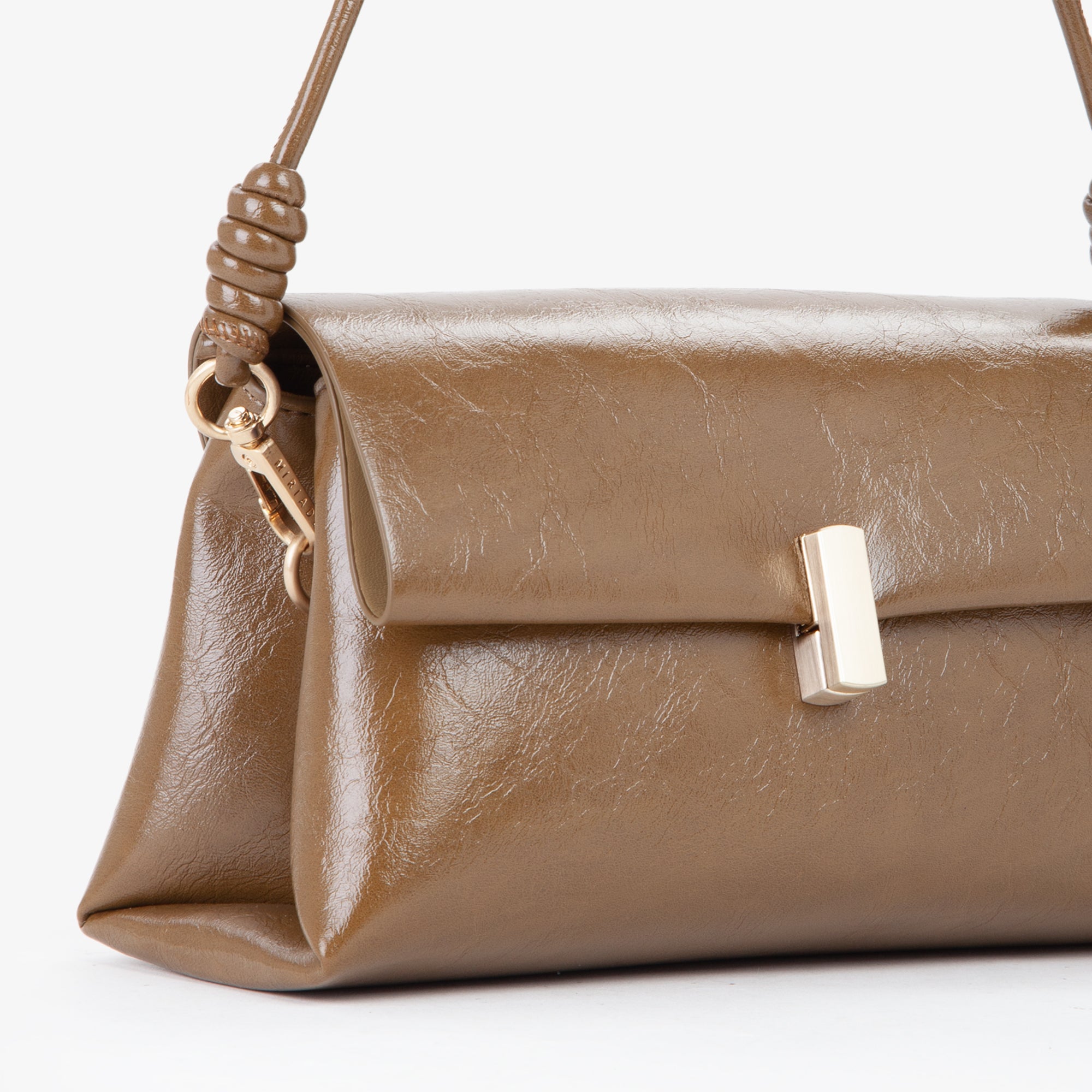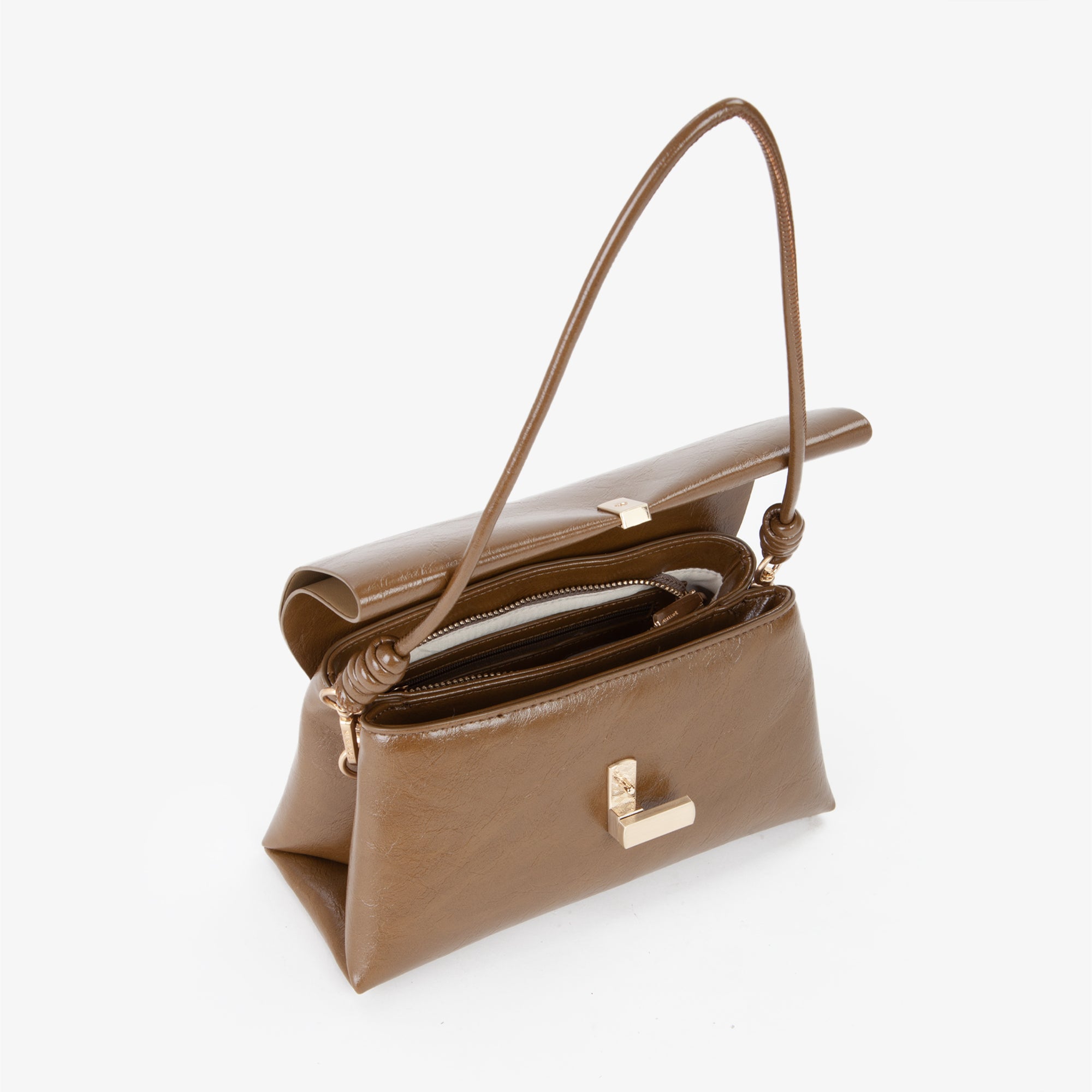 pattina con effetto stropicciato, un accessorio di classe che unisce eleganza e funzionalità.-La chiusura a girello, posizionata sulla parte frontale della borsa, non solo garantisce sicurezza, ma aggiunge anche un elemento di design distintivo. Il manico staccabile è decorato con un dettaglio a nodo su entrambi i lati, conferendo un tocco unico e stiloso. Questo manico può essere facilmente rimosso.-La borsa è dotata di una tracolla staccabile e regolabile, che permette di portarla comodamente a spalla. Questa versatilitàla rende ideale per diverse occasioni, dal lavoro al tempo libero. Perfetta per chi cerca un accessorio elegante e pratico, questapattina in grana è un must-have nel guardaroba di ogni donna.