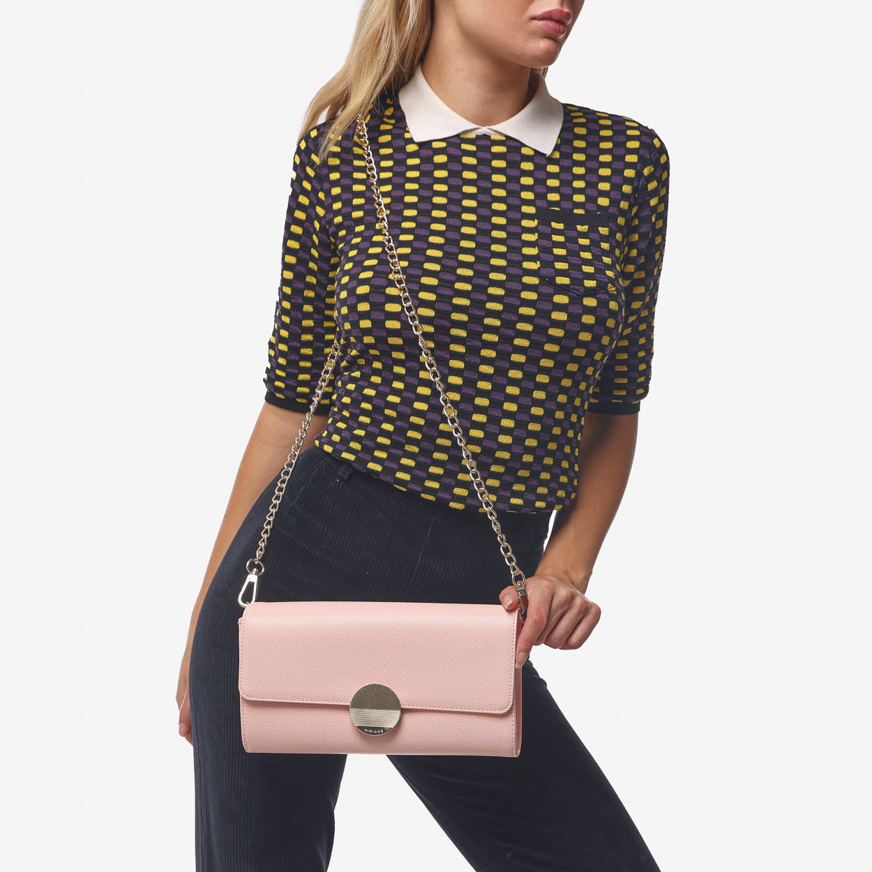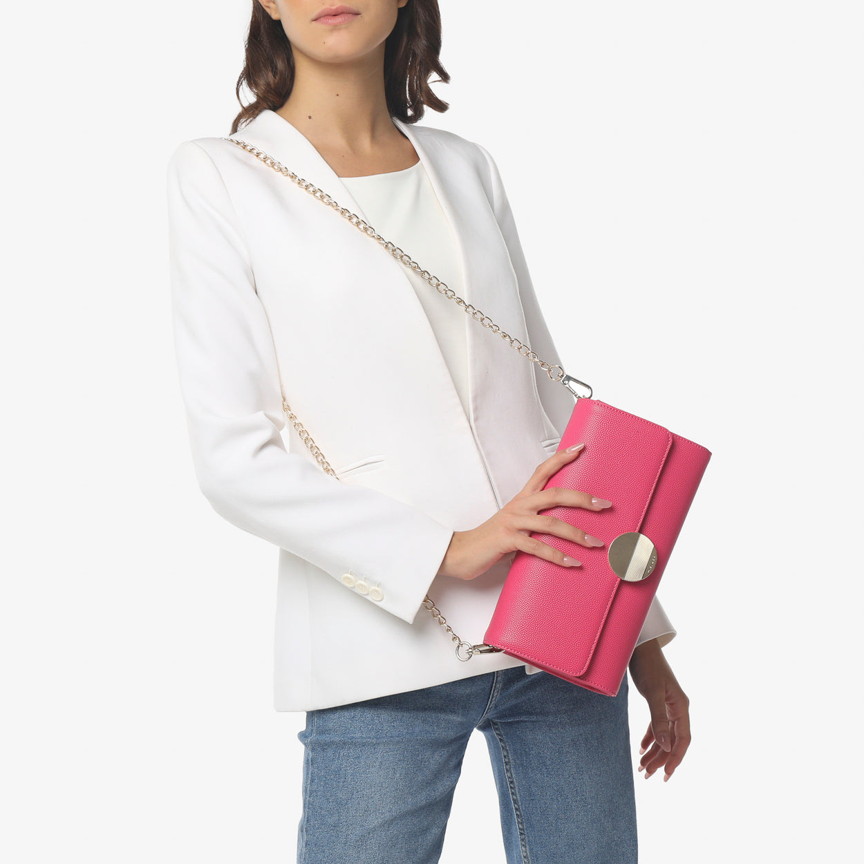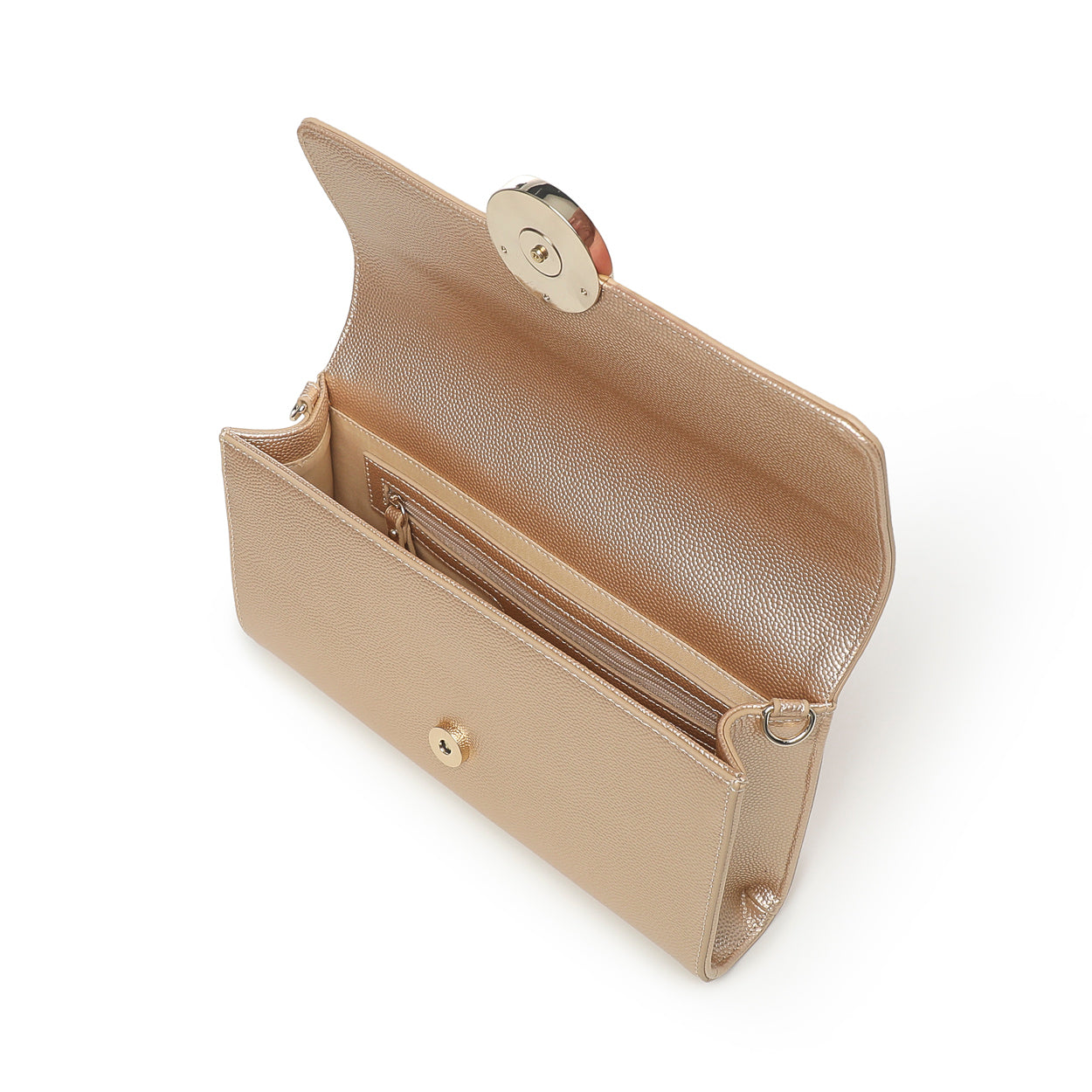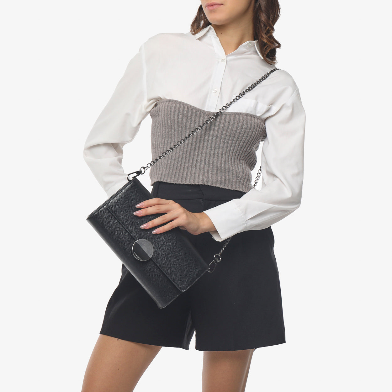 The Pochette RADIOSA by Miriade is your go-to accessory for a night out, blending elegance with practicality. Its compact design is perfect for evenings, and the adjustable chain strap lets you wear it as a clutch, over the shoulder, or crossbody. The magnetic closure keeps everything secure and easily accessible. Inside, a small beauty bag provides extra space for essentials. The sophisticated texture and metallic details add a touch of class that stands out.