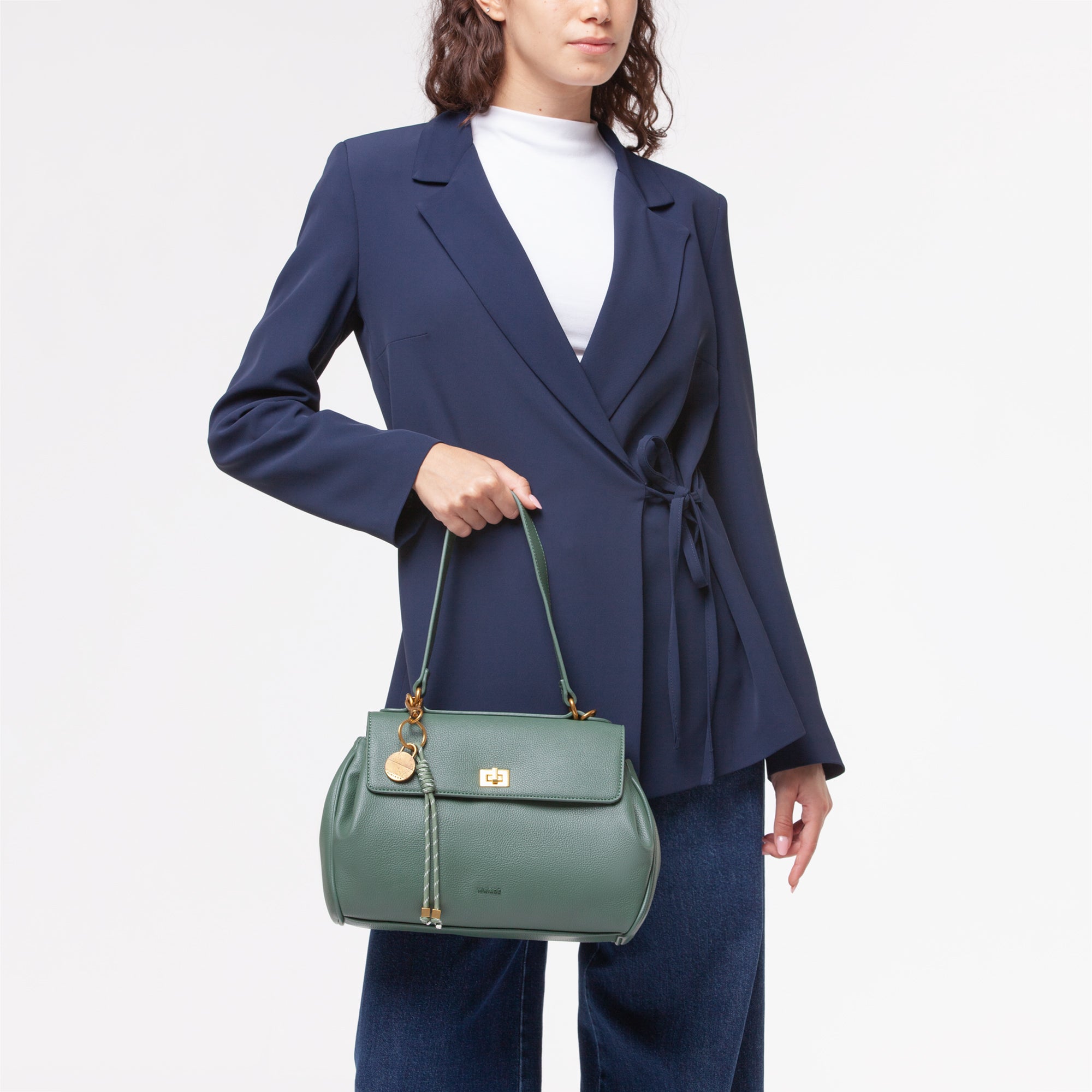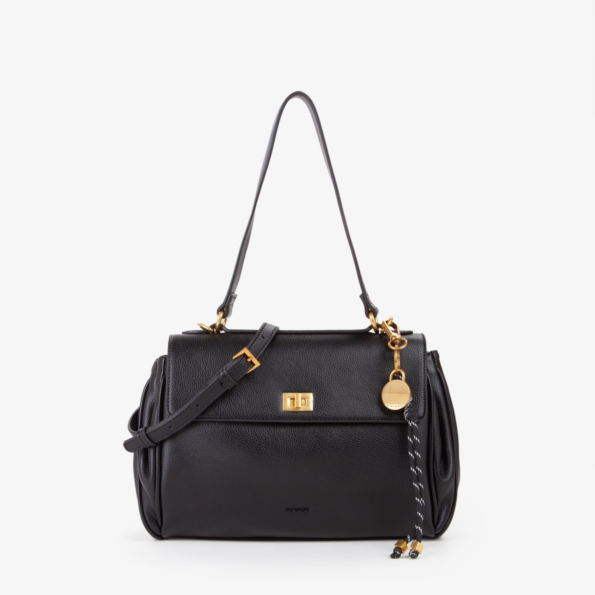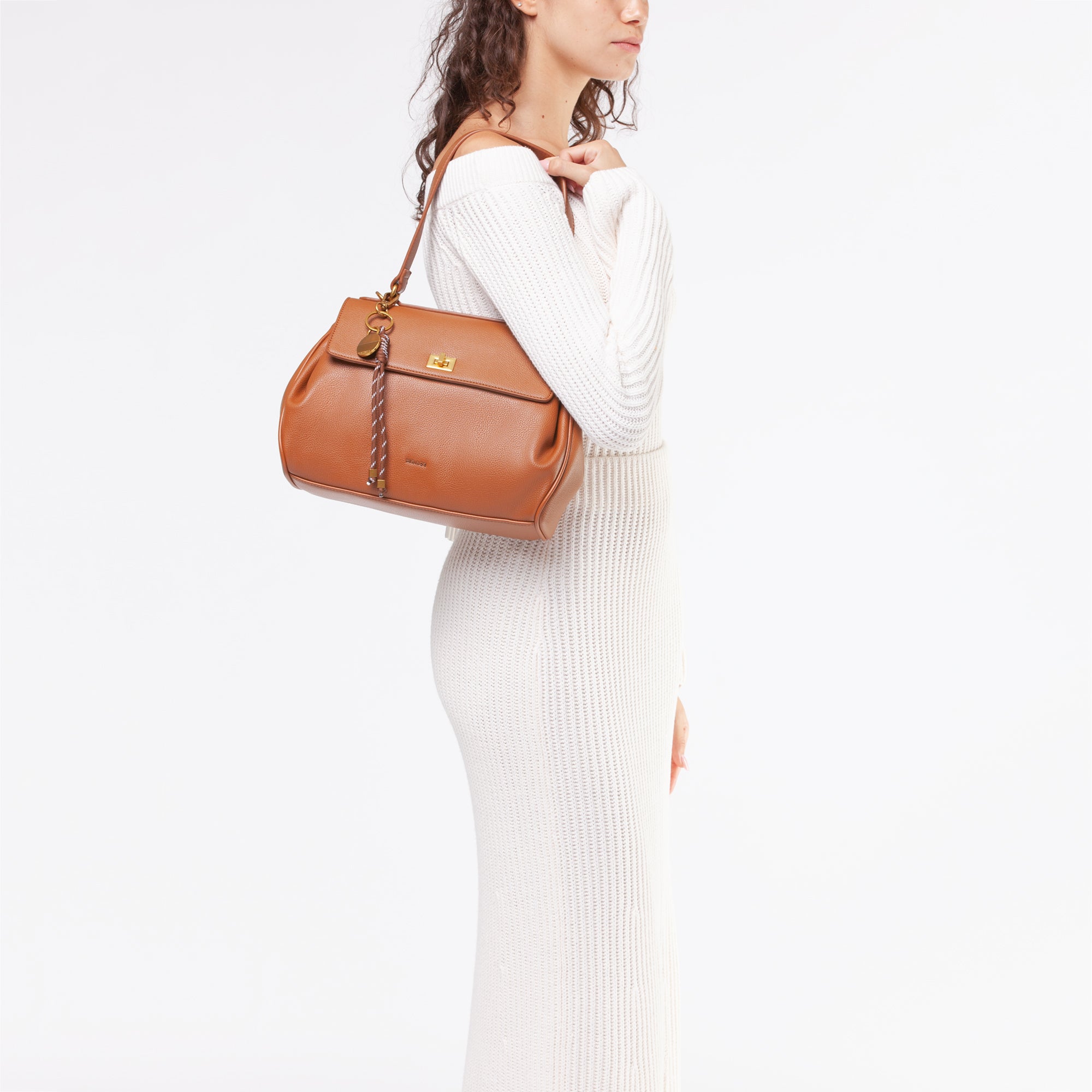 questa borsa in grana aggiunge un tocco di sofisticatezza ai look quotidiani. -Il design strutturato è completato da una patta con chiusura a girello, che garantisce sicurezza e stile.-La tracolla regolabile, attaccata tramite anelli metallici dorati, offre comfort e versatilità, permettendo di adattare la borsa a tutte le esigenze.-Inoltre, la borsa è arricchita da un ciondolo colorato attaccato, che aggiunge un tocco di vivacità e personalità.