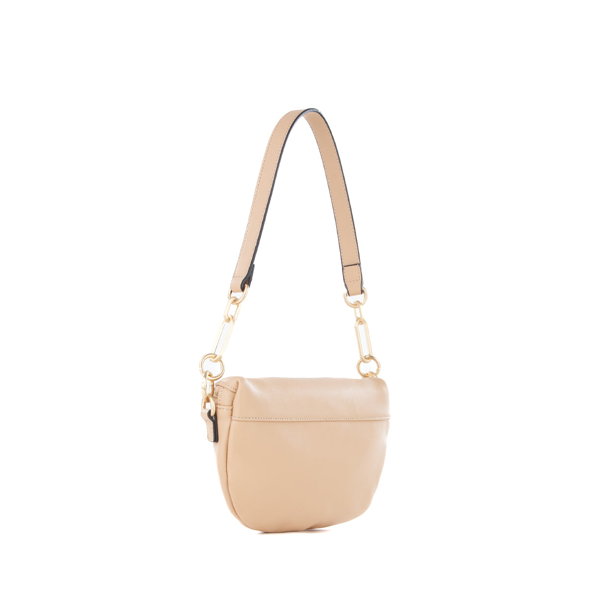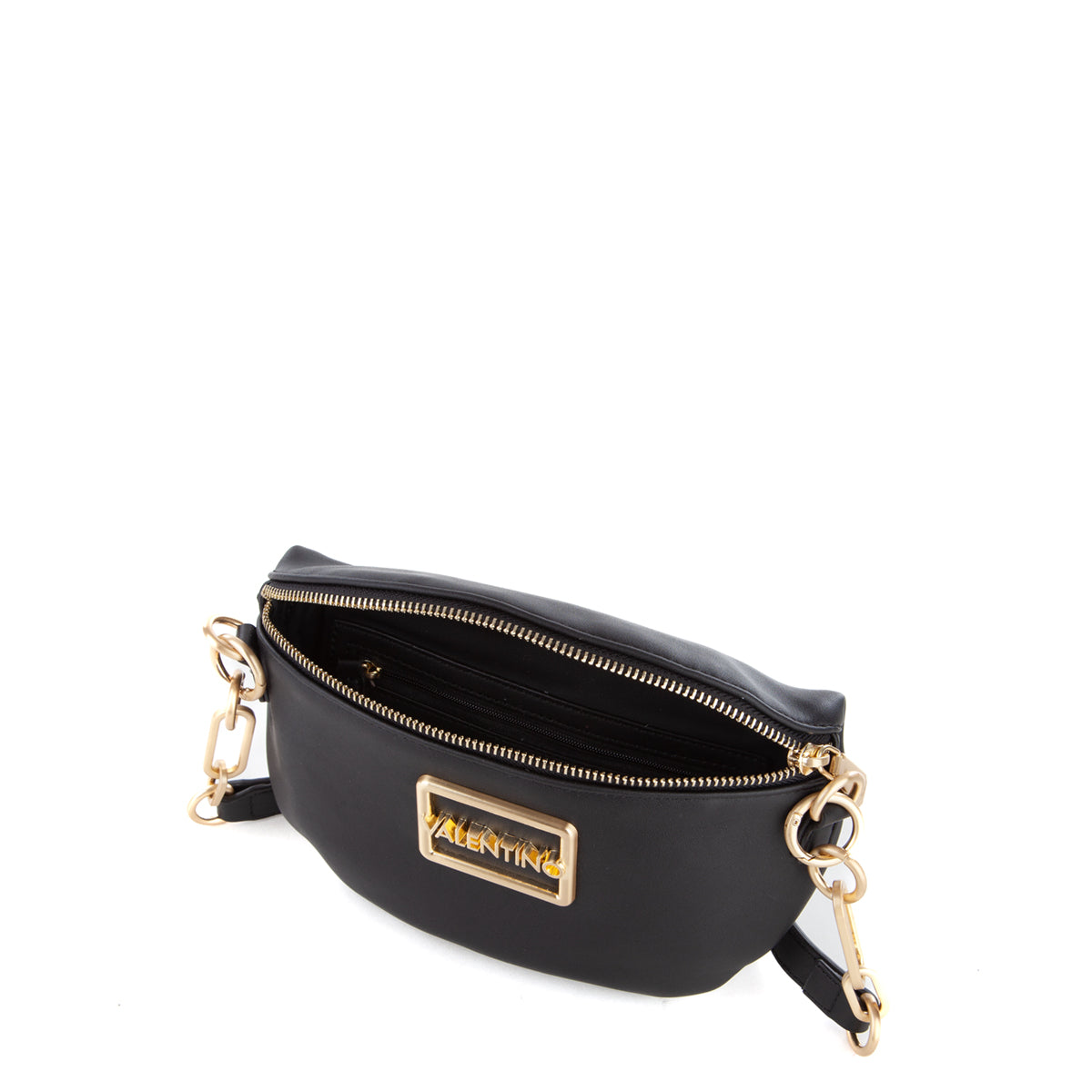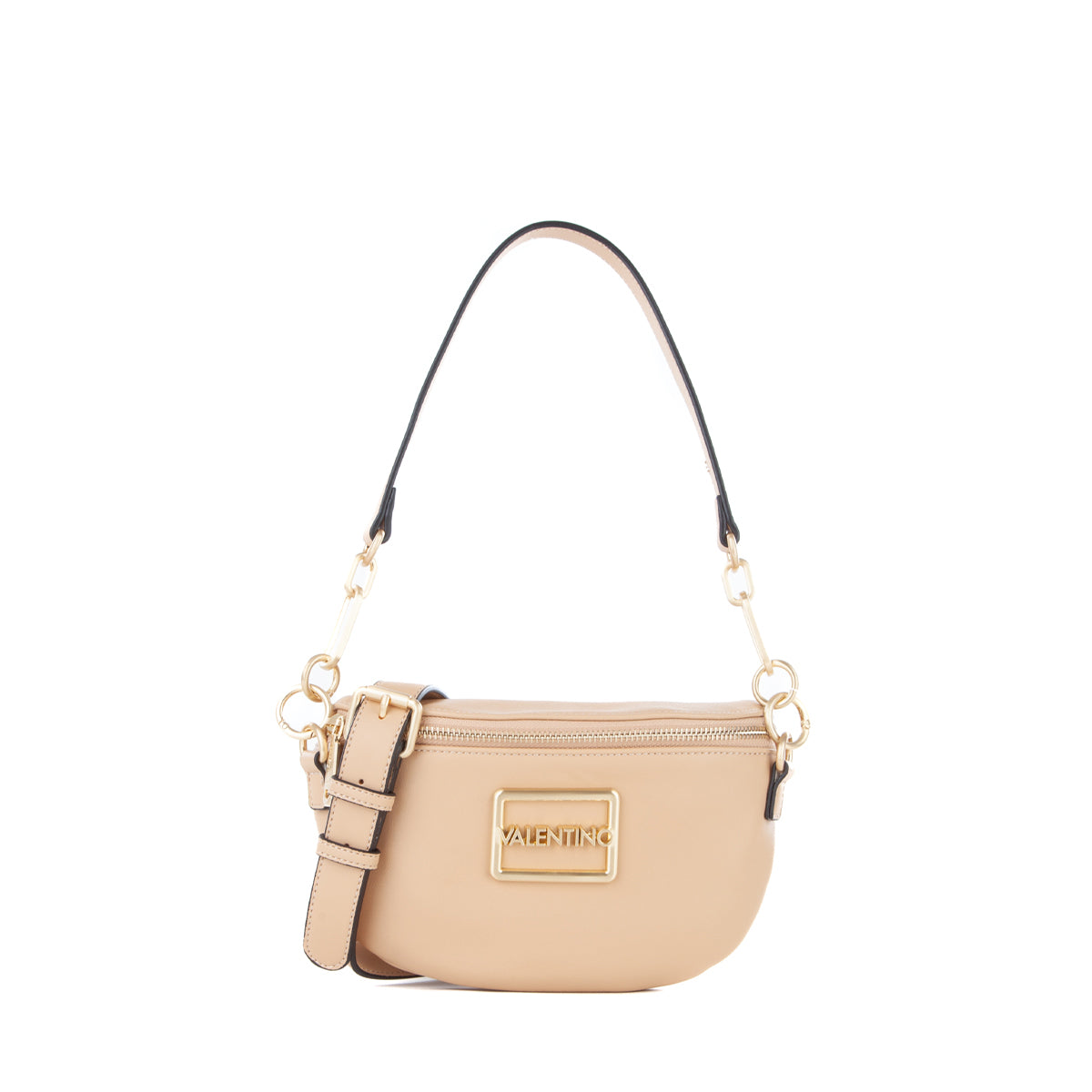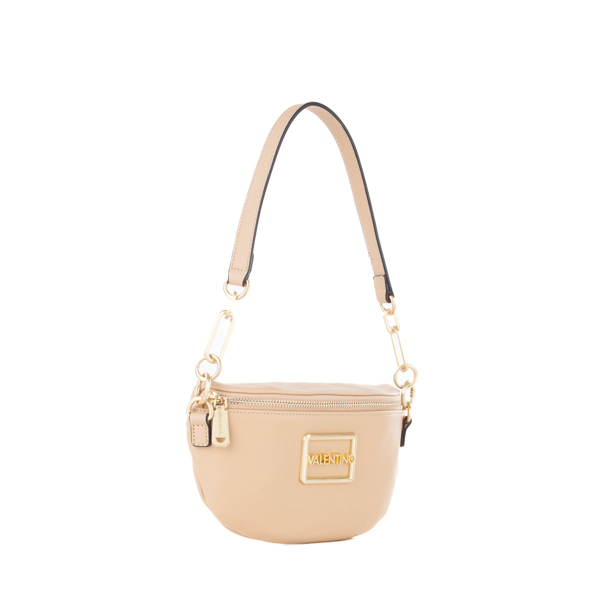 Marsupio in nappa liscia con accessorio logato sul fronte e dettagli metallici in oro satinato. tracolla lunga estraibile