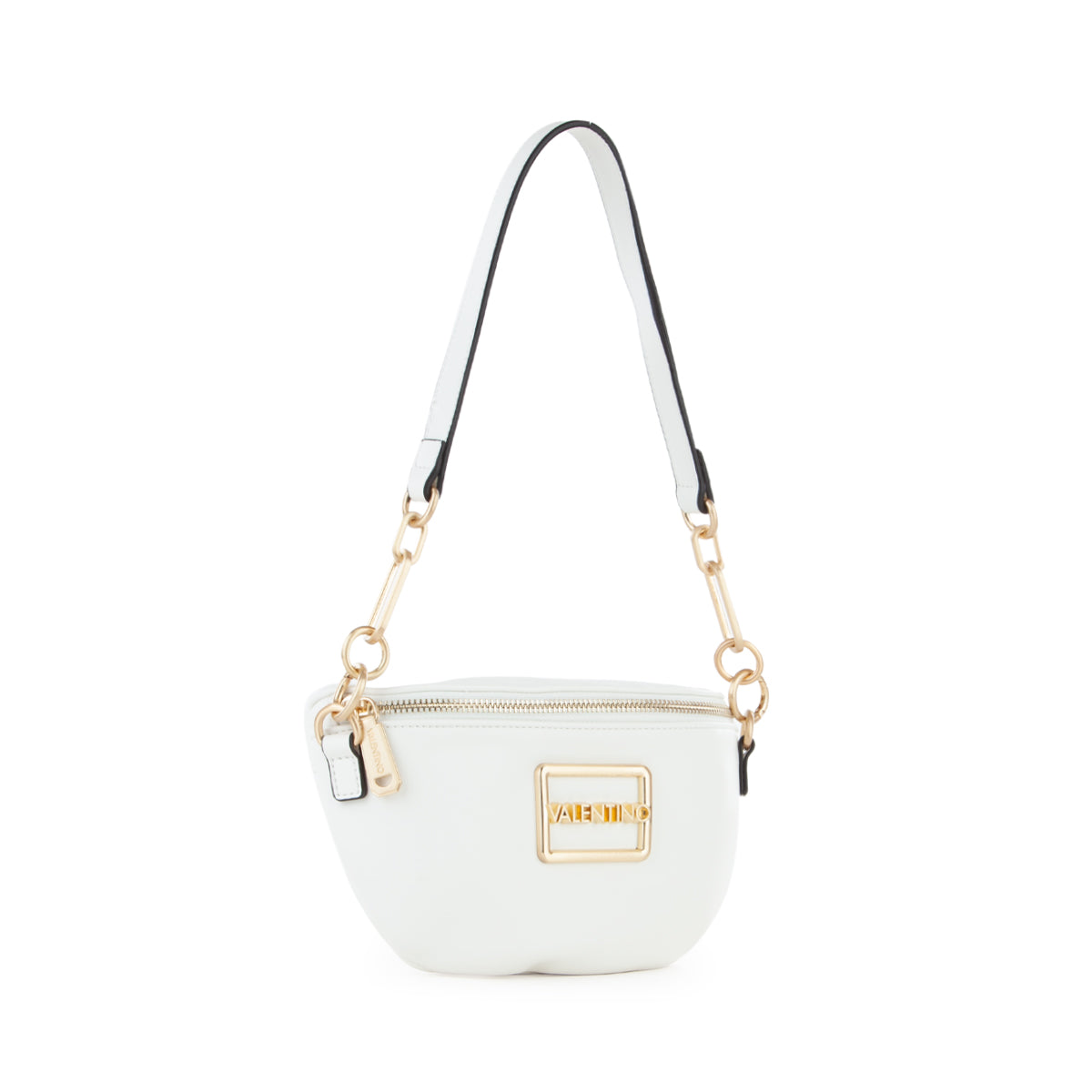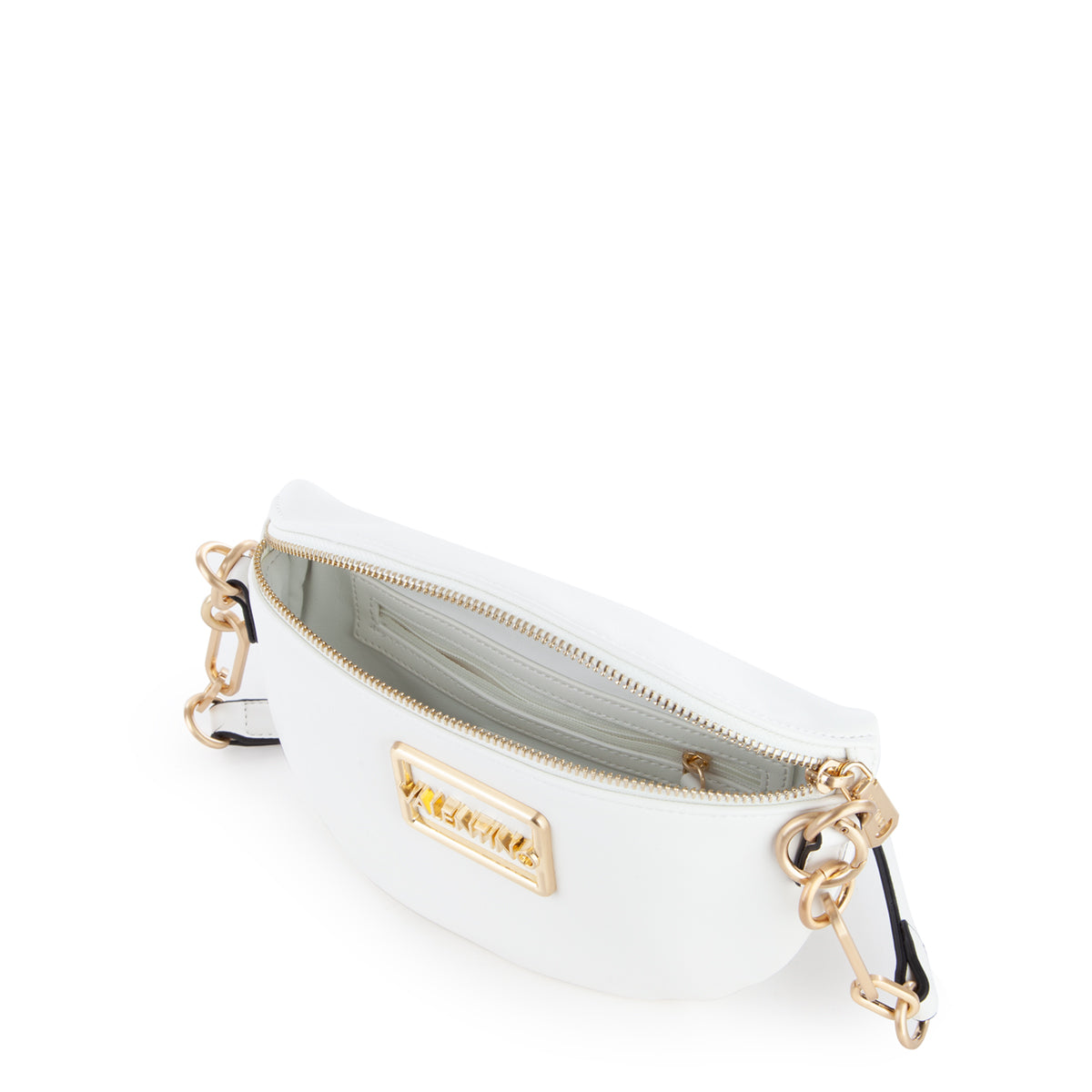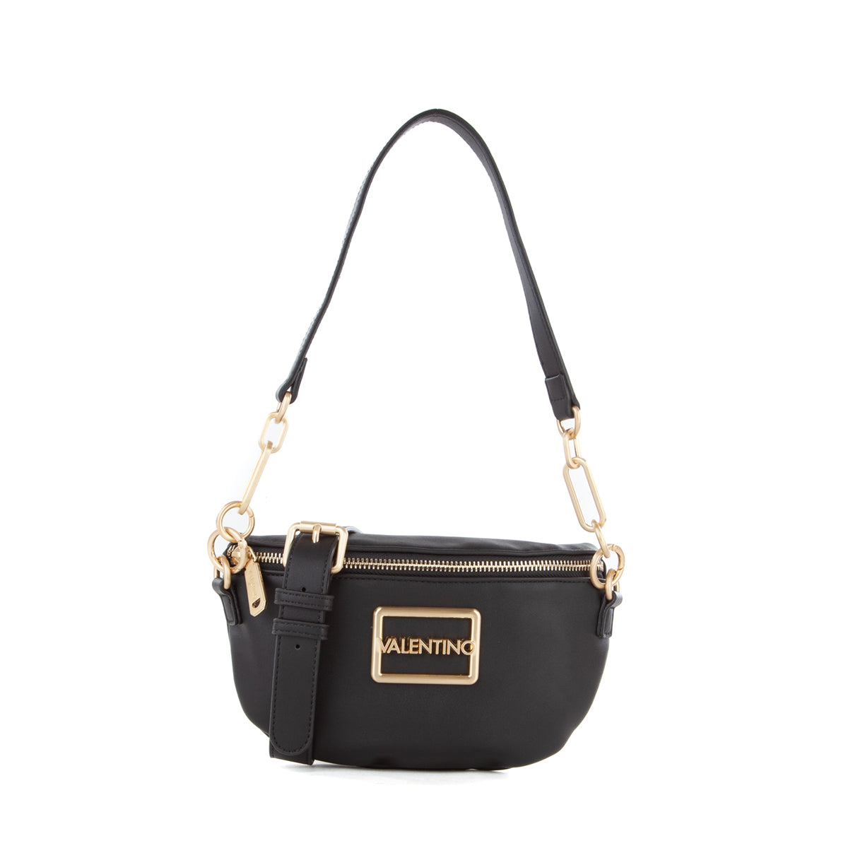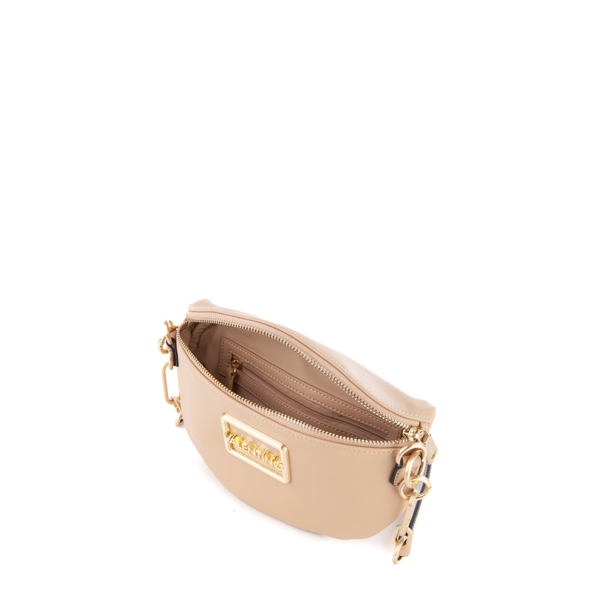 Marsupio in nappa liscia con accessorio logato sul fronte e dettagli metallici in oro satinato. tracolla lunga estraibile