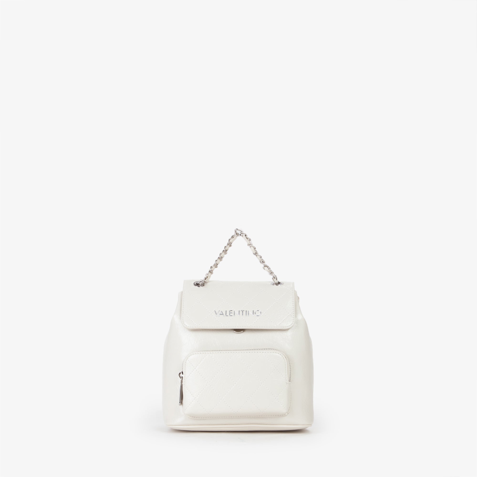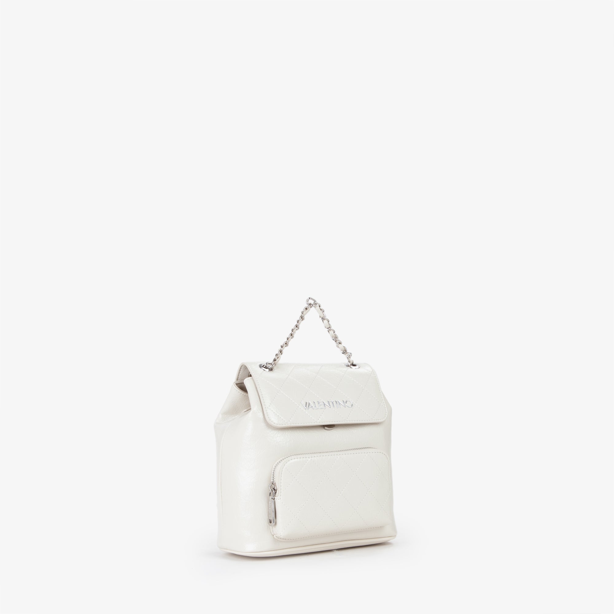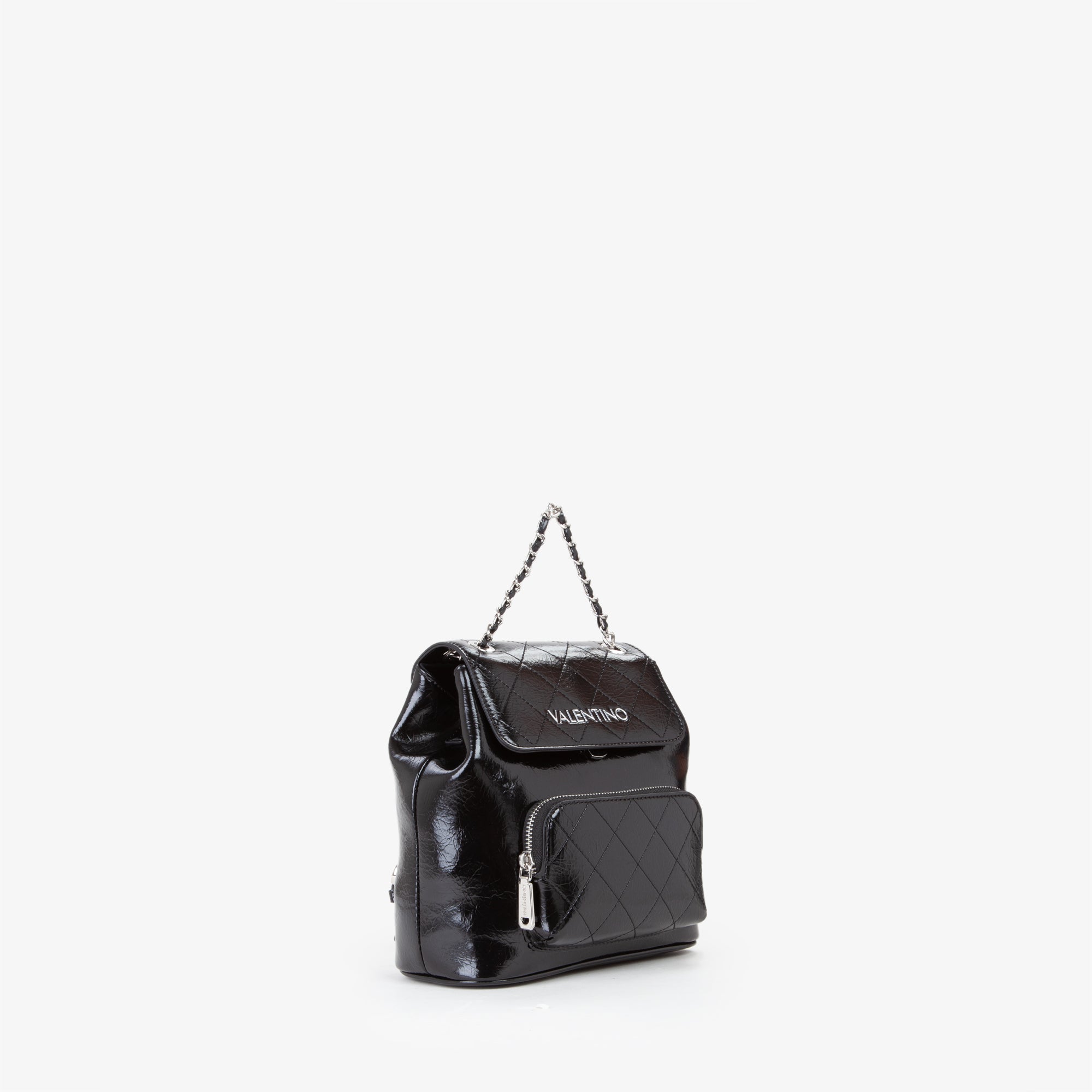 Zaino, di piccole dimensioni, con logo in lettere metalliche, di colore argento, sul davanti.