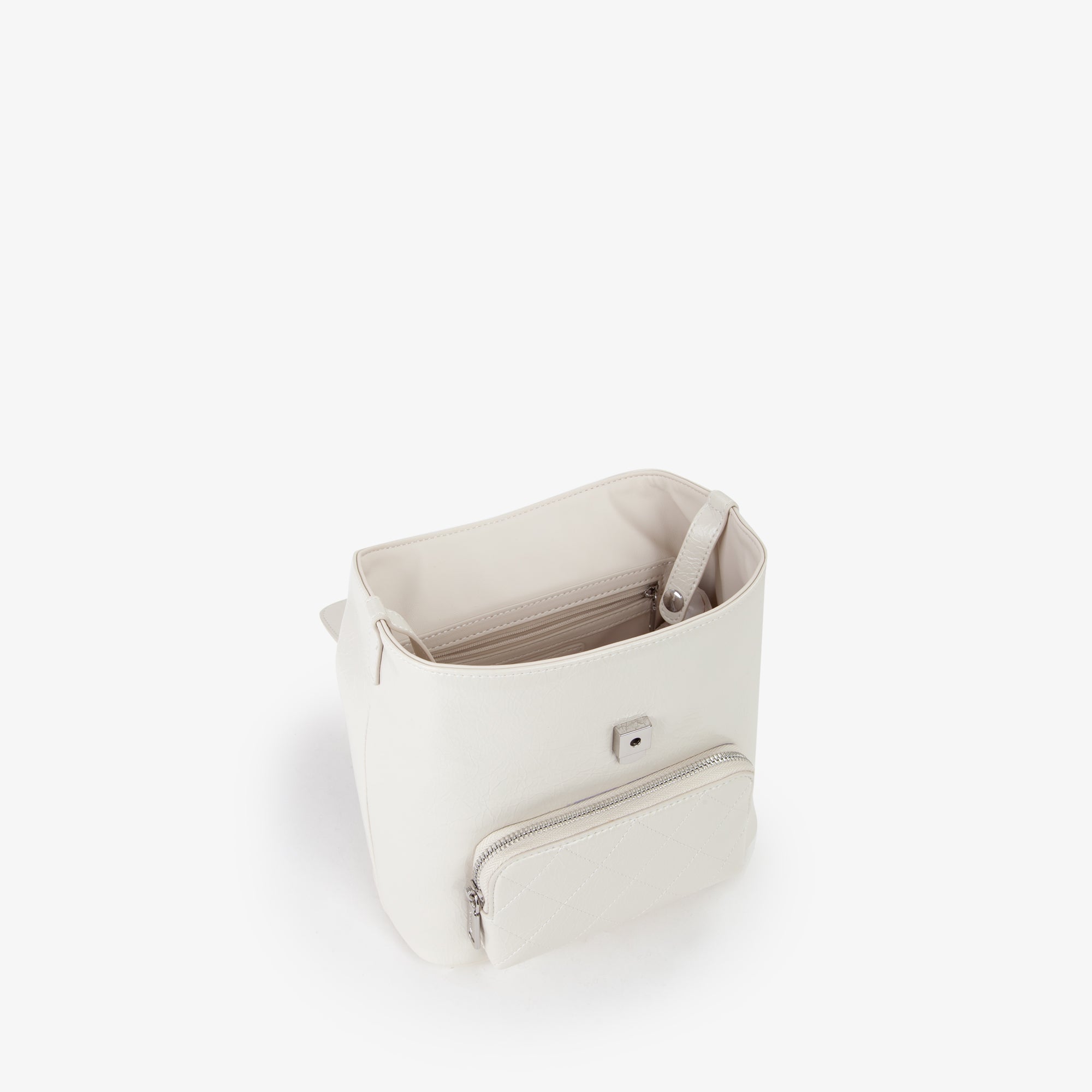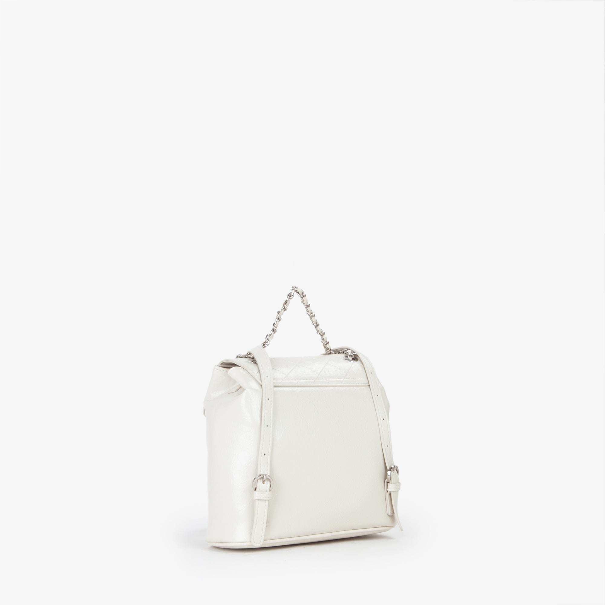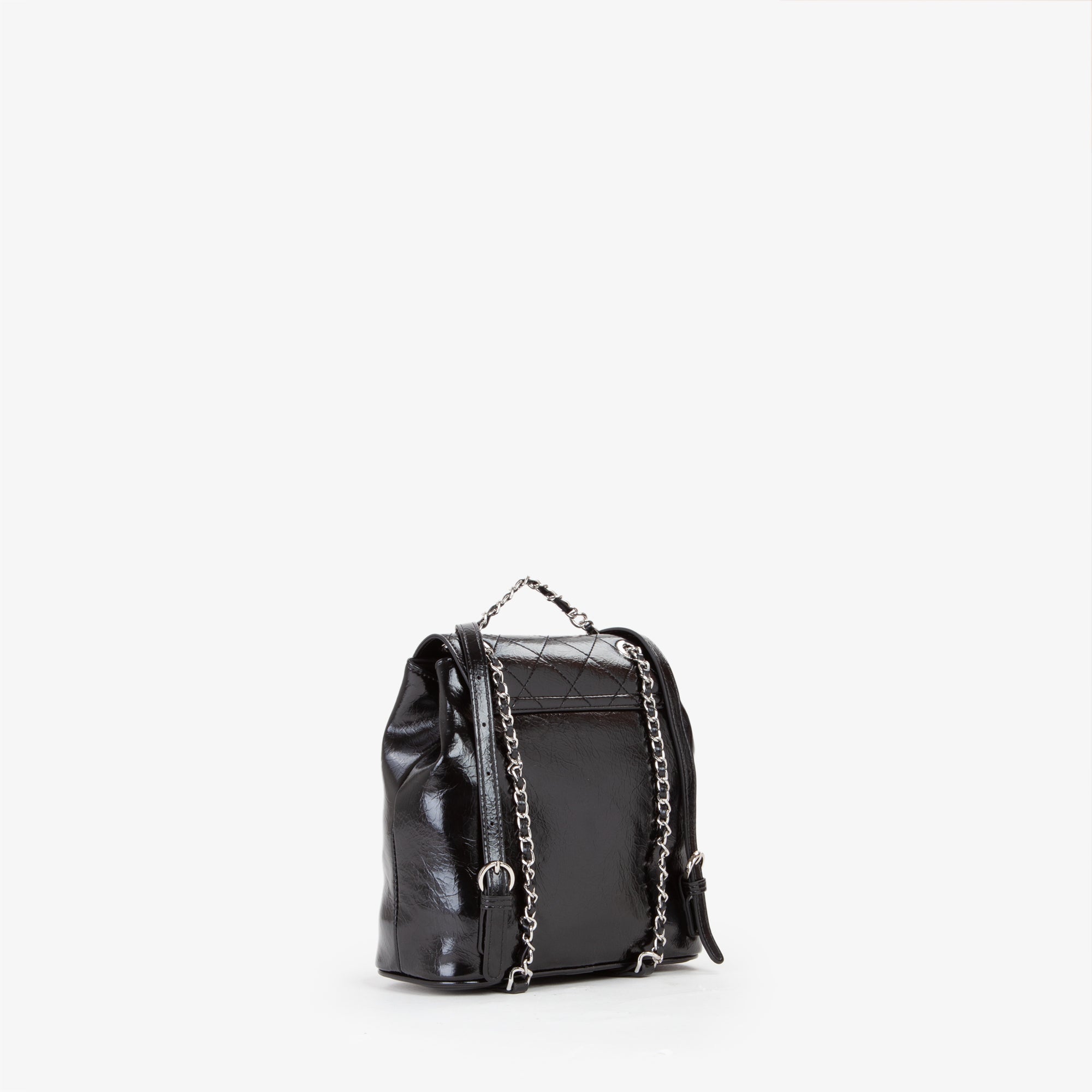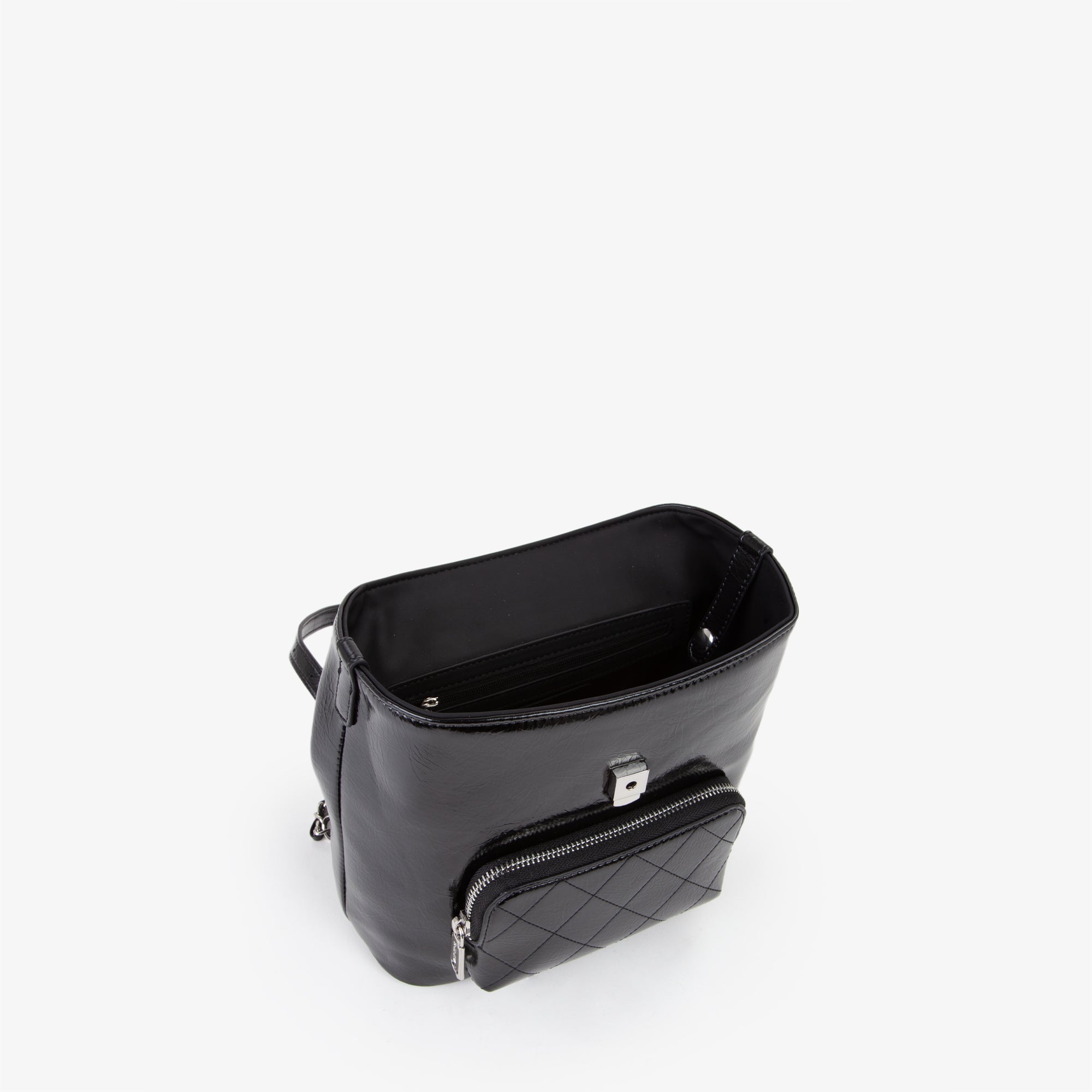Zaino, di piccole dimensioni, con logo in lettere metalliche, di colore argento, sul davanti.