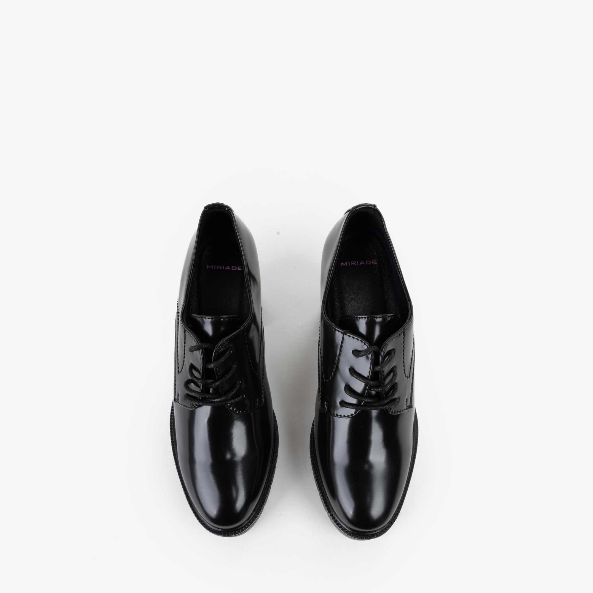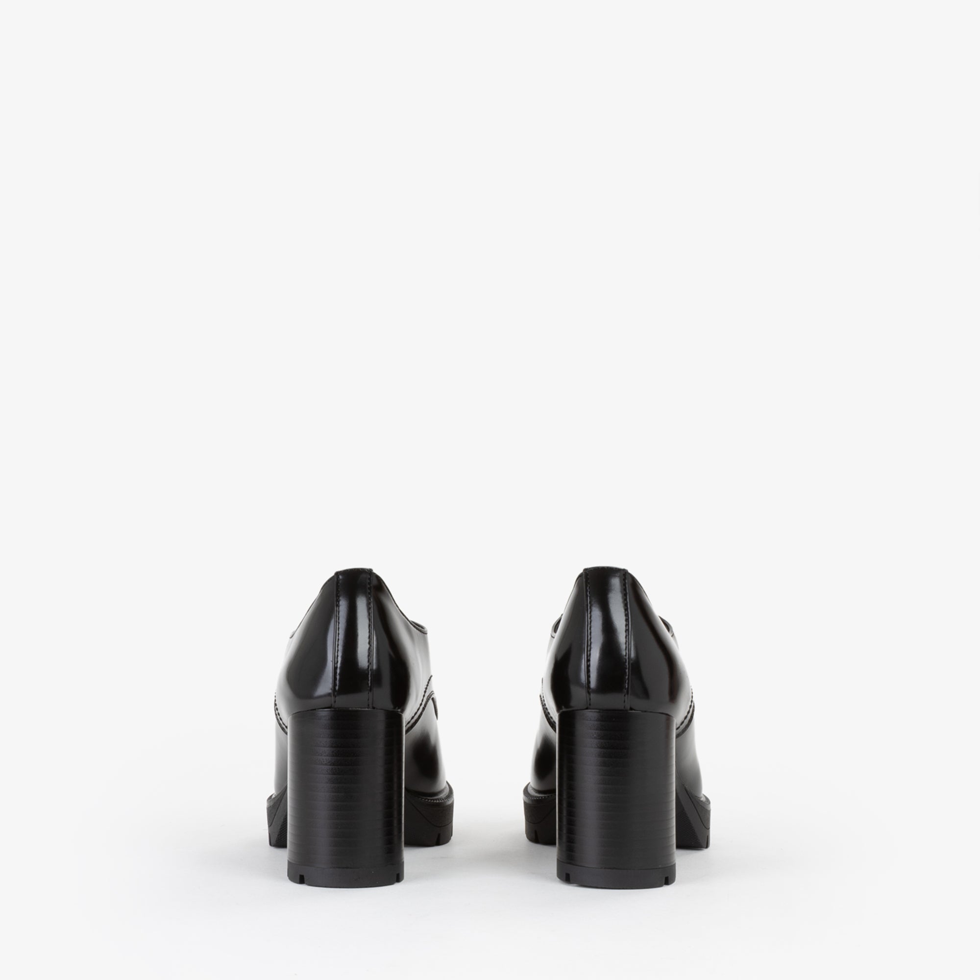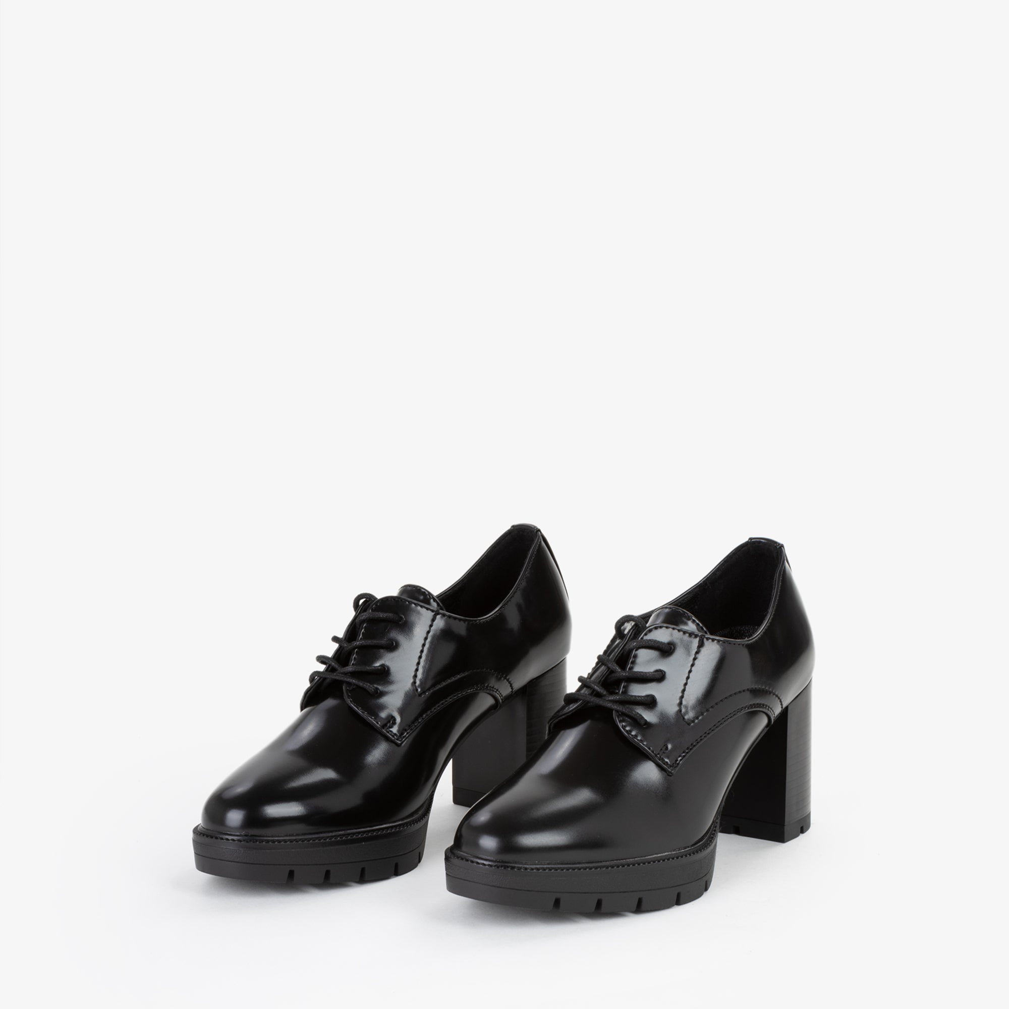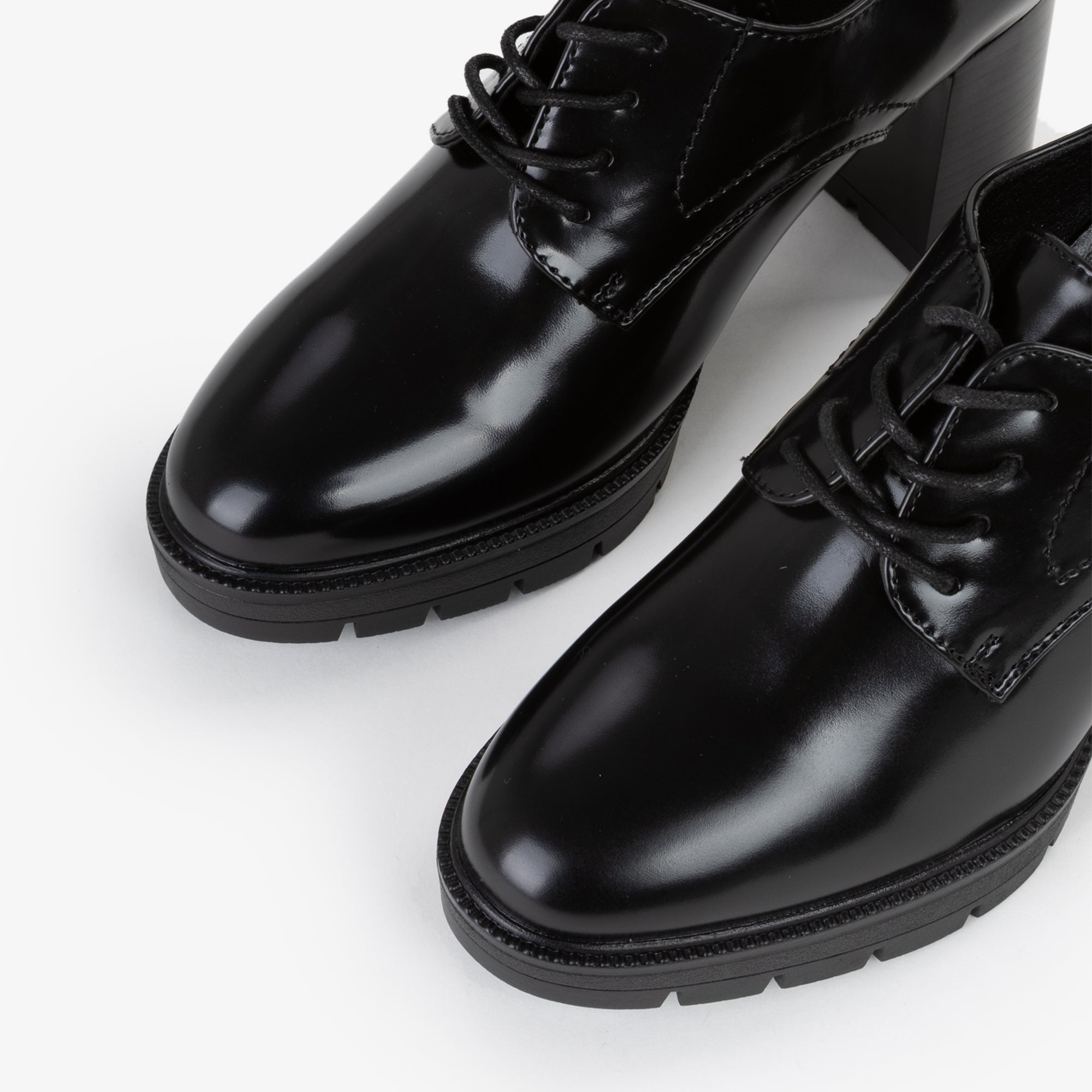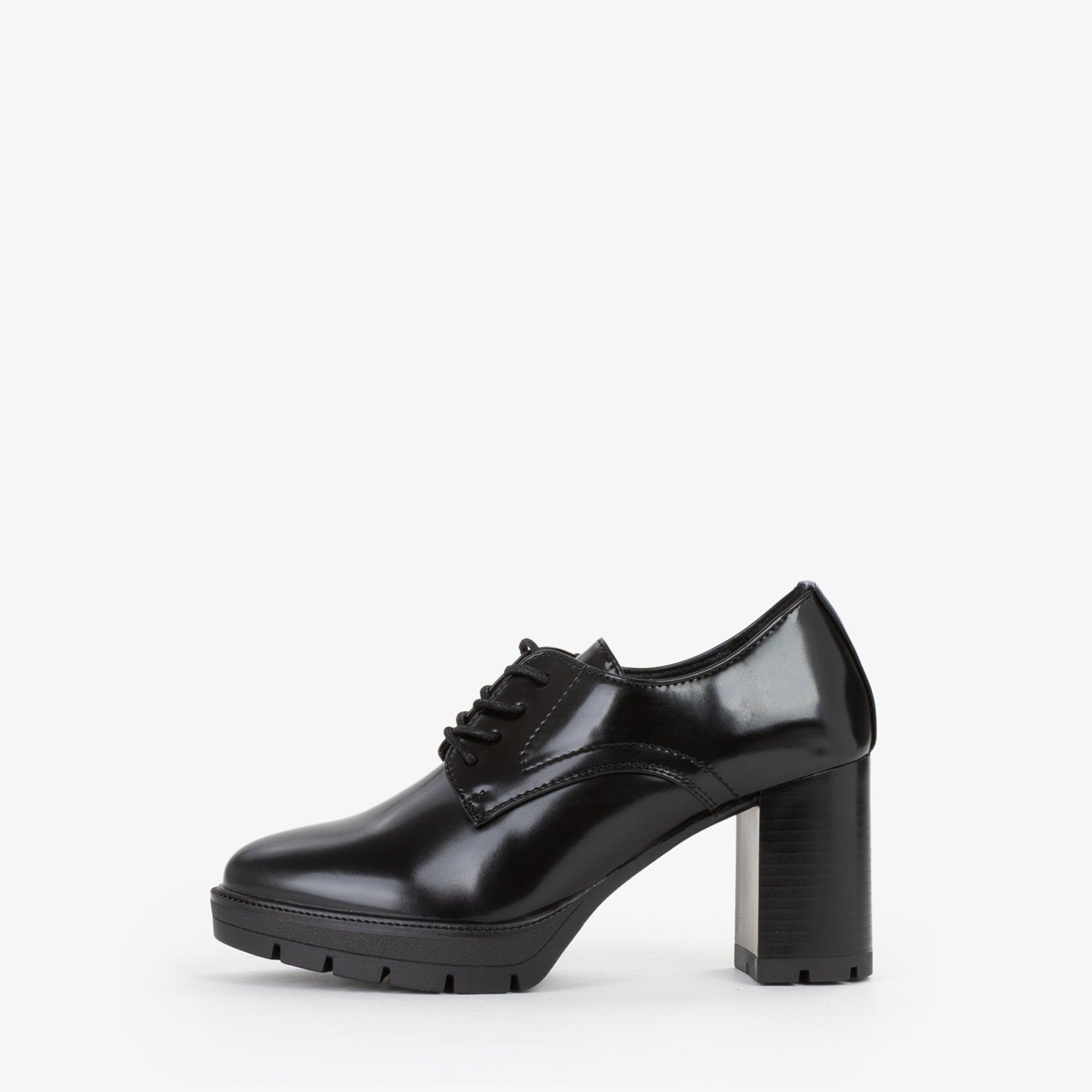 Stringata con tacco alto dal design grintoso e contemporaneo. La tomaia liscia è realizzata in materiale sintetico lucido, con chiusura a cinque fori e lacci piatti per una calzata regolabile. Il fondo in gomma con suola carrarmato e plateau anteriore assicura aderenza e comfort, bilanciando laltezza del tacco largo e stabile. Ideale per chi cerca unalternativa sofisticata al classico derby,perfetta da abbinare a tailleur, pantaloni cropped o minigonne per un look deciso e urbano.undefined