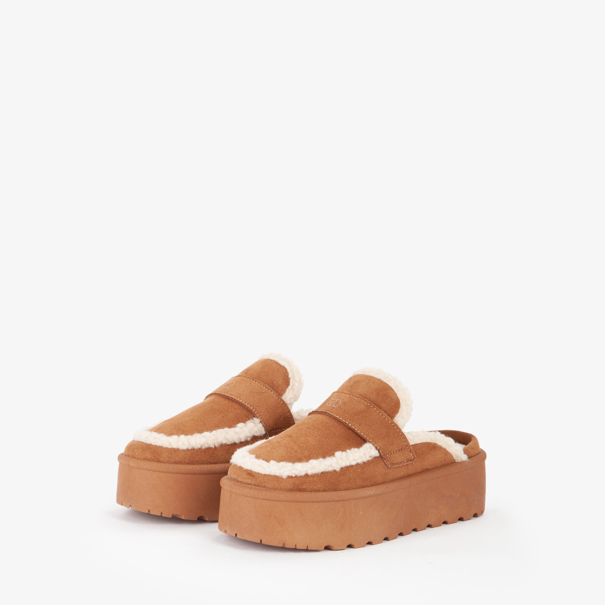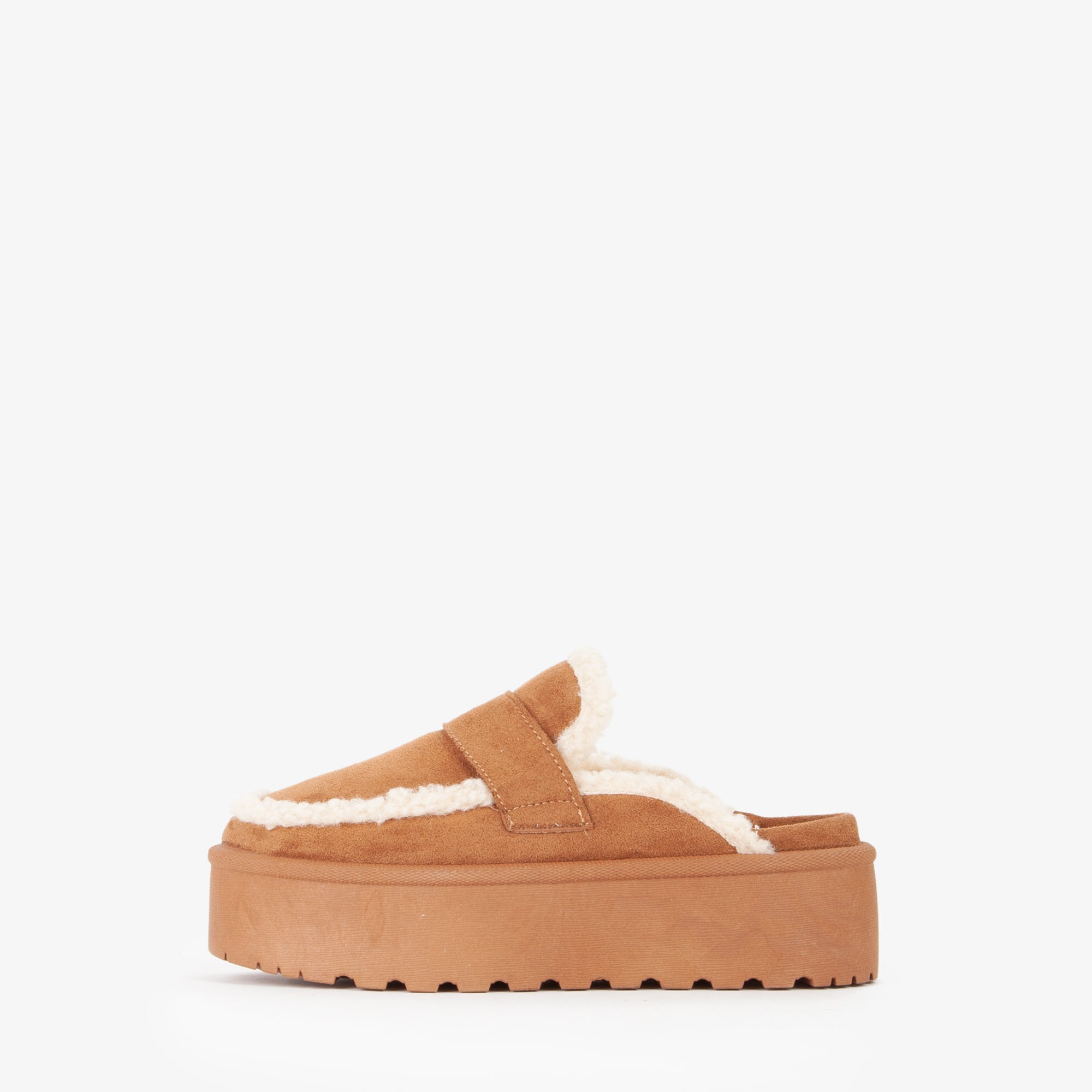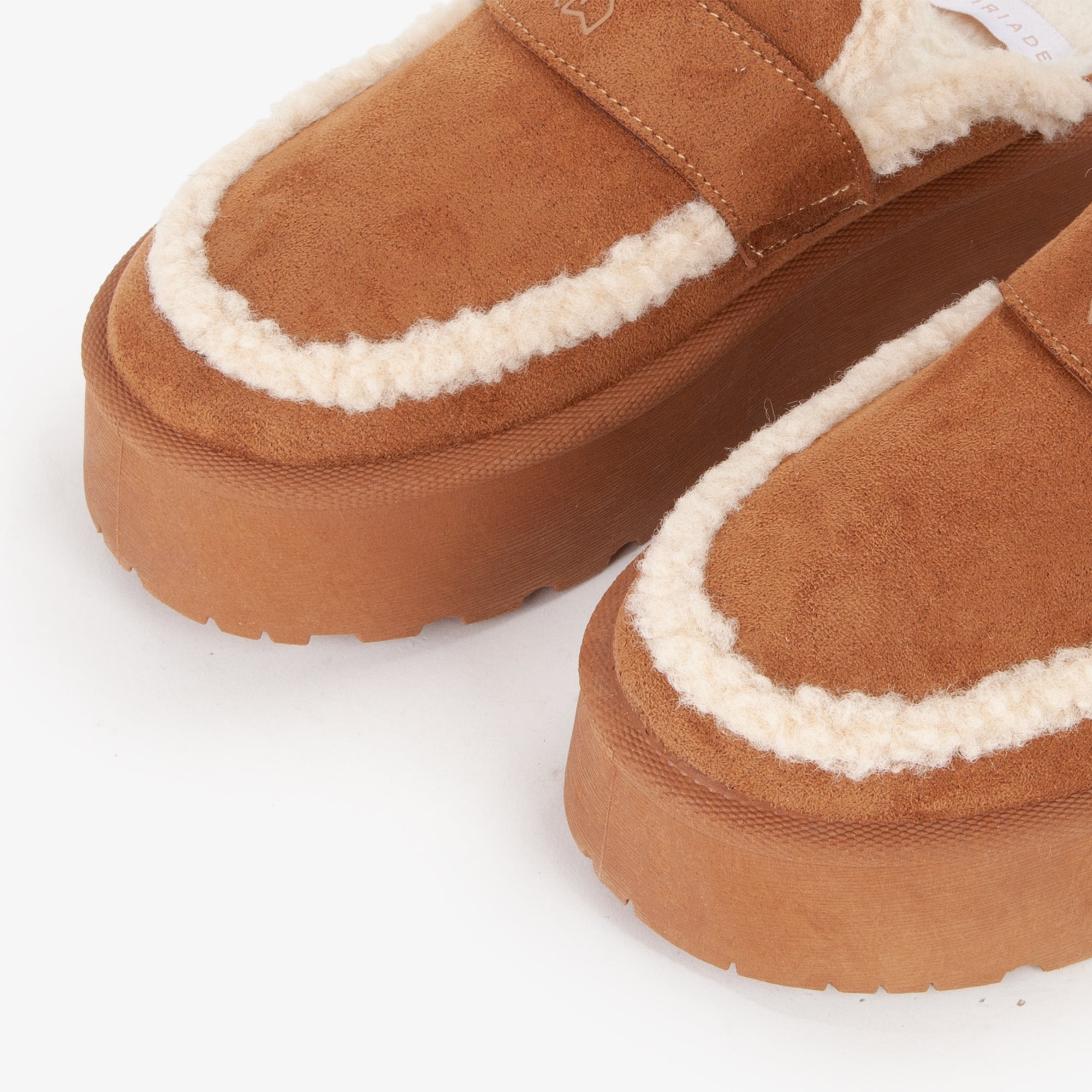 Questa scarpa è un eskimo, modello scalzato, in materiale scamosciato, con un bordo in pelliccia sintetica bianca che conferisce unaspetto caldo e accogliente. La tomaia è semplice, con una fascia sul collo del piede per una vestibilità sicura. Il fondo è alto ein gomma con suola spessa, che offre comfort e stabilità. Ideale per un look casual e confortevole durante la stagione fredda, perfetta per l'uso quotidiano o per momenti di relax.