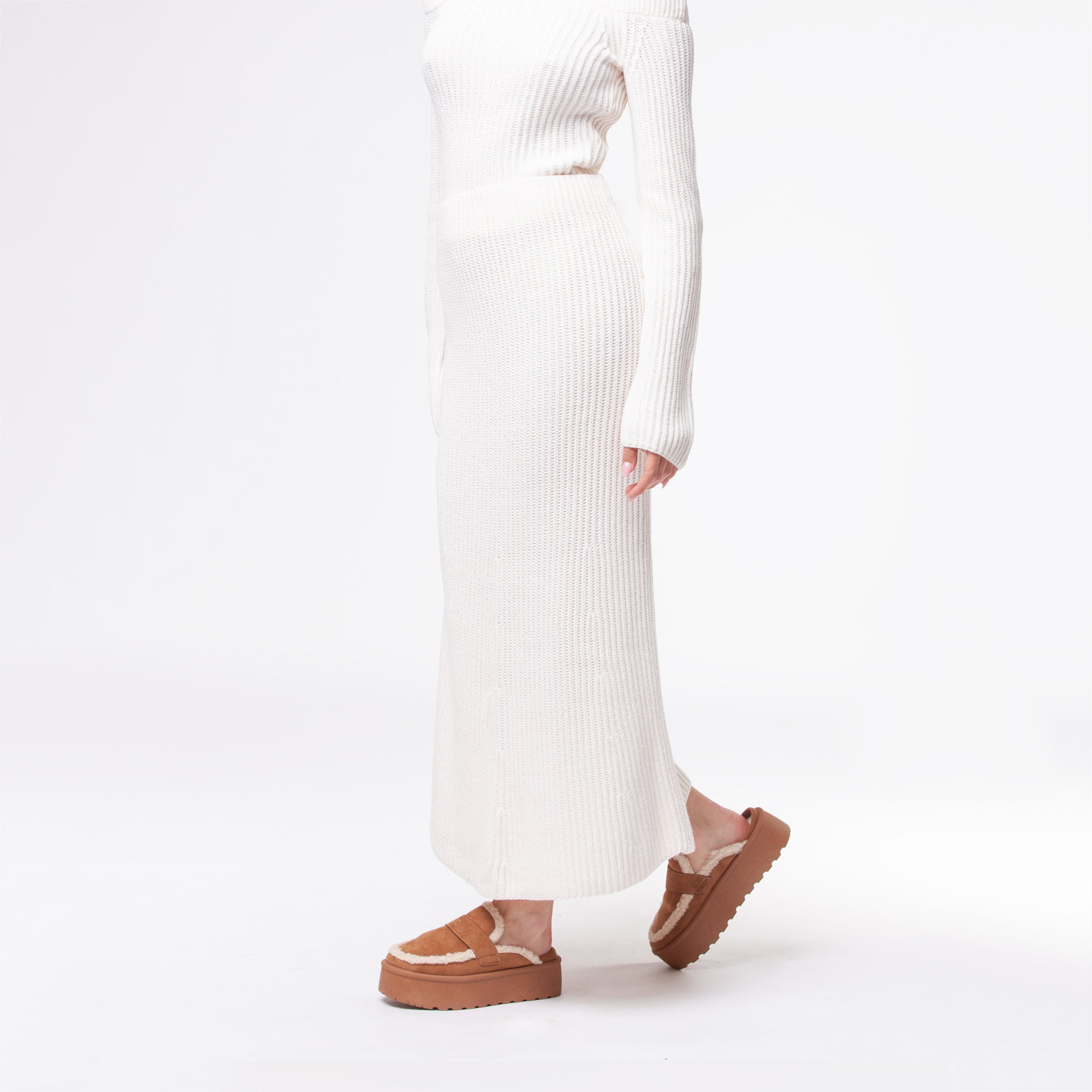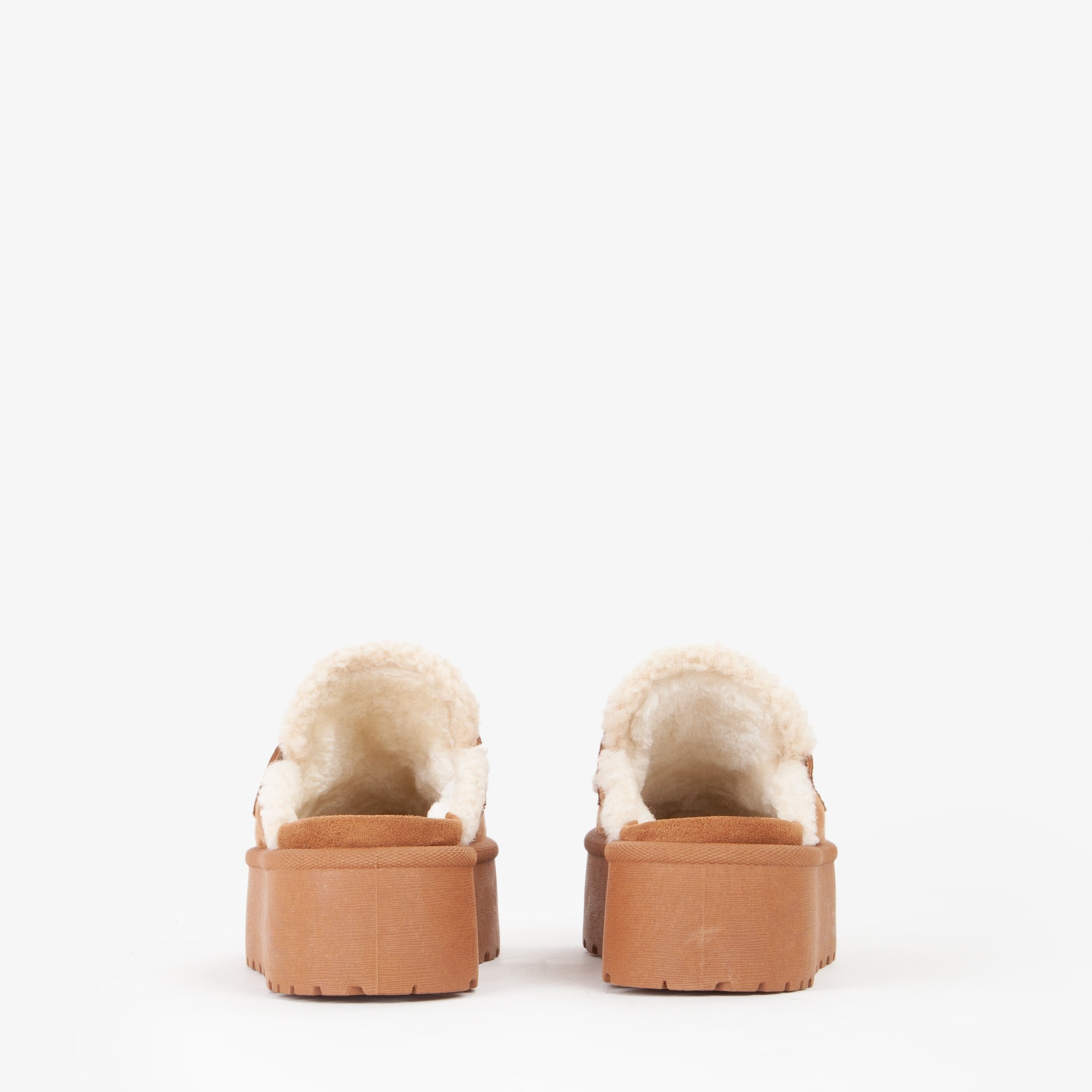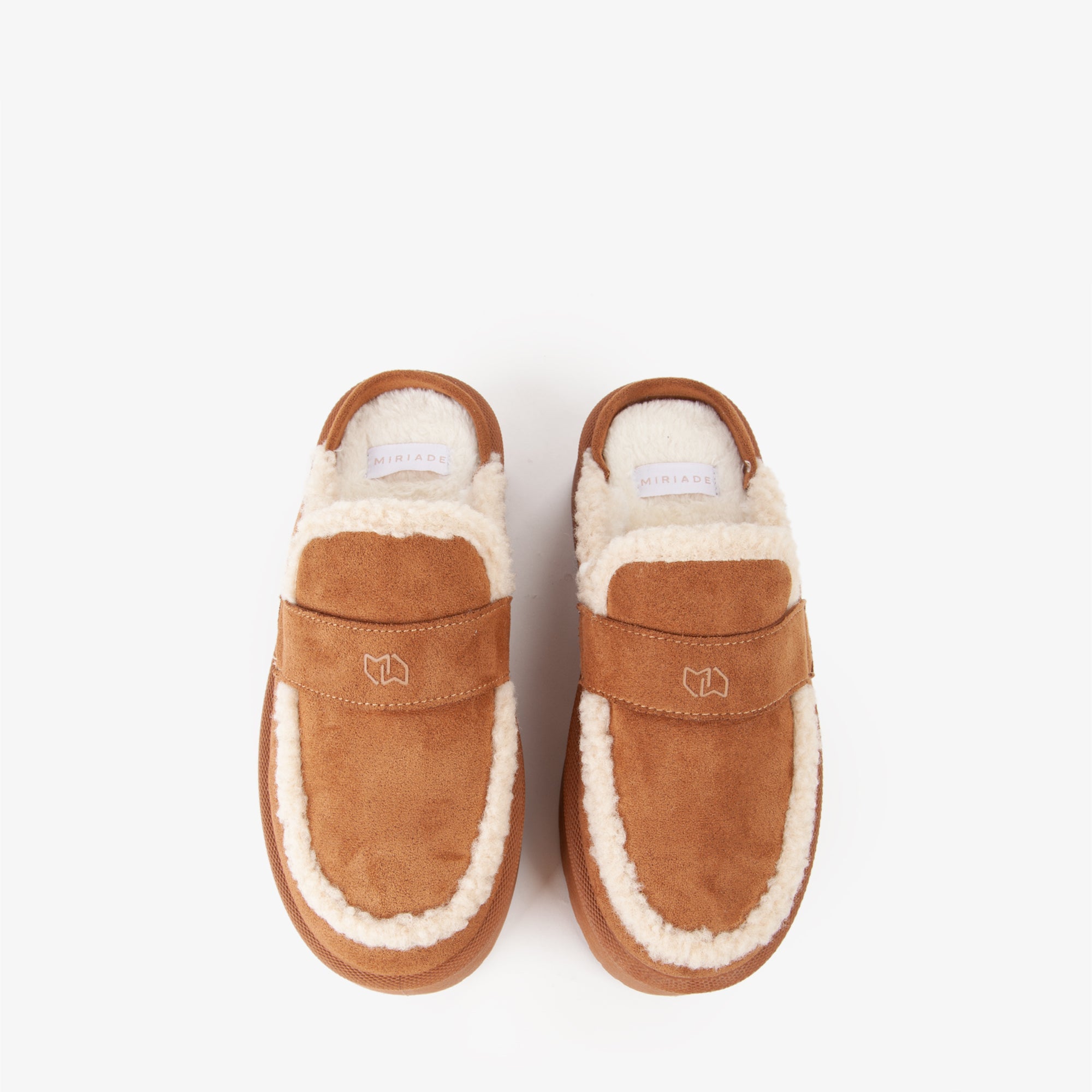 Questa scarpa è un eskimo, modello scalzato, in materiale scamosciato, con un bordo in pelliccia sintetica bianca che conferisce unaspetto caldo e accogliente. La tomaia è semplice, con una fascia sul collo del piede per una vestibilità sicura. Il fondo è alto ein gomma con suola spessa, che offre comfort e stabilità. Ideale per un look casual e confortevole durante la stagione fredda, perfetta per l'uso quotidiano o per momenti di relax.