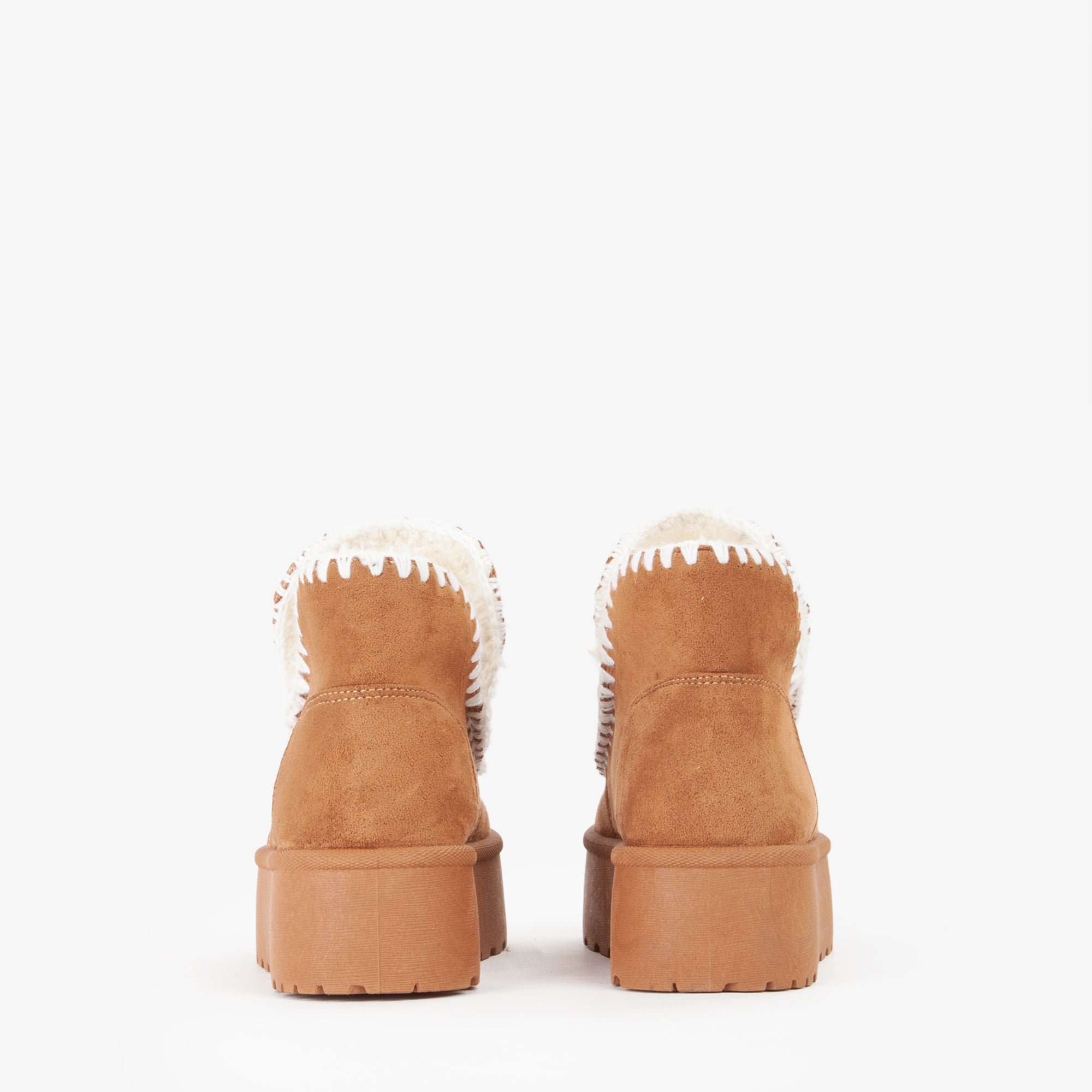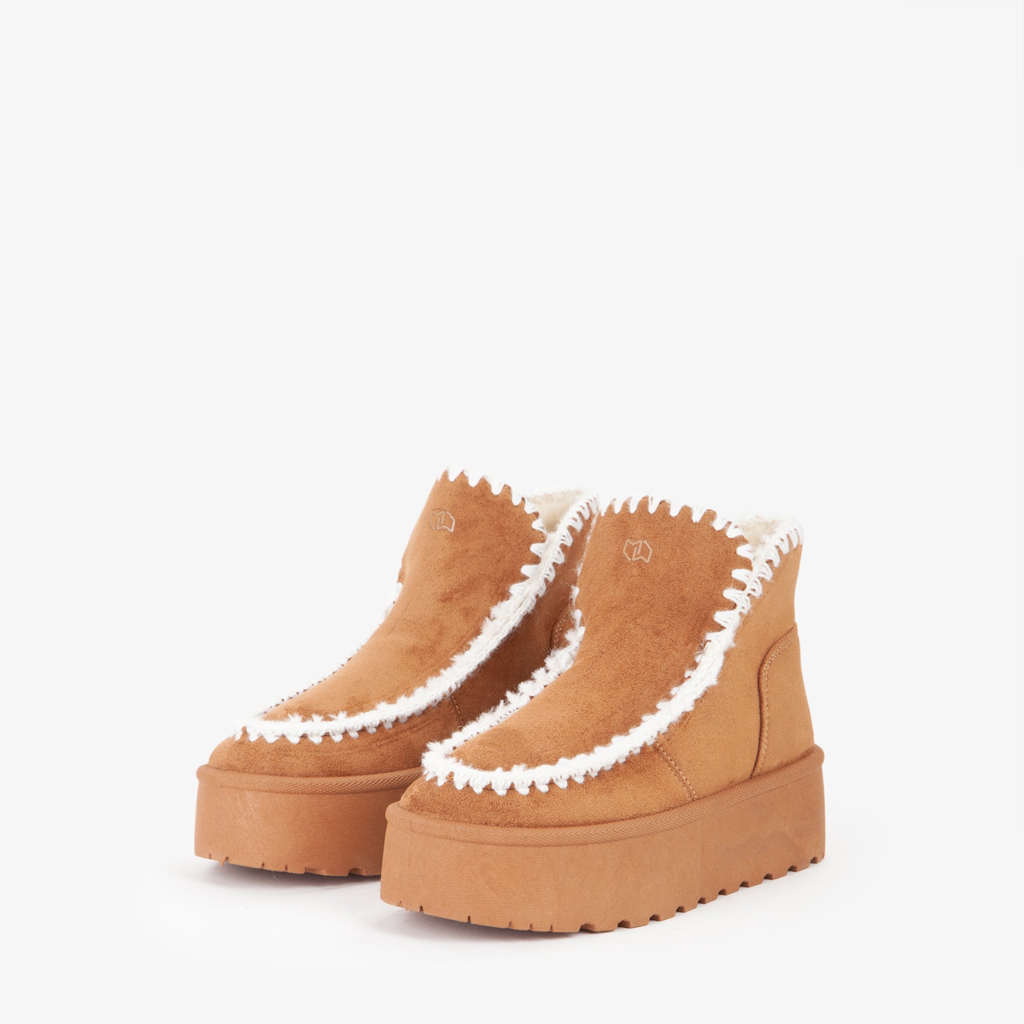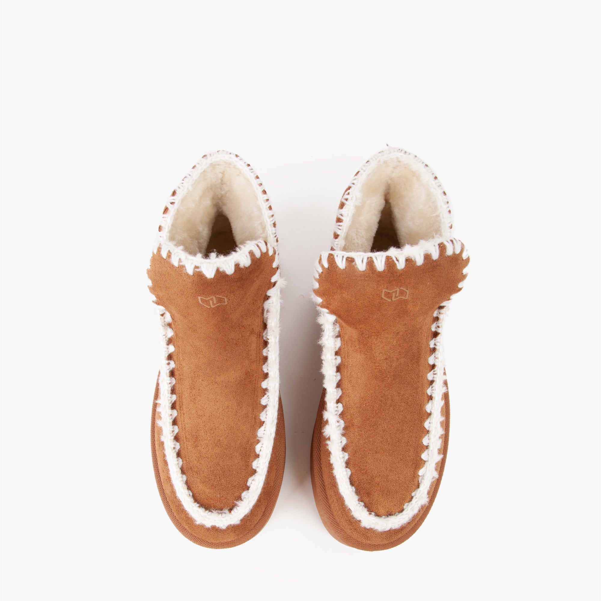 Questa scarpa è un modello tipo eskimo in materiale scamosciato color cammello, con una cucitura bianca decorativa che percorre i bordi, che conferisce un tocco artigianale. La tomaia è alta e senza chiusure, facile da indossare. Il fondo è alto e in gomma, con una suola spessa che garantisce comfort e stabilità. Perfetta per il tempo libero durante la stagione fredda, è ideale per un look casual e informale.