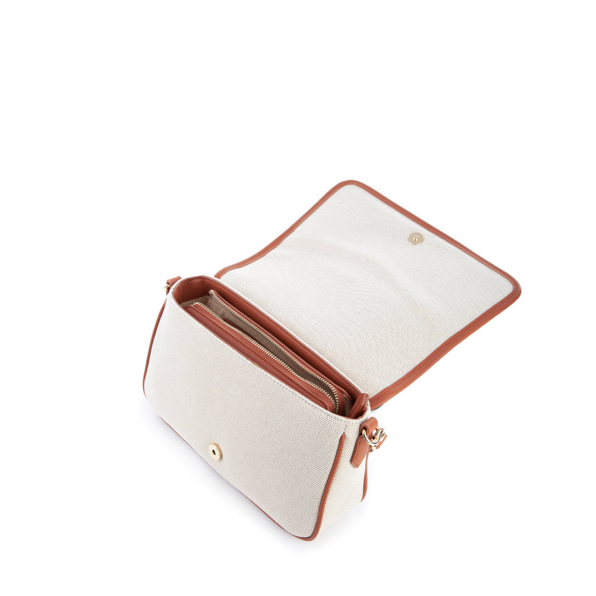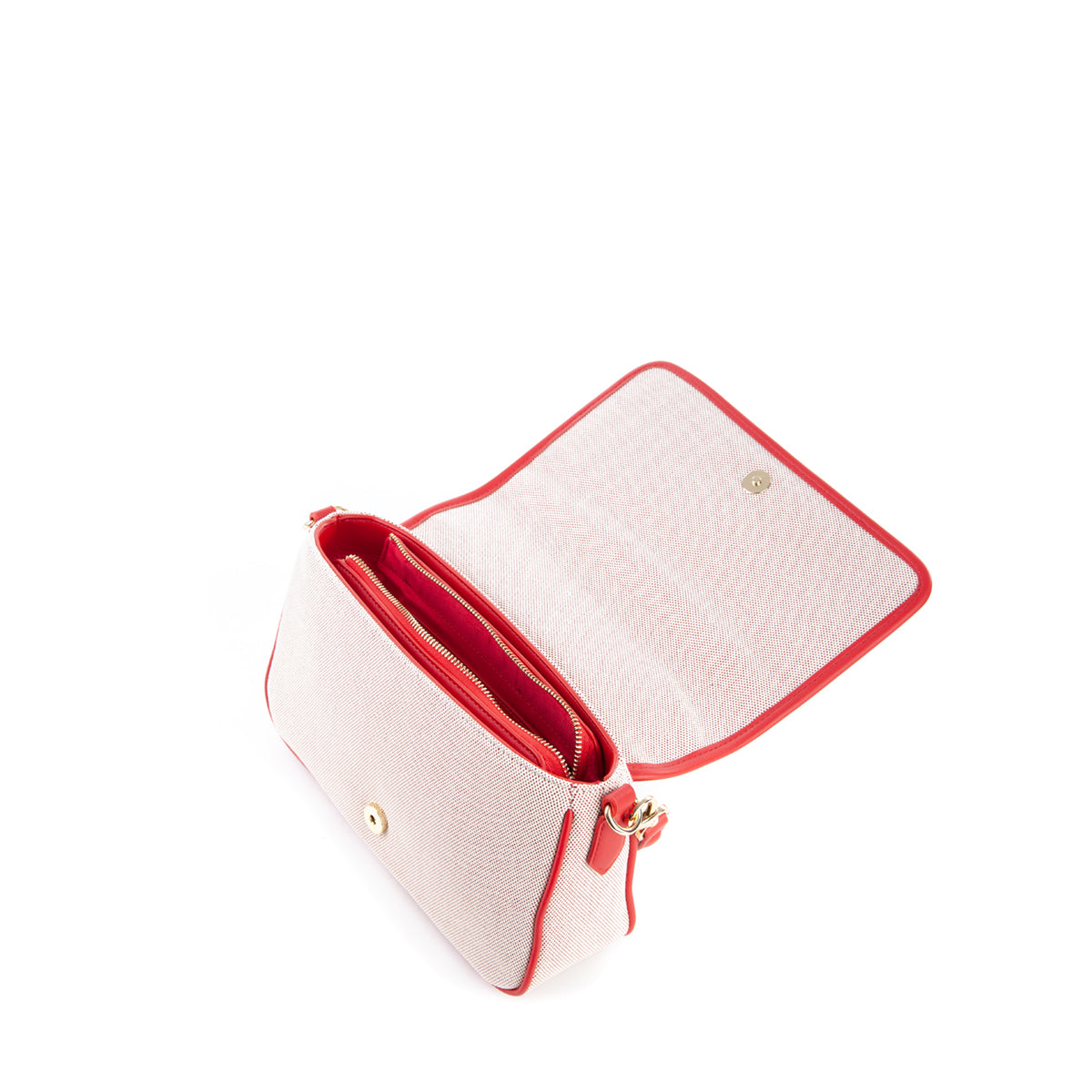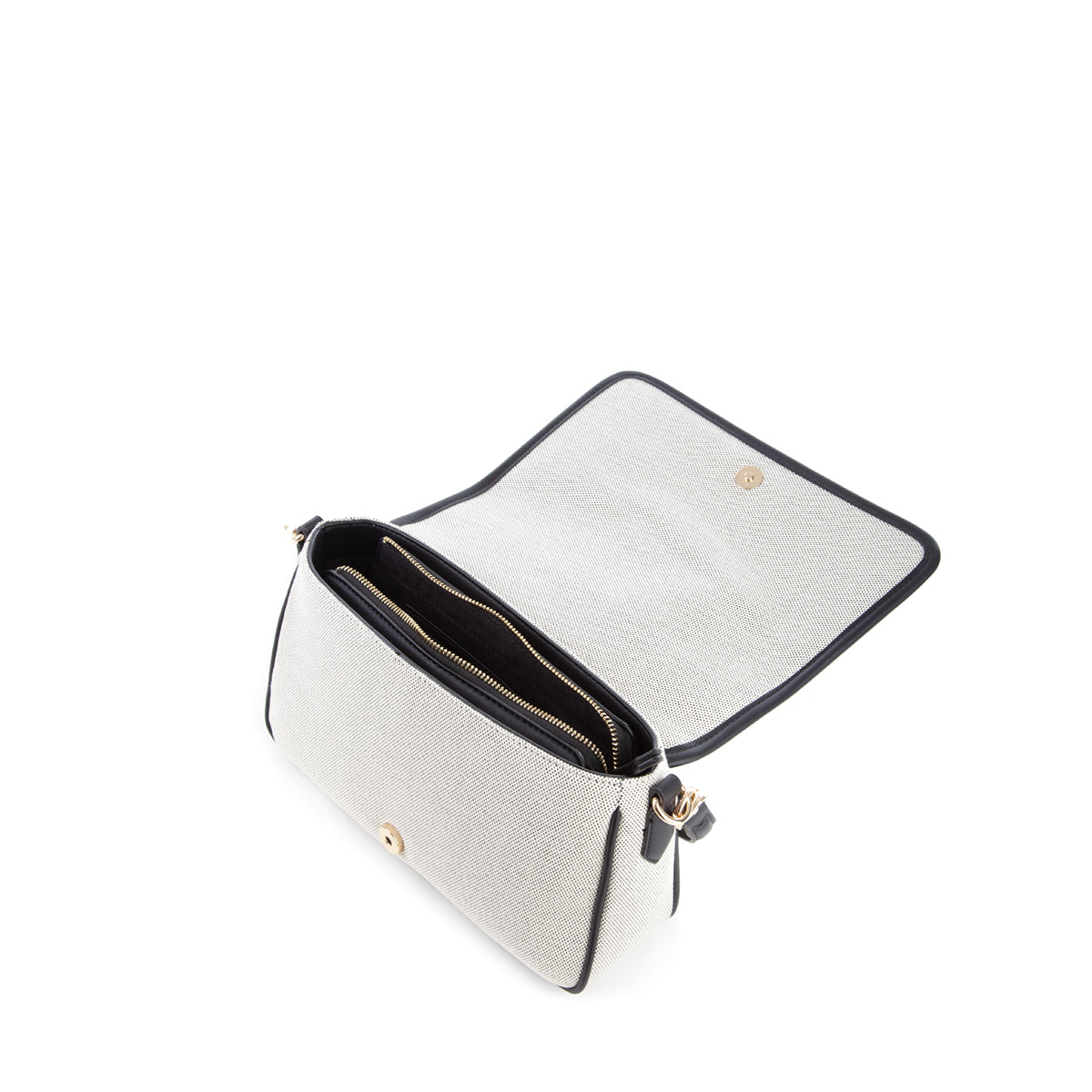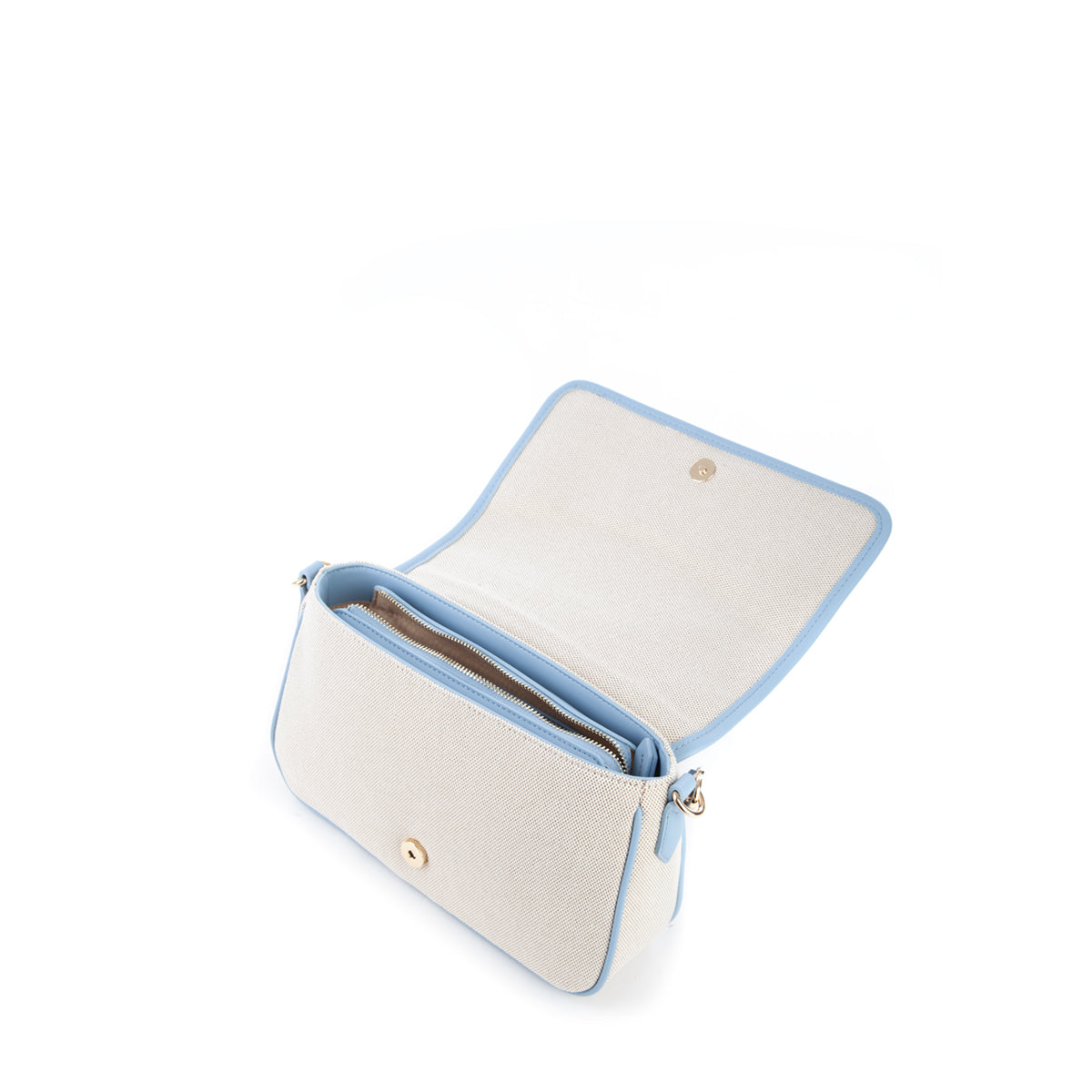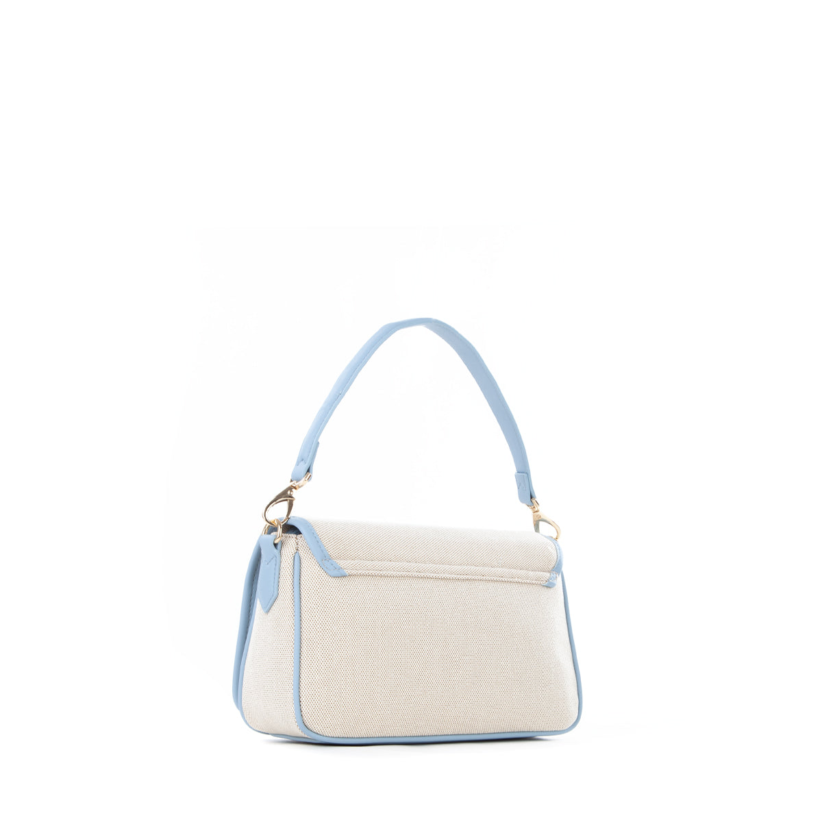 Crossbody a spalla in canvas con riporto in nappa a contrasto. La personalizzazione è ricamata in tinta al riporto. E' dotata di unatracolla di servizio in nastro in tinta al riporto.