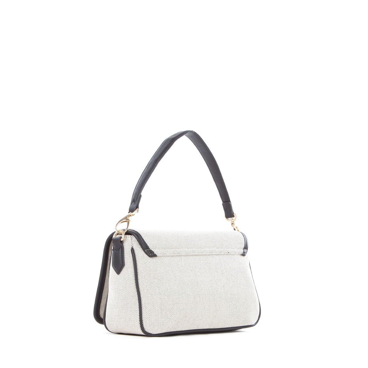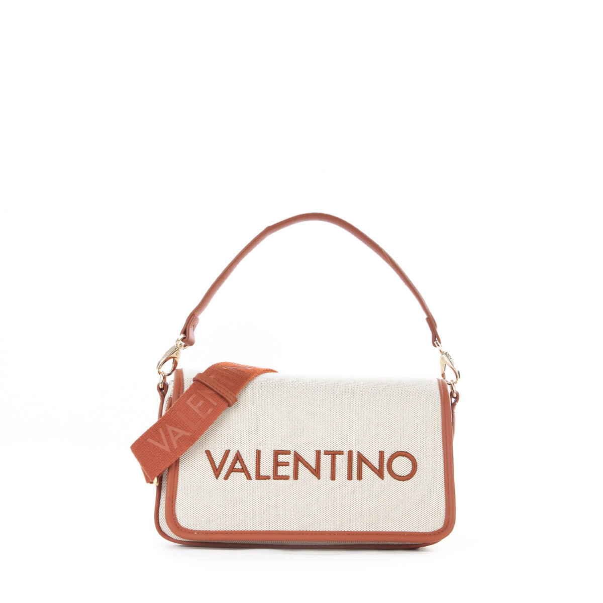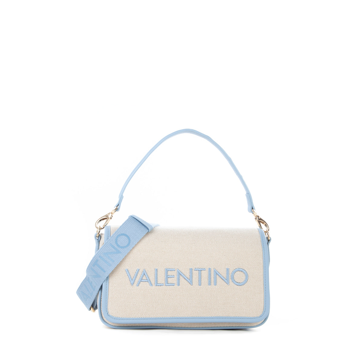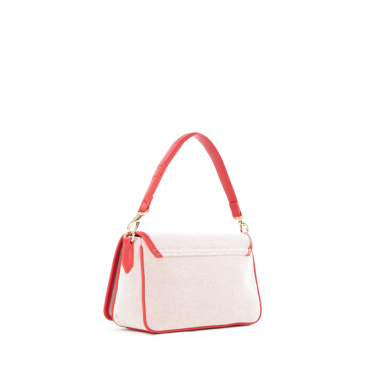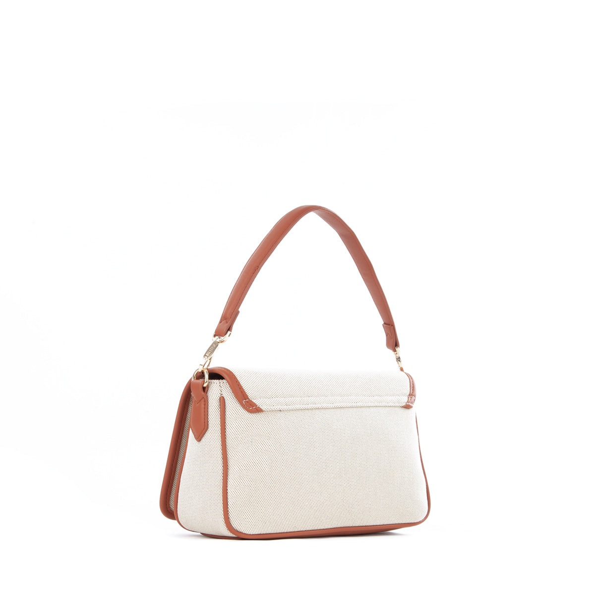 Crossbody a spalla in canvas con riporto in nappa a contrasto. La personalizzazione è ricamata in tinta al riporto. E' dotata di unatracolla di servizio in nastro in tinta al riporto.