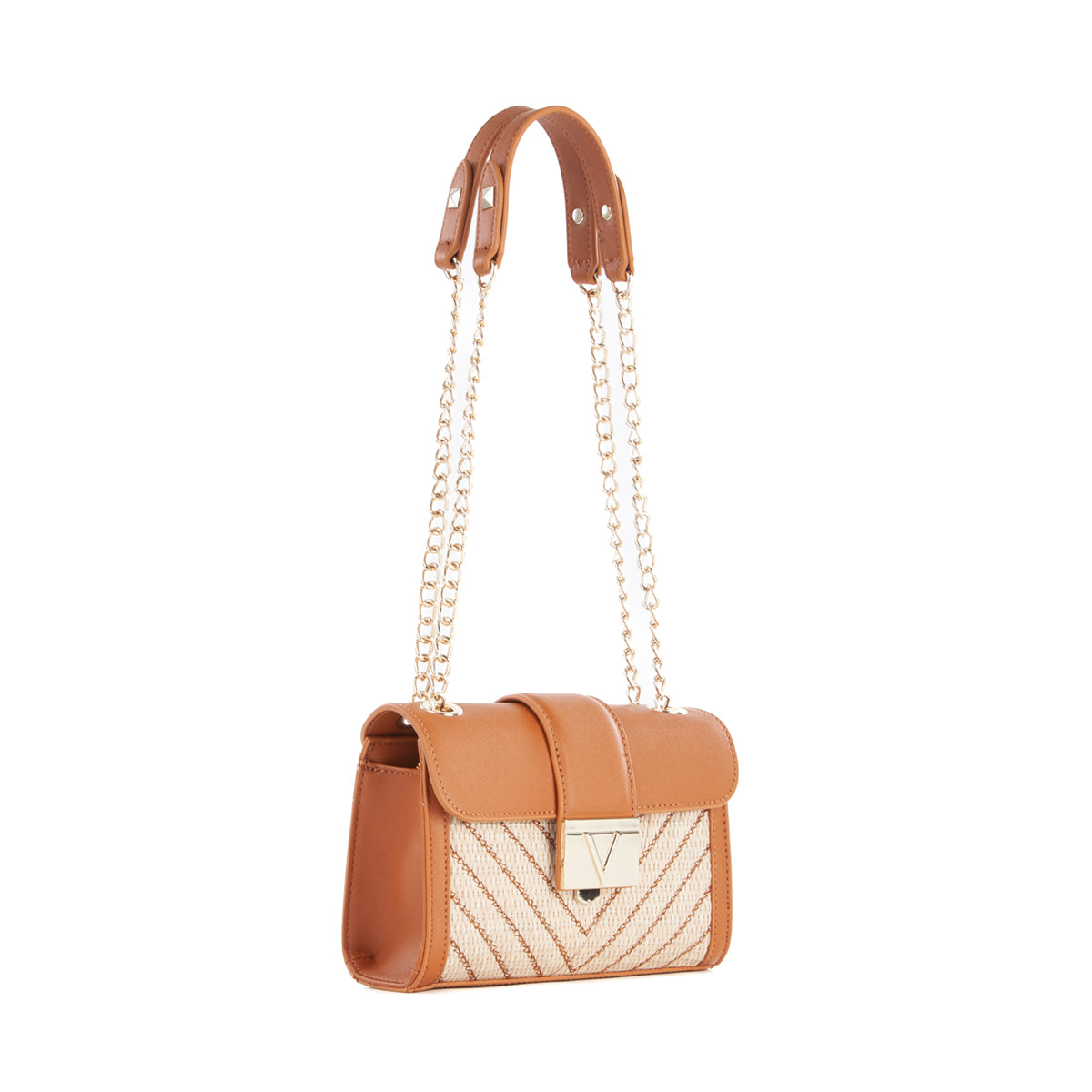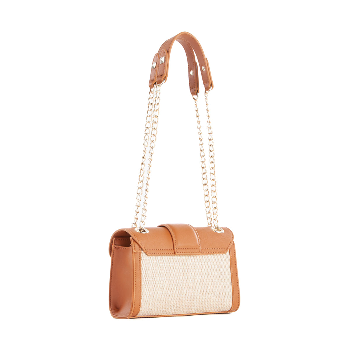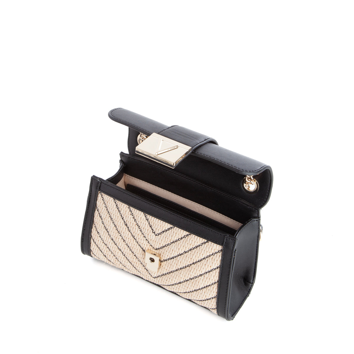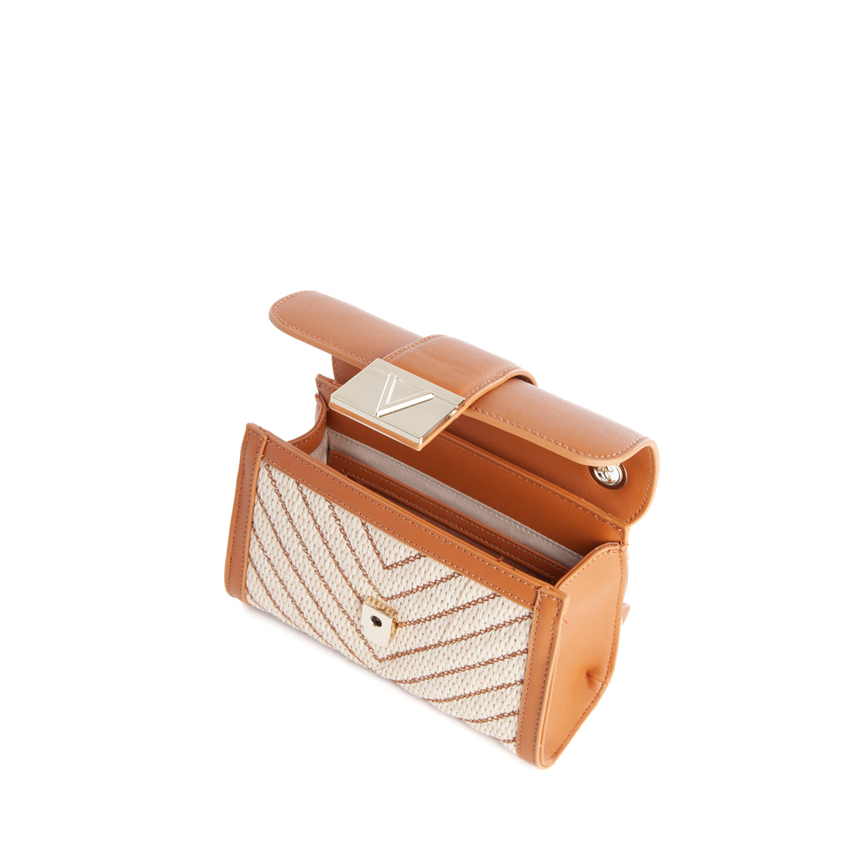 Pattina con dettaglio e ricamo sul fronte che ricorda l'iconico logo del brand, in rafia naturale e nappa a contrasto.