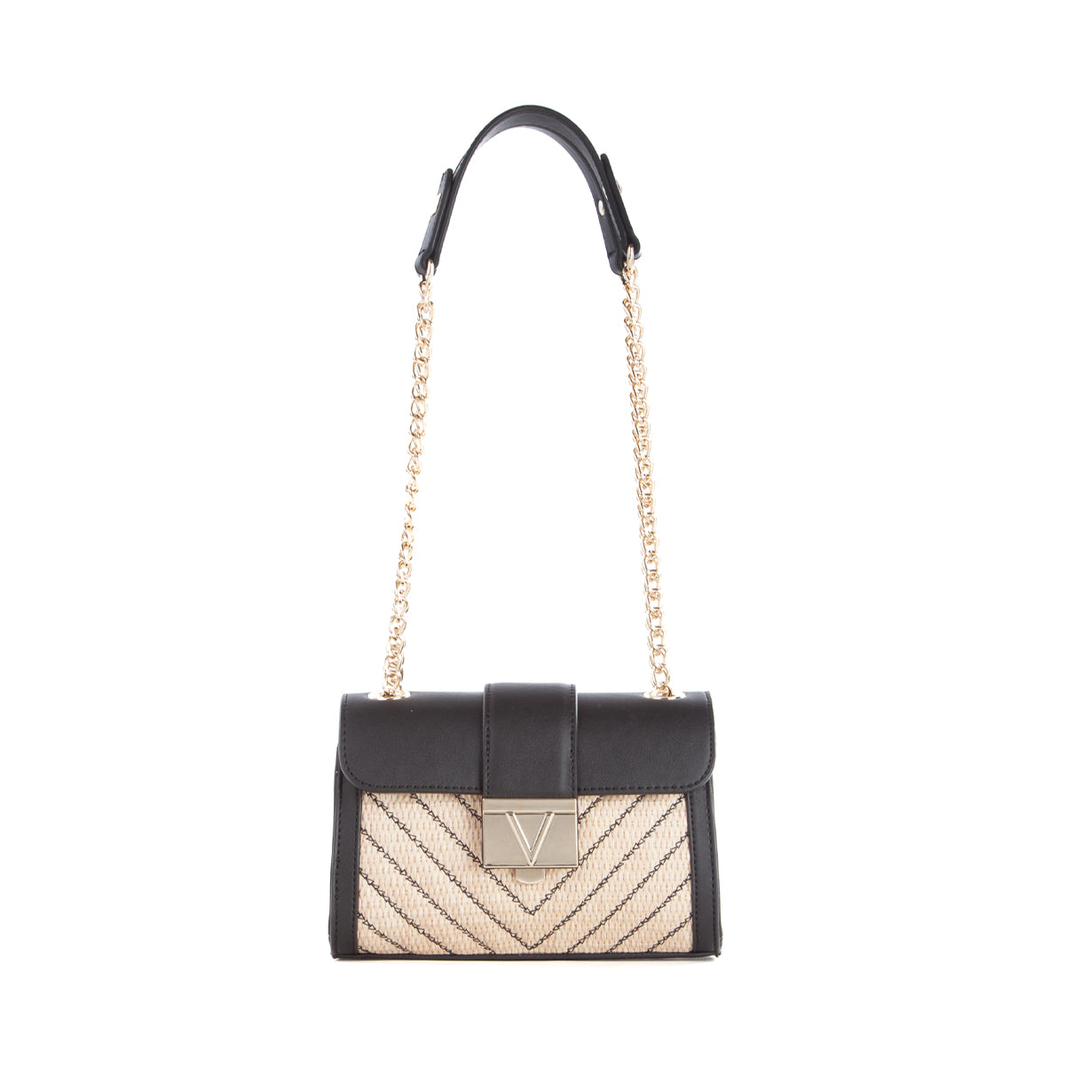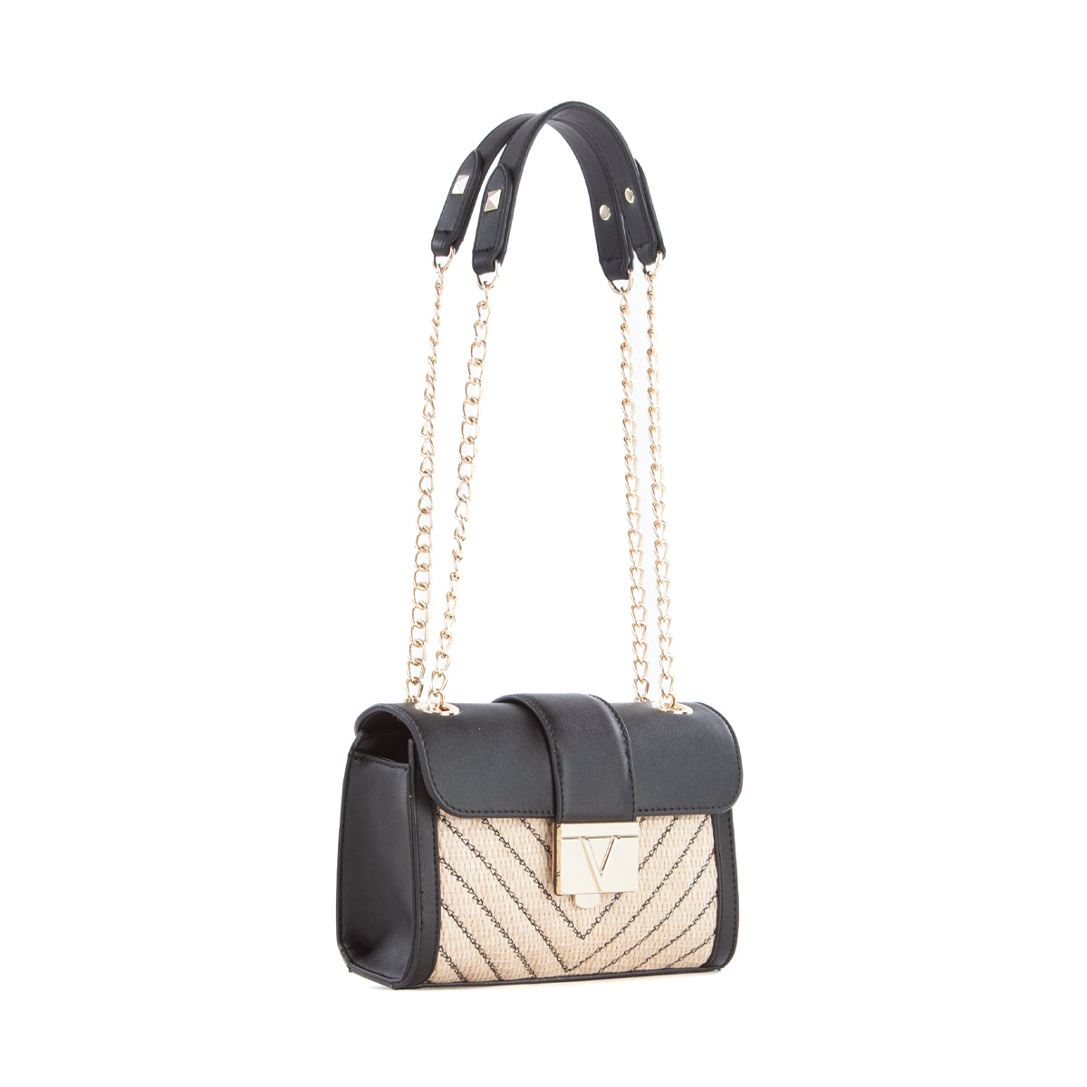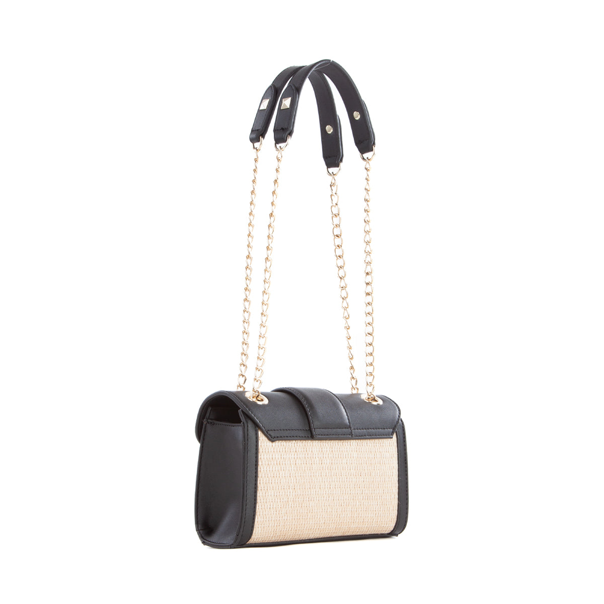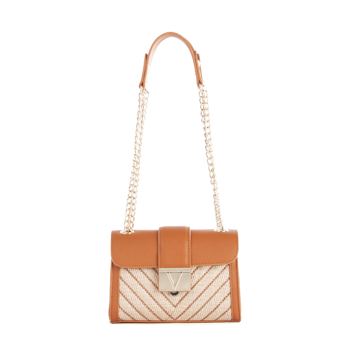 Pattina con dettaglio e ricamo sul fronte che ricorda l'iconico logo del brand, in rafia naturale e nappa a contrasto.