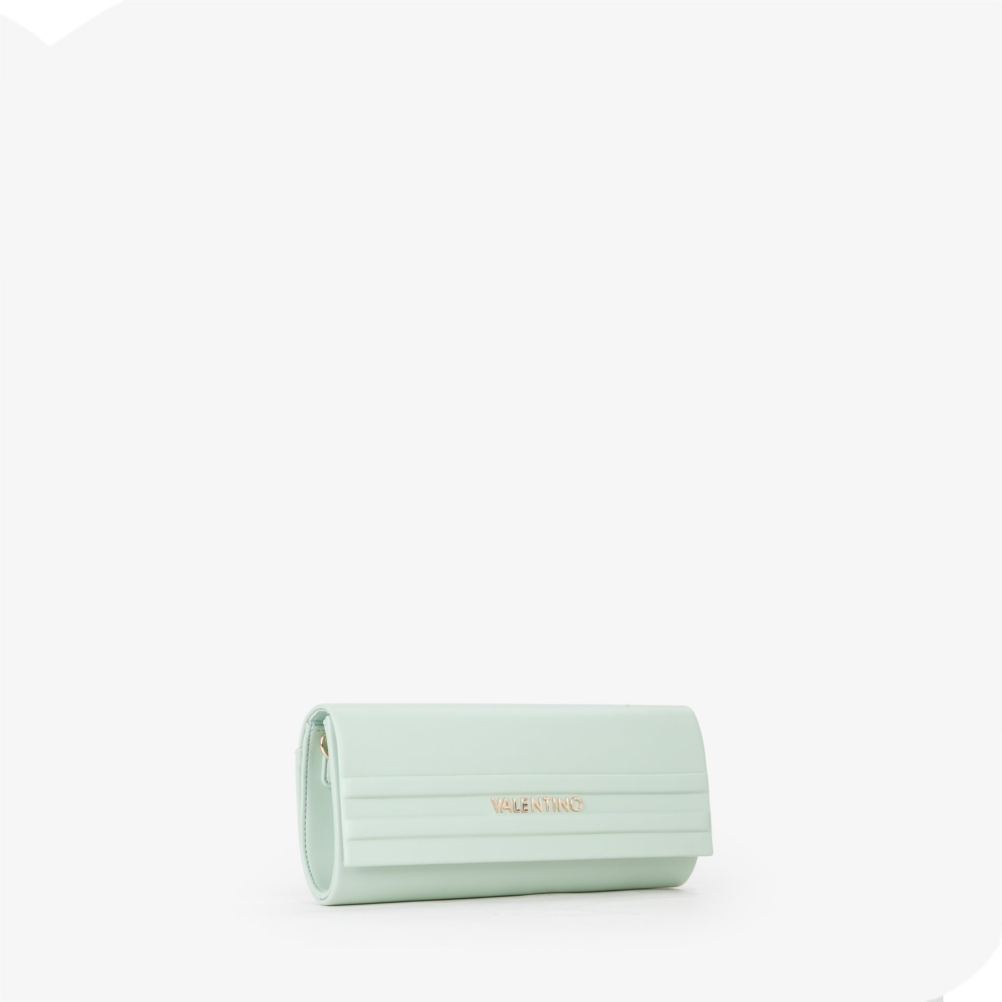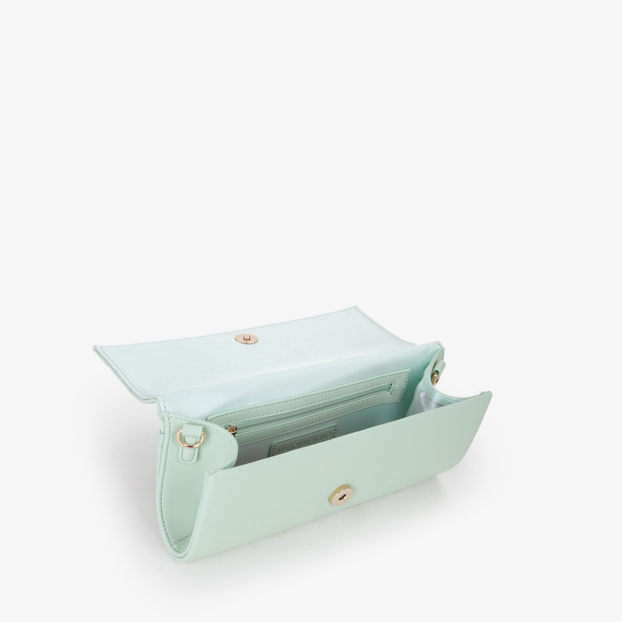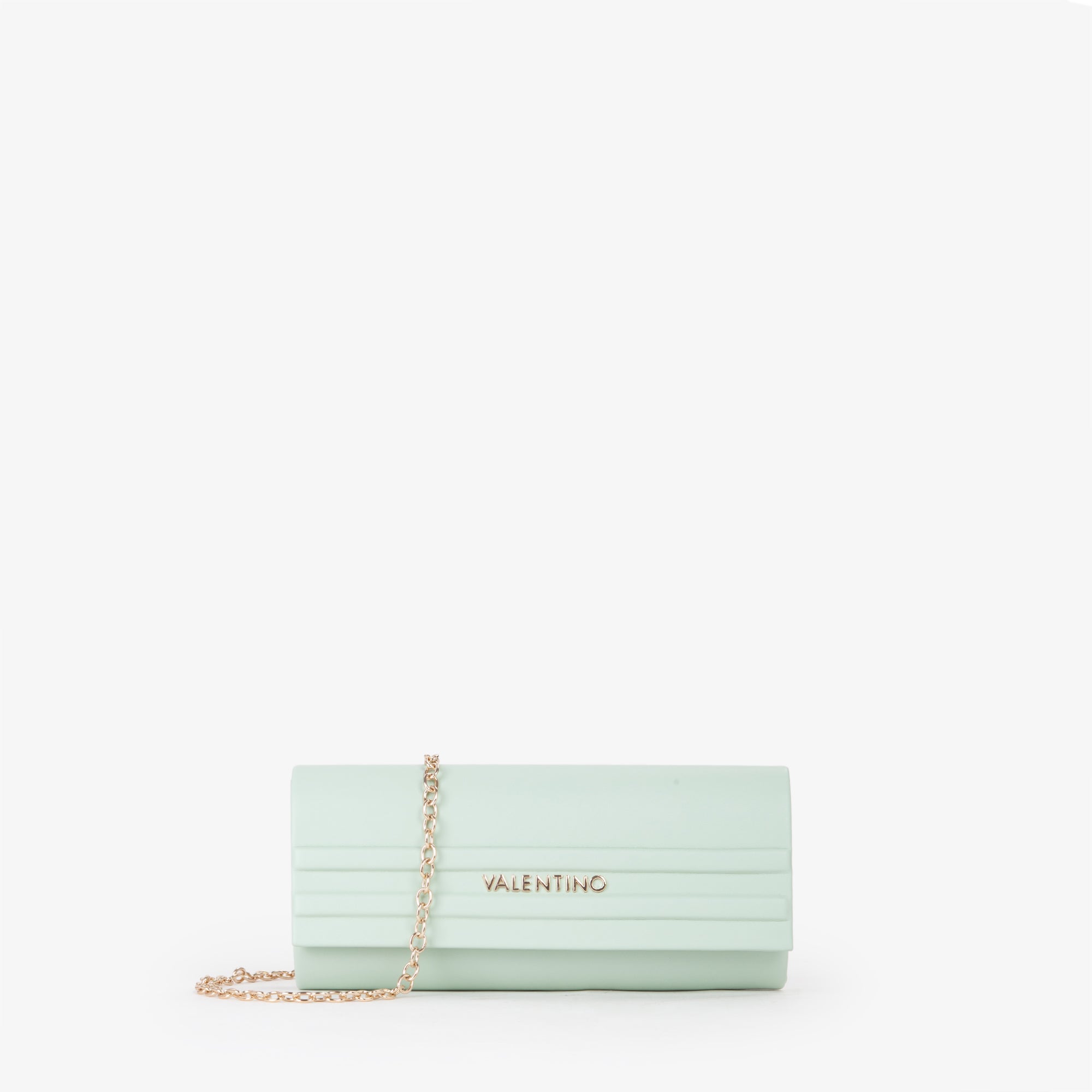 Pochette da sera, elegante, con logo in letterine metalliche. Tracolla in catena staccabile.