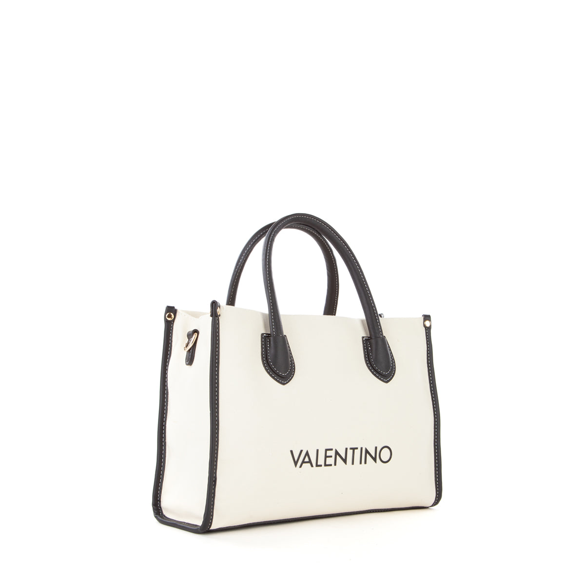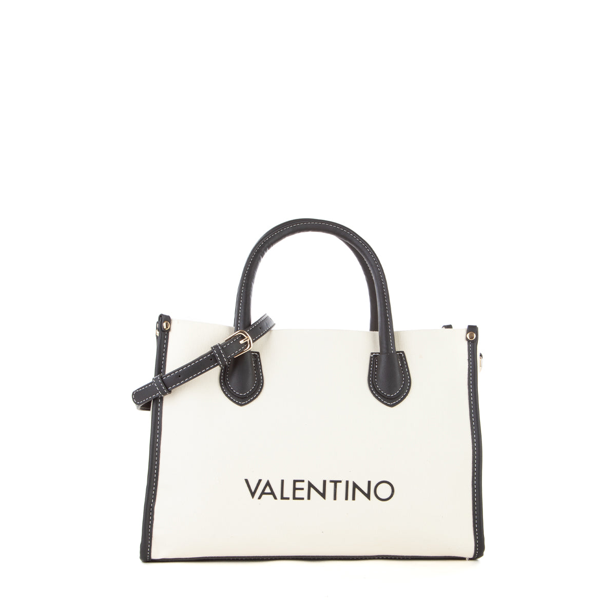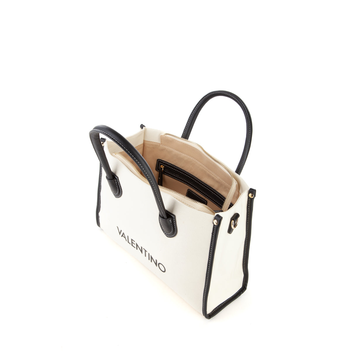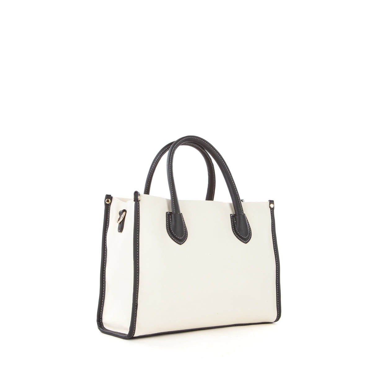 Borsa a mano in canvas con riporto a contrasto. La personalizzazione è stampata in nero. Dispone di una tracolla in nastro personalizzata e di una standard in riporto.