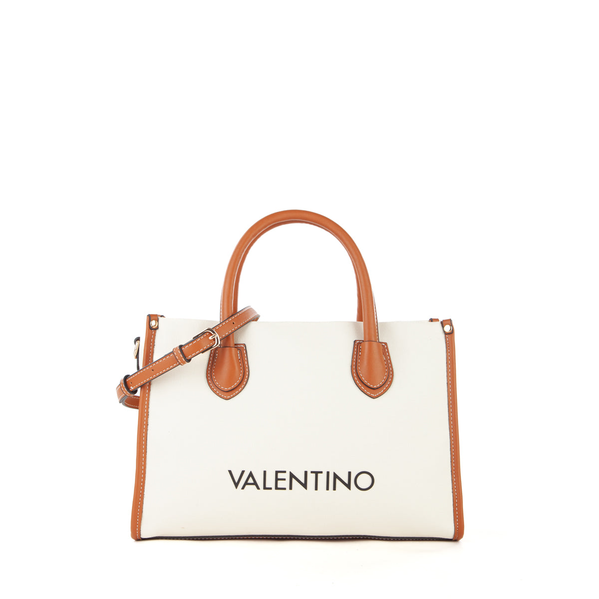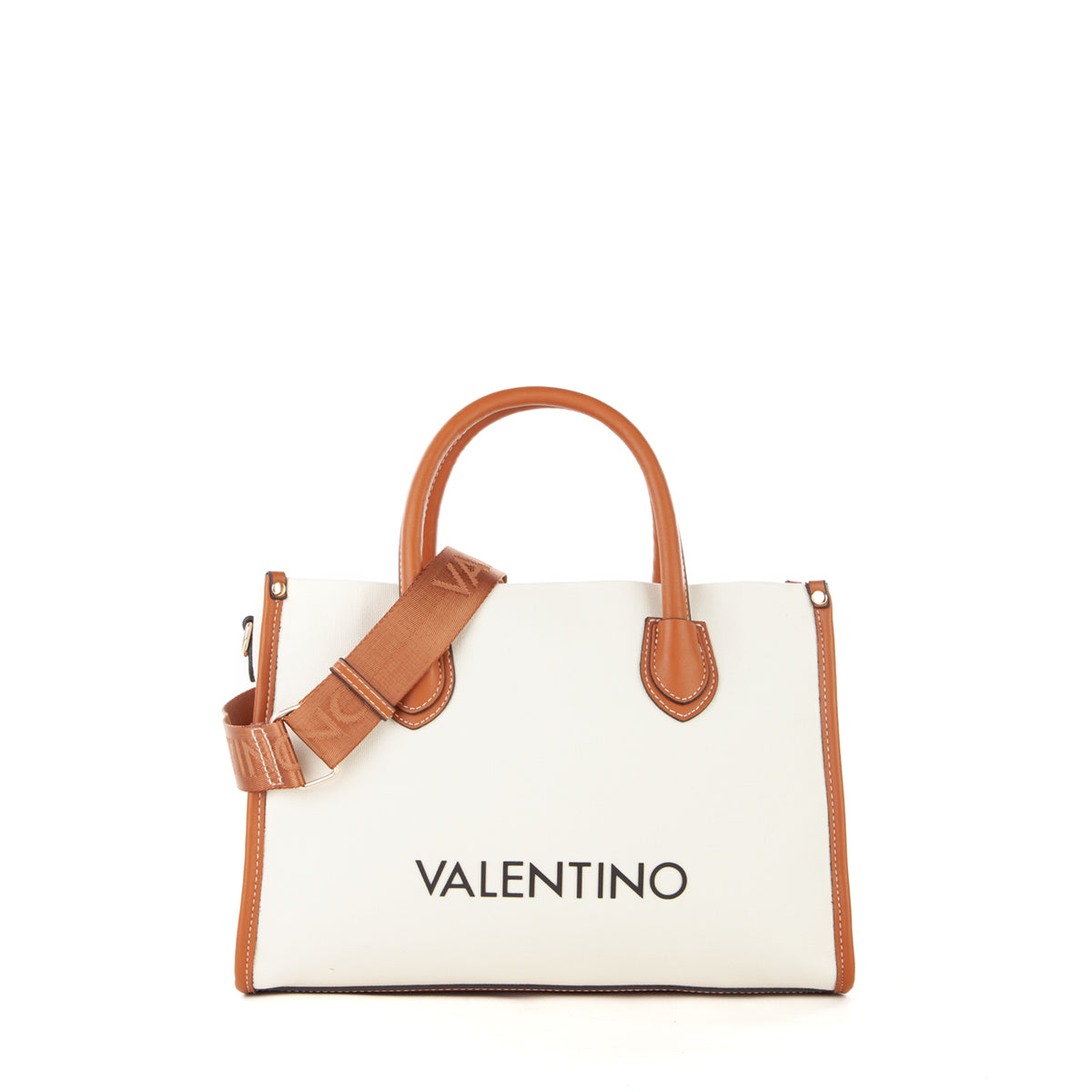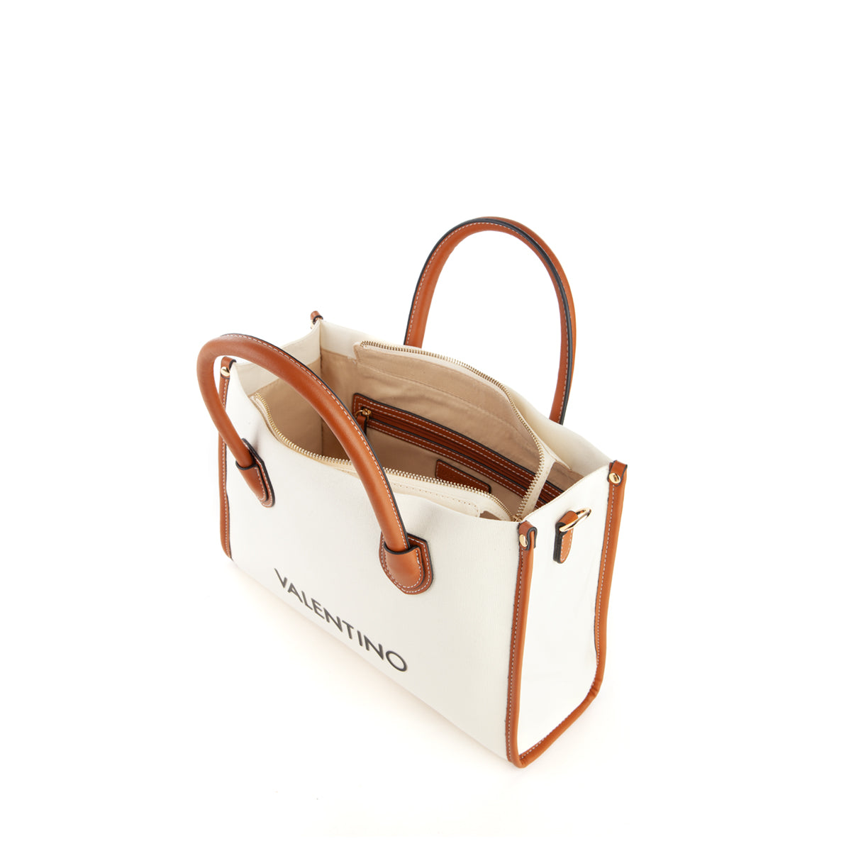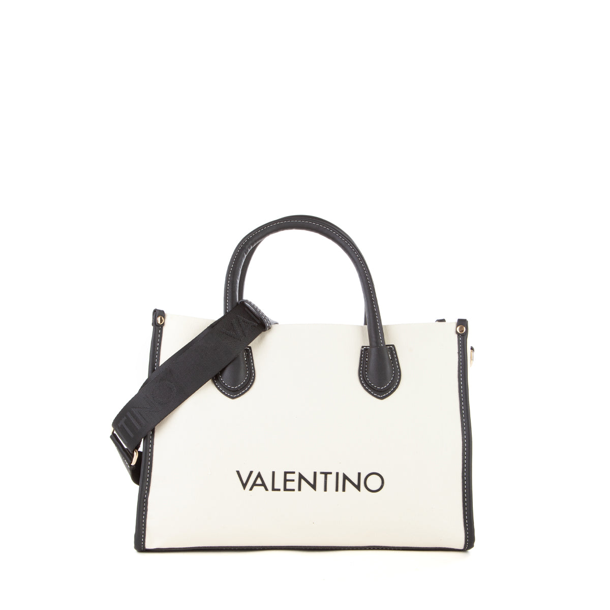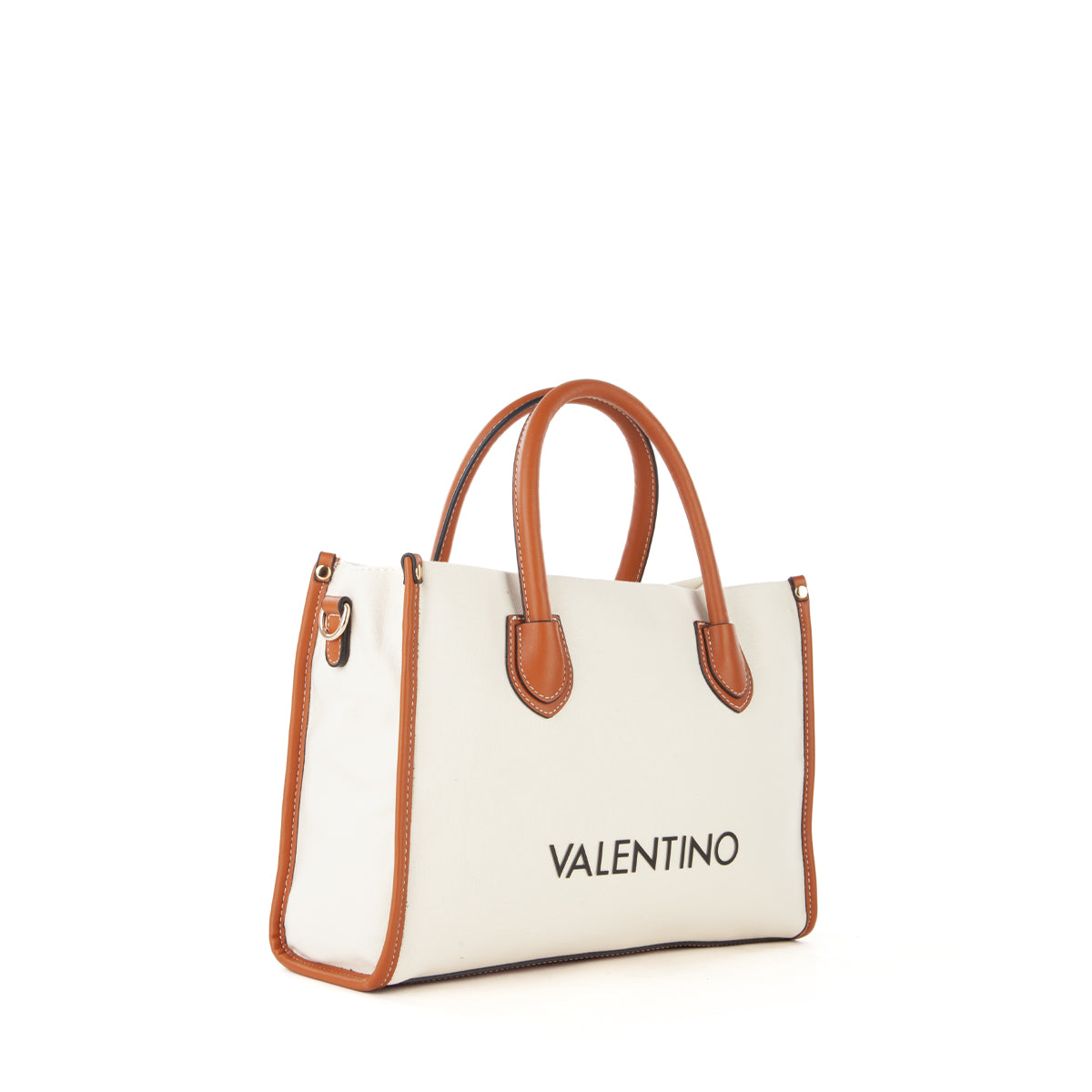 Borsa a mano in canvas con riporto a contrasto. La personalizzazione è stampata in nero. Dispone di una tracolla in nastro personalizzata e di una standard in riporto.