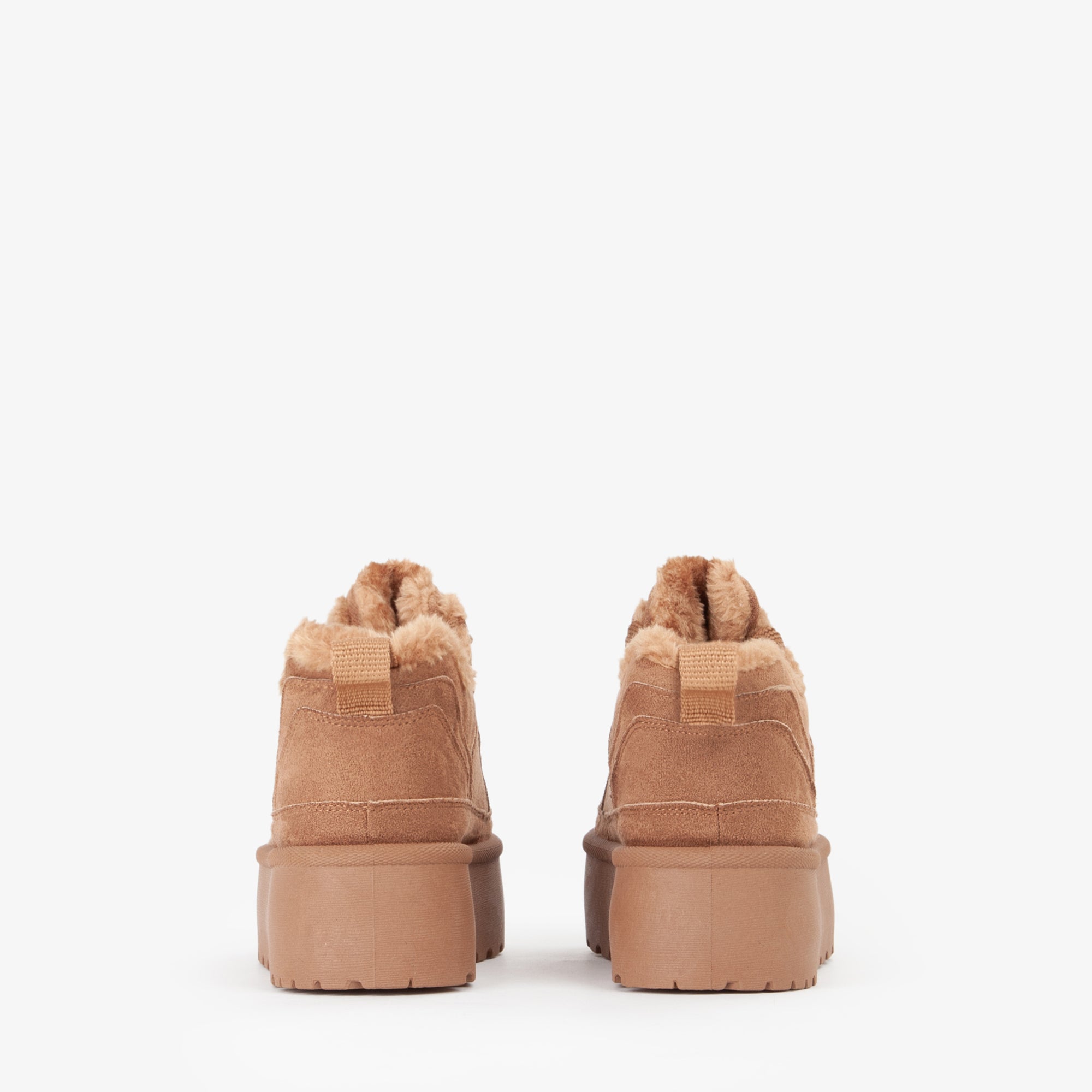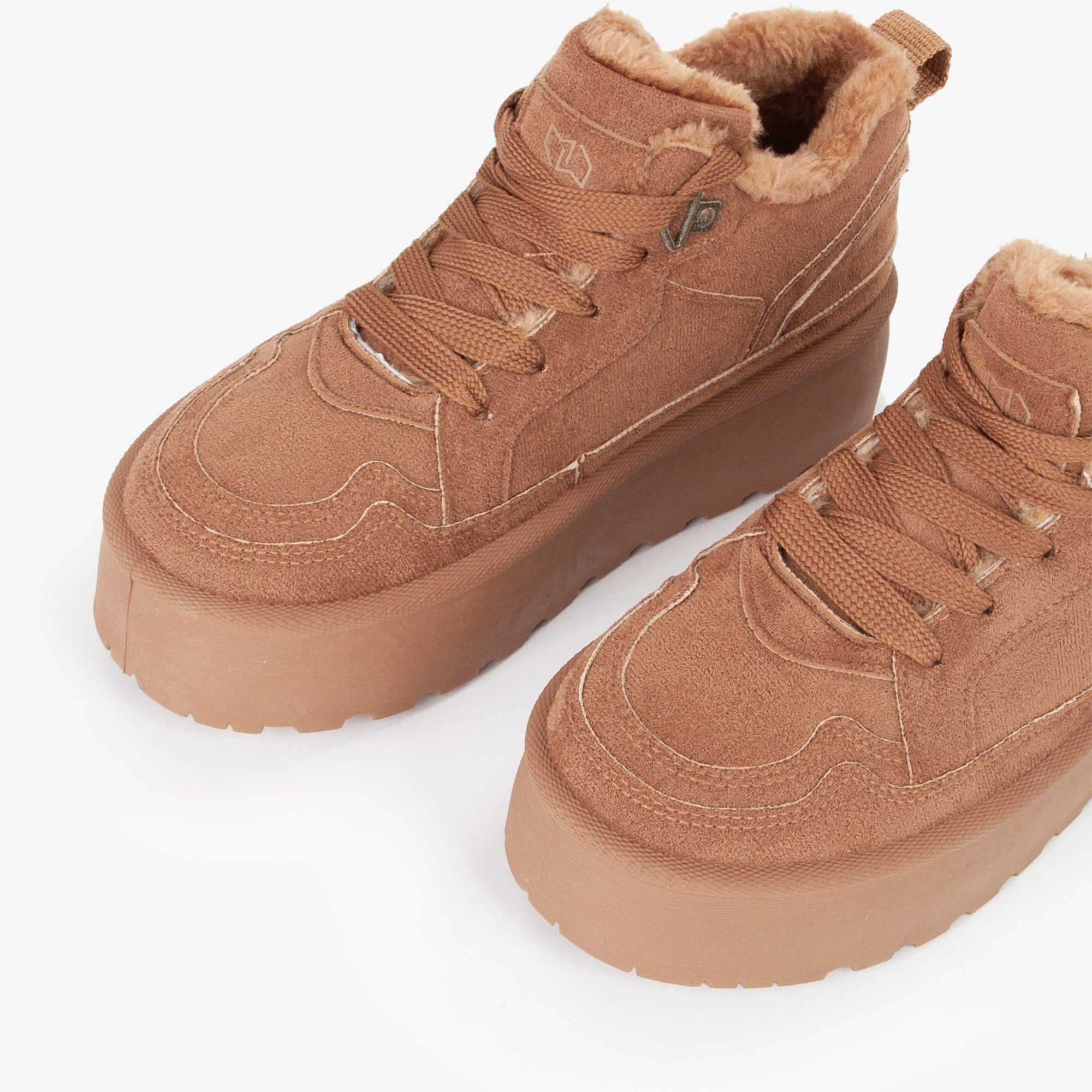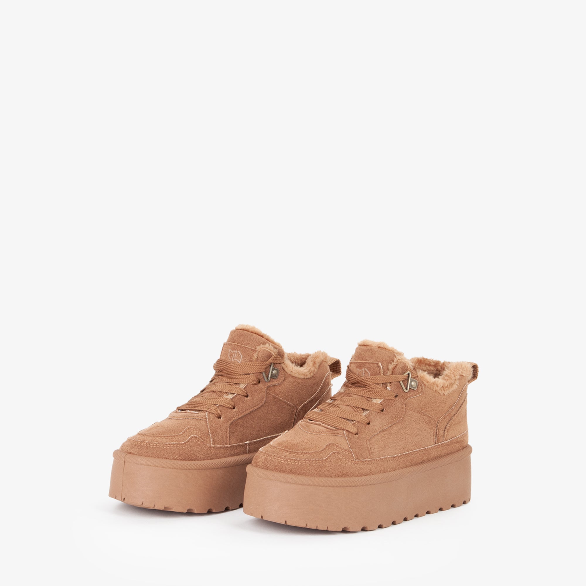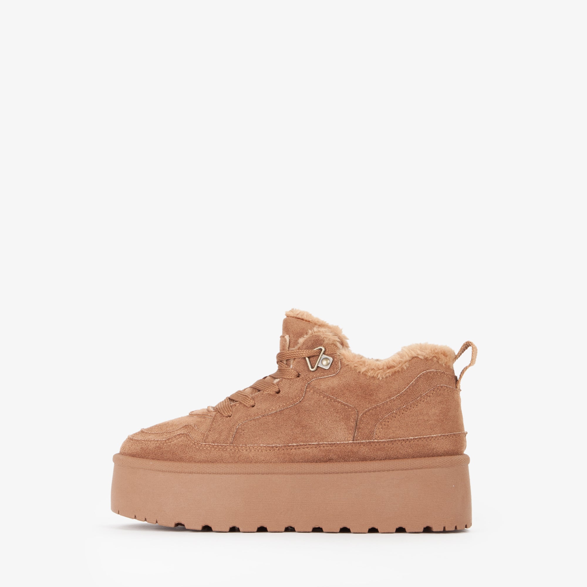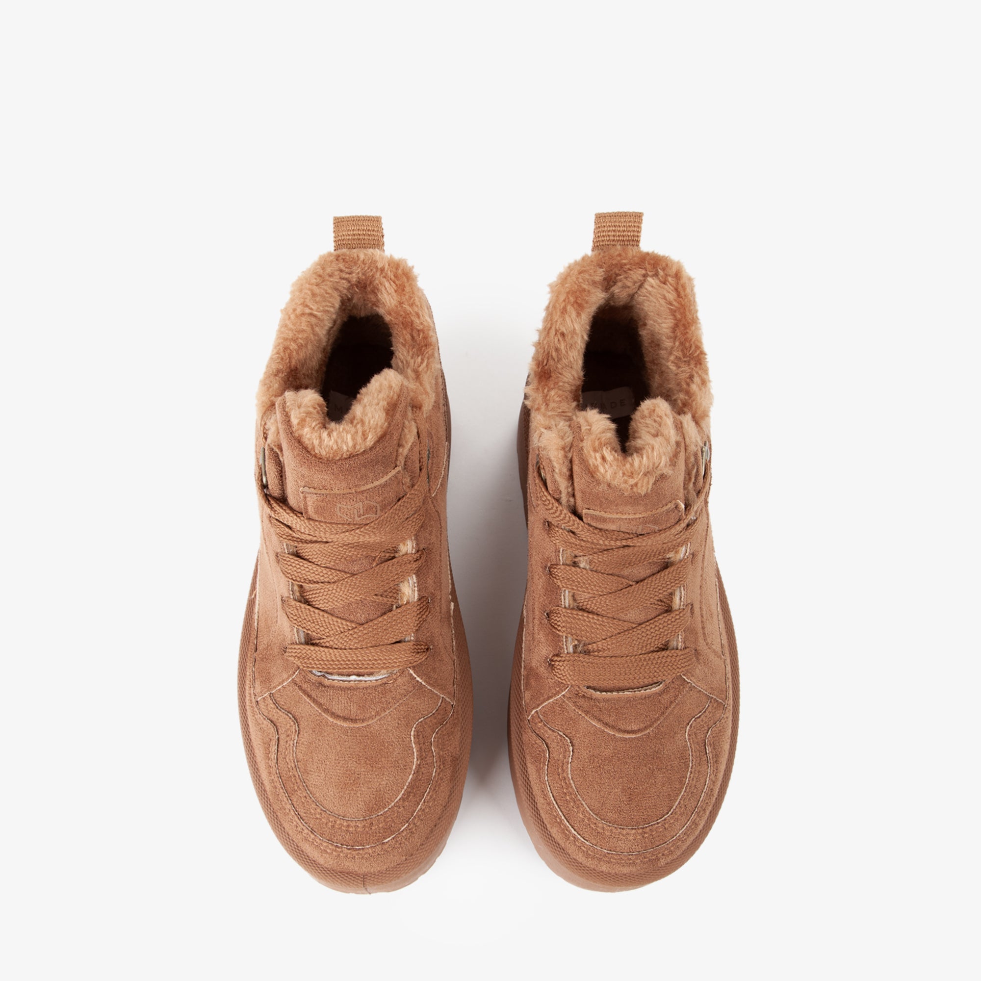 Questa scarpa è un ibrido tra una sneaker e un eskimo, con tomaia in materiale scamosciato color cammello e una fodera in pellicciasintetica che offre calore e comfort. La tomaia presenta un design semplice con lacci e un dettaglio metallico dorato sul lato. Il fondo è alto e in gomma, con una suola spessa che garantisce aderenza e stabilità. Perfetta per un look casual e trendy durante le stagioni più fredde, ideale per il tempo libero o per passeggiate informali.undefined