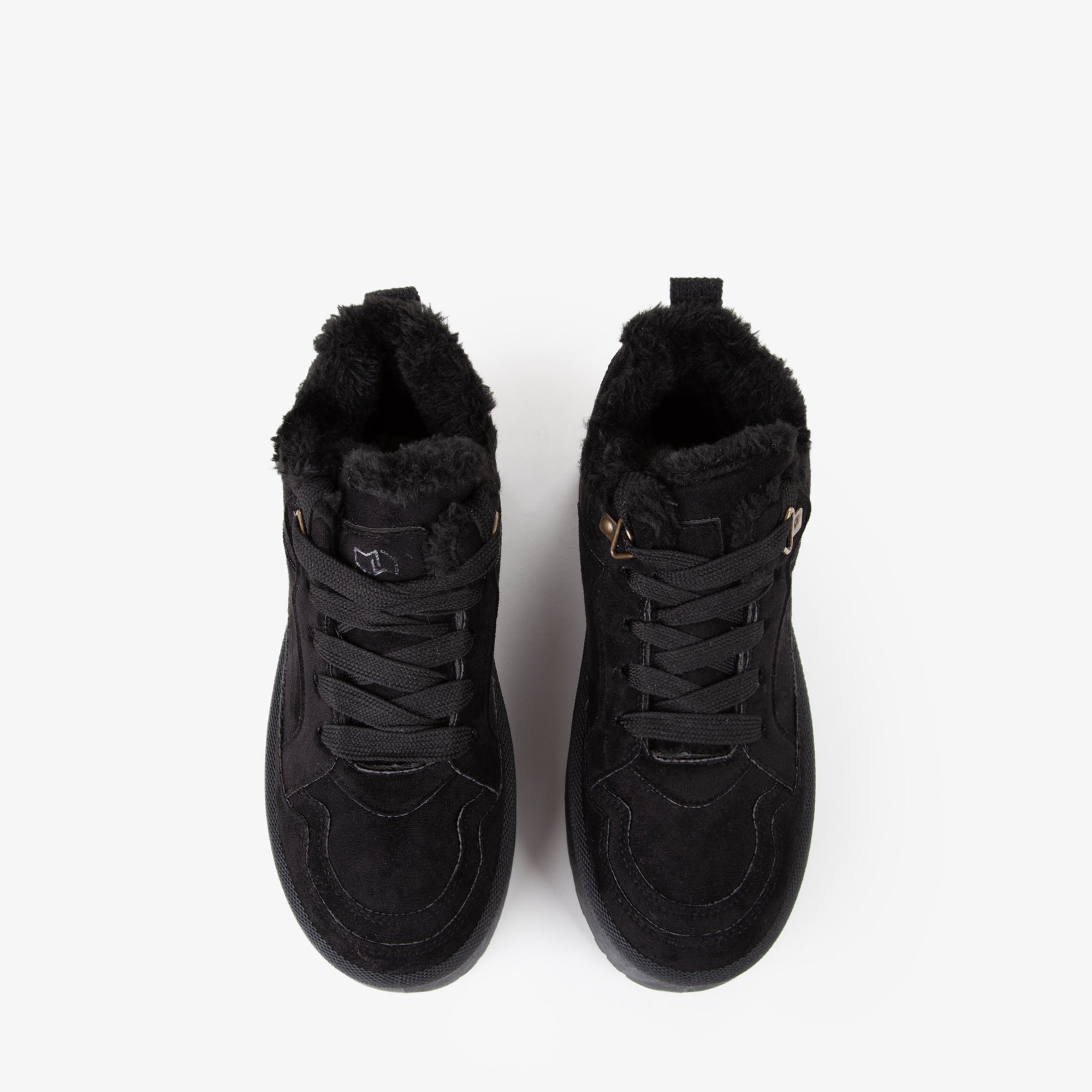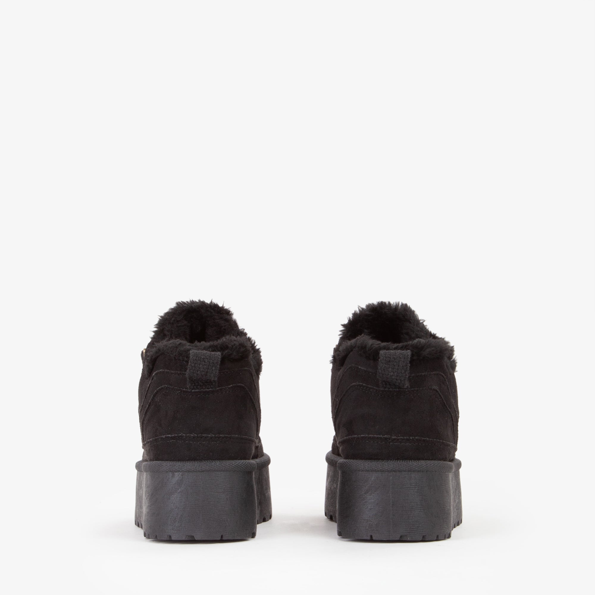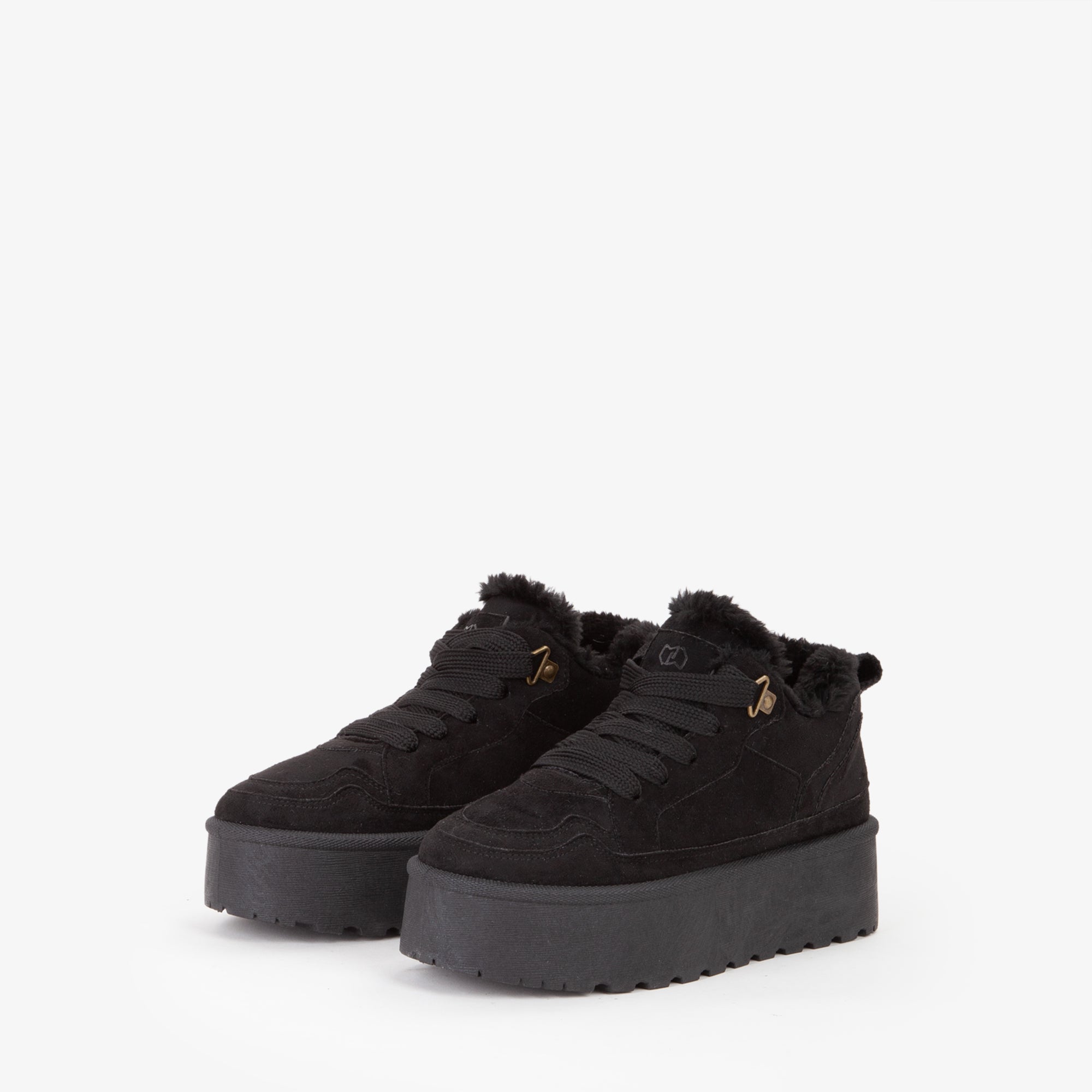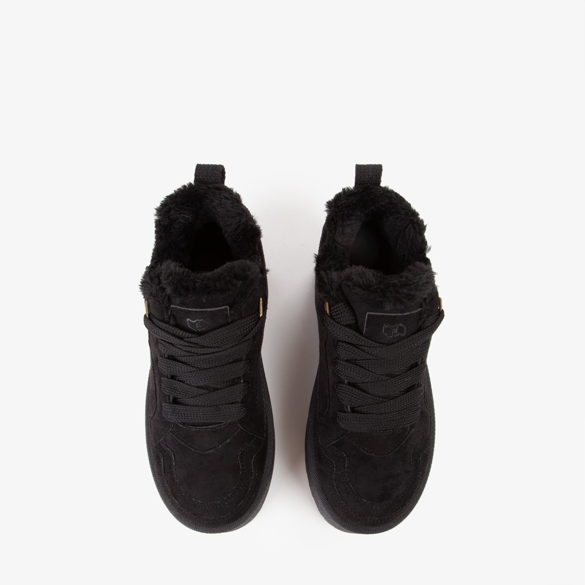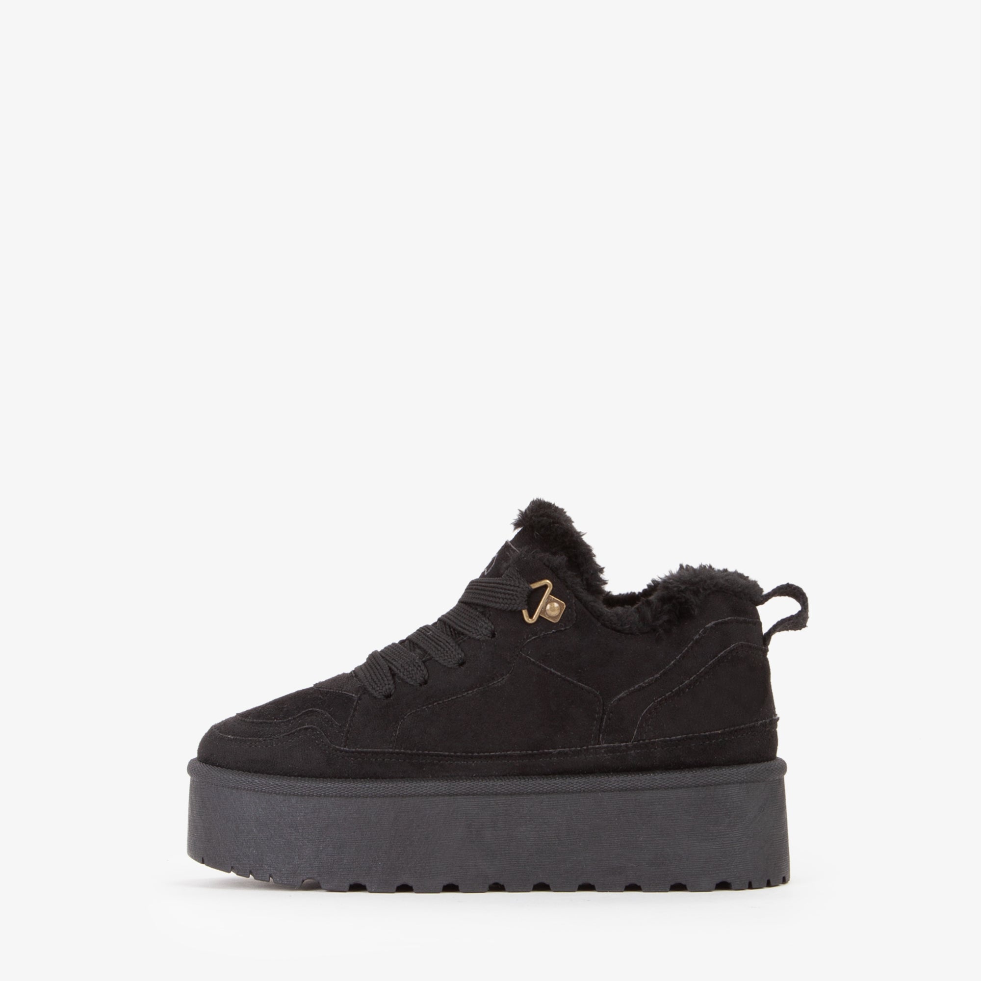 Questa scarpa è un ibrido tra una sneaker e un eskimo, con tomaia in materiale scamosciato color cammello e una fodera in pellicciasintetica che offre calore e comfort. La tomaia presenta un design semplice con lacci e un dettaglio metallico dorato sul lato. Il fondo è alto e in gomma, con una suola spessa che garantisce aderenza e stabilità. Perfetta per un look casual e trendy durante le stagioni più fredde, ideale per il tempo libero o per passeggiate informali.undefined
