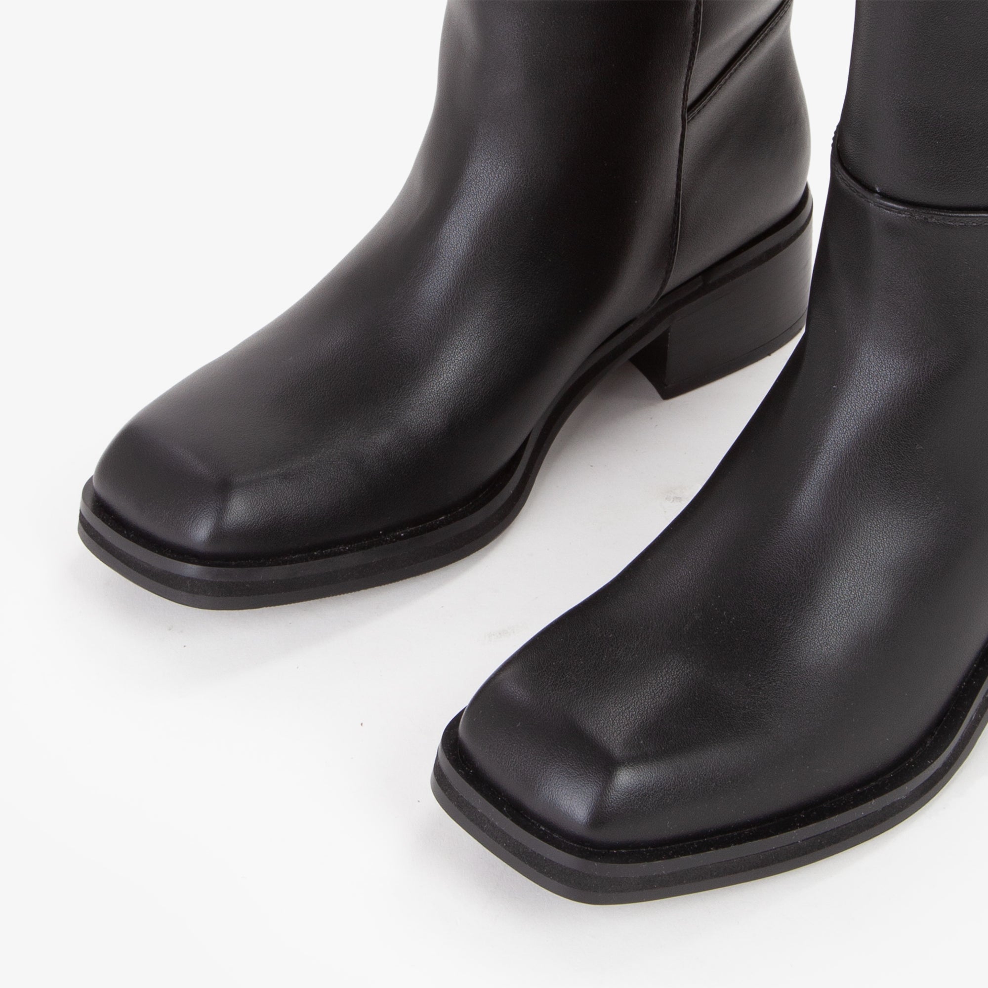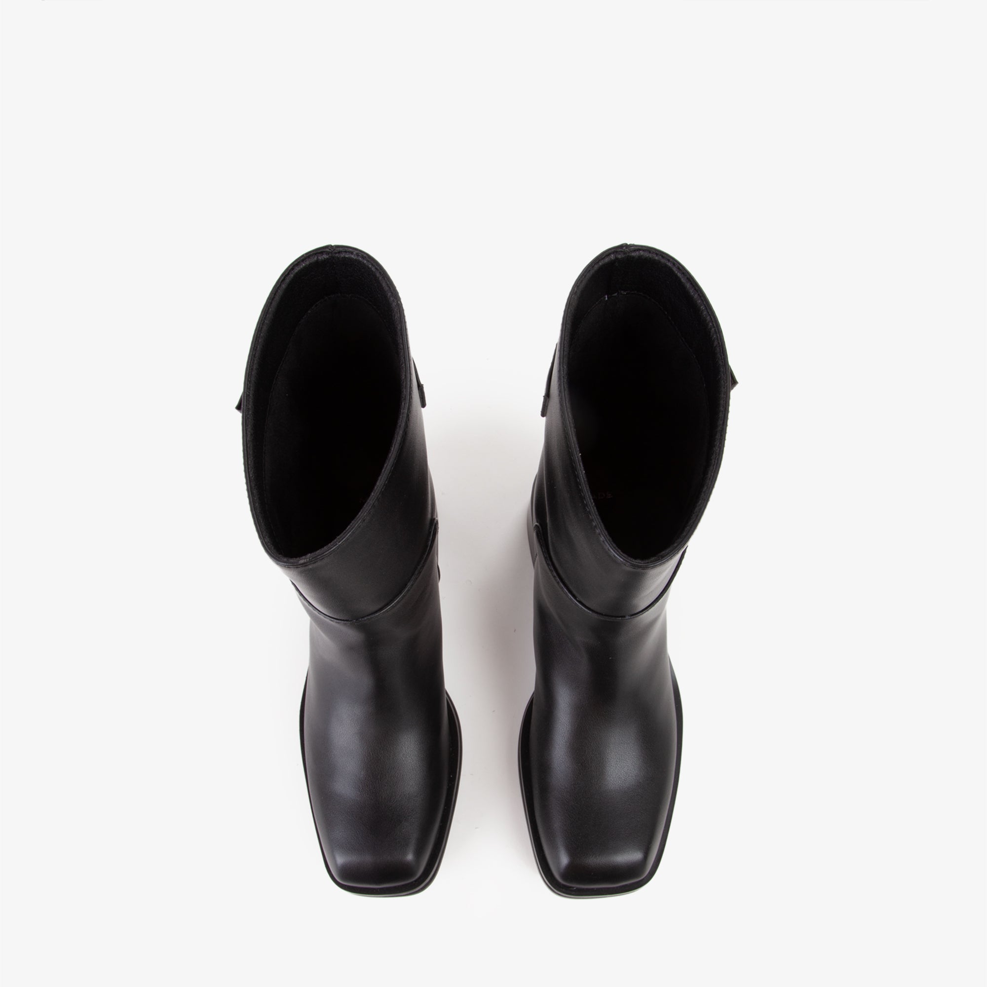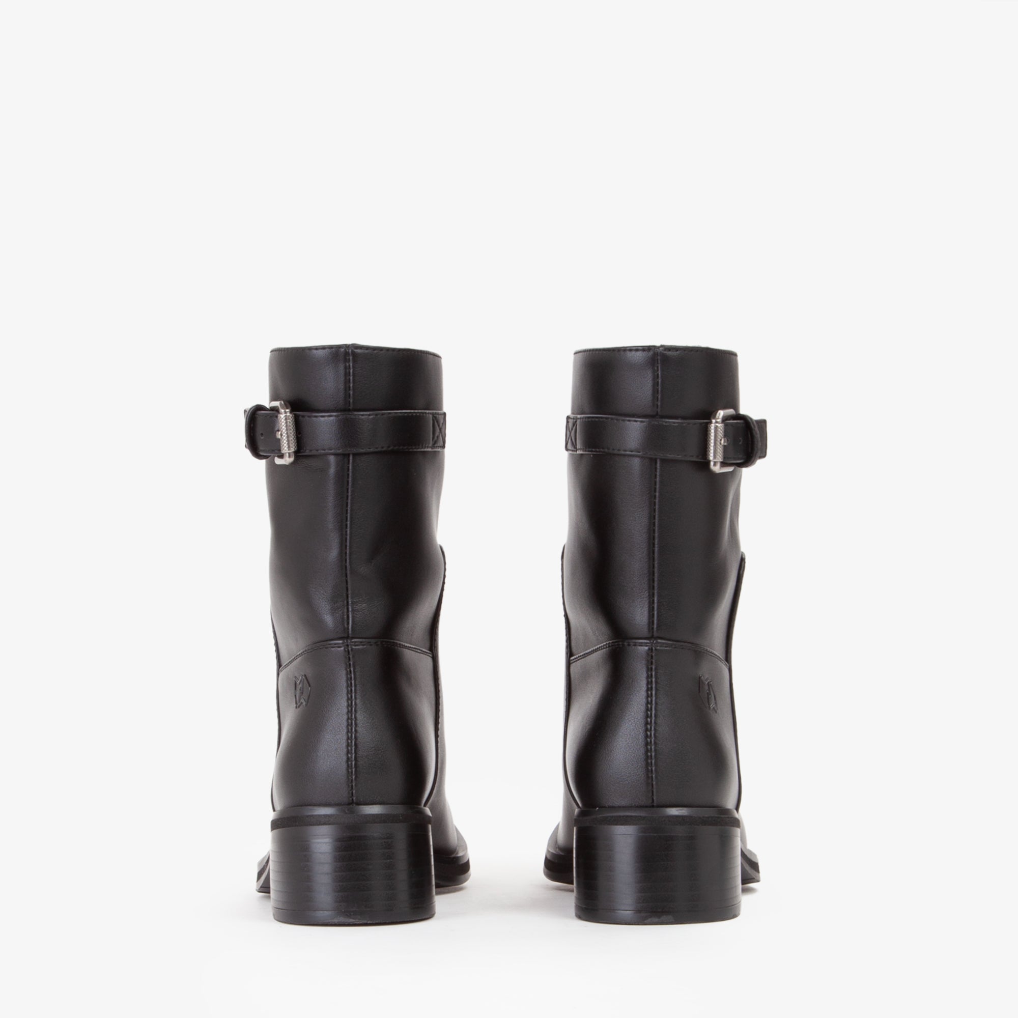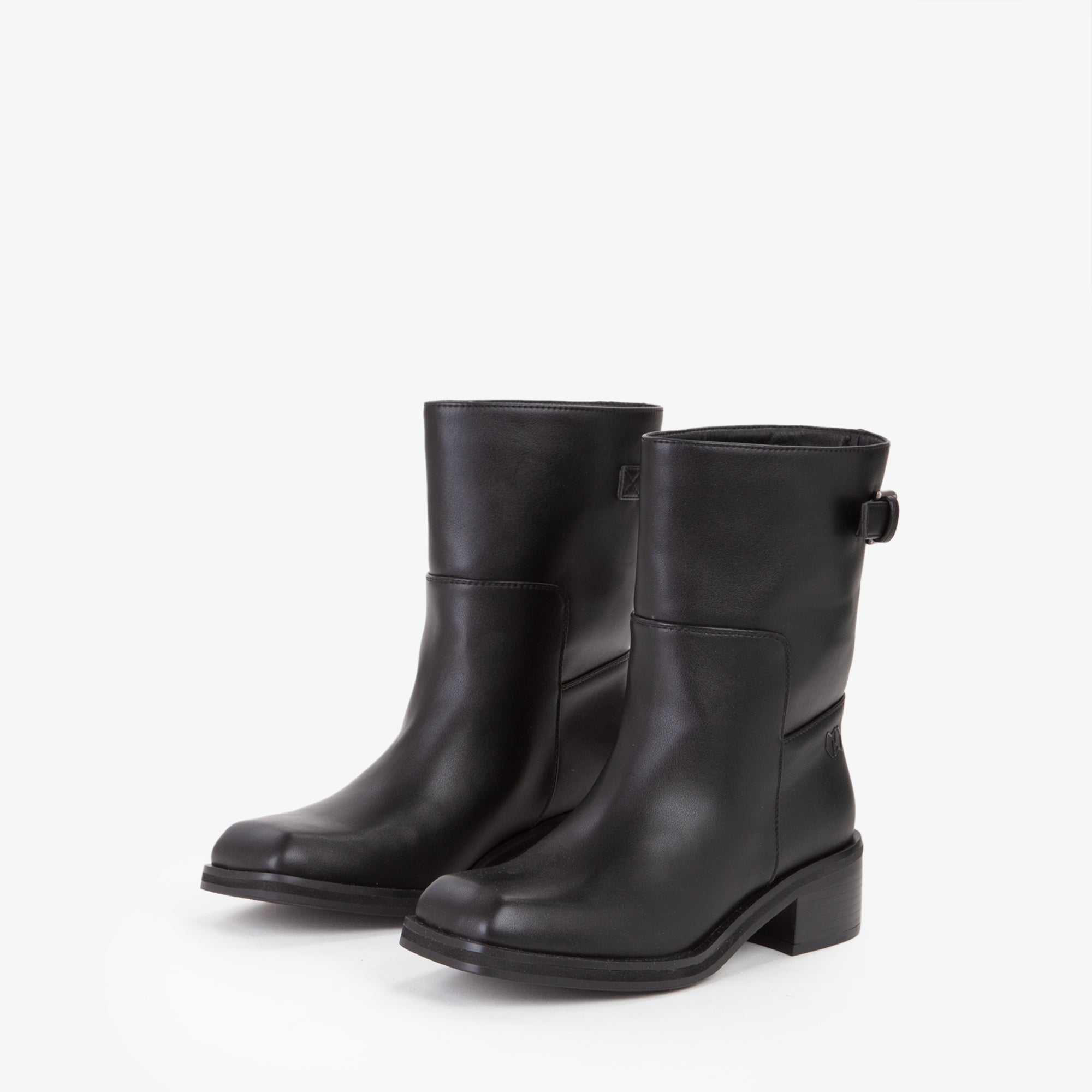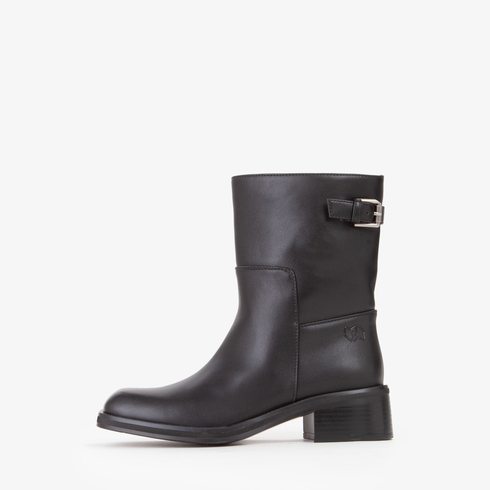 Stivaletto in materiale sintetico, con tomaia liscia e struttura minimalista, impreziosita da una fibbia regolabile sul gambale cheaggiunge un dettaglio funzionale e stilistico. Il tacco basso e squadrato garantisce stabilità e comfort, mentre la suola in gomma assicura durata e aderenza su diverse superfici. Ideale per un look quotidiano versatile, questo modello si abbina perfettamente a outfit casual o smart casual, donando un tocco di eleganza discreta senza rinunciare alla praticità. Perfetto per affrontare con stilele stagioni più fresche.