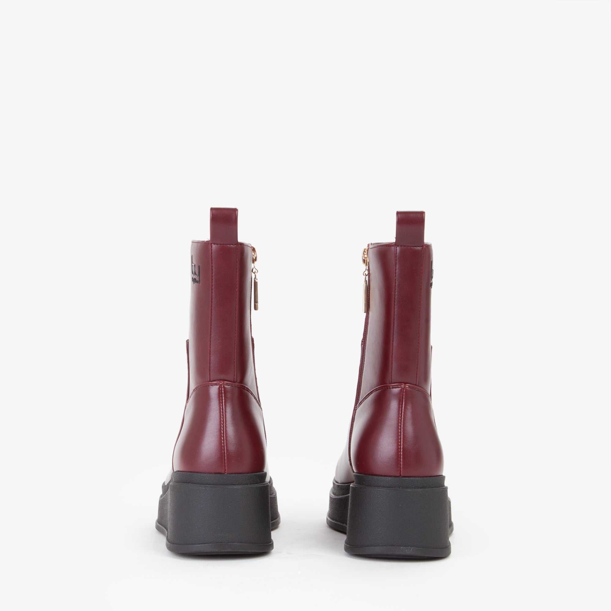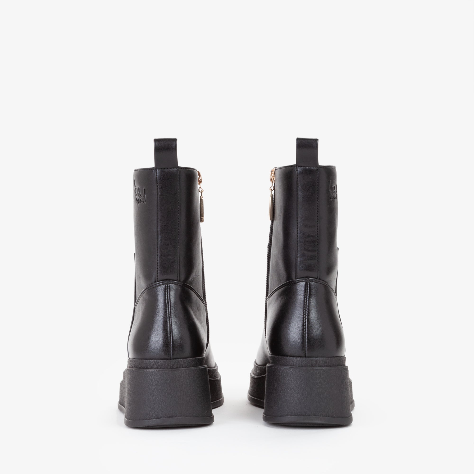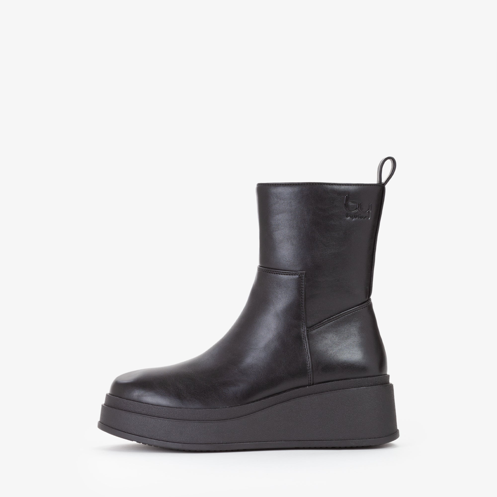 Questo stivaletto presenta una tomaia in materiale sintetico effetto liscio, caratterizzata da linee pulite e una silhouette minimalista. Il logo tono su tono è impresso lateralmente in modo discreto, aggiungendo un dettaglio distintivo senza appesantire il design. La suola è una zeppa in gomma, leggermente rialzata, che offre comfort e una buona stabilità, ideale per un uso prolungato. La chiusura è agevolata dalla presenza di una linguetta posteriore. Perfetto per outfit casual-chic o urbani, si abbina bene a jeans skinny o pantaloni a sigaretta per un look moderno e versatile.