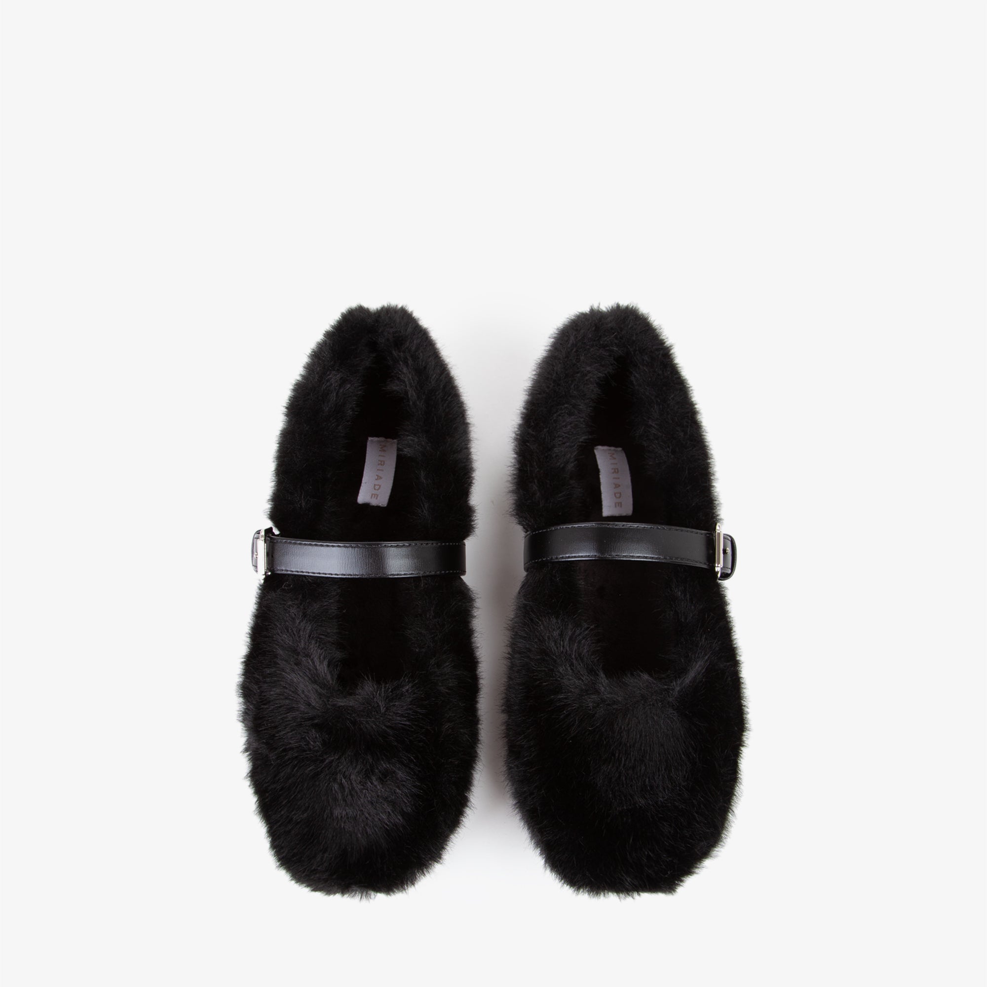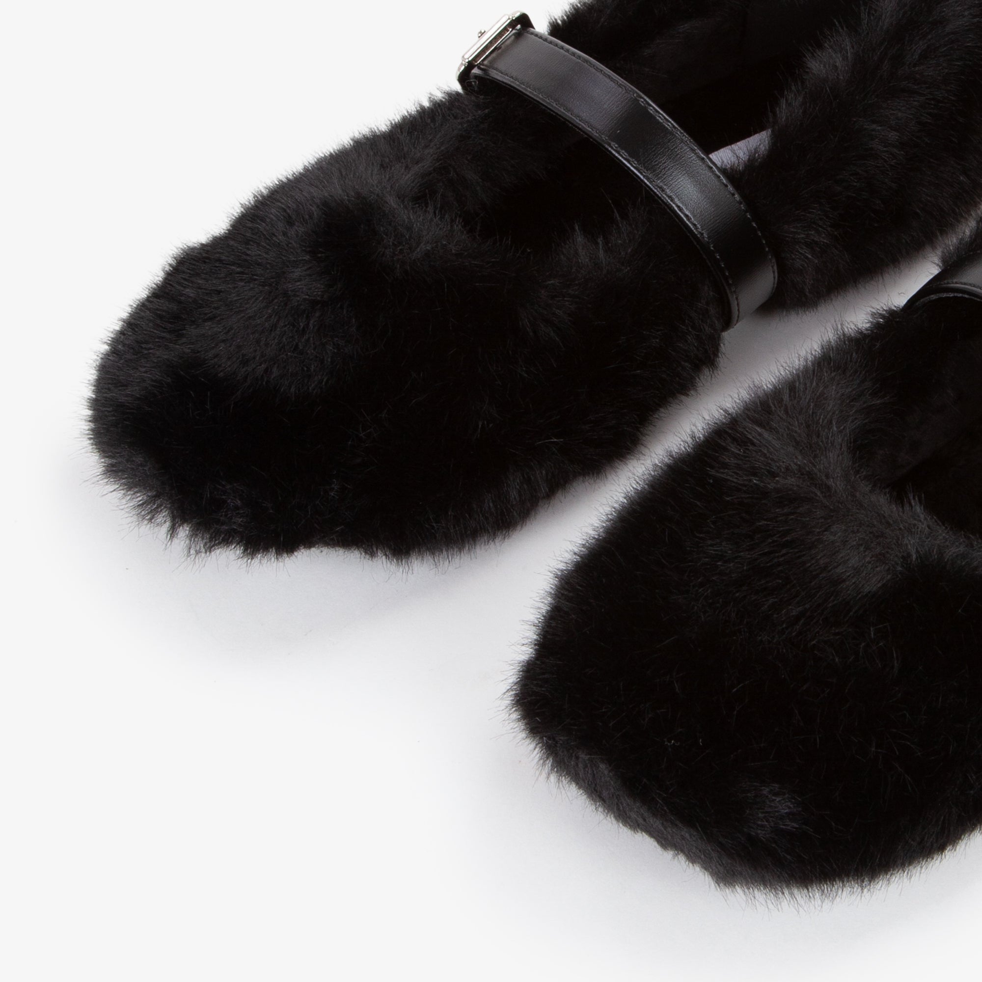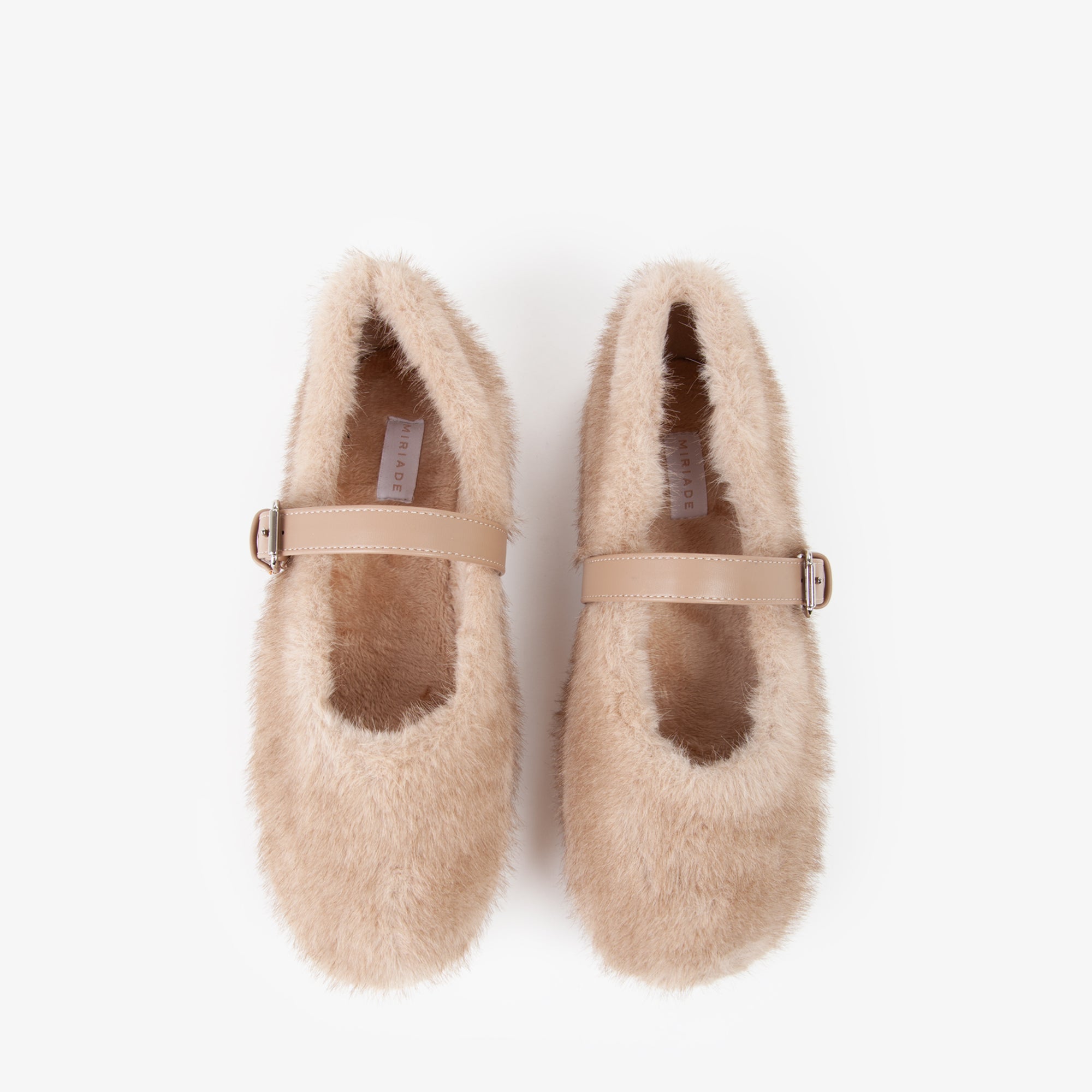 Questa scarpa è una ballerina con tomaia in morbida pelliccia, che offre un comfort avvolgente e piacevole. È caratterizzata da unachiusura con fibbia in metallo dorato che aggiunge un tocco di eleganza. Il fondo è piatto e sottile, garantendo comfort per un utilizzo quotidiano. Questo modello è perfetto per un look casual e informale, ideale per la stagione fredda, perfetto da indossare in casa o per brevi passeggiate all'aperto.
