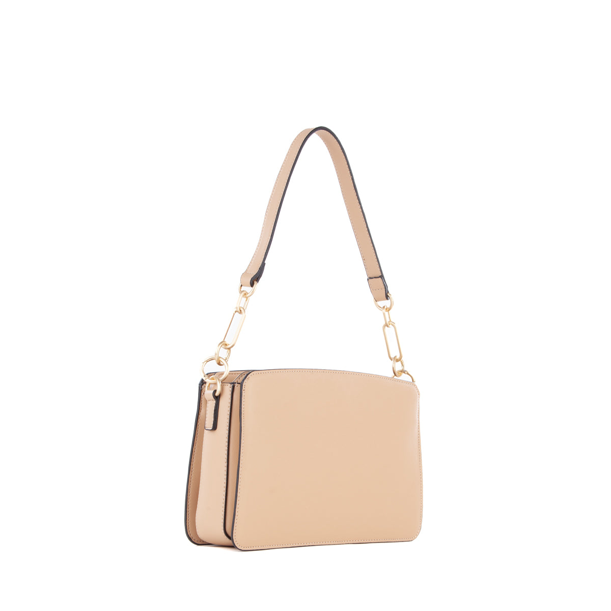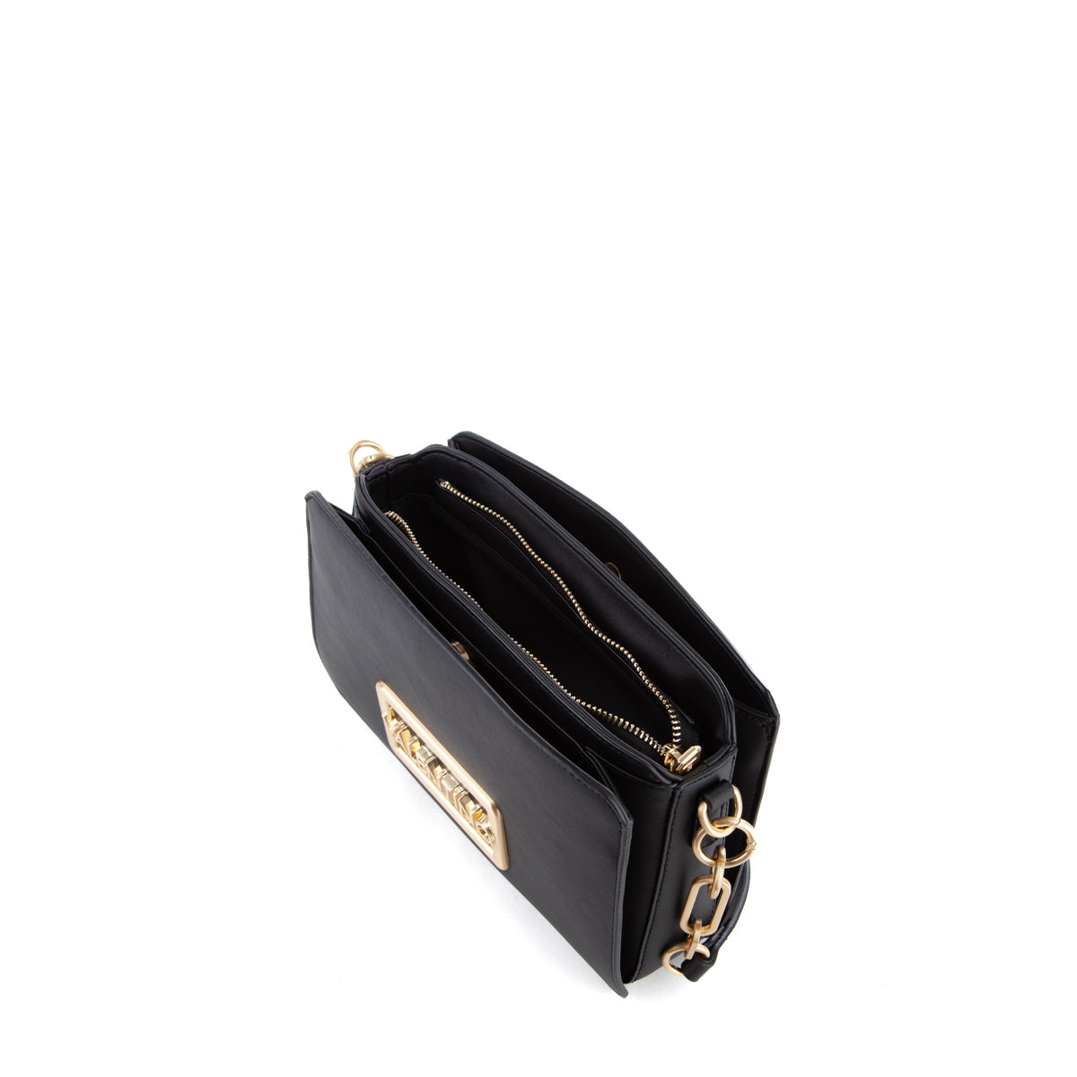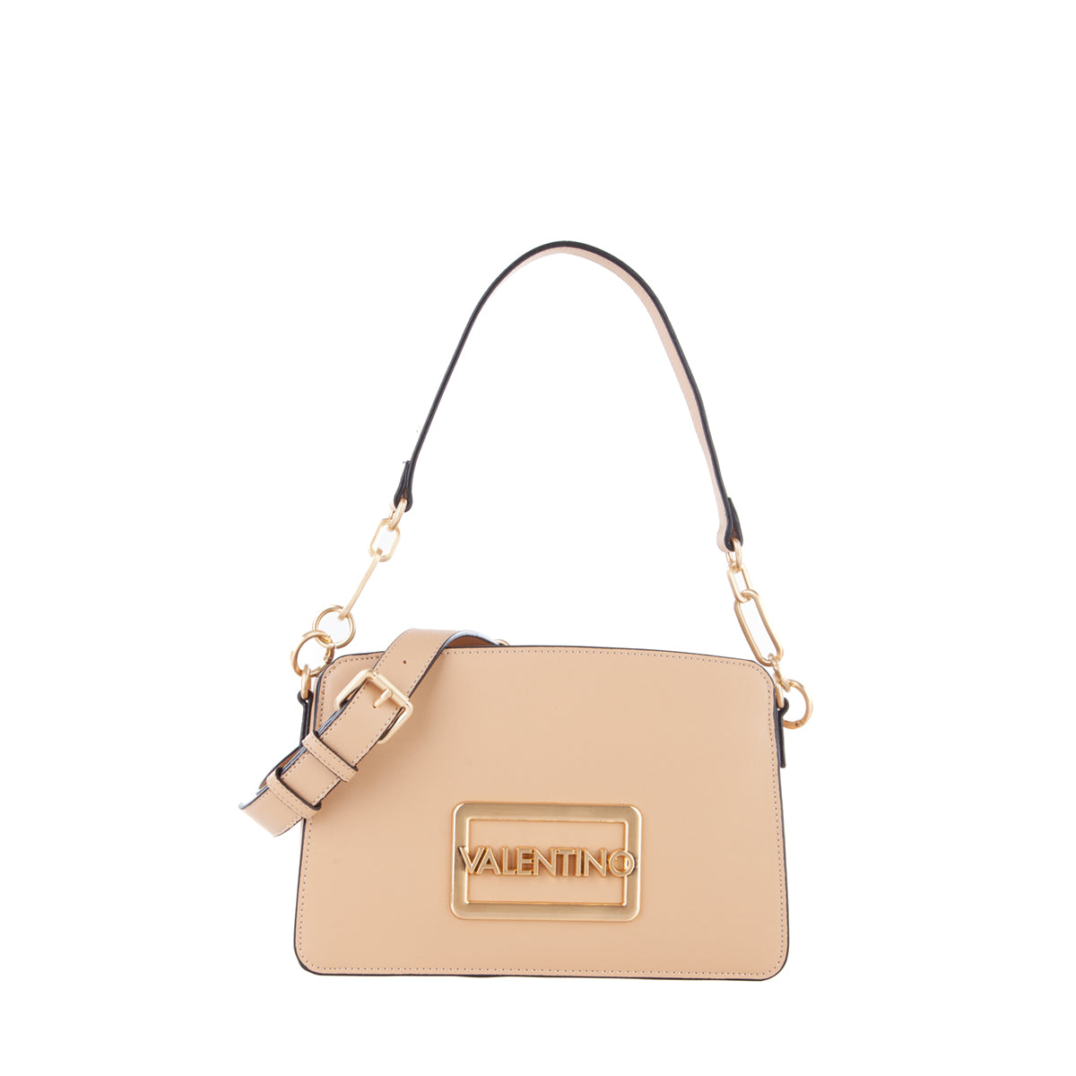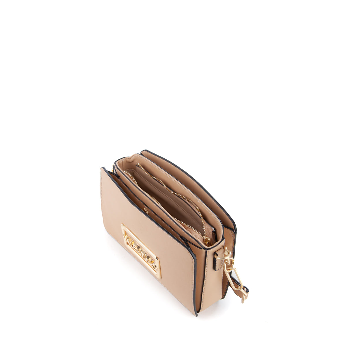 Camera bag in nappa liscia con accessorio logato sul fronte e dettagli metallici in oro satinato. tracolla lunga estraibile