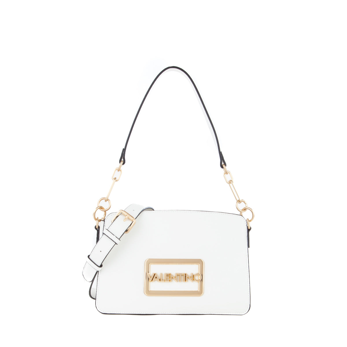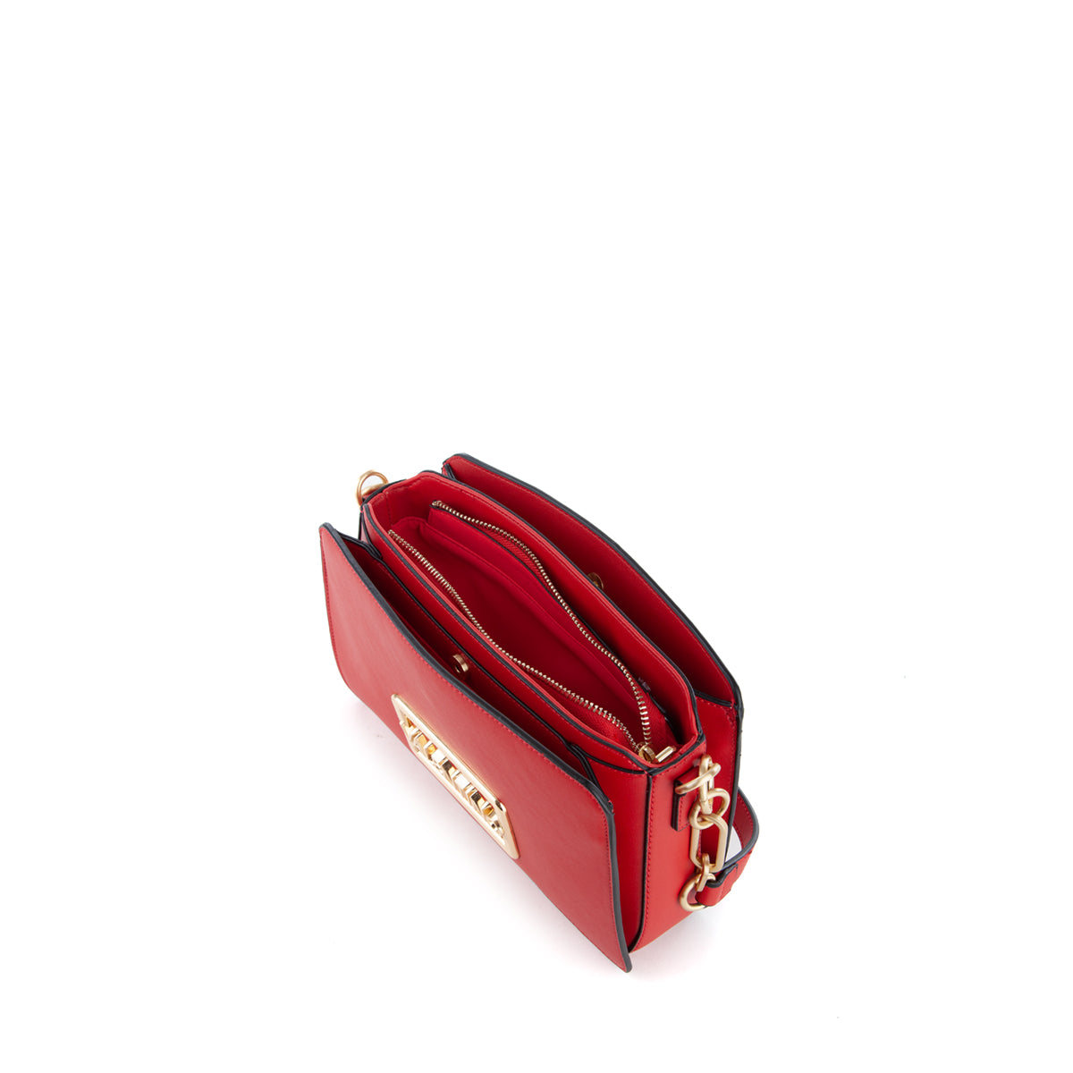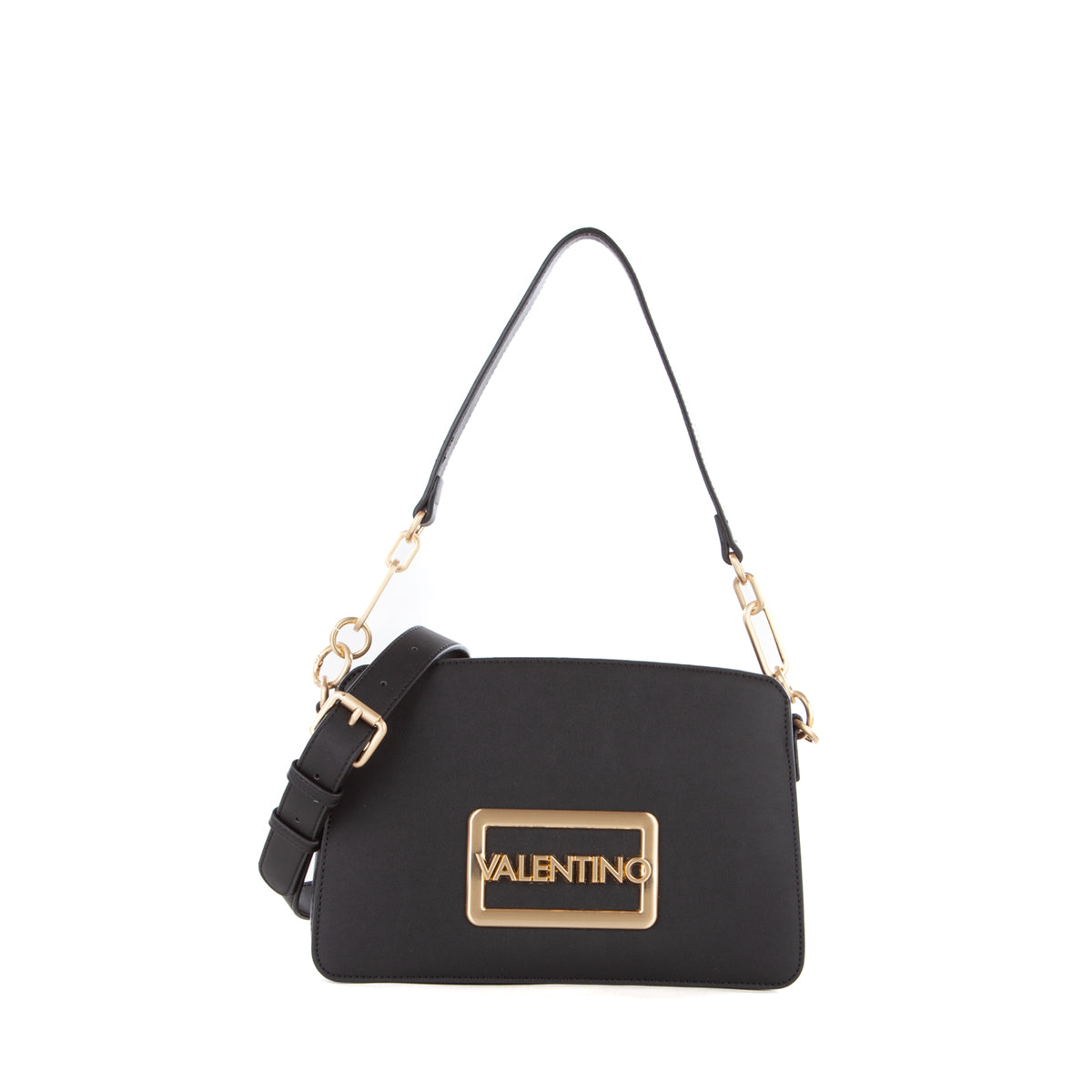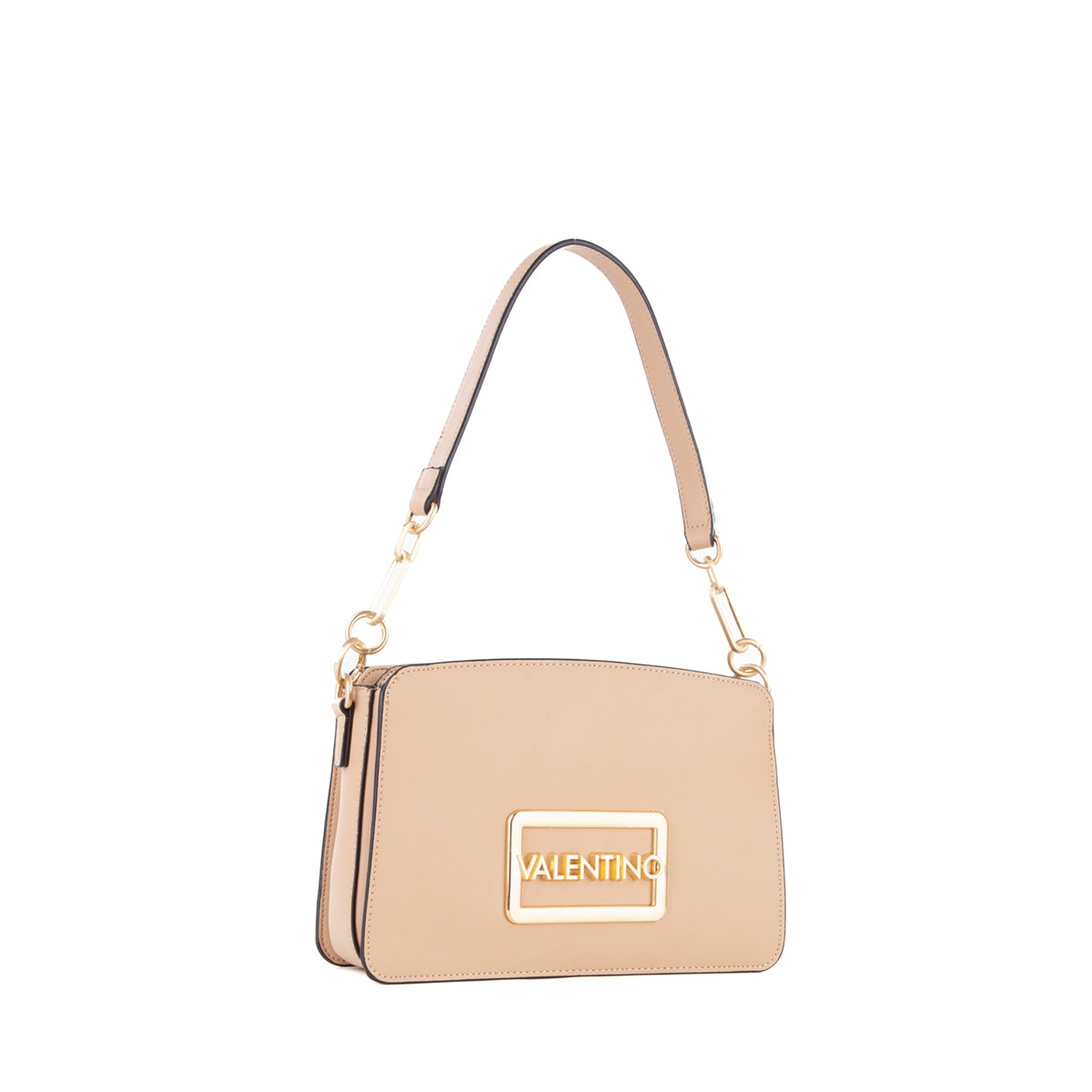 Camera bag in nappa liscia con accessorio logato sul fronte e dettagli metallici in oro satinato. tracolla lunga estraibile