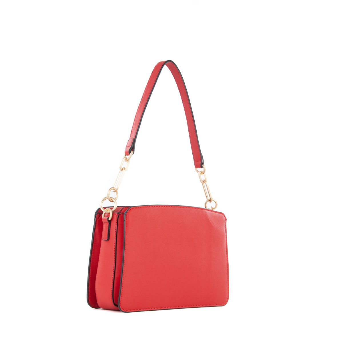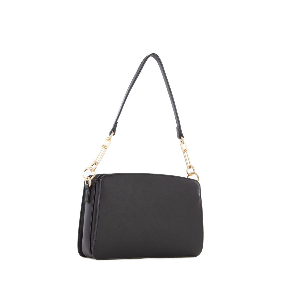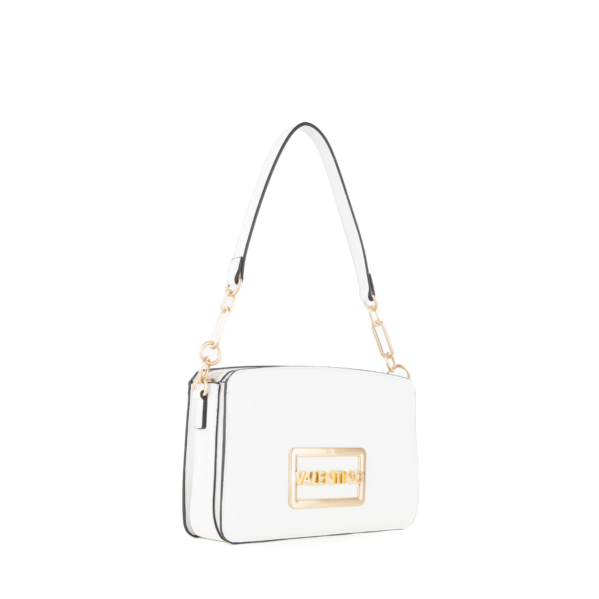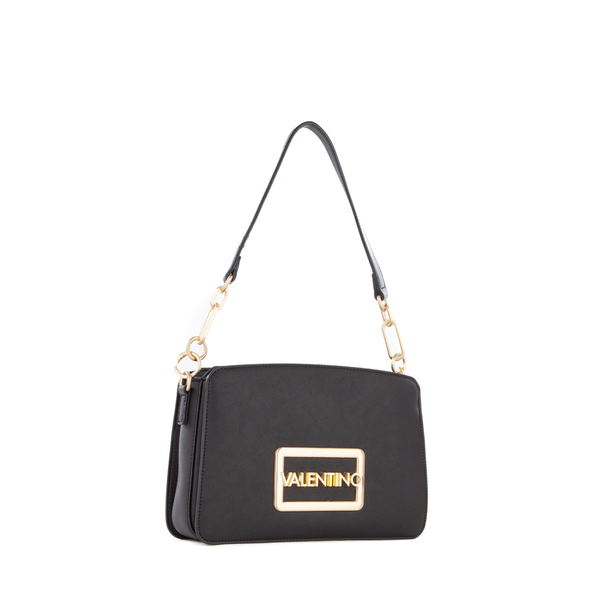 Camera bag in nappa liscia con accessorio logato sul fronte e dettagli metallici in oro satinato. tracolla lunga estraibile