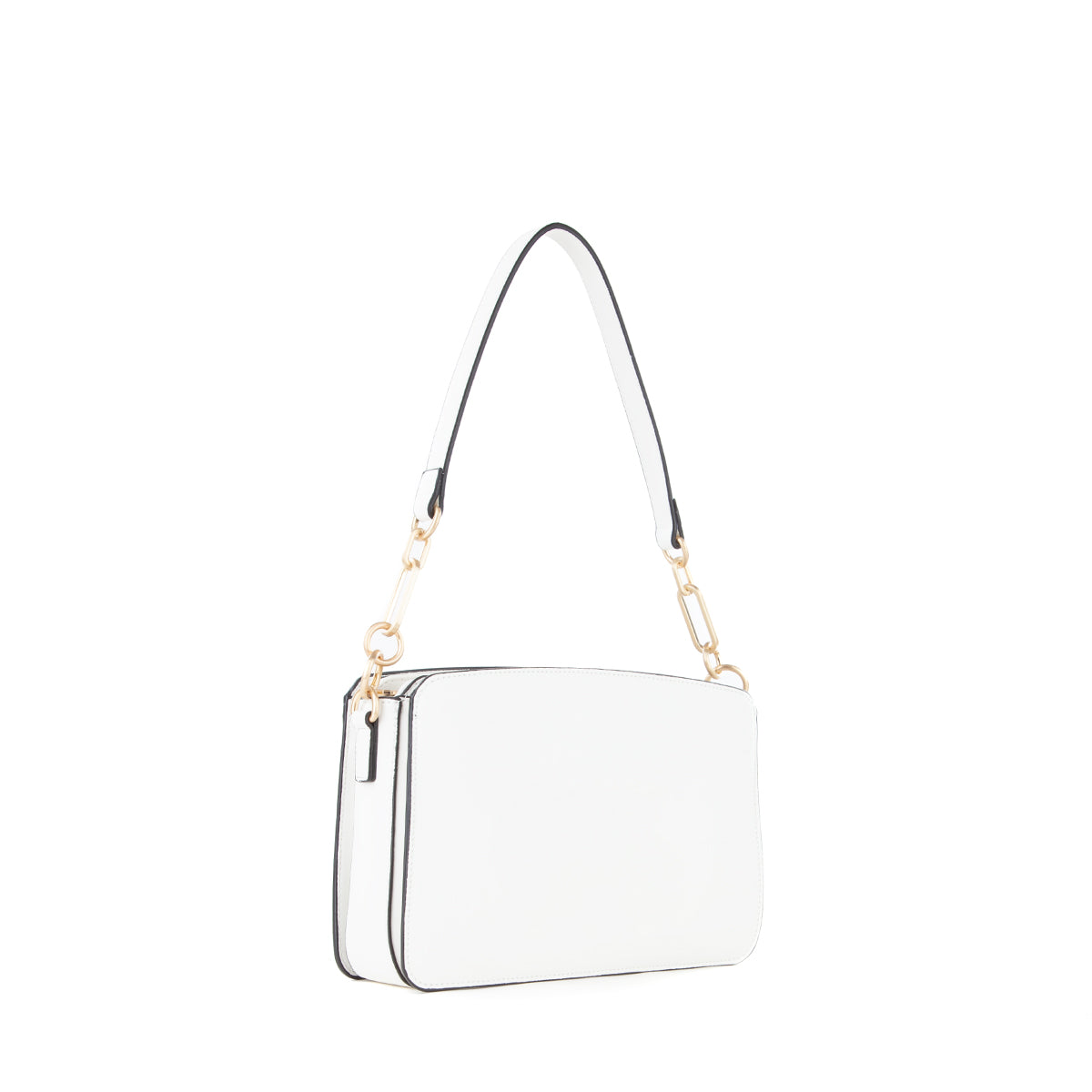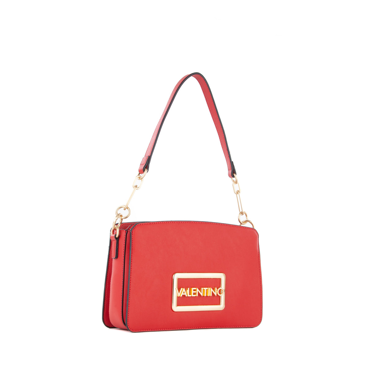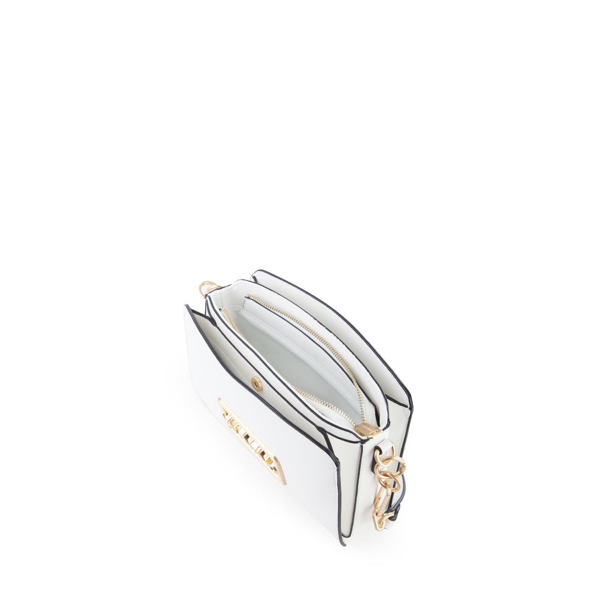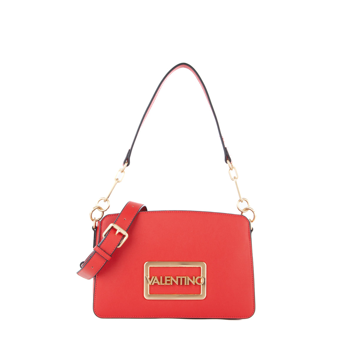 Camera bag in nappa liscia con accessorio logato sul fronte e dettagli metallici in oro satinato. tracolla lunga estraibile