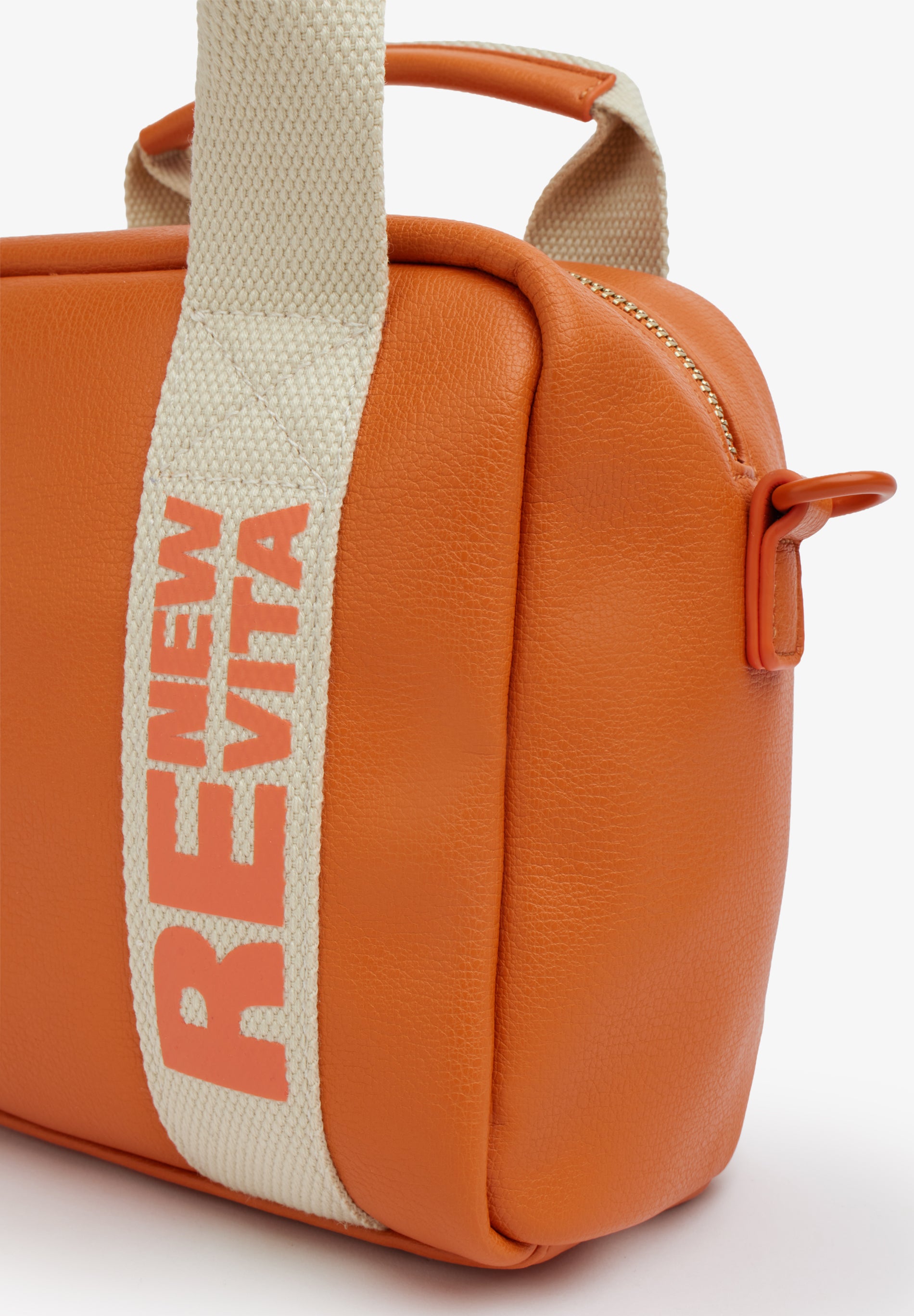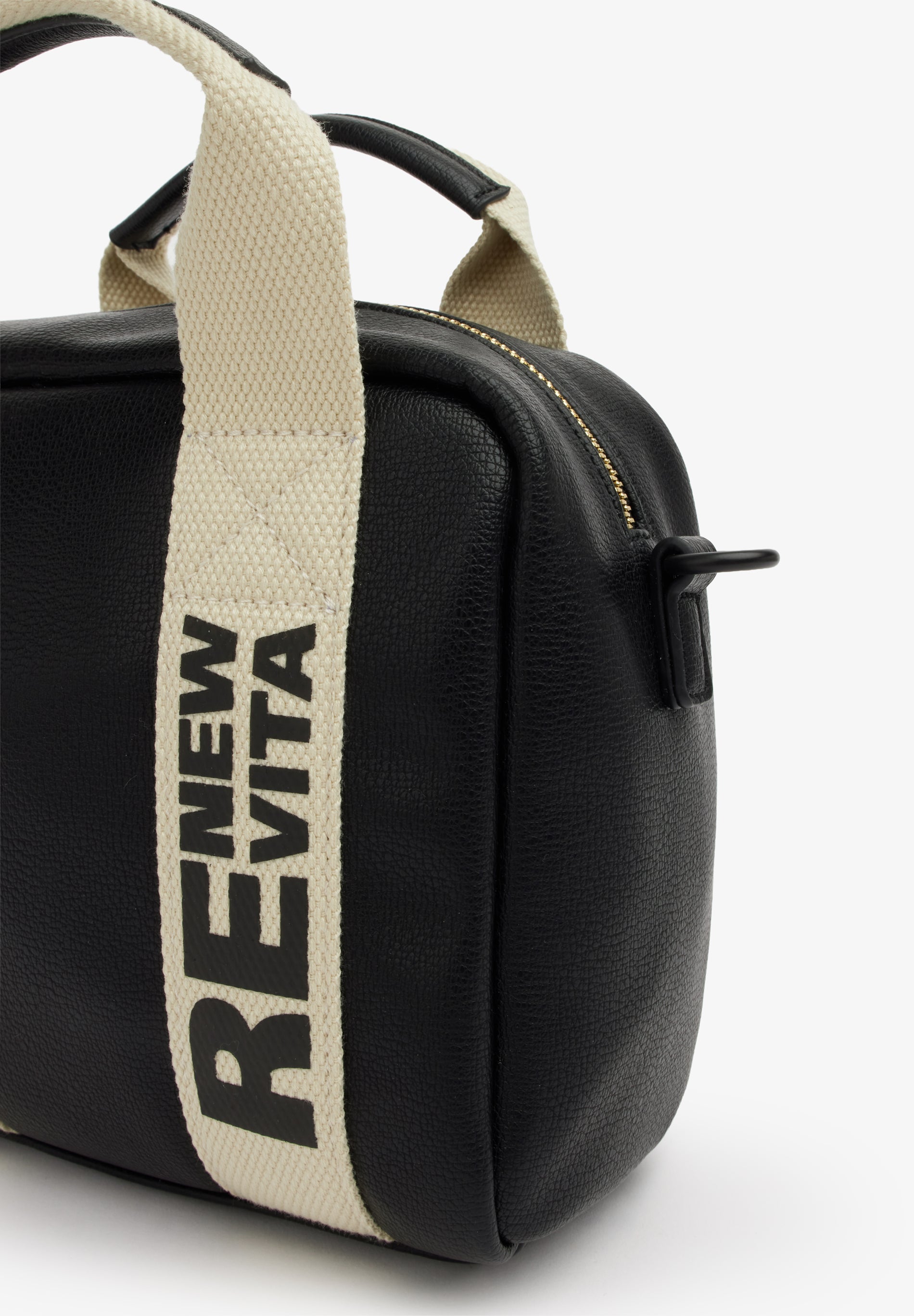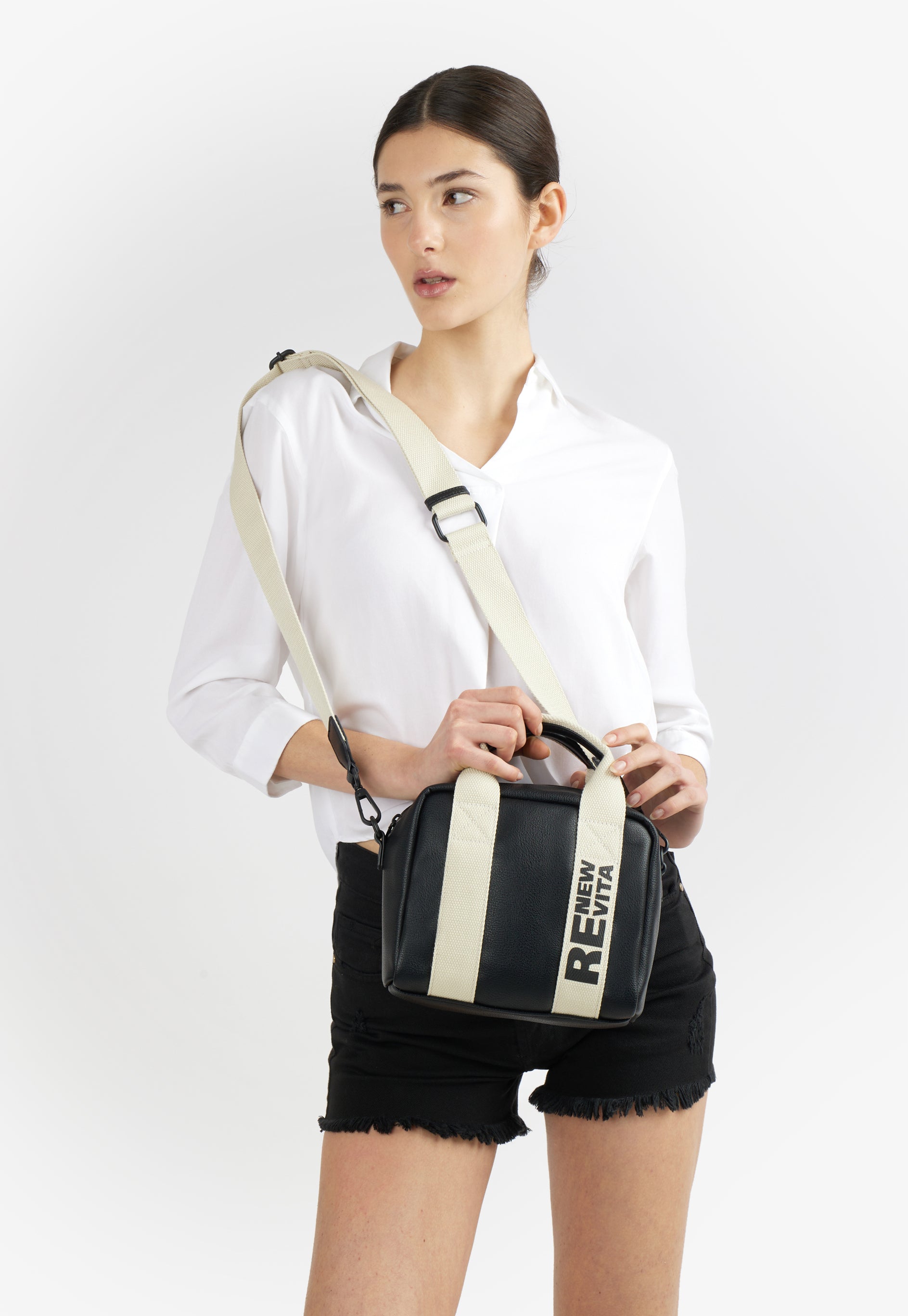 Questo modello gioca sui contrasti per chi non vuole passare inosservato. La morbidezza del materiale incontra la rigidit# tecnica del nastro, creando un accessorio che # pura attitudine urbana. Il nastro in webbing non # solo un supporto, ma l'anima del design, attraversato dalla scritta stampata verticale RE NEW VITA a contrasto.undefined
