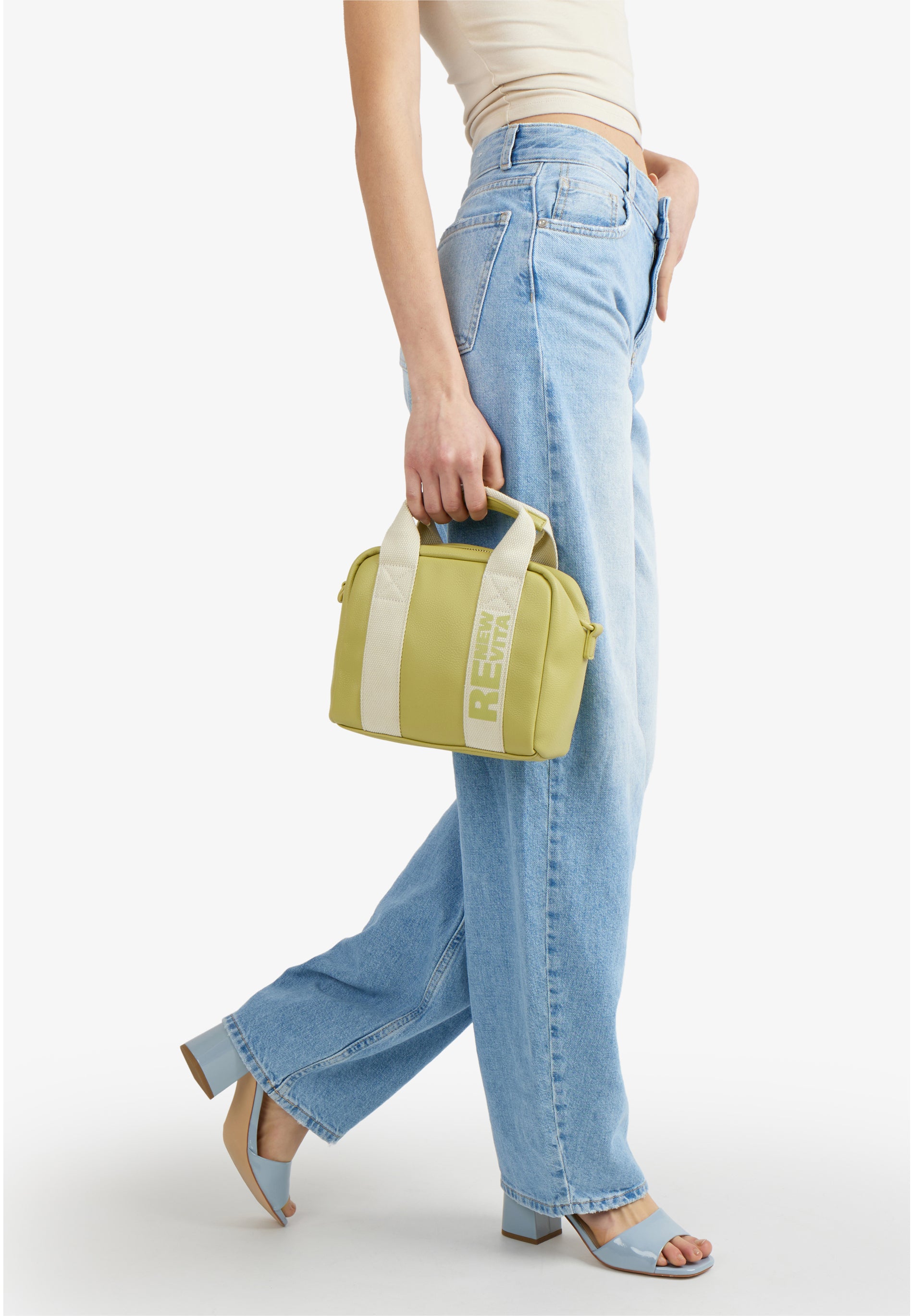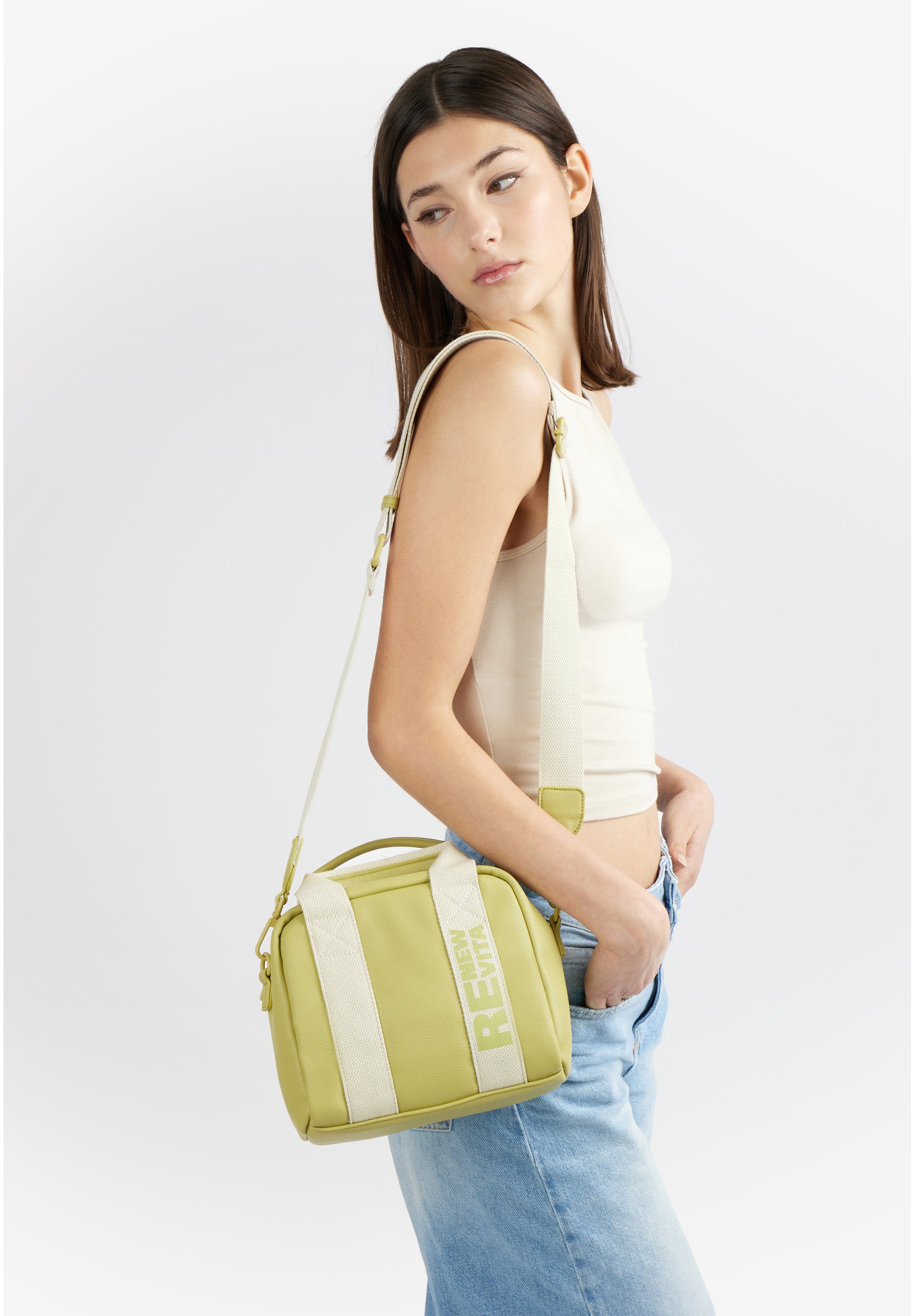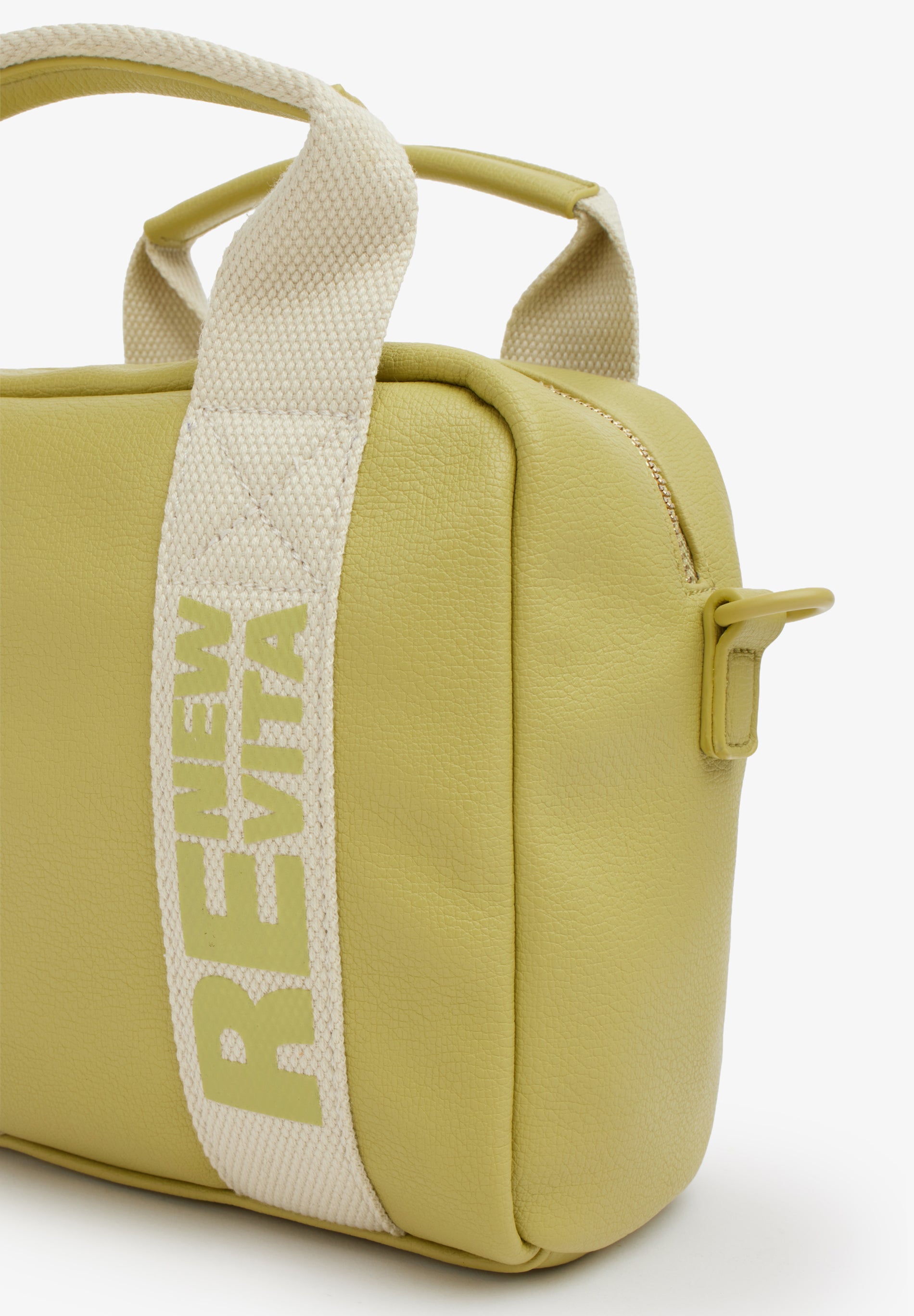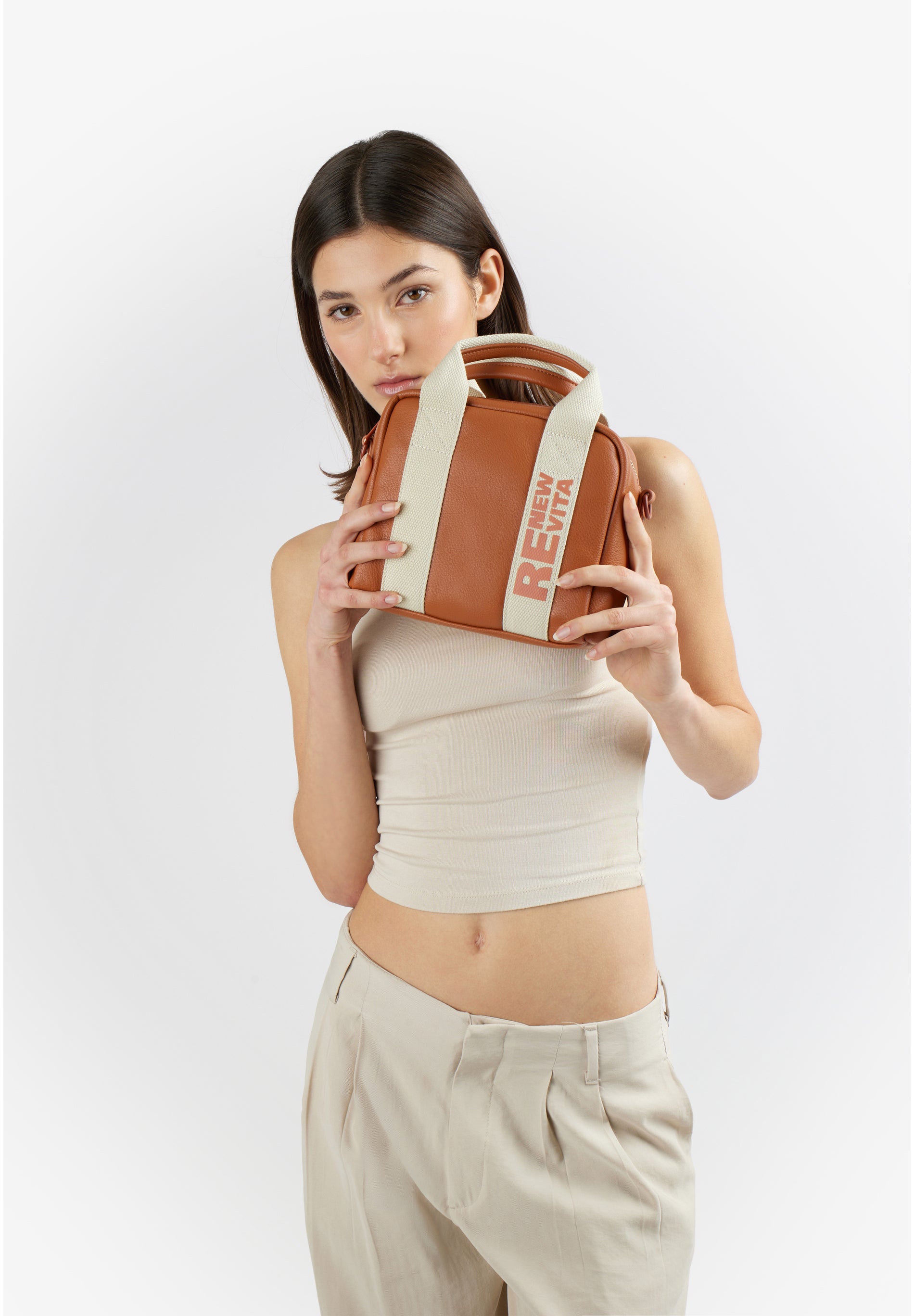 Questo modello gioca sui contrasti per chi non vuole passare inosservato. La morbidezza del materiale incontra la rigidit# tecnica del nastro, creando un accessorio che # pura attitudine urbana. Il nastro in webbing non # solo un supporto, ma l'anima del design, attraversato dalla scritta stampata verticale RE NEW VITA a contrasto.undefined