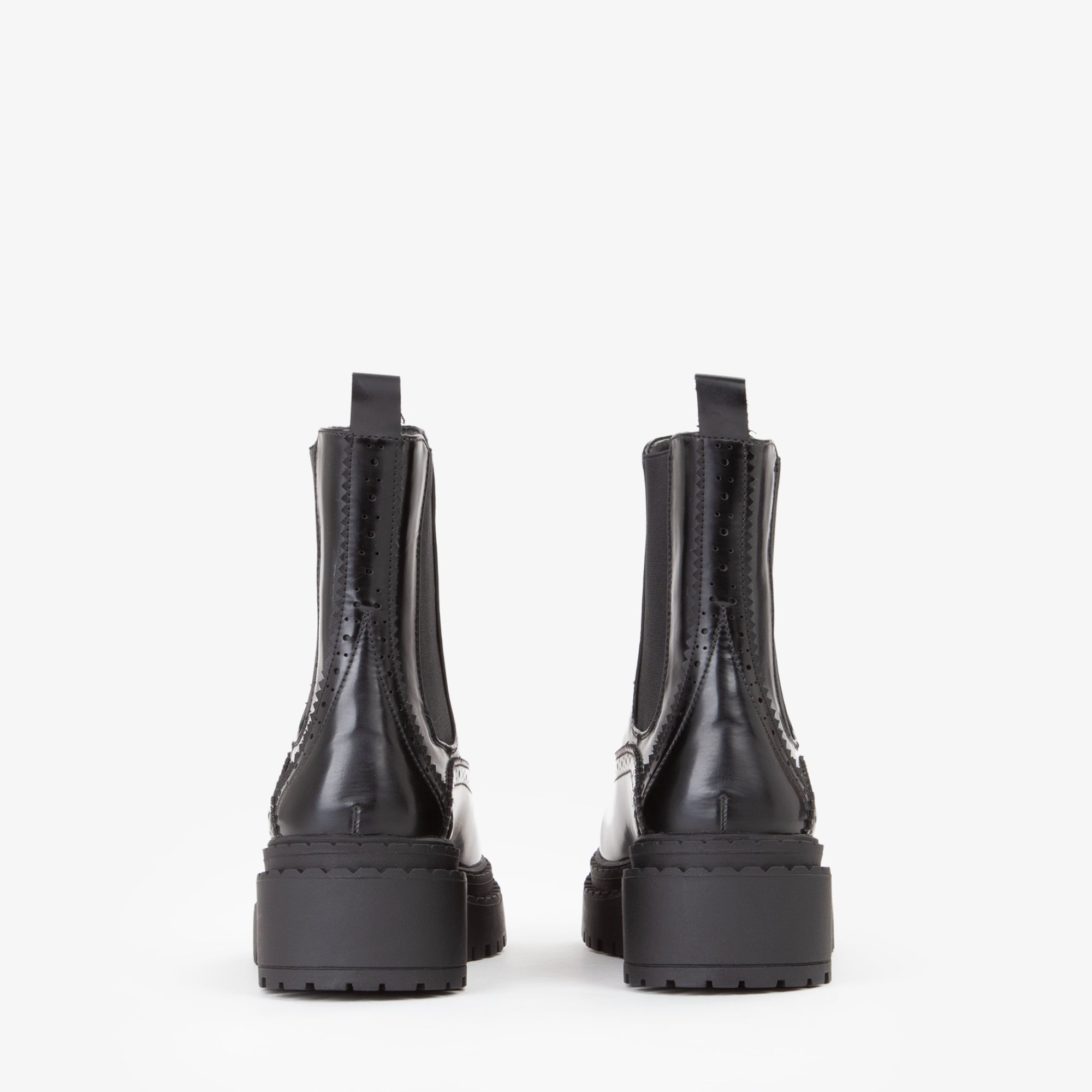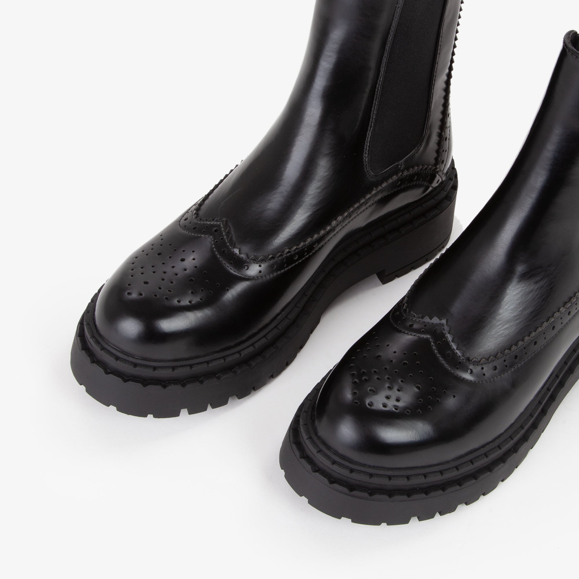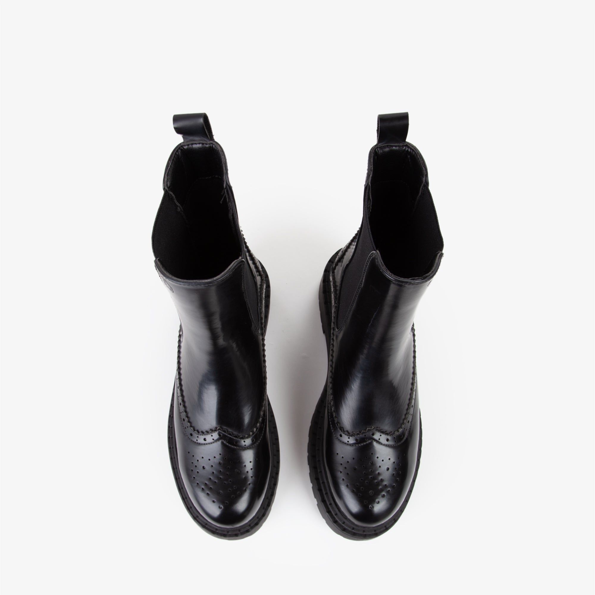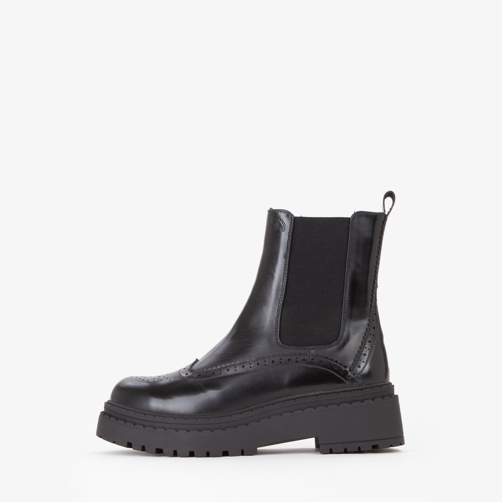 Stivaletto Chelsea in materiale sintetico lucido con dettagli di lavorazione traforata lungo la tomaia, che richiama la tradizionaledecorazione tipica delle calzature classiche. La presenza dellelastico laterale garantisce una calzata agevole e confortevole, mentre la suola carrarmato in gomma offre resistenza e aderenza ottimale. Il profilo robusto si abbina perfettamente a outfit casual-chic o urban, ideale per look diurni e serali in stagione fredda. Un modello versatile che unisce tradizione e modernità in chiave pratica ed elegante.