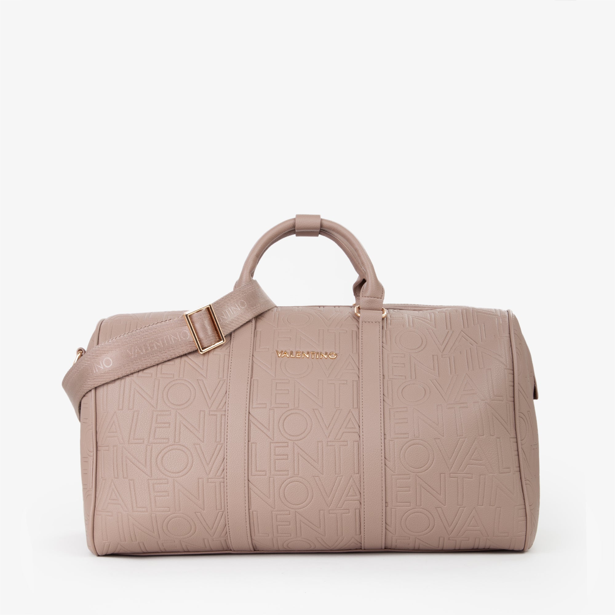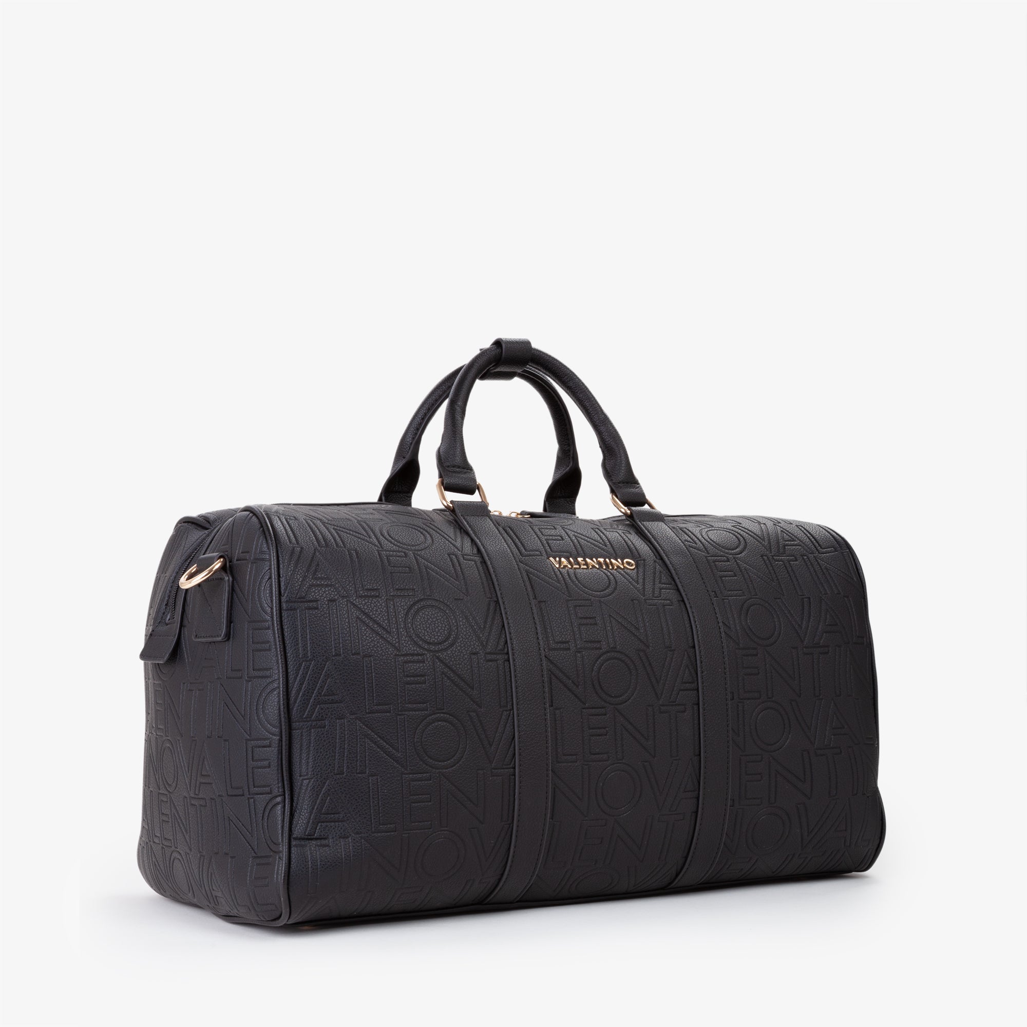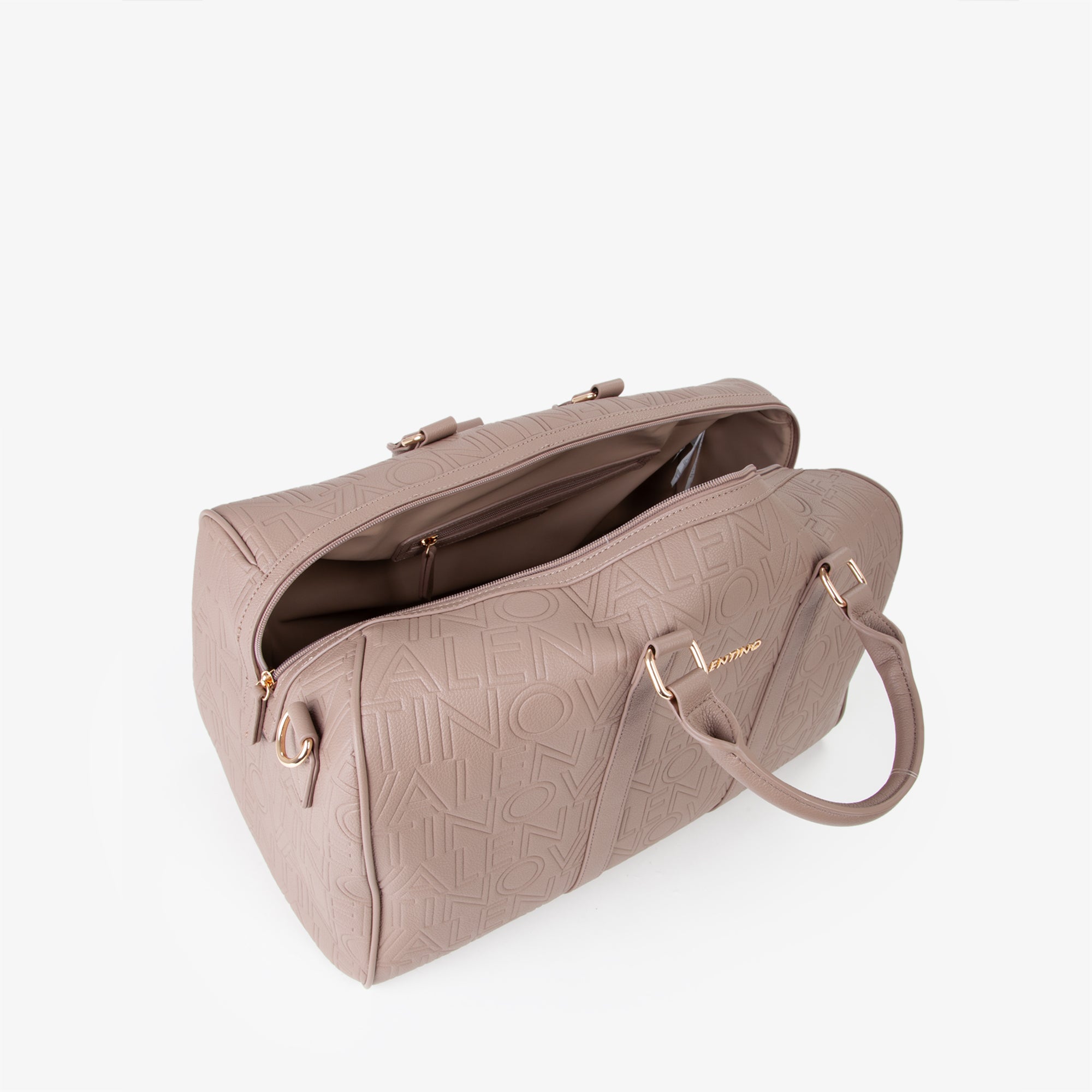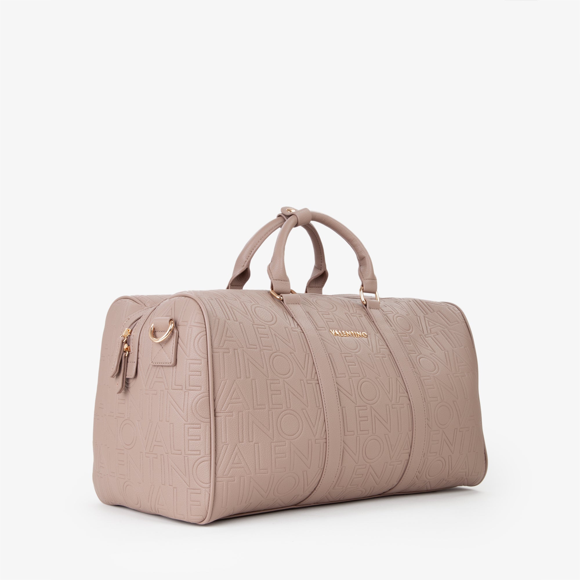 borsone viaggio con doppia tracolla , in nastro e in nappa , dalla forma squadrata e iconico logato su tutta la borsa