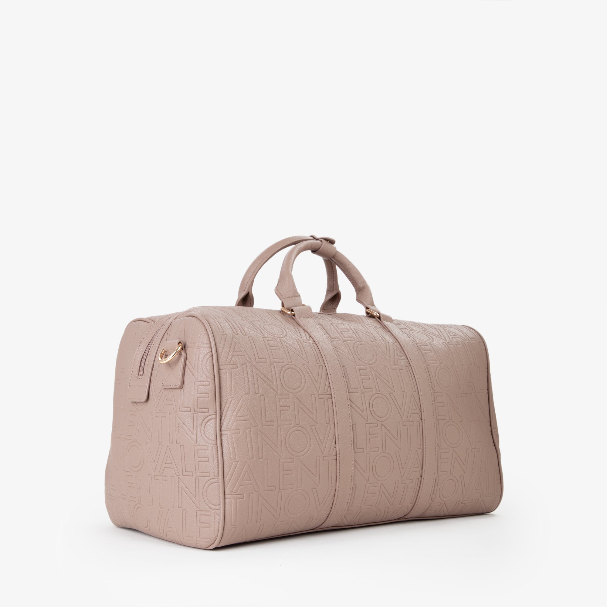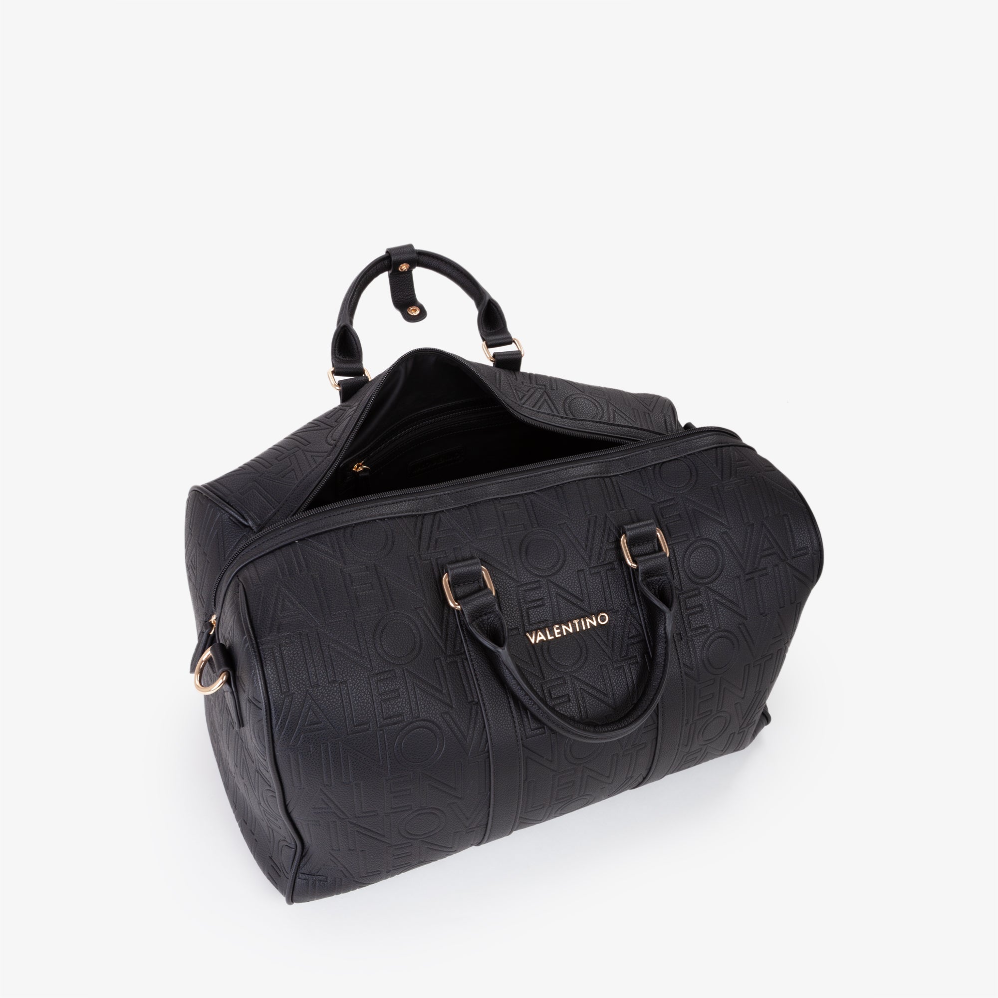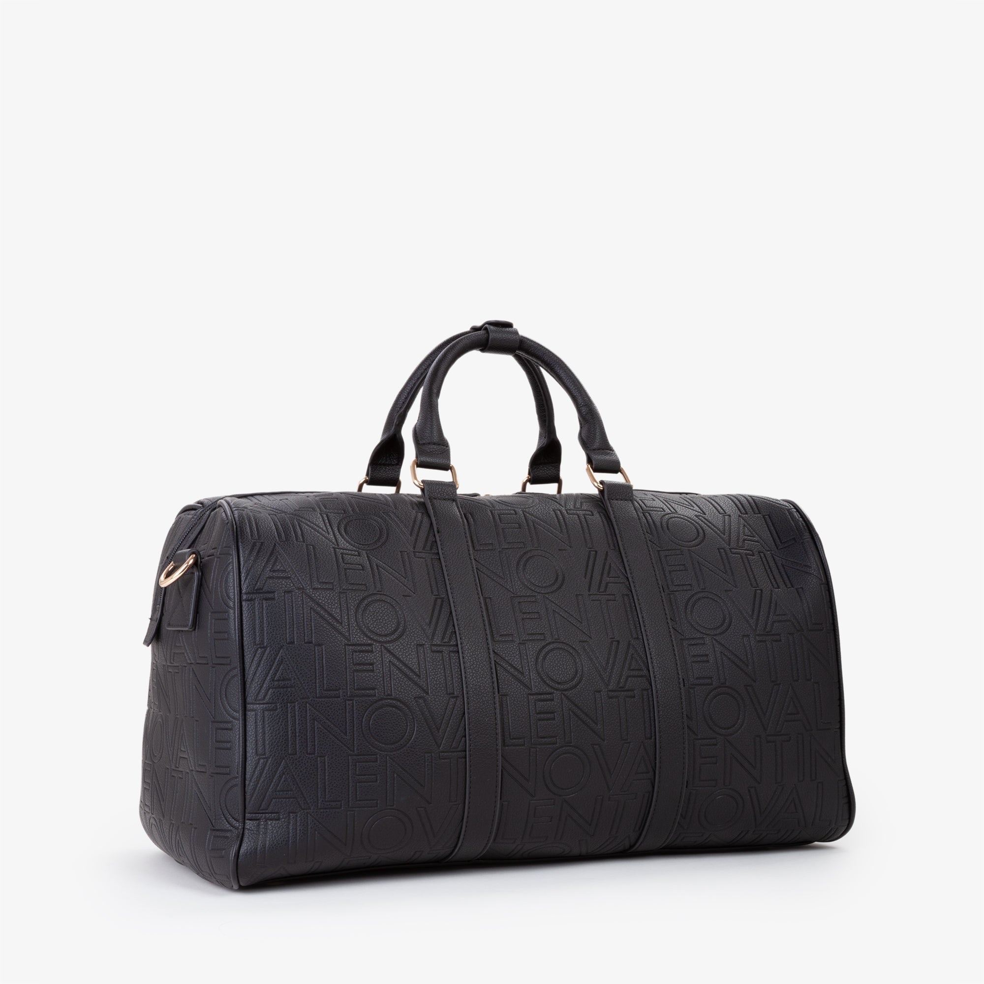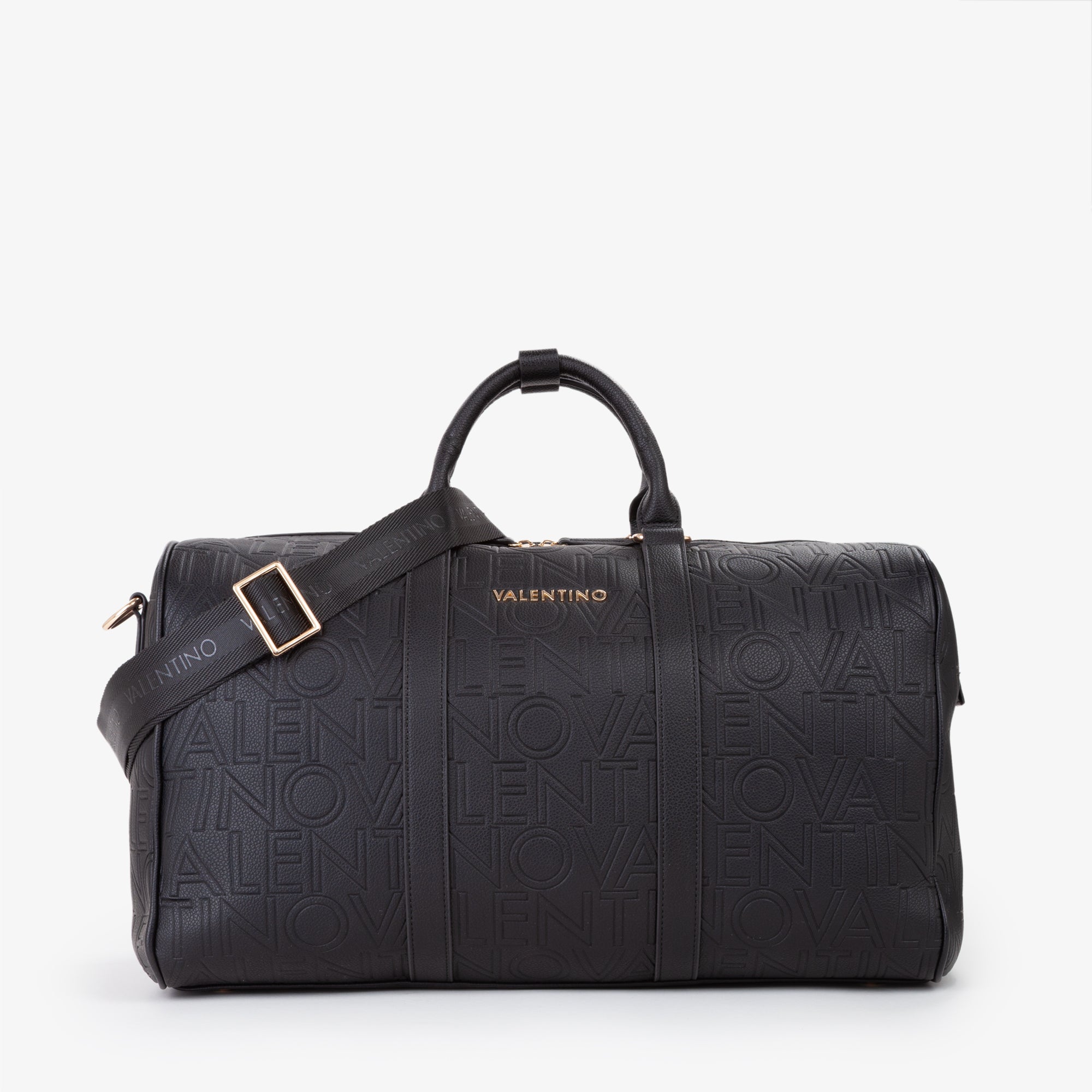 borsone viaggio con doppia tracolla , in nastro e in nappa , dalla forma squadrata e iconico logato su tutta la borsa