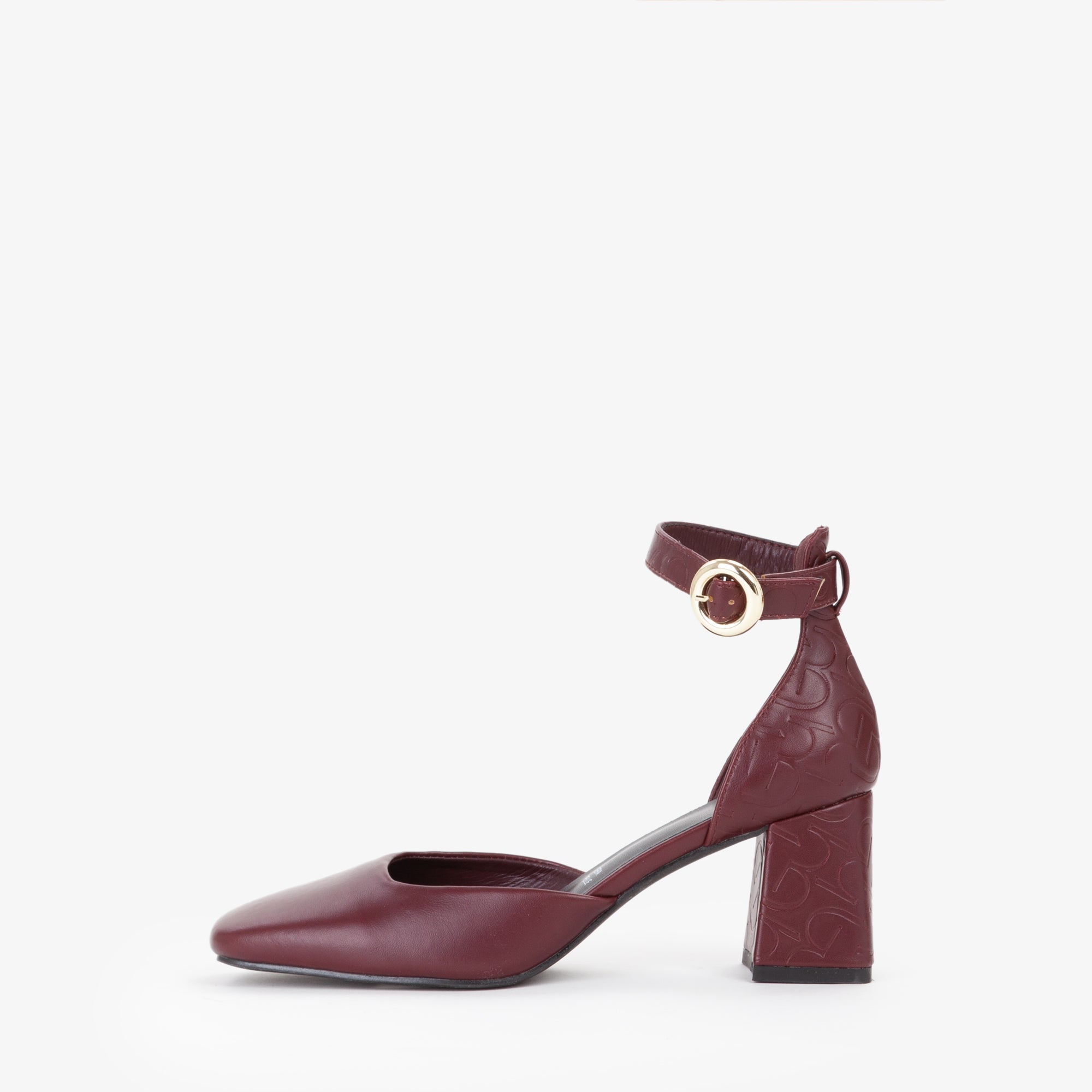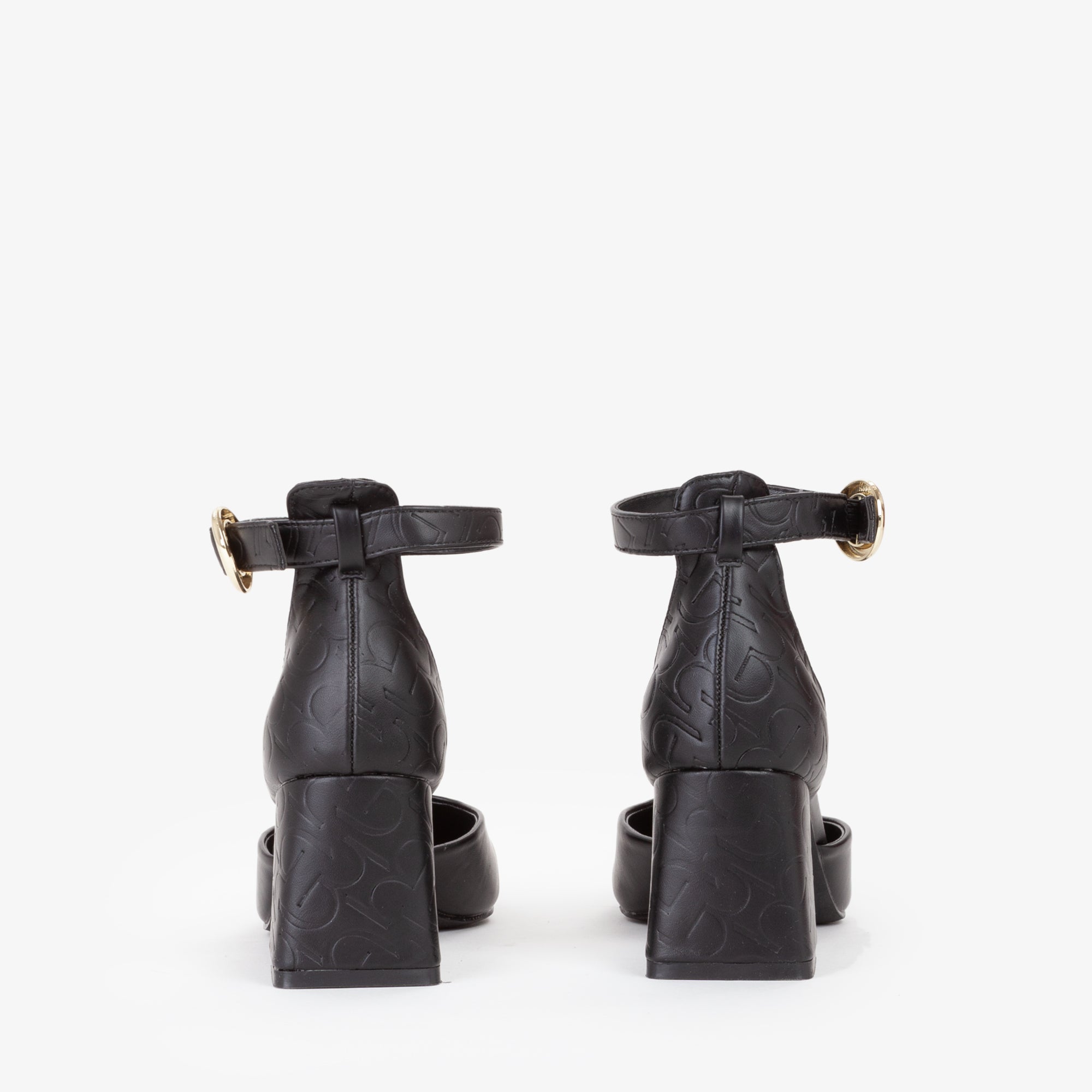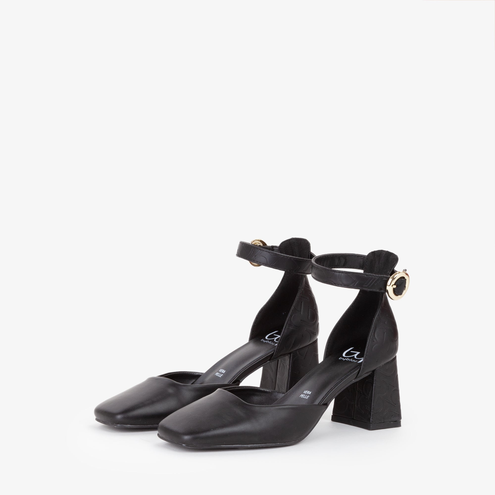 Questa scarpa è un décolleté in sintetico, caratterizzata da una punta squadrata che conferisce un look moderno e raffinato. La tomaia è decorata con un pattern logato sulla parte posteriore del tacco, mentre il cinturino alla caviglia, con una fibbia dorata, aggiunge un dettaglio elegante e sicuro. Questa tipologia di struttura con tacco quadrato assicura stabilità e comfort. Perfetta per occasioni formali o serate eleganti, questa scarpa si abbina a pantaloni a palazzo, abiti midi o gonne tubino, per un look sofisticatoe femminile. Ideale per eventi speciali o per un look da ufficio elegante.undefined