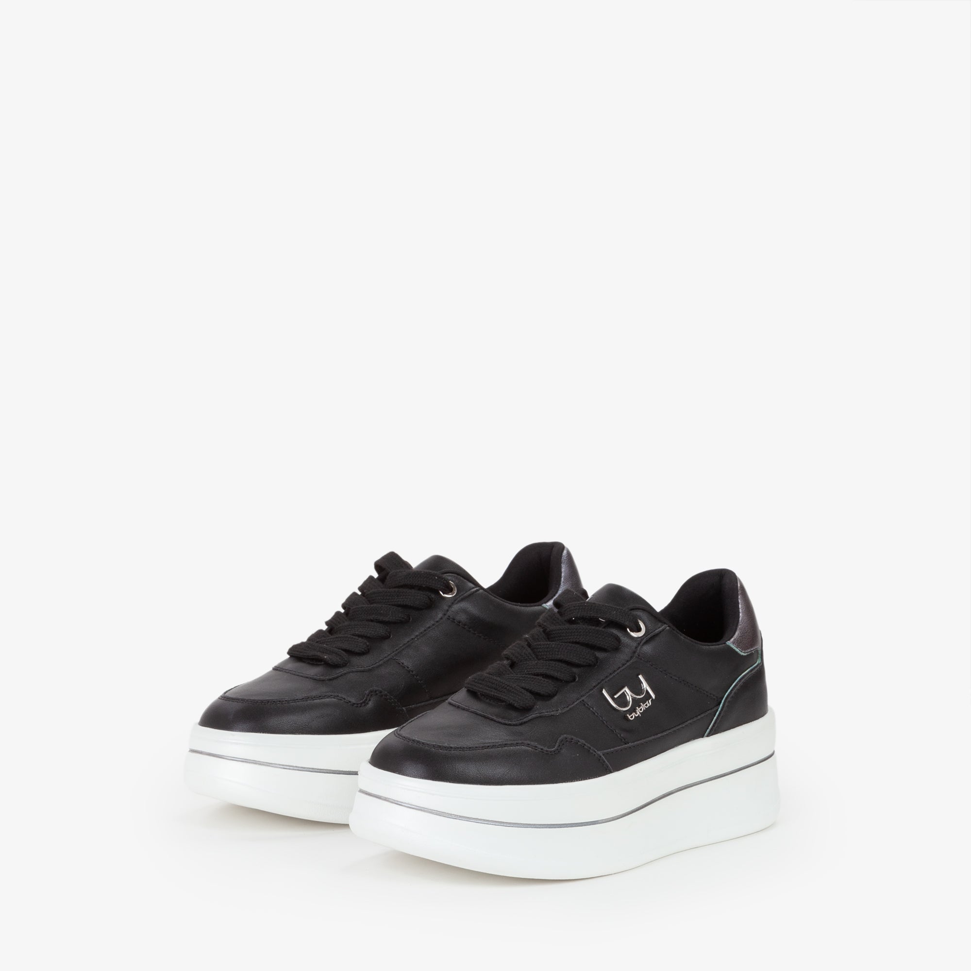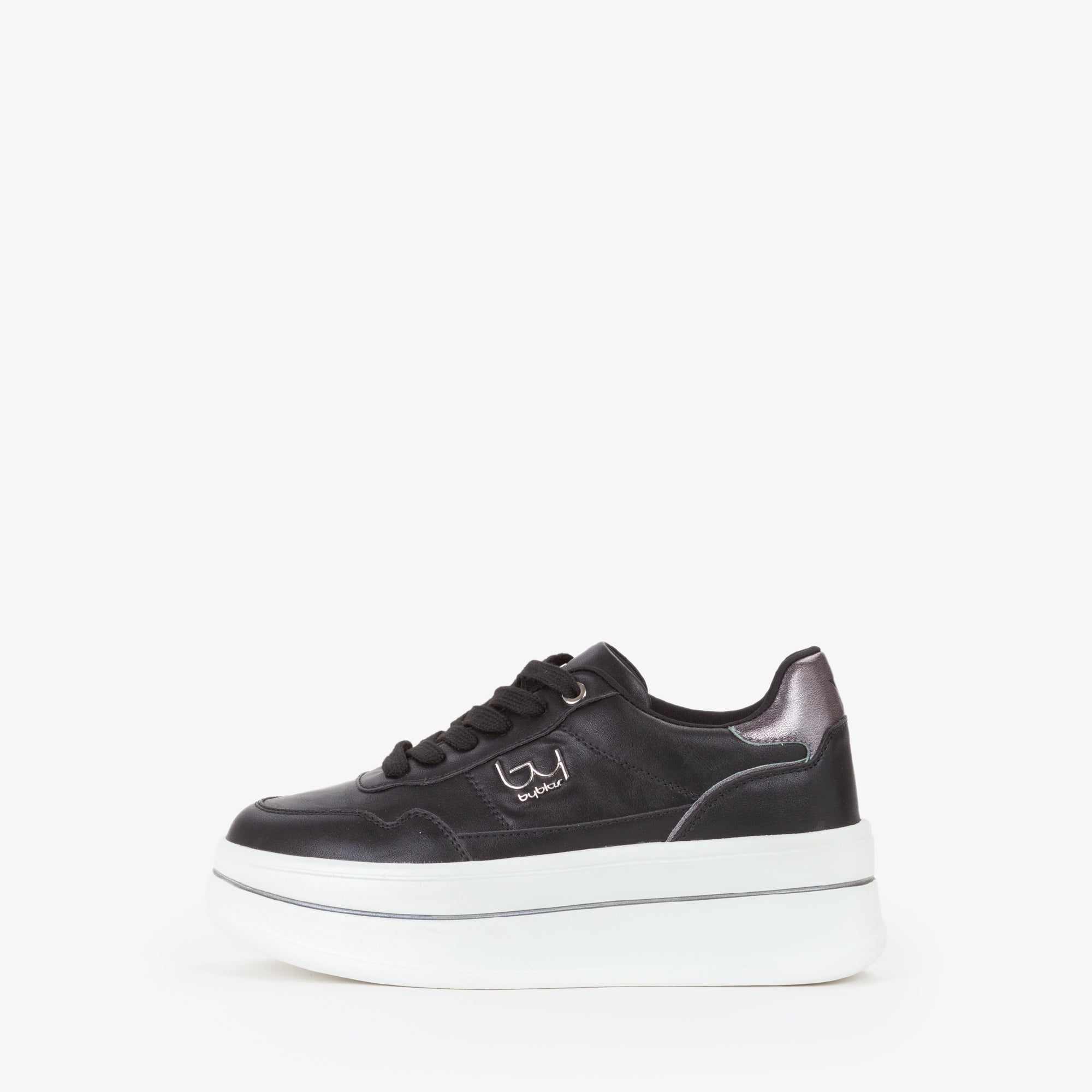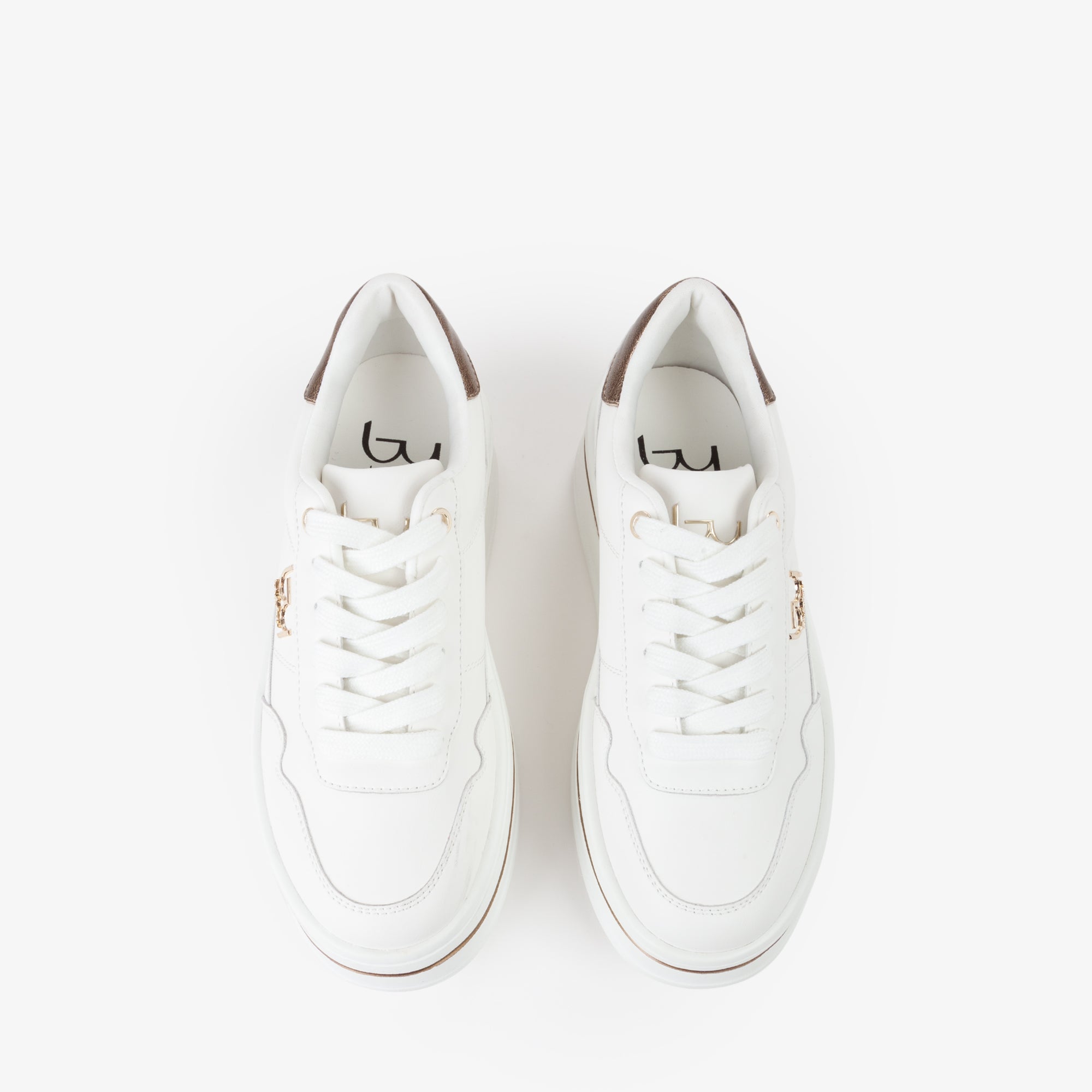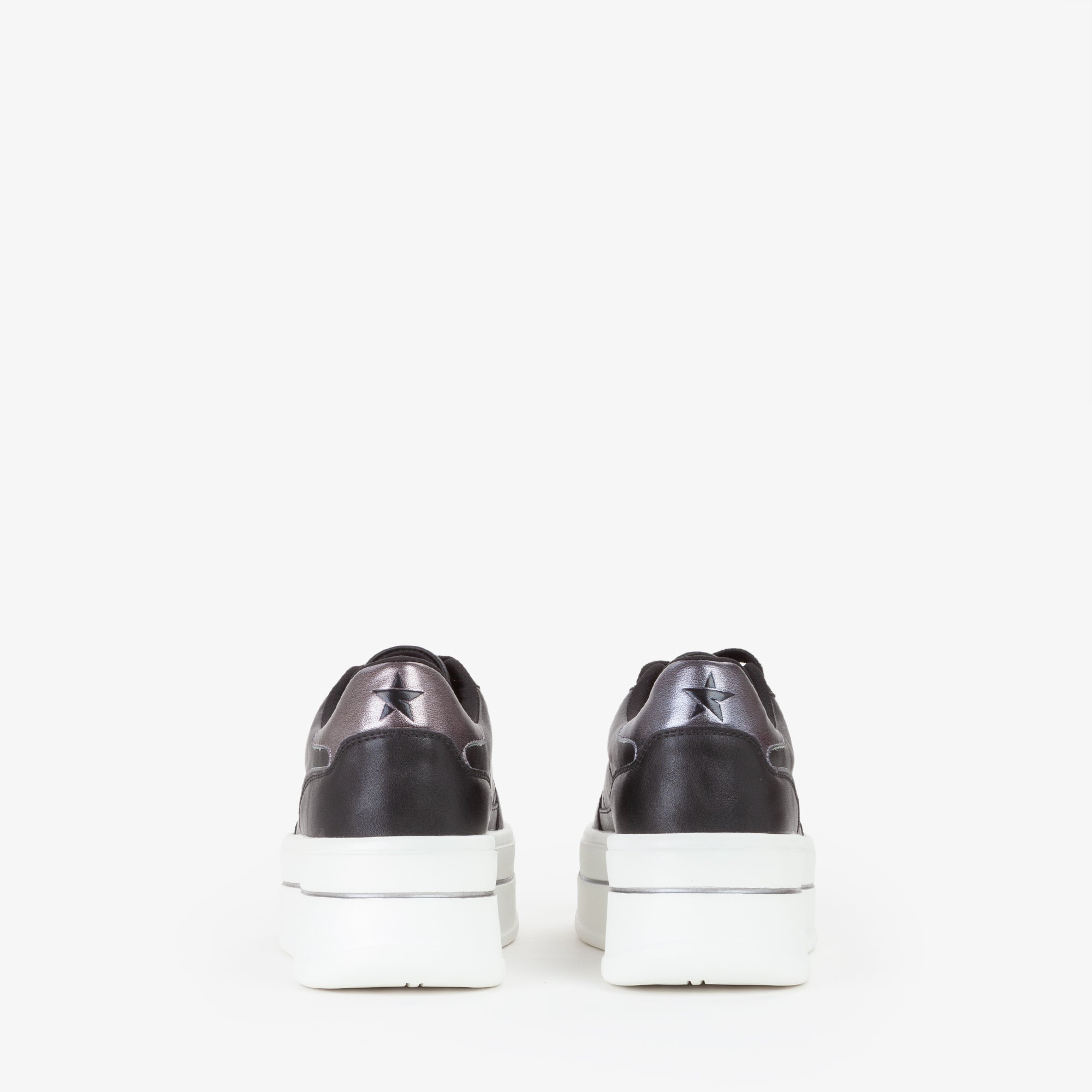 Sneaker dal design contemporaneo, impreziosita da dettagli metallizzati canna facile sul tallone e dal logo laterale coordinato. Lasuola platform bianca con sottile profilo argentato crea un raffinato contrasto cromatico e aggiunge slancio alla silhouette, garantendo allo stesso tempo comfort e stabilità. Un modello perfetto per chi cerca uno stile urbano sofisticato con un tocco glamour discreto.