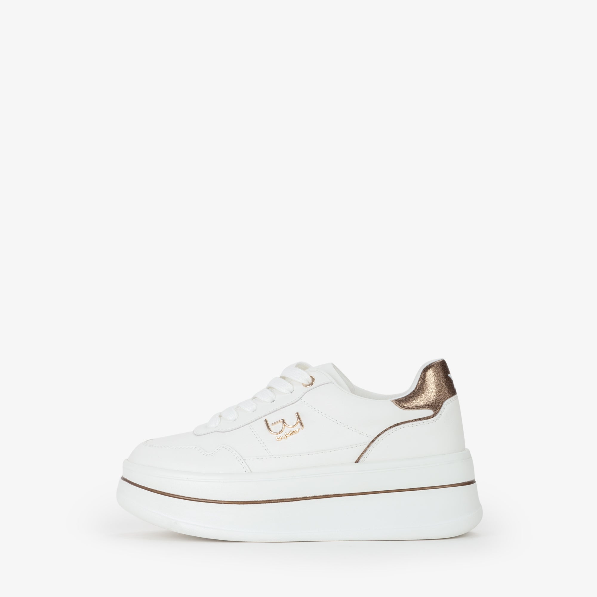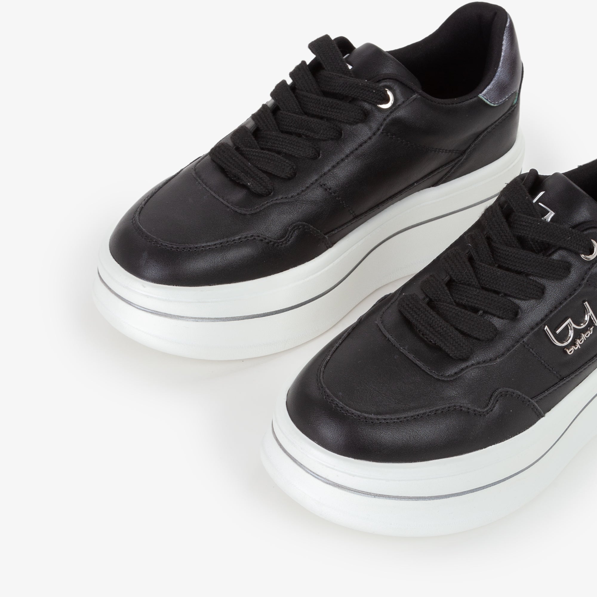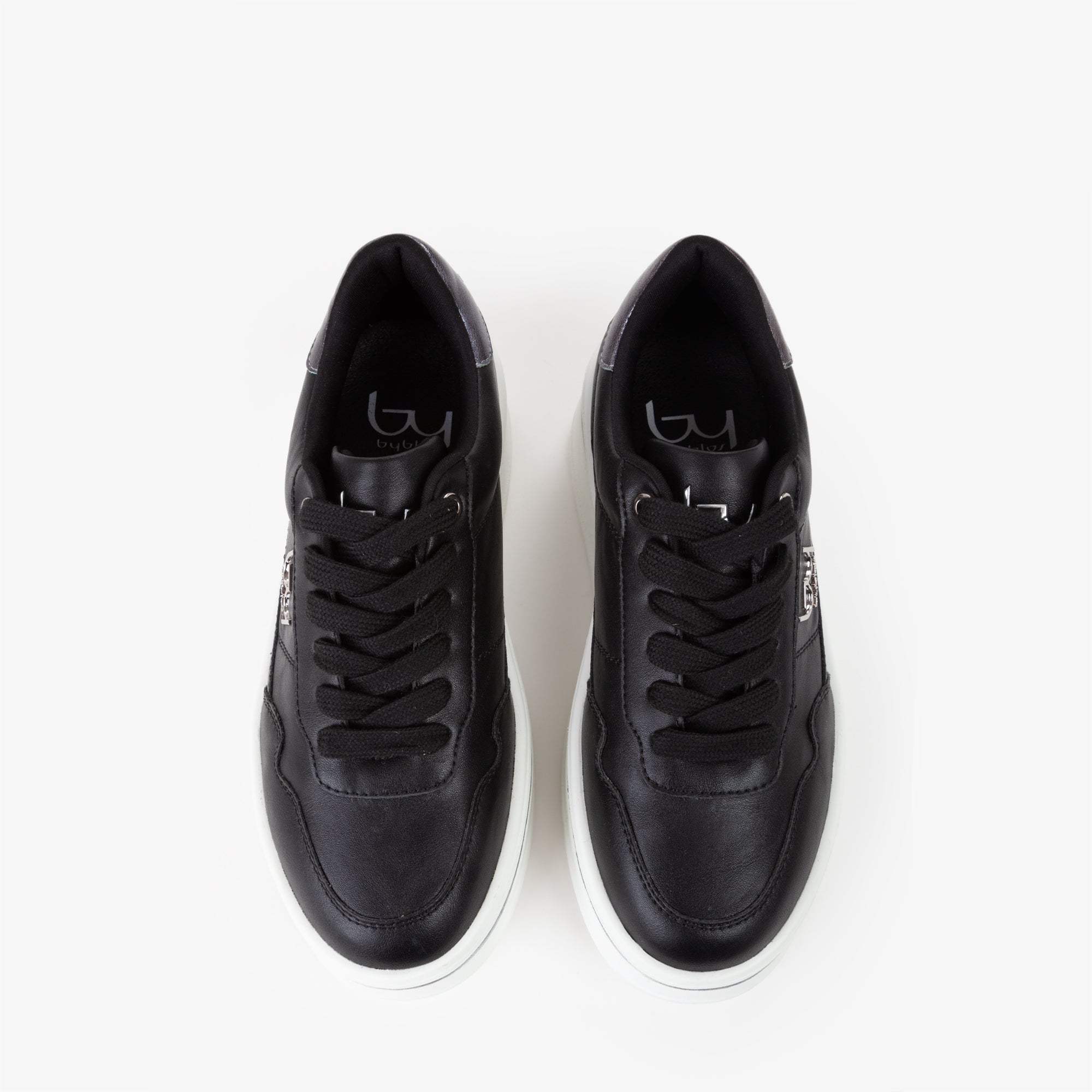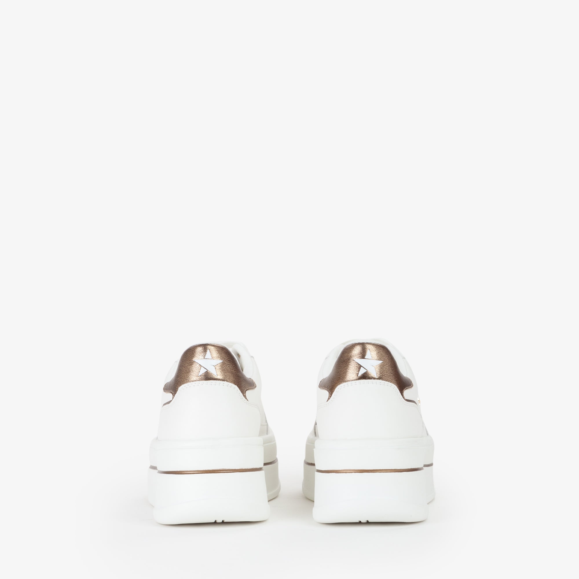 Sneaker dal design contemporaneo, impreziosita da dettagli metallizzati canna facile sul tallone e dal logo laterale coordinato. Lasuola platform bianca con sottile profilo argentato crea un raffinato contrasto cromatico e aggiunge slancio alla silhouette, garantendo allo stesso tempo comfort e stabilità. Un modello perfetto per chi cerca uno stile urbano sofisticato con un tocco glamour discreto.